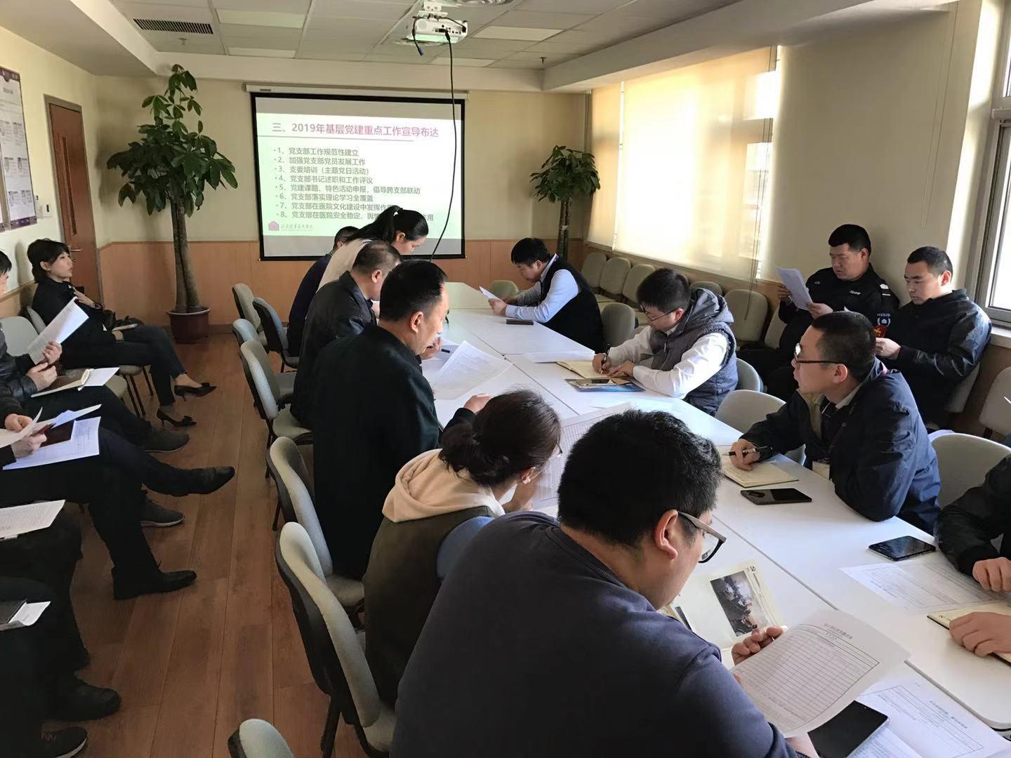 首先由支部书记发言,对2019年基层党建重点工作进行宣导,包括基层党建工作规范化,党员的发展工作等,并结合本支部如何在医院文化建设中发挥更好作用进行了阐述,同时布达了近期党支部述职和工作评议安排,2019年党建特色活动的申报等相关工作。
