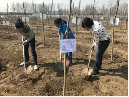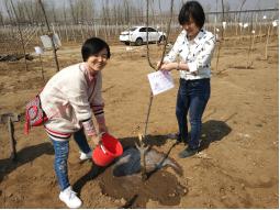 随后,大家来到了葡萄园,在工作人员的指导下栽种了海棠树和槐树各一颗,并把含有大家心意的卡片悬挂在树苗上。