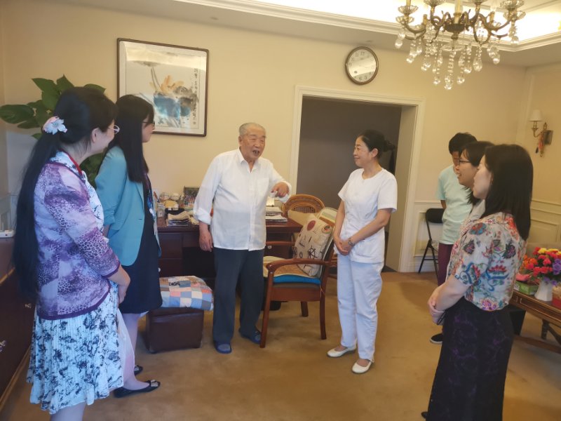 在颐护部副主任杨立波的引导下,行政一支部的同志们来到养老机构长者住宿区,看望在院老人的饮食起居,与入住老人谈心聊天。在潘南鹏老人的房间,97岁高龄的潘爷爷热情地招呼大家进屋坐,并饶有兴趣的和大家谈起当年参与南水北调工程时的事情。同志们也都被潘爷爷不忘初心、艰苦创业的精神感染了,纷纷与潘爷爷合影留念。