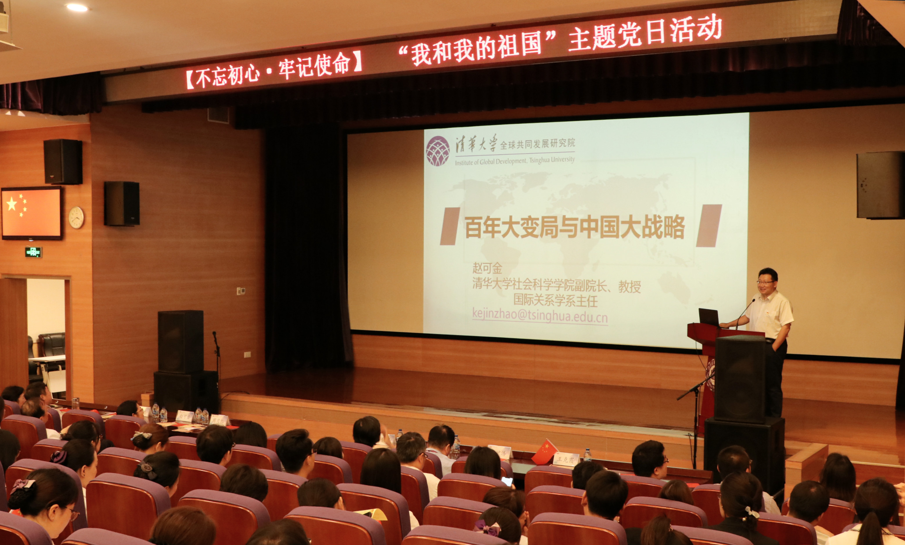 清华大学理论宣讲团成员、社会科学学院副院长赵可金教授为大家带来题目为“百年大变局与中国大战略”的生动党课。赵可金从国际力量对比、秩序变化,中国的改革历程与战略转型等几方面,阐释了应该如何理解“百年未有之大变局”,如何理解中国发展同外部世界的关系,号召广大党员知史爱党、知史爱国,为建设一个更加美好的中国和世界而努力。