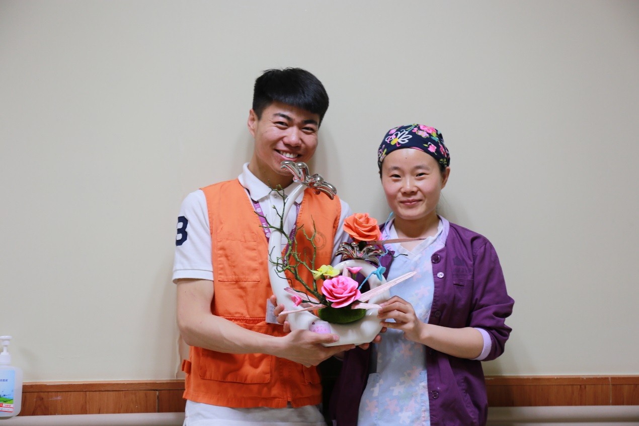 2017年5月12日是第106个国际护士节。在院团委副书记聂广孟、行政团支部书记张璠的带领下,来自行政团支部6名青年志愿者与党支部志愿者联动,携手社会志愿者,为全院26个护理工作点献上了亲手制作的绢花盆景。