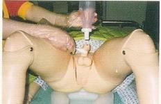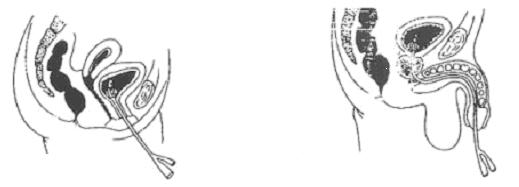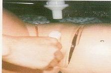 图十一 女性以冲洗器向会阴部冲洗方式 图十二 会阴以棉枝冲洗方式