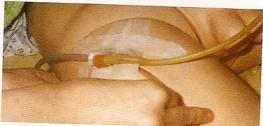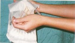 图十三 以优碘消毒尿管尿道口端 图十四 以井字型固定