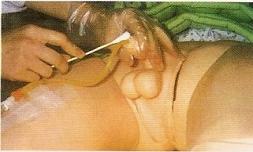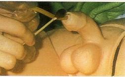图七 以冲洗壶清洗方式 图八 固定阴茎方式