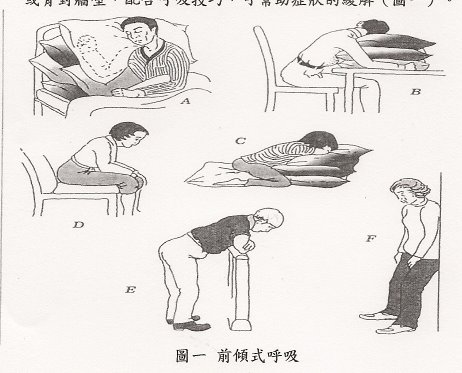 呼吸急促时,采坐姿或站姿,上身前倾,用双手撑着大腿或桌面,或背对墙壁,配合呼吸技巧,可帮助症状的缓解(图一)。