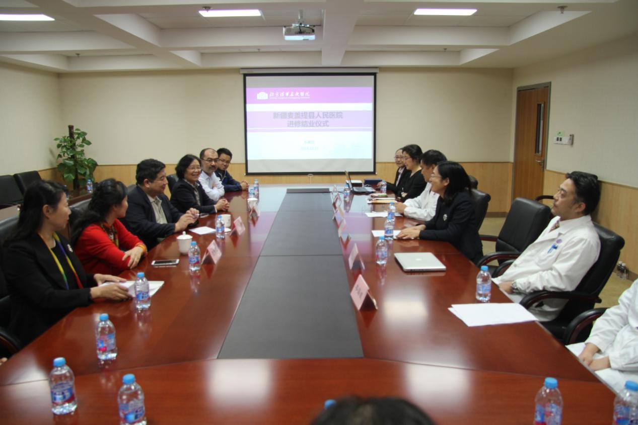 2016年10月13日,新疆麦盖提县人民医院进修医师结业仪式暨离院座谈会圆满完成。清华同方副董事长兼总裁黄俞、同方大学校长马二恩、党办主任聂保民、清华长庚医院书记周月红、副院长王劲、眼科主任胡运韬、心内科副主任医师李海斌、科教处科长宋春梅等人出席了仪式。