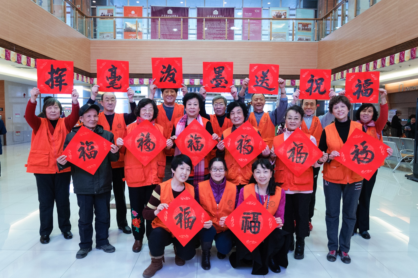 北京清华长庚医院志愿服务工作队与医院同步运营、完善发展,目前已有实名注册并上岗服务志愿者349名。2015年,在日常上岗服务的基础上,志工队创新推出的系列专长志愿服务,搭建起了医院—社区的和谐桥梁,释放出满满的志愿正能量。“挥毫泼墨送祝福”作为其中之一,广受我院患者与周边居民的喜爱。小年将至,随着活动的圆满落幕,志愿者们将祝福寄托在挥毫泼墨的一笔一划中,将爱心传递到千家万户。