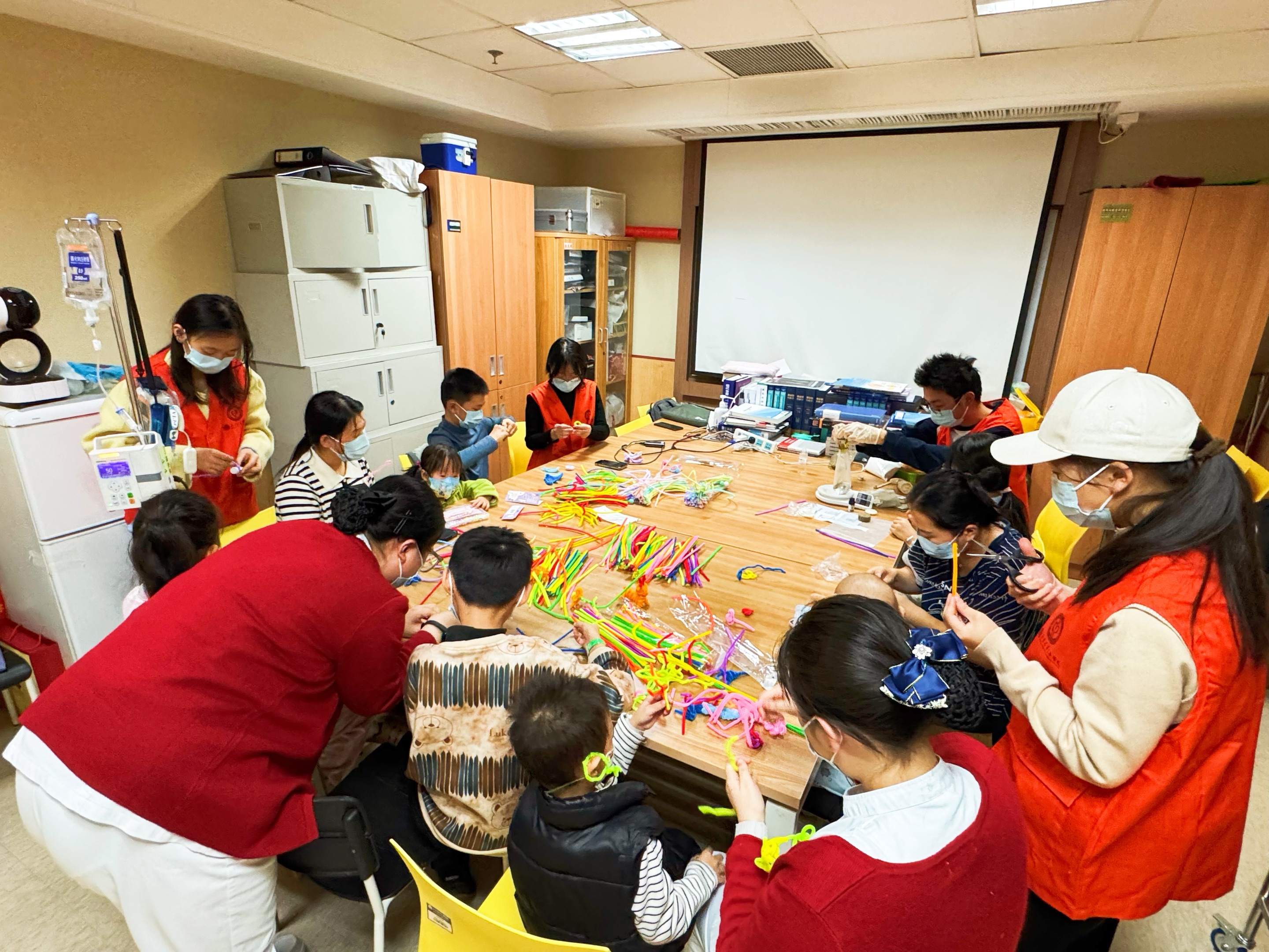 活动开篇,医务社工首先介绍手工坊源起并组织暖场破冰活动,随后,在学生志愿者、护理同仁的专业指导陪伴下,小朋友和家长快速沉浸在“艺术创作”的世界。