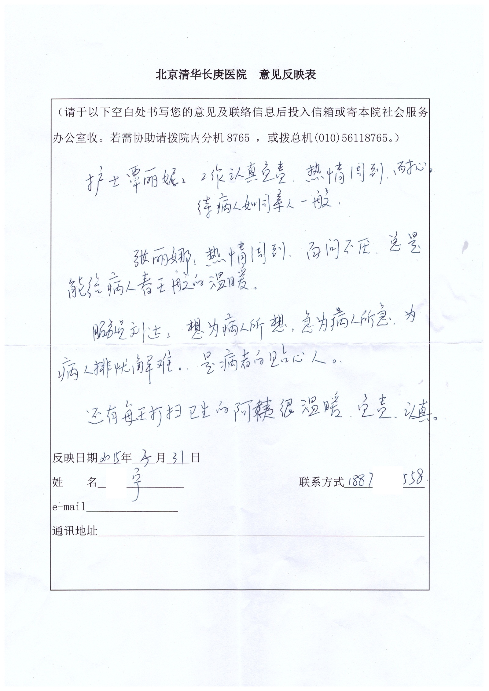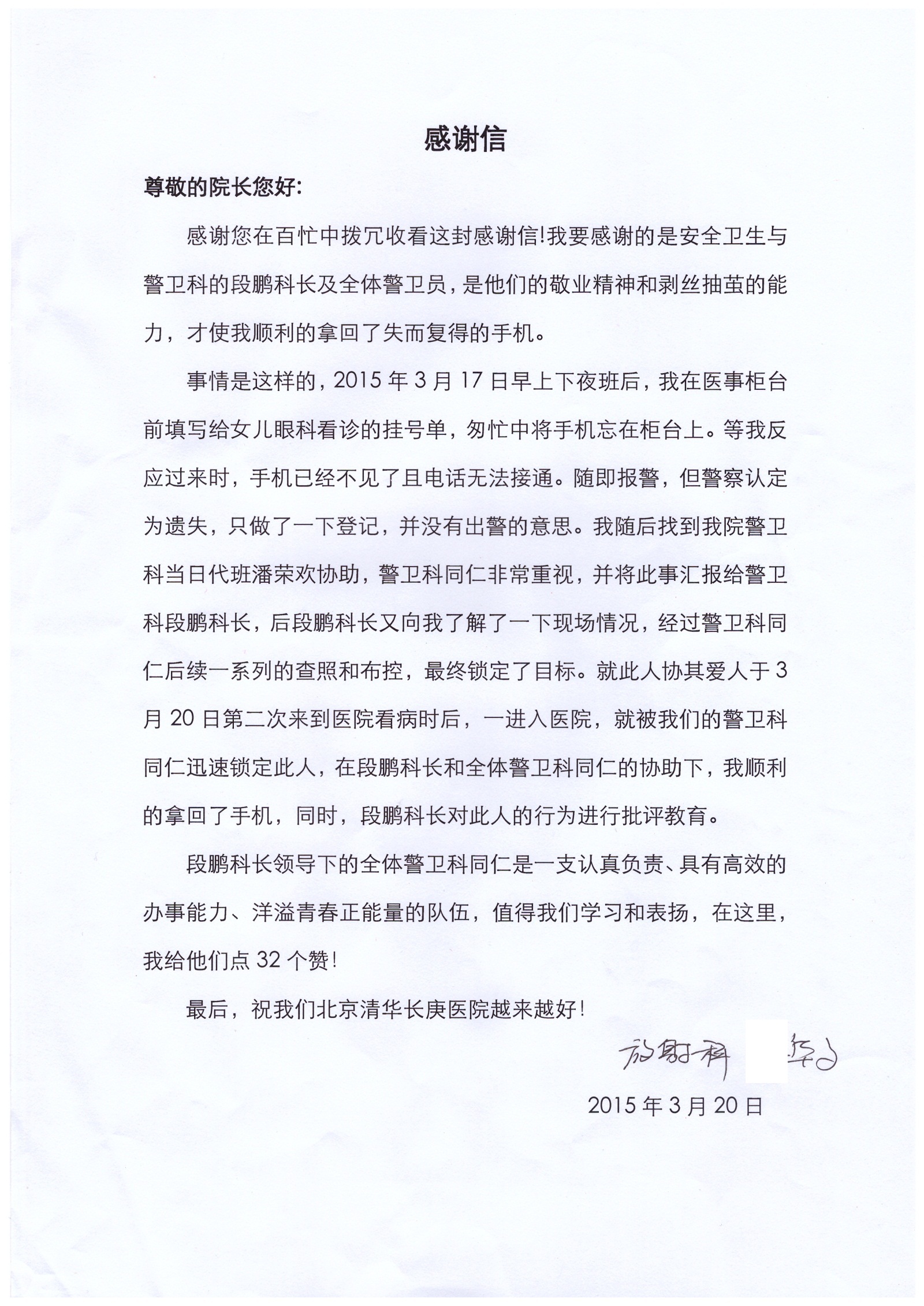 2015年3月,我院共接到患者及家属感谢信2封,警卫科段鹏科长及全体警卫、护理部覃丽妮护师、张丽娜护士、医事科病房医事刘达收到具名表扬。特此公告,以资鼓励!