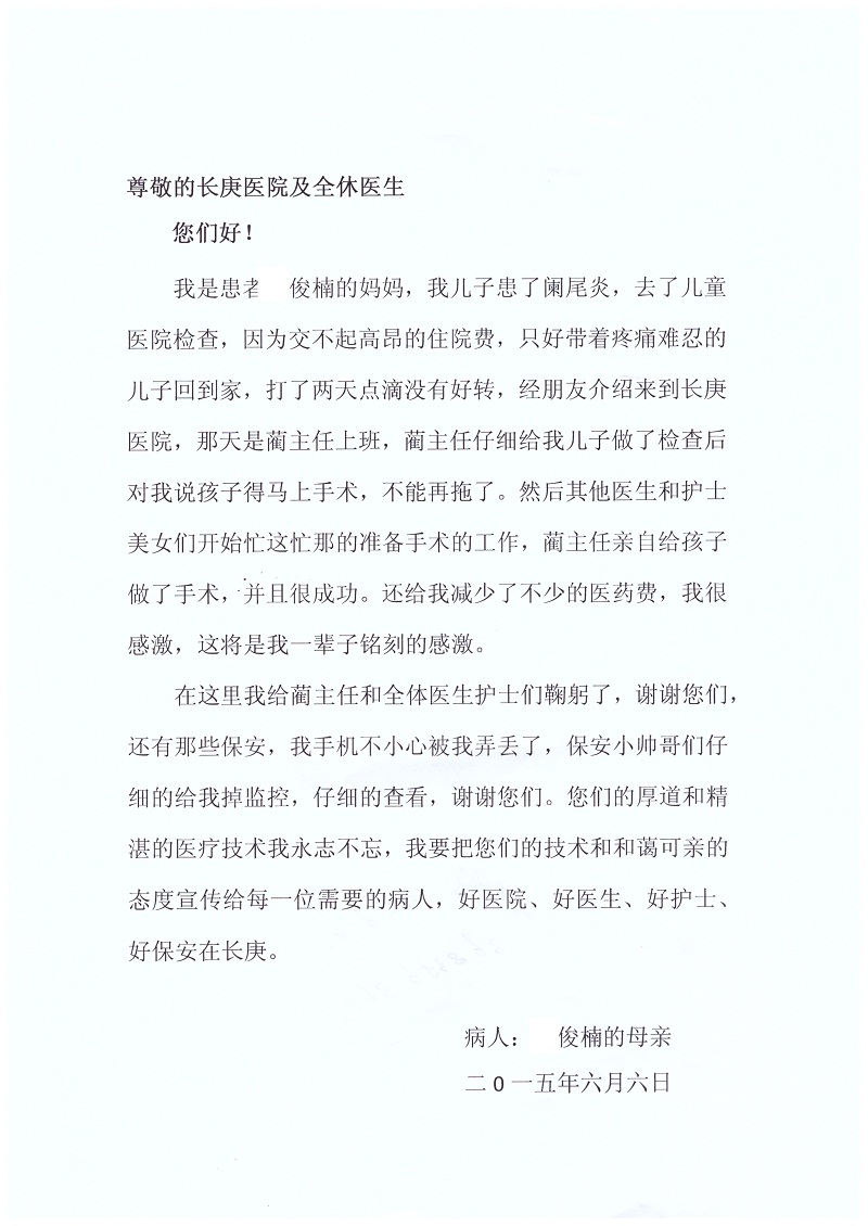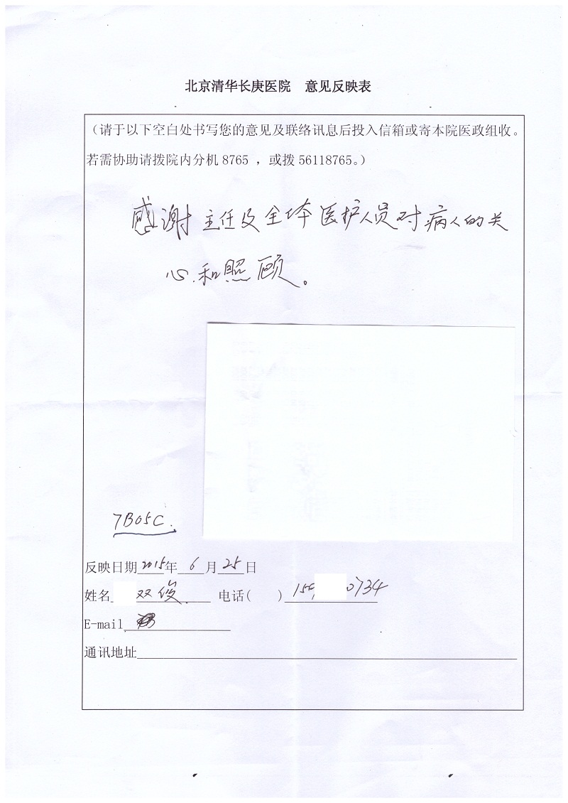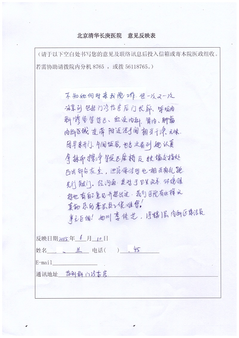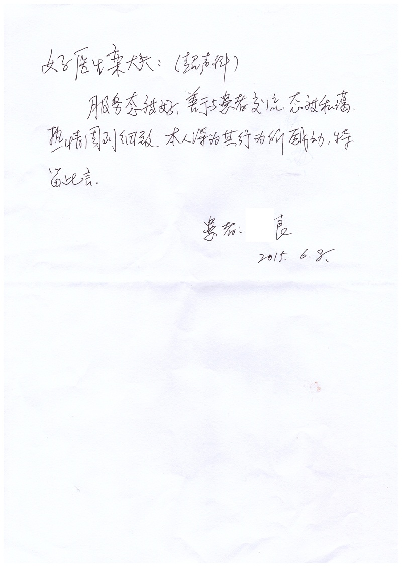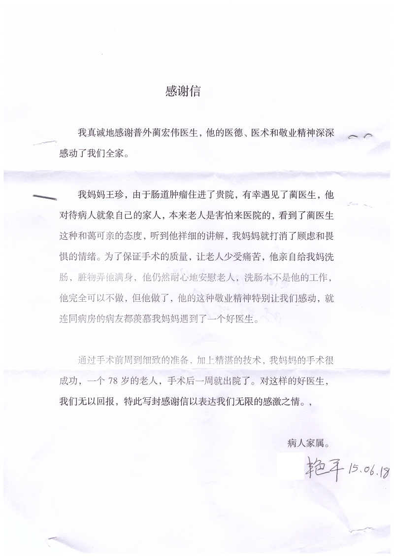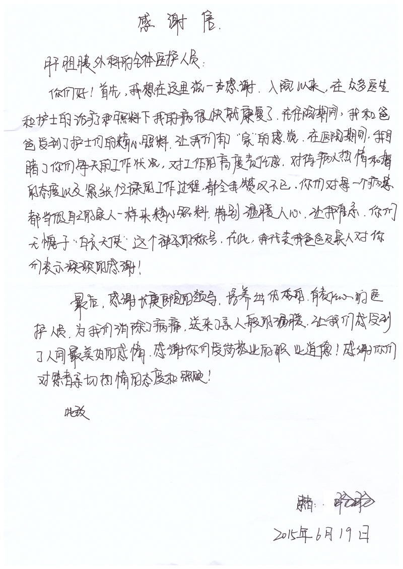 2015年6月,我院共接到患者及家属感谢信13封,其中心脏内科张萍主任、缪国斌副主任医师,眼科胡运韬主任、王韧琰医师,血管外科吴巍巍主任,骨科潘勇卫副主任、陈连旭副主任医师、付立功医师,朱剑津医师,普通外科蔺宏伟副主任医师,超声科栾好梅医师,肝胆胰外科全体医生,护理部辛扬眉护师、于小梅护师、季静护士、谢娟娟护士、屈建花护士及6A、7B病房全体护理人员、警卫科全体人员、保洁李传芝收到具名表扬。特此公告,以资鼓励!