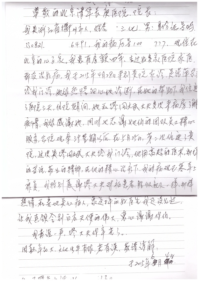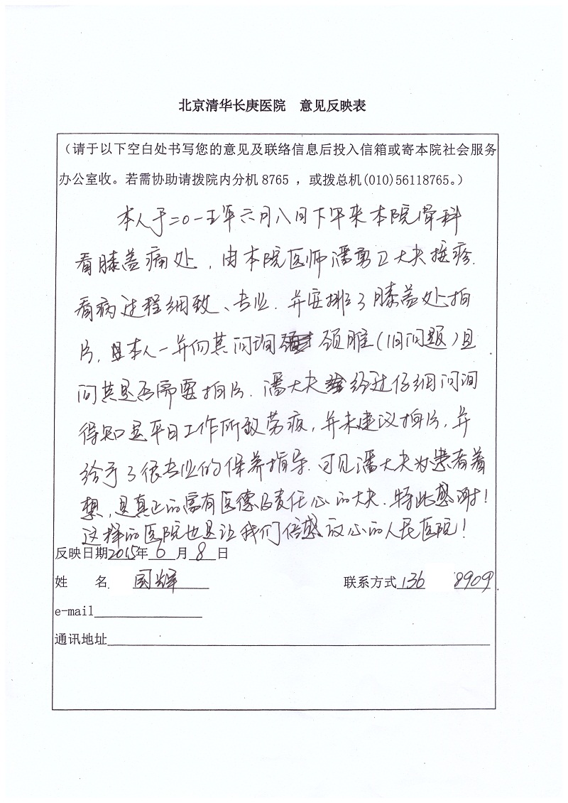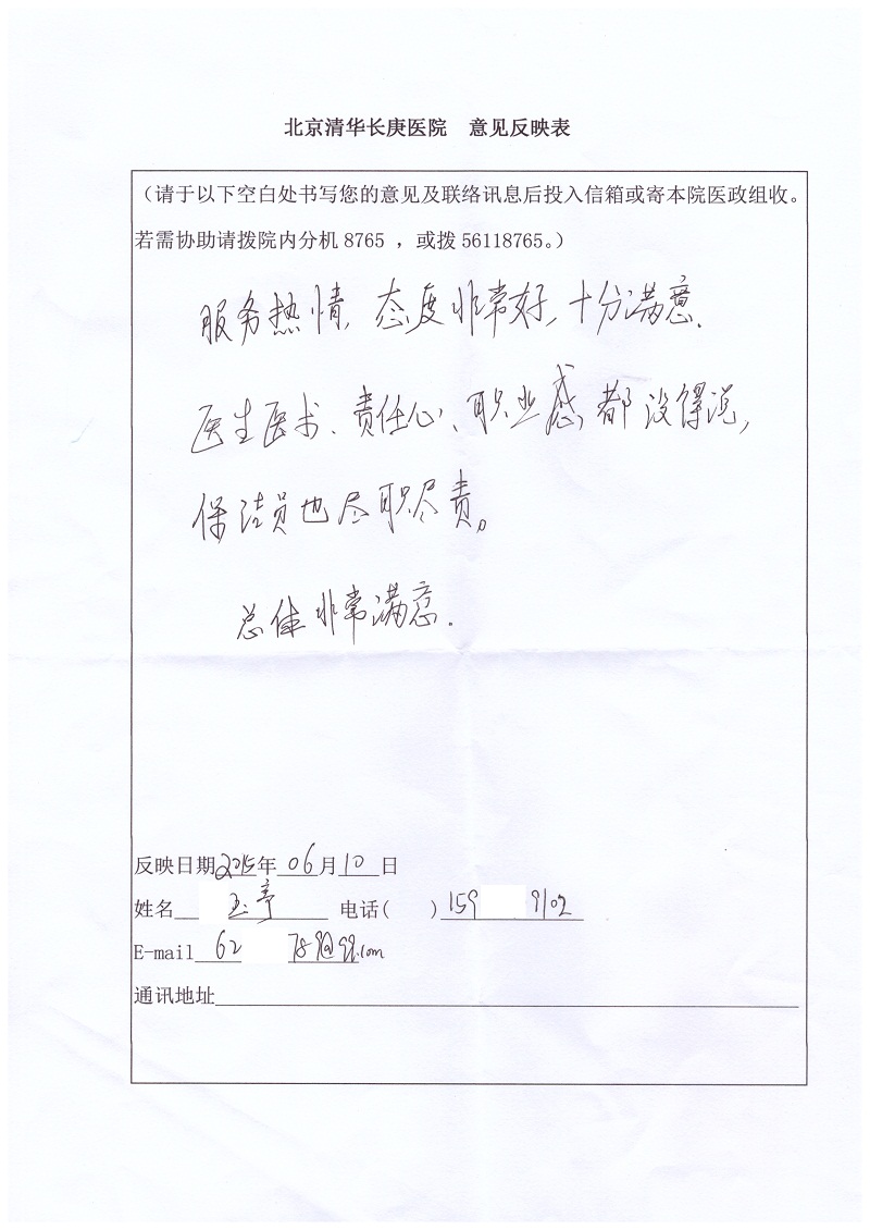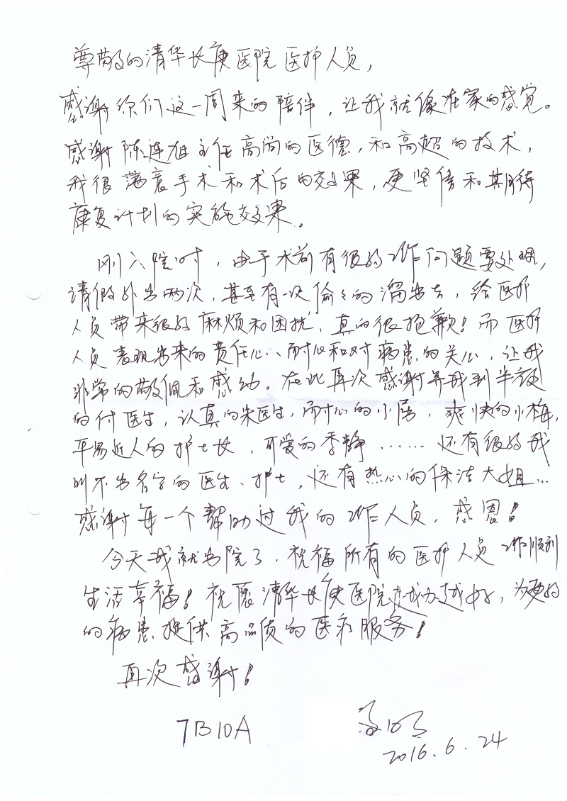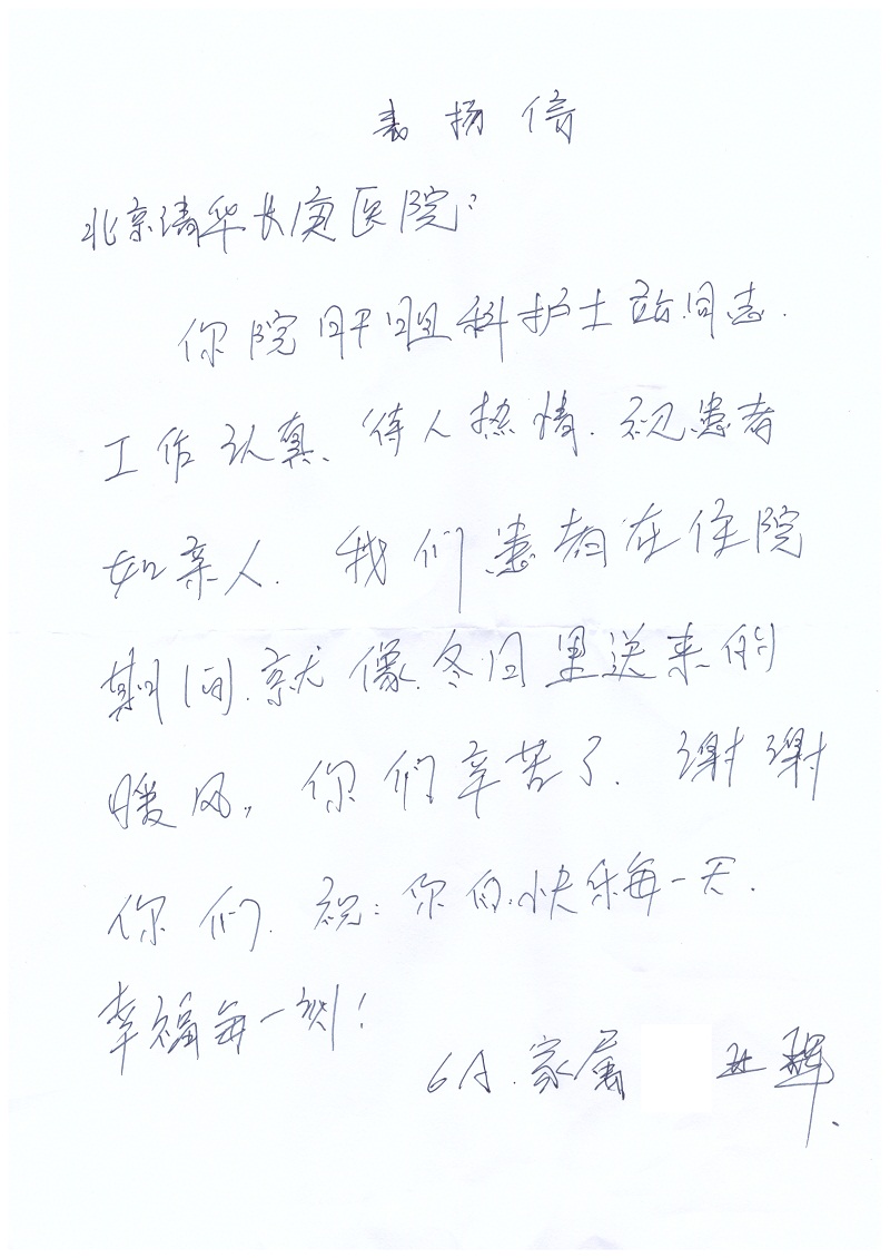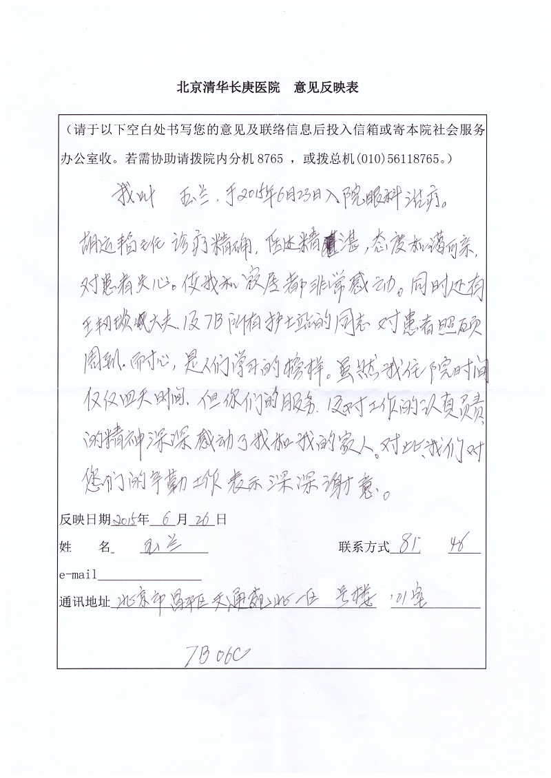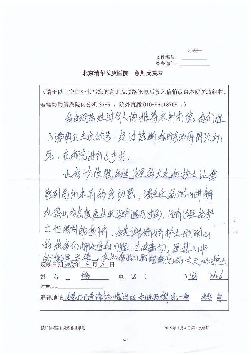 2015年6月,我院共接到患者及家属感谢信13封,其中心脏内科张萍主任、缪国斌副主任医师,眼科胡运韬主任、王韧琰医师,血管外科吴巍巍主任,骨科潘勇卫副主任、陈连旭副主任医师、付立功医师,朱剑津医师,普通外科蔺宏伟副主任医师,超声科栾好梅医师,肝胆胰外科全体医生,护理部辛扬眉护师、于小梅护师、季静护士、谢娟娟护士、屈建花护士及6A、7B病房全体护理人员、警卫科全体人员、保洁李传芝收到具名表扬。特此公告,以资鼓励!