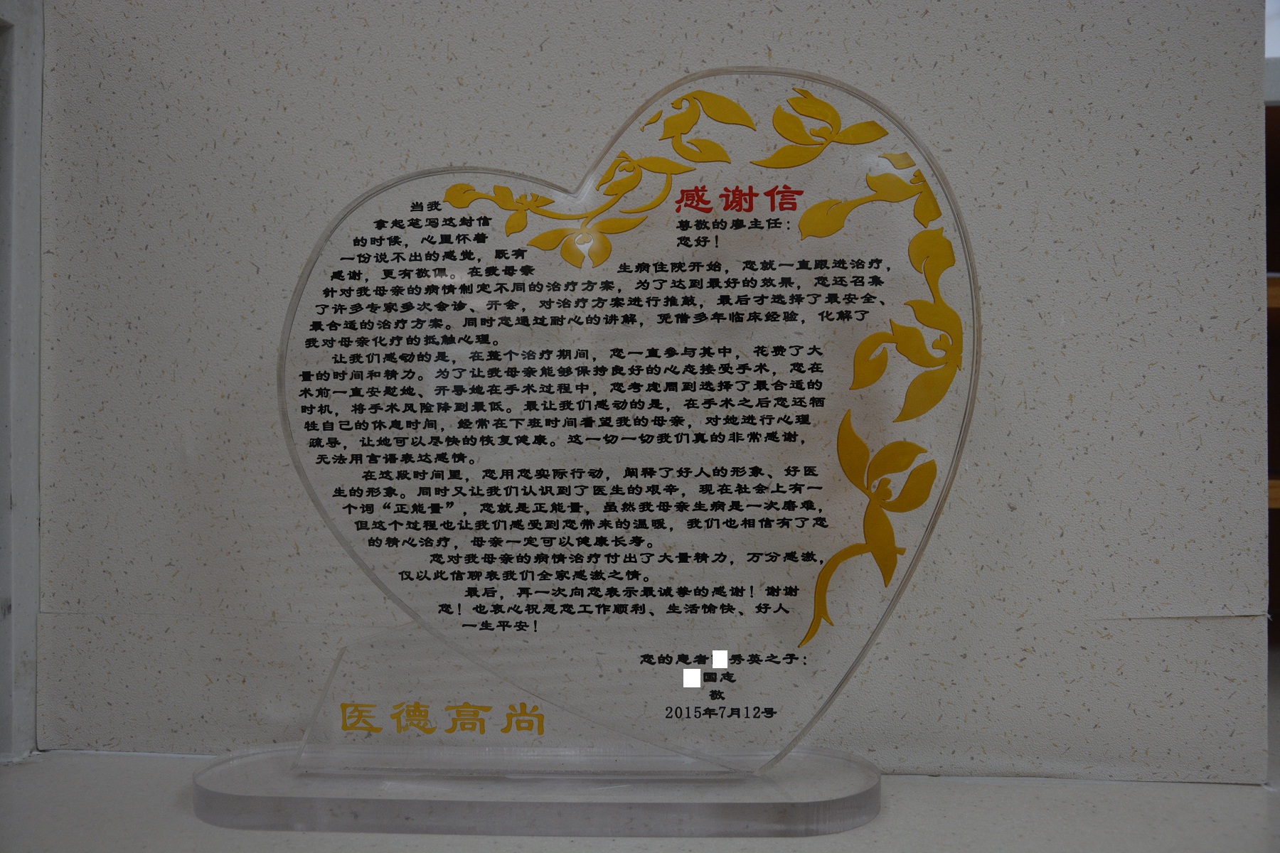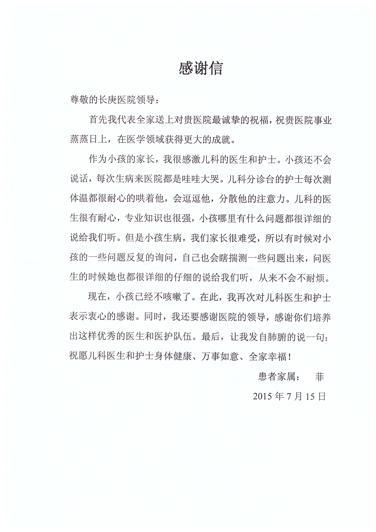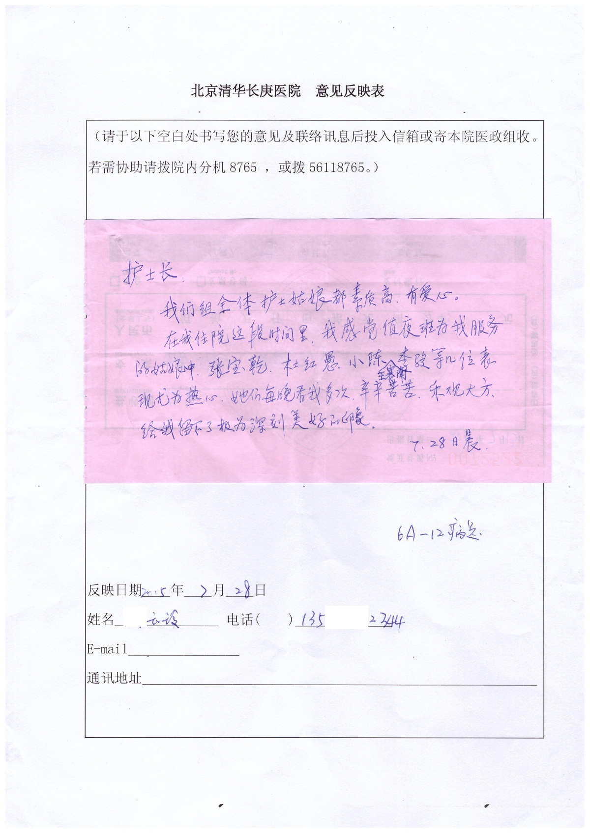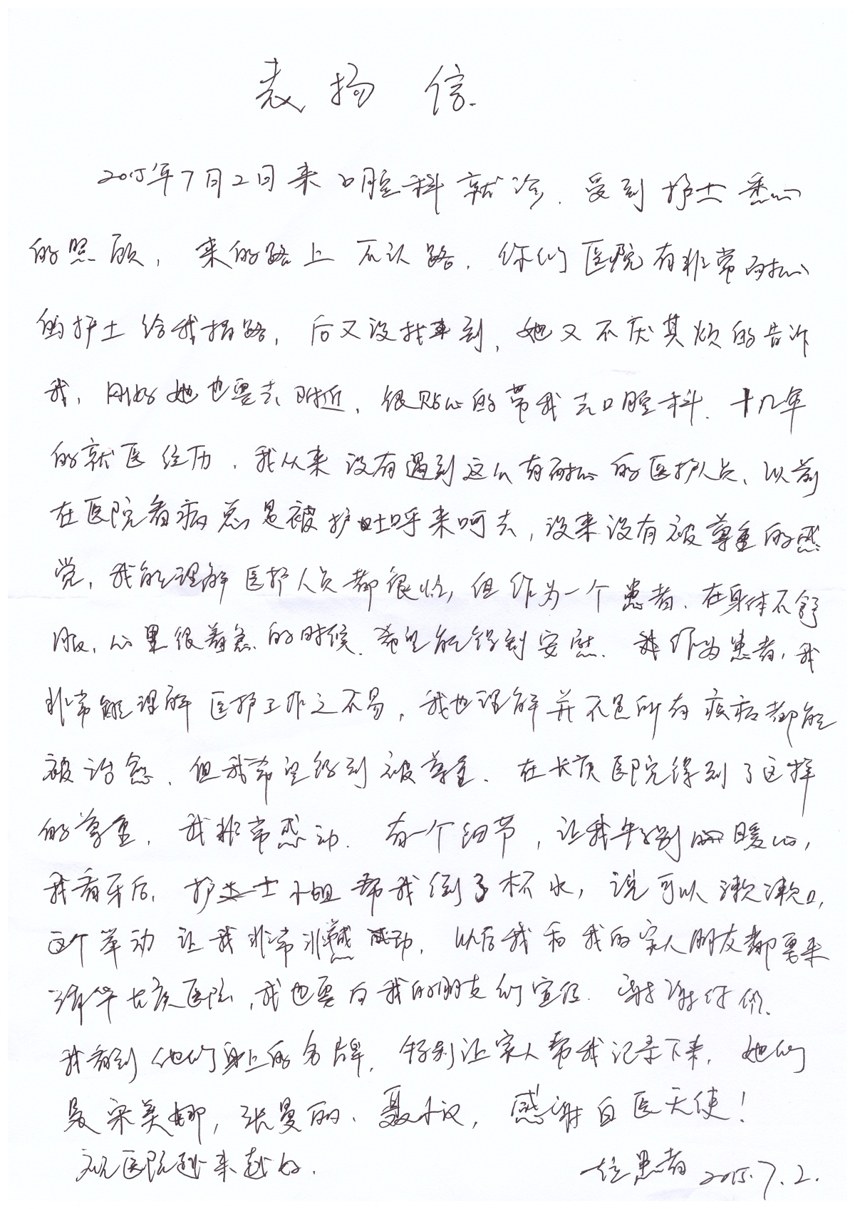 2015年7月,我院共接到患者及家属感谢信17封,其中肝胆外科董家鸿教授、项灿宏医师,神经外科王劲副院长、王贵怀主任、何大伟医师,眼科胡运韬主任,妇产科廖秦平主任,儿科晁爽副主任,骨科陈连旭副主任医师、付立功医师、朱剑津医师,口腔科聂小汉医师,健康管理中心王小毅医师,护理部宋美娜主管护师、辛扬眉护师、陈瑞敏护师、杨静护师、张曼丽护师、姜学爽护师、王倩护士、季静护士、孙洁护士、田静静护士、郝萍护士、罗艳辉护士、李红霞护士、张丽娜护士、荆红英护士、刘淼护士、樊景春护士、翟雪丽护士、林景熠护士、谢娟娟护士、谢兰兰护士、张宝乾护士、杜红愚护士、王赛南护士、李骏护士及5B、6A、7B病房、健康管理中心全体护理人员收到具名表扬。特此公告,以资鼓励!