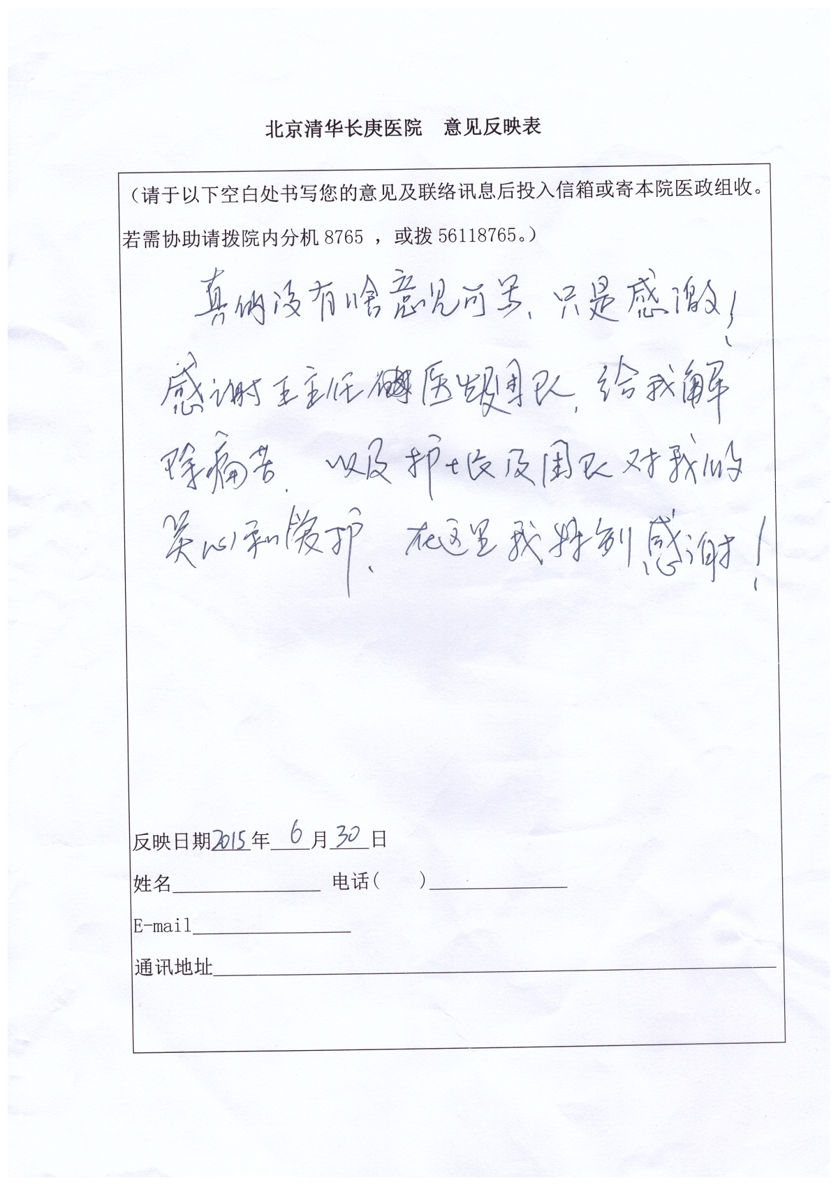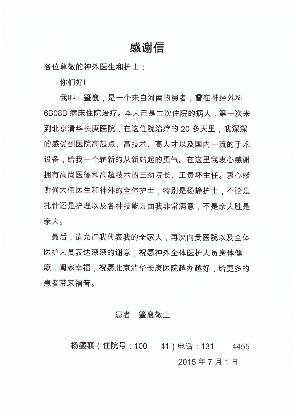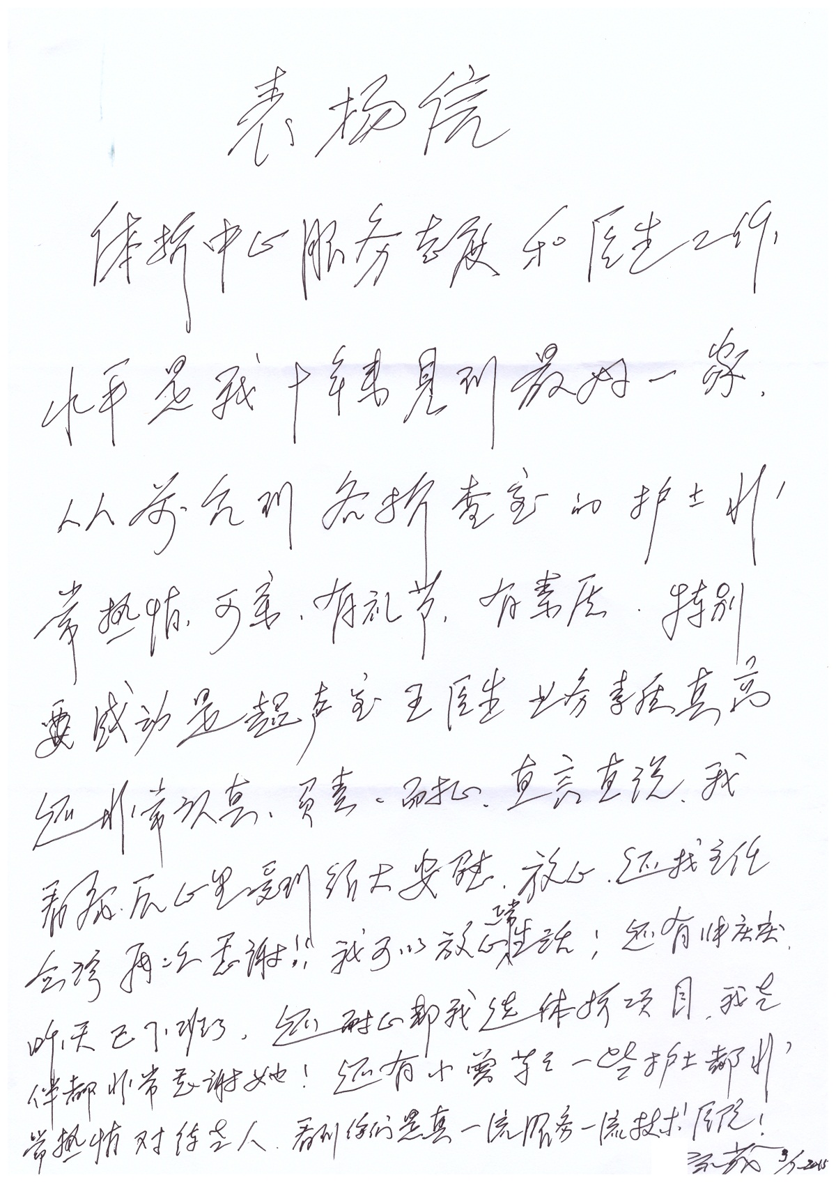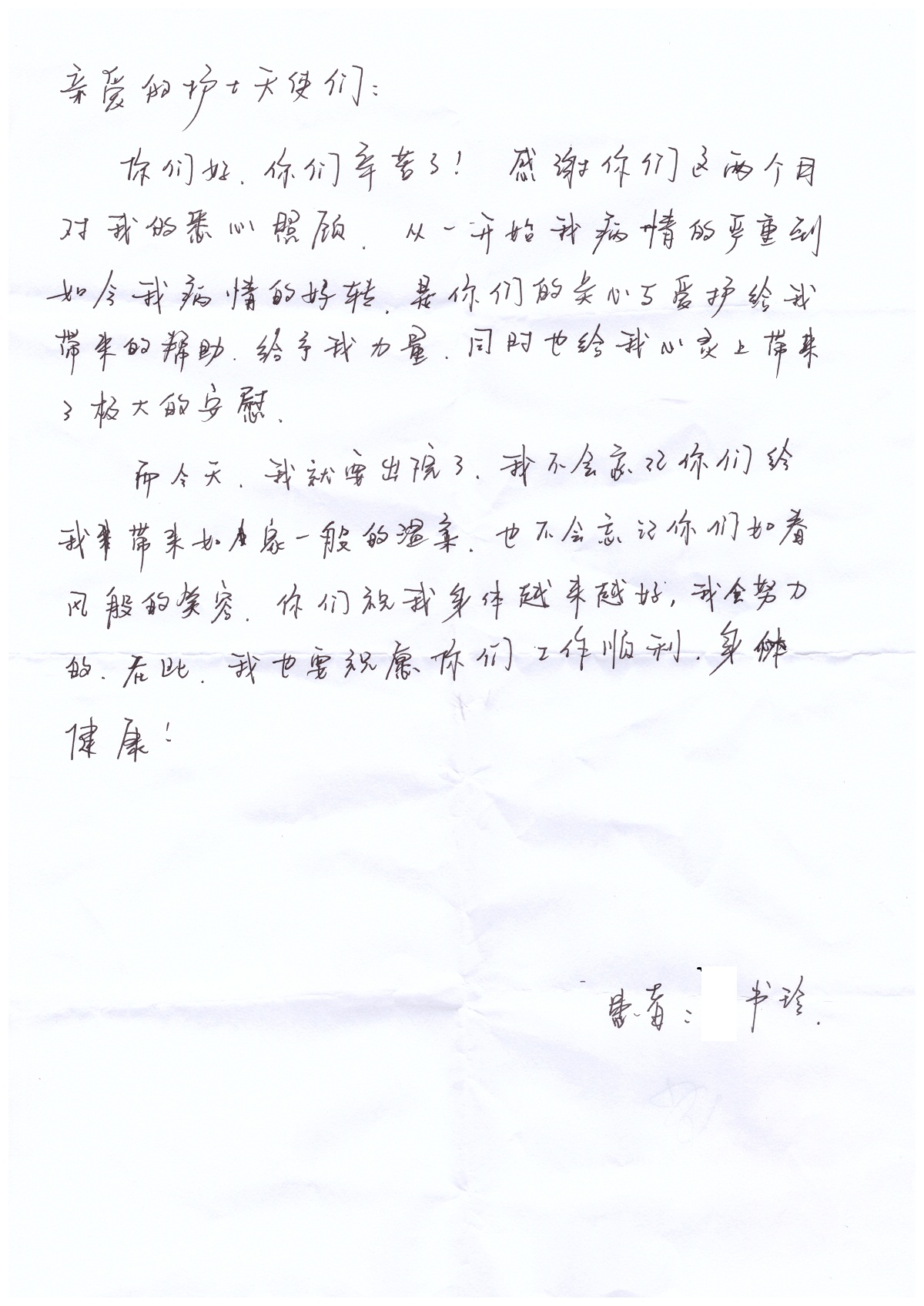 2015年7月,我院共接到患者及家属感谢信17封,其中肝胆外科董家鸿教授、项灿宏医师,神经外科王劲副院长、王贵怀主任、何大伟医师,眼科胡运韬主任,妇产科廖秦平主任,儿科晁爽副主任,骨科陈连旭副主任医师、付立功医师、朱剑津医师,口腔科聂小汉医师,健康管理中心王小毅医师,护理部宋美娜主管护师、辛扬眉护师、陈瑞敏护师、杨静护师、张曼丽护师、姜学爽护师、王倩护士、季静护士、孙洁护士、田静静护士、郝萍护士、罗艳辉护士、李红霞护士、张丽娜护士、荆红英护士、刘淼护士、樊景春护士、翟雪丽护士、林景熠护士、谢娟娟护士、谢兰兰护士、张宝乾护士、杜红愚护士、王赛南护士、李骏护士及5B、6A、7B病房、健康管理中心全体护理人员收到具名表扬。特此公告,以资鼓励!