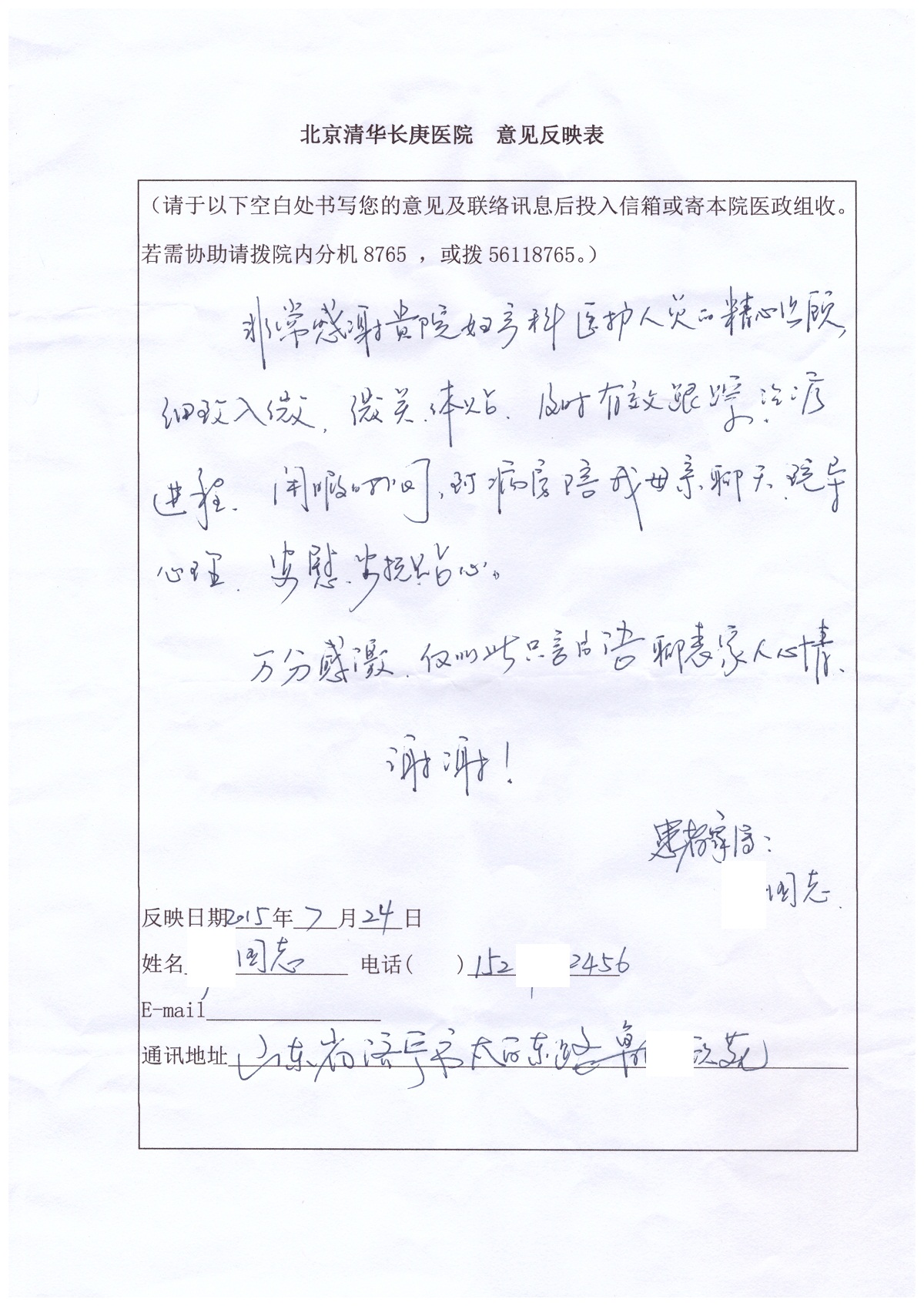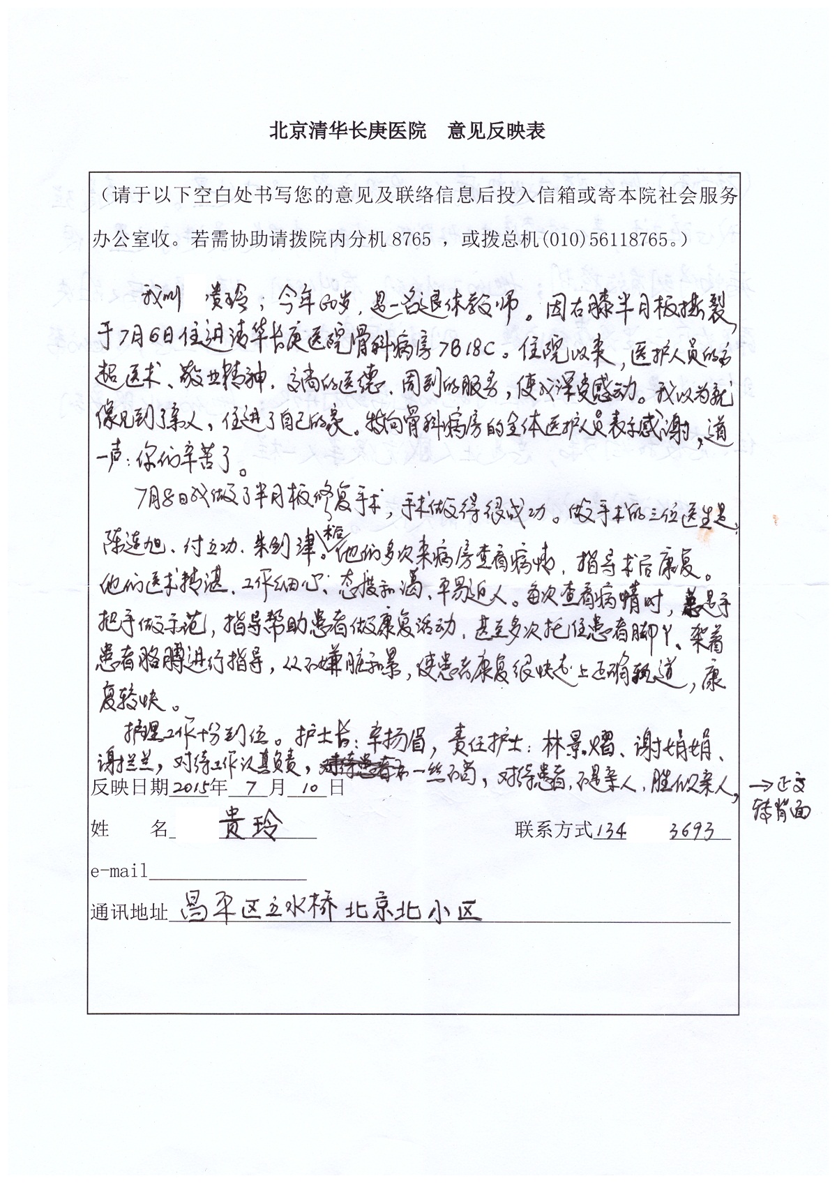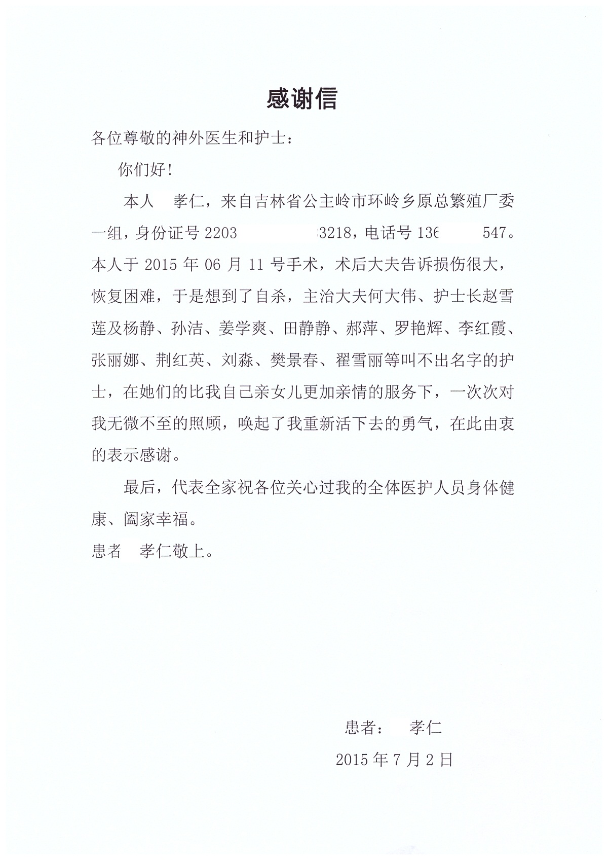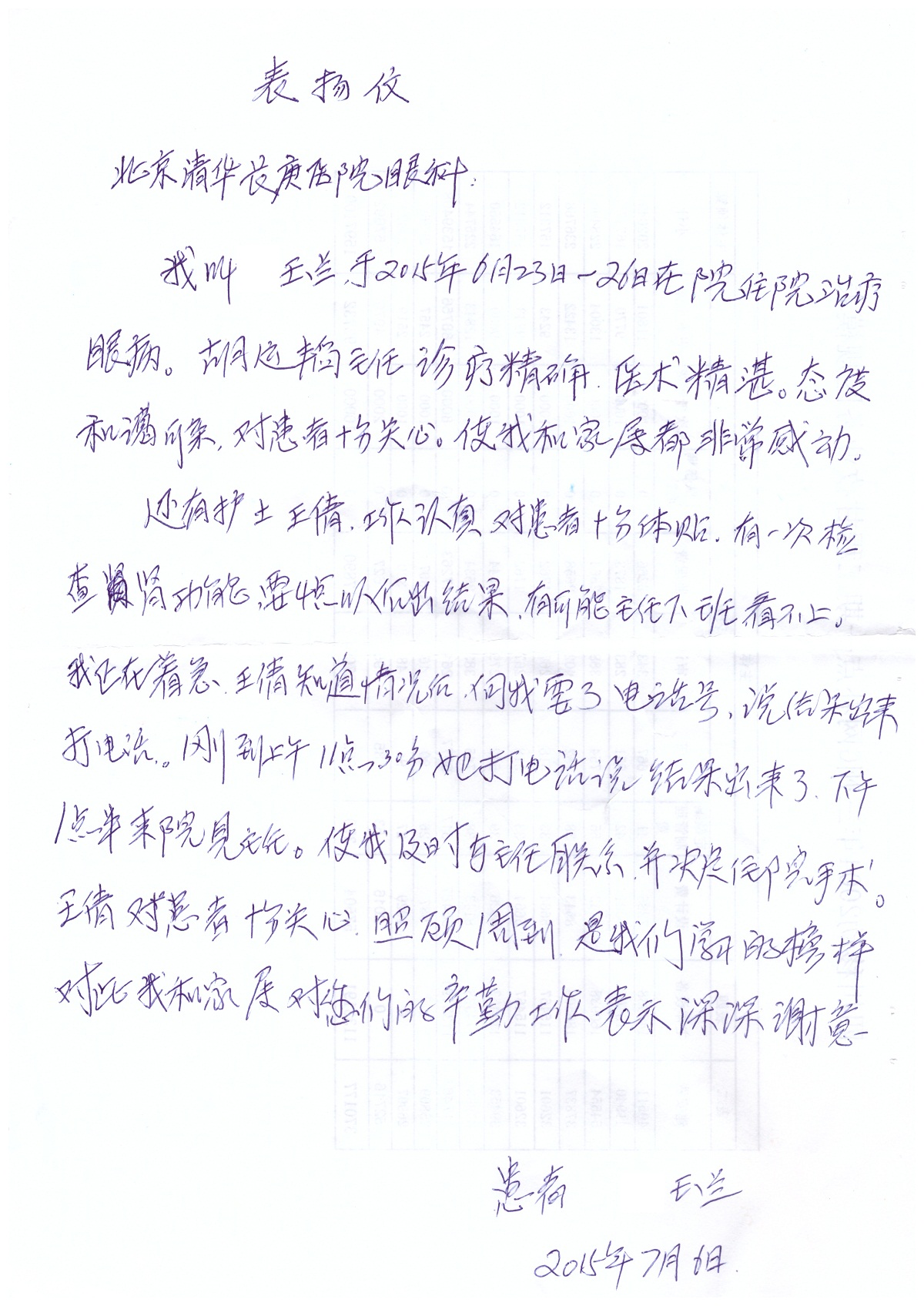 2015年7月,我院共接到患者及家属感谢信17封,其中肝胆外科董家鸿教授、项灿宏医师,神经外科王劲副院长、王贵怀主任、何大伟医师,眼科胡运韬主任,妇产科廖秦平主任,儿科晁爽副主任,骨科陈连旭副主任医师、付立功医师、朱剑津医师,口腔科聂小汉医师,健康管理中心王小毅医师,护理部宋美娜主管护师、辛扬眉护师、陈瑞敏护师、杨静护师、张曼丽护师、姜学爽护师、王倩护士、季静护士、孙洁护士、田静静护士、郝萍护士、罗艳辉护士、李红霞护士、张丽娜护士、荆红英护士、刘淼护士、樊景春护士、翟雪丽护士、林景熠护士、谢娟娟护士、谢兰兰护士、张宝乾护士、杜红愚护士、王赛南护士、李骏护士及5B、6A、7B病房、健康管理中心全体护理人员收到具名表扬。特此公告,以资鼓励!