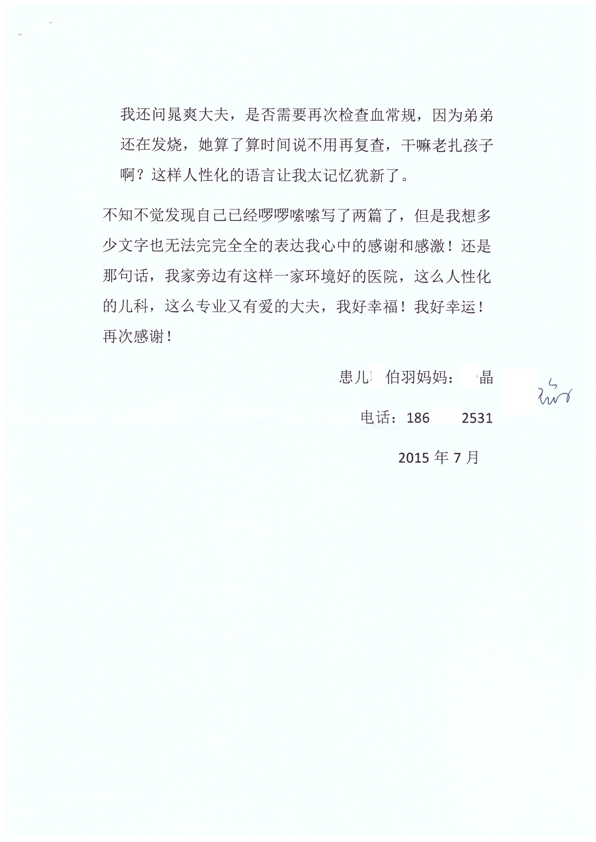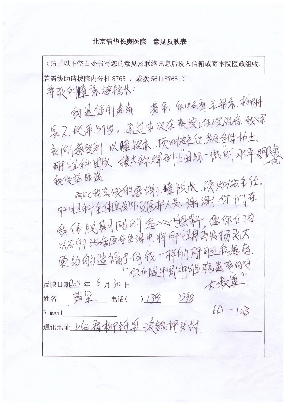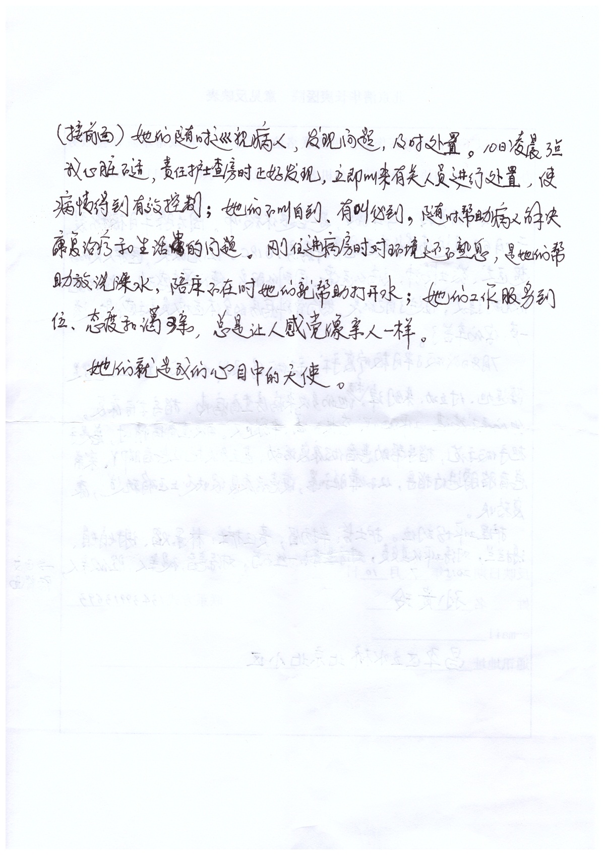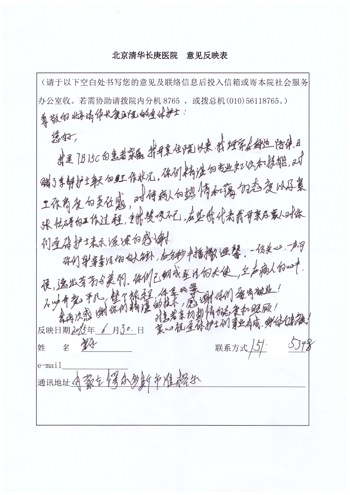 2015年7月,我院共接到患者及家属感谢信17封,其中肝胆外科董家鸿教授、项灿宏医师,神经外科王劲副院长、王贵怀主任、何大伟医师,眼科胡运韬主任,妇产科廖秦平主任,儿科晁爽副主任,骨科陈连旭副主任医师、付立功医师、朱剑津医师,口腔科聂小汉医师,健康管理中心王小毅医师,护理部宋美娜主管护师、辛扬眉护师、陈瑞敏护师、杨静护师、张曼丽护师、姜学爽护师、王倩护士、季静护士、孙洁护士、田静静护士、郝萍护士、罗艳辉护士、李红霞护士、张丽娜护士、荆红英护士、刘淼护士、樊景春护士、翟雪丽护士、林景熠护士、谢娟娟护士、谢兰兰护士、张宝乾护士、杜红愚护士、王赛南护士、李骏护士及5B、6A、7B病房、健康管理中心全体护理人员收到具名表扬。特此公告,以资鼓励!