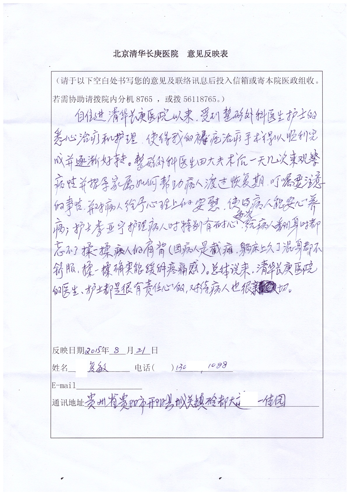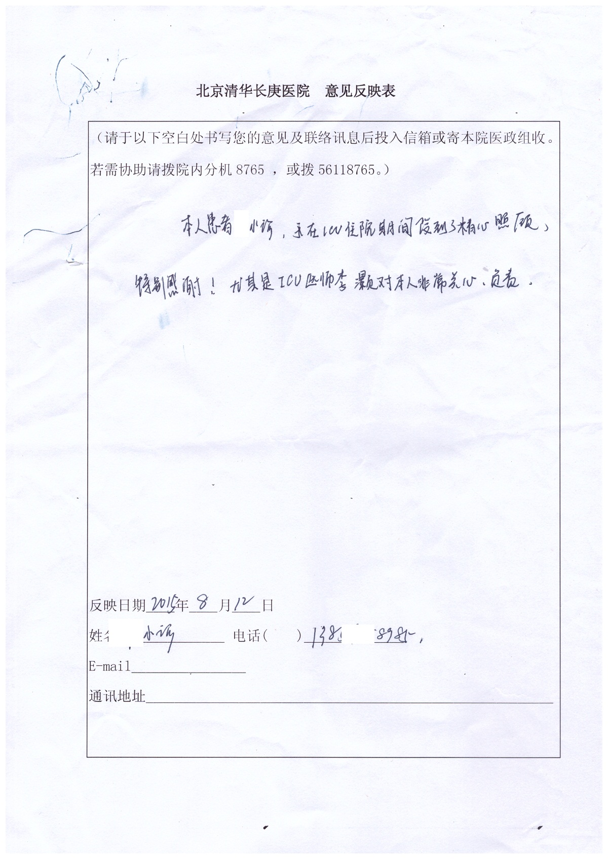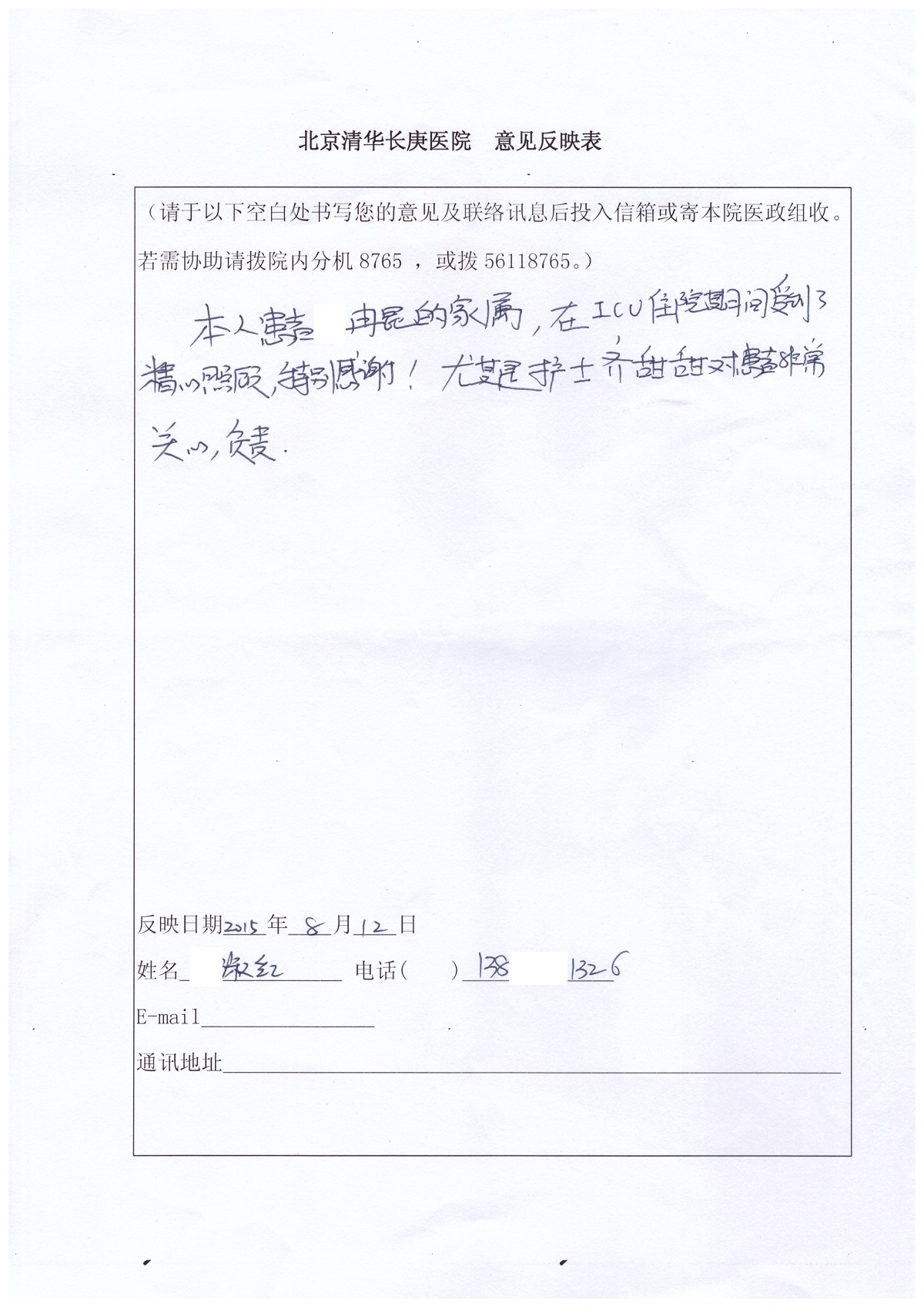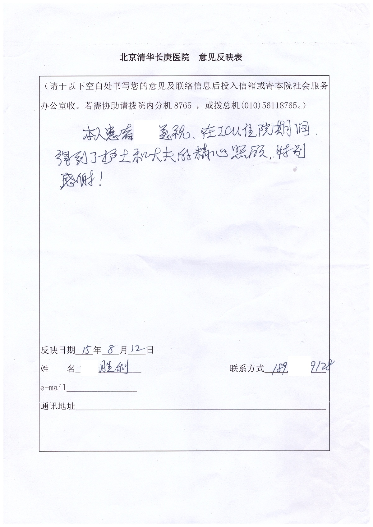 2015年8月,我院共接到患者及家属感谢信23封、锦旗4面,其中妇产科廖秦平主任、张蕾副主任医师、刘瑛医师,泌尿外科李建兴主任、张鑫副主任医师、魏义医师,神经外科王贵怀主任、杨世伟医师,肾脏内科李月红主任、王燕婴医师,消化内科相马宁主任医师、任渝棠医师,眼科胡运韬主任,儿科季丽娜副主任医师,心脏内科缪国斌副主任医师,普外科蔺宏伟副主任医师、孙孝文医师,骨科宋飞医师,ICU李灏医师,血液内科于凡医师,整形外科田金翌医师,康复医学科潘钰主任、萧演清医师、徐泉医师、陈固稳治疗师、孙小花治疗师、尹航治疗师、马春岳治疗师、李颜杝治疗师、屠媛媛治疗师,医事处陈佳欣,护理部王钰宁护师、李娜护师、辛扬眉护师、程美玲护师、侯多朵护师、孔君君护师、于小梅护师、宋辉辉护师、张慧文护师、方玲护师、吴琼护师、许平平护师、孙洁护士、齐甜甜护士、杨晓辉护士、李亚灵护士、覃丽妮护师、郝萍护士、田静静护士、荆红英护士、刘淼护士、谢兰兰护士、曹齐菲护士、李亚灵护士、谢娟娟护士、林景熠护士、季静护士、代海栾护士及ICU、6B、7A、7B病房全体护理人员收到具名表扬。特此公告,以资鼓励!