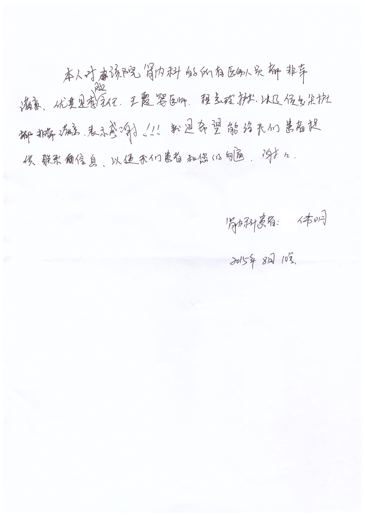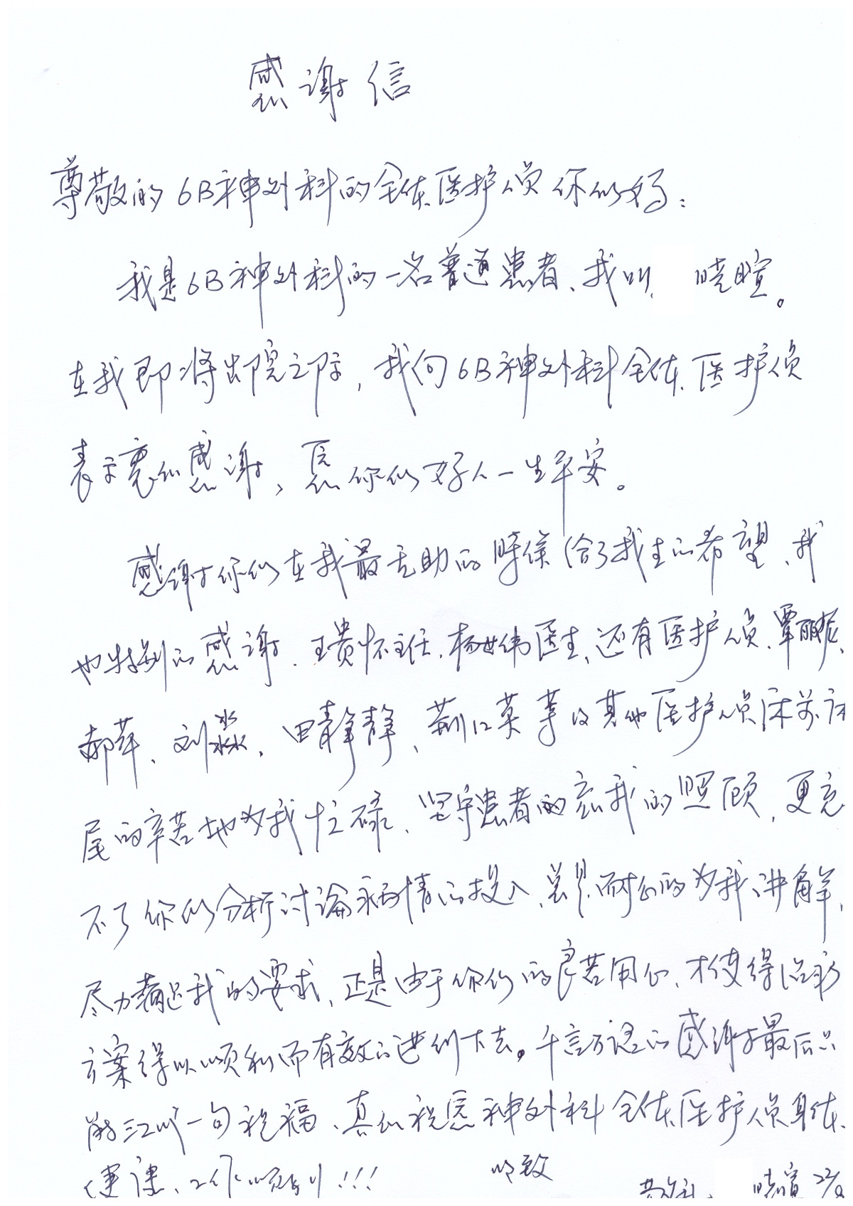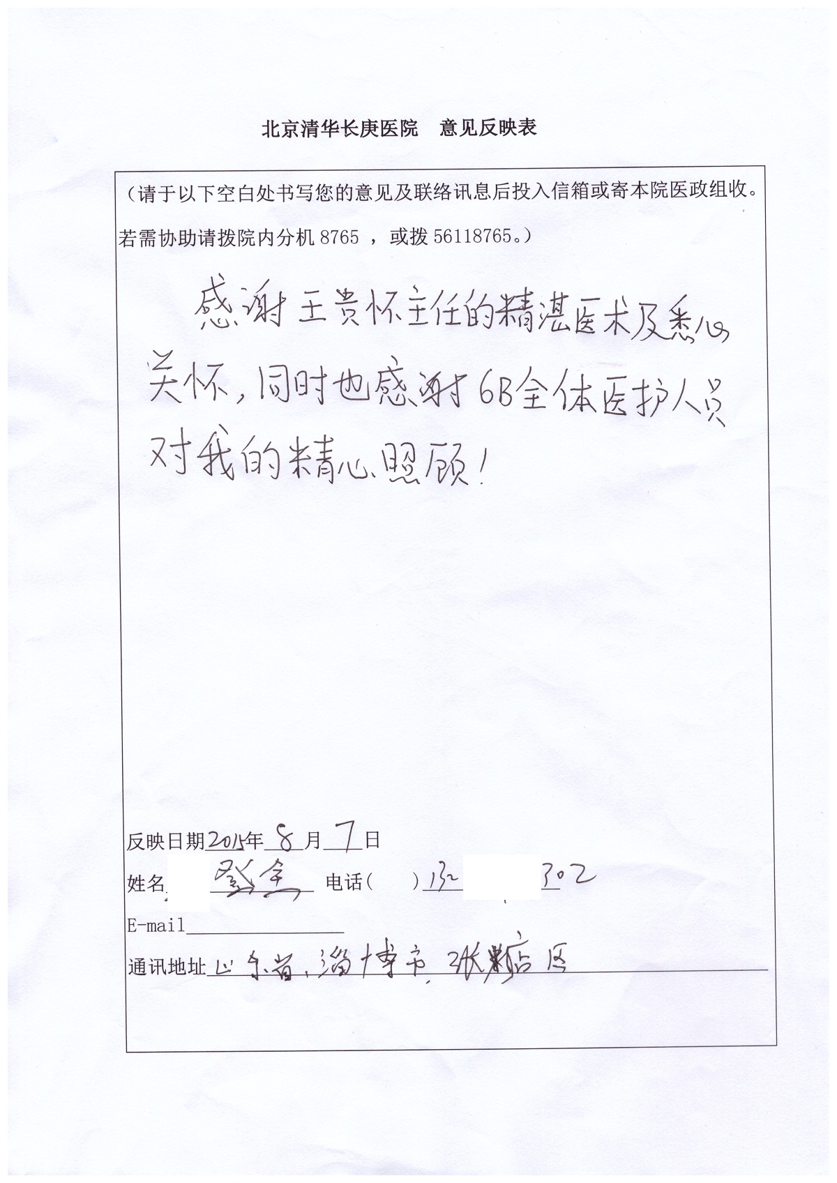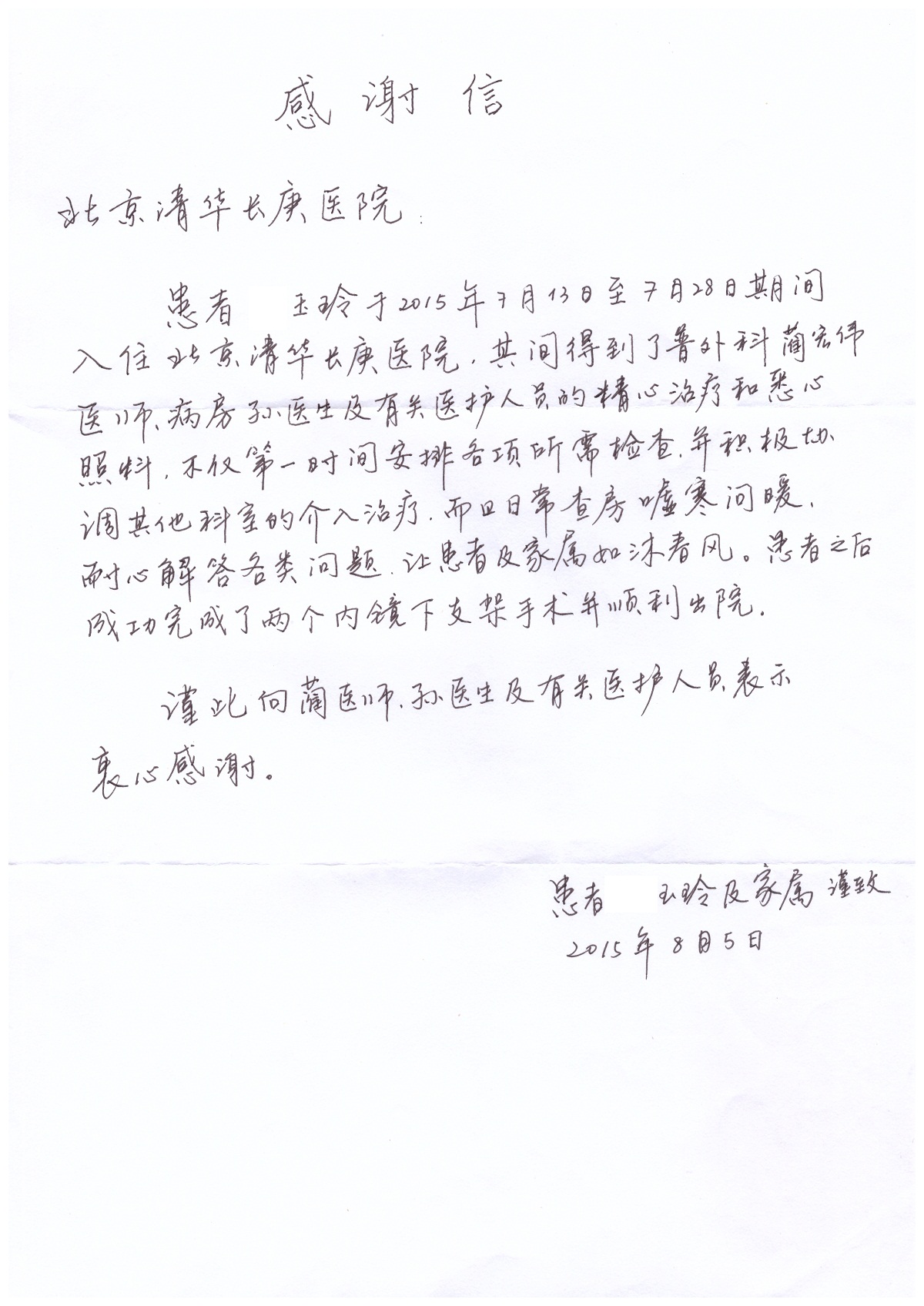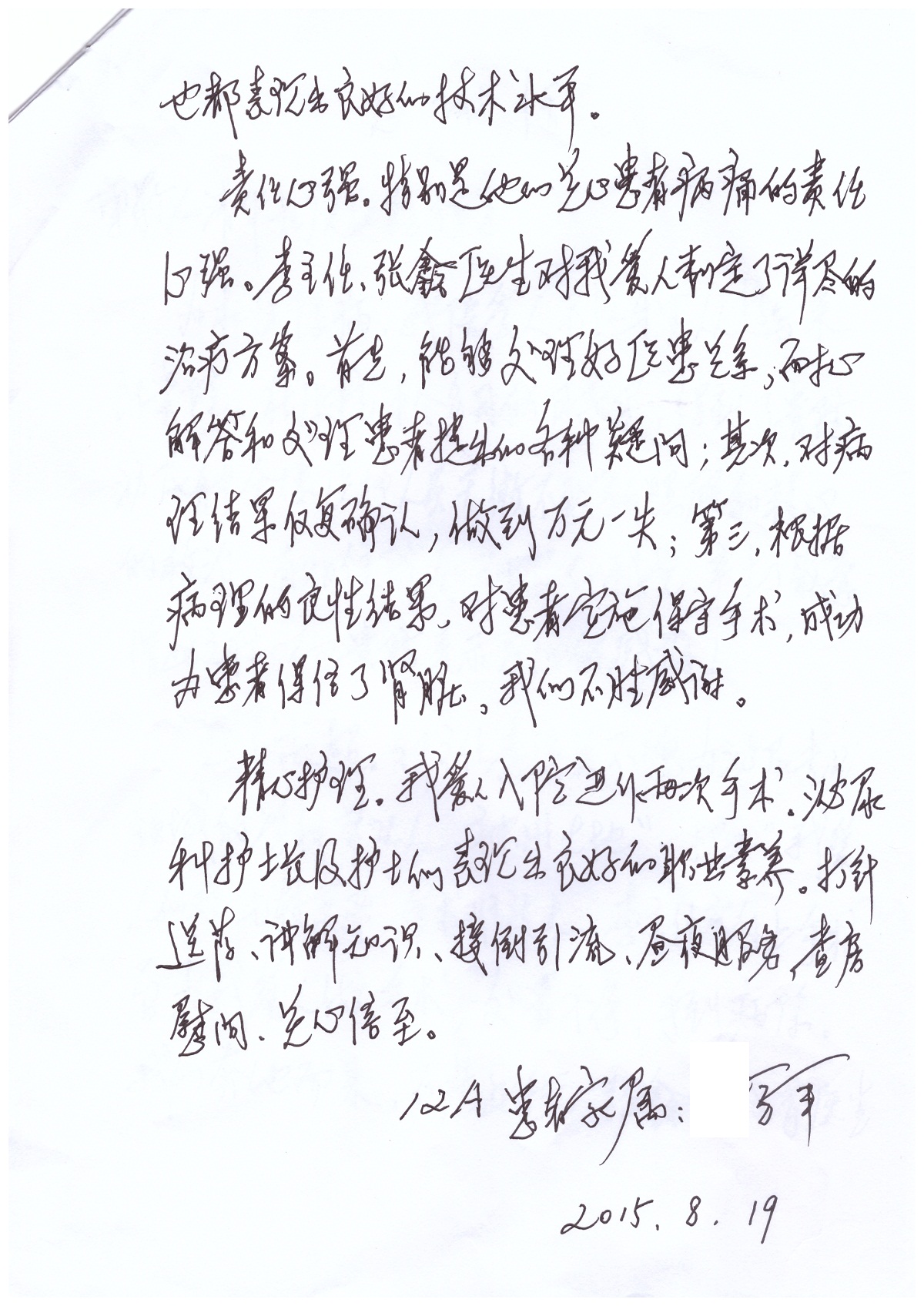 2015年8月,我院共接到患者及家属感谢信23封、锦旗4面,其中妇产科廖秦平主任、张蕾副主任医师、刘瑛医师,泌尿外科李建兴主任、张鑫副主任医师、魏义医师,神经外科王贵怀主任、杨世伟医师,肾脏内科李月红主任、王燕婴医师,消化内科相马宁主任医师、任渝棠医师,眼科胡运韬主任,儿科季丽娜副主任医师,心脏内科缪国斌副主任医师,普外科蔺宏伟副主任医师、孙孝文医师,骨科宋飞医师,ICU李灏医师,血液内科于凡医师,整形外科田金翌医师,康复医学科潘钰主任、萧演清医师、徐泉医师、陈固稳治疗师、孙小花治疗师、尹航治疗师、马春岳治疗师、李颜杝治疗师、屠媛媛治疗师,医事处陈佳欣,护理部王钰宁护师、李娜护师、辛扬眉护师、程美玲护师、侯多朵护师、孔君君护师、于小梅护师、宋辉辉护师、张慧文护师、方玲护师、吴琼护师、许平平护师、孙洁护士、齐甜甜护士、杨晓辉护士、李亚灵护士、覃丽妮护师、郝萍护士、田静静护士、荆红英护士、刘淼护士、谢兰兰护士、曹齐菲护士、李亚灵护士、谢娟娟护士、林景熠护士、季静护士、代海栾护士及ICU、6B、7A、7B病房全体护理人员收到具名表扬。特此公告,以资鼓励!