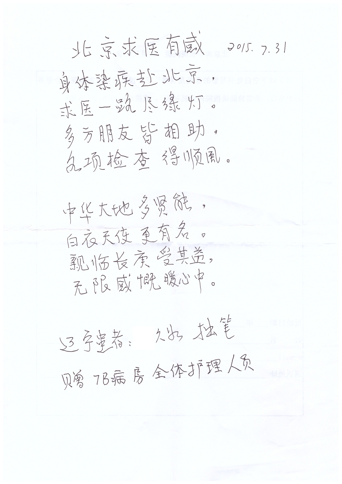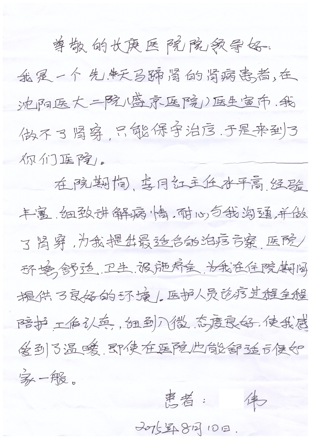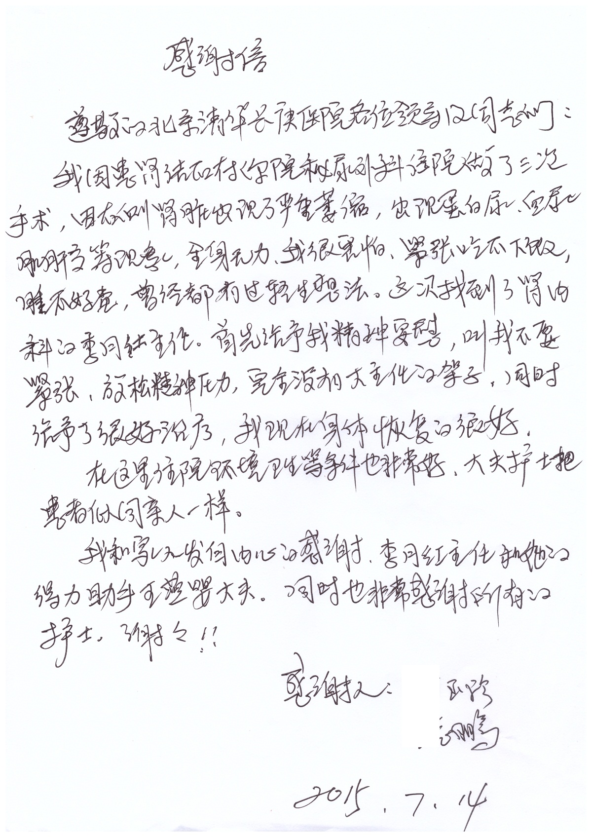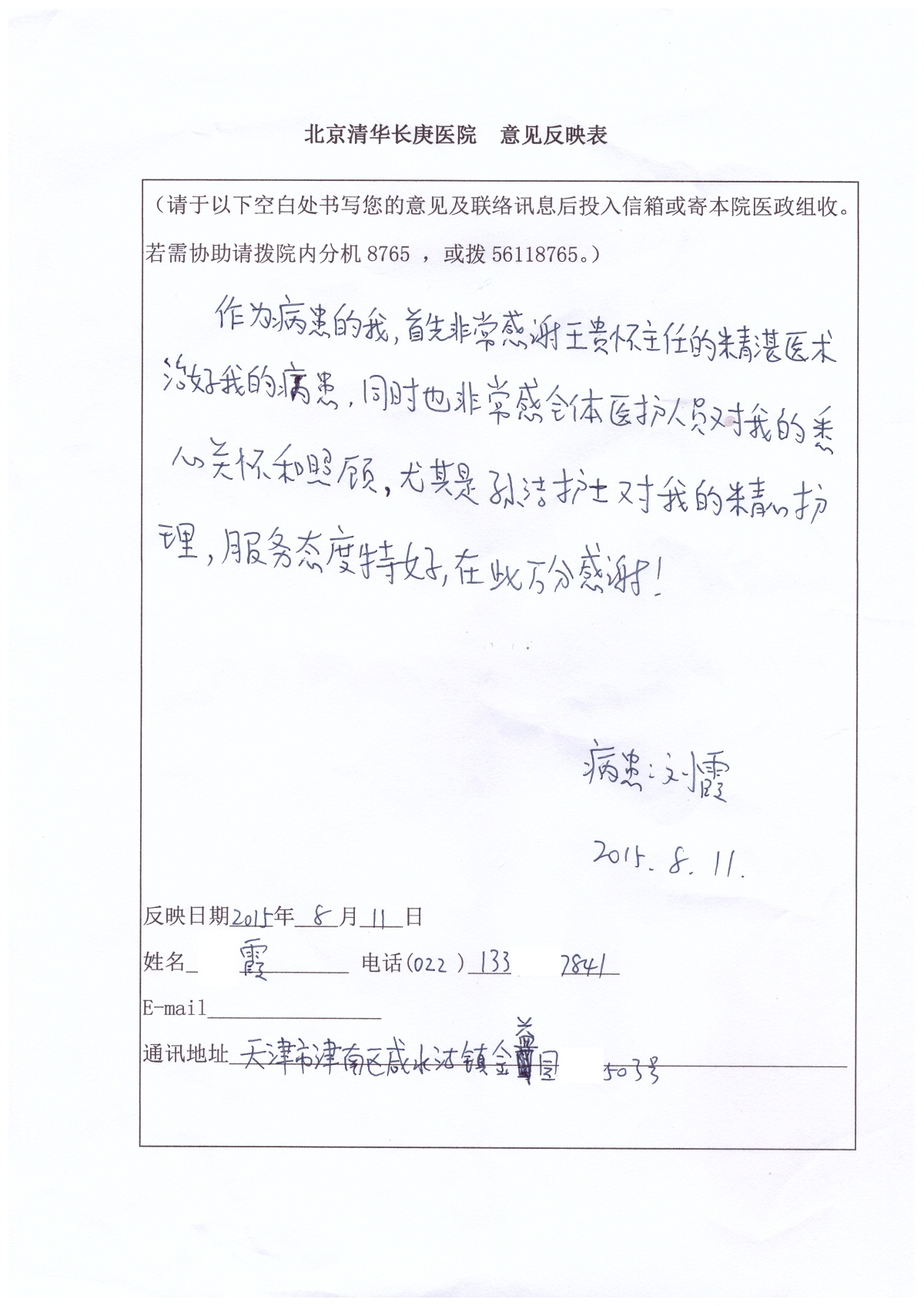 2015年8月,我院共接到患者及家属感谢信23封、锦旗4面,其中妇产科廖秦平主任、张蕾副主任医师、刘瑛医师,泌尿外科李建兴主任、张鑫副主任医师、魏义医师,神经外科王贵怀主任、杨世伟医师,肾脏内科李月红主任、王燕婴医师,消化内科相马宁主任医师、任渝棠医师,眼科胡运韬主任,儿科季丽娜副主任医师,心脏内科缪国斌副主任医师,普外科蔺宏伟副主任医师、孙孝文医师,骨科宋飞医师,ICU李灏医师,血液内科于凡医师,整形外科田金翌医师,康复医学科潘钰主任、萧演清医师、徐泉医师、陈固稳治疗师、孙小花治疗师、尹航治疗师、马春岳治疗师、李颜杝治疗师、屠媛媛治疗师,医事处陈佳欣,护理部王钰宁护师、李娜护师、辛扬眉护师、程美玲护师、侯多朵护师、孔君君护师、于小梅护师、宋辉辉护师、张慧文护师、方玲护师、吴琼护师、许平平护师、孙洁护士、齐甜甜护士、杨晓辉护士、李亚灵护士、覃丽妮护师、郝萍护士、田静静护士、荆红英护士、刘淼护士、谢兰兰护士、曹齐菲护士、李亚灵护士、谢娟娟护士、林景熠护士、季静护士、代海栾护士及ICU、6B、7A、7B病房全体护理人员收到具名表扬。特此公告,以资鼓励!