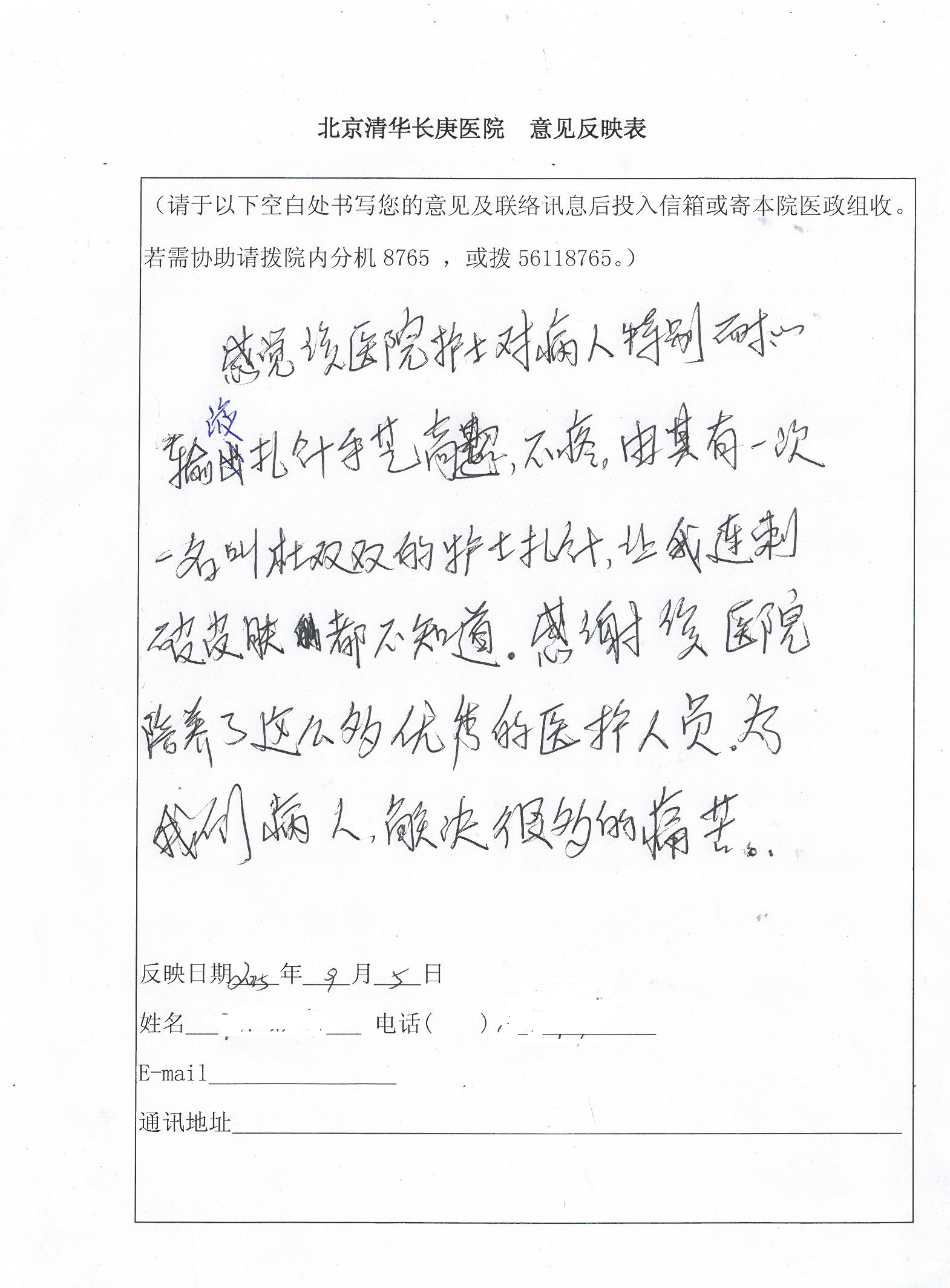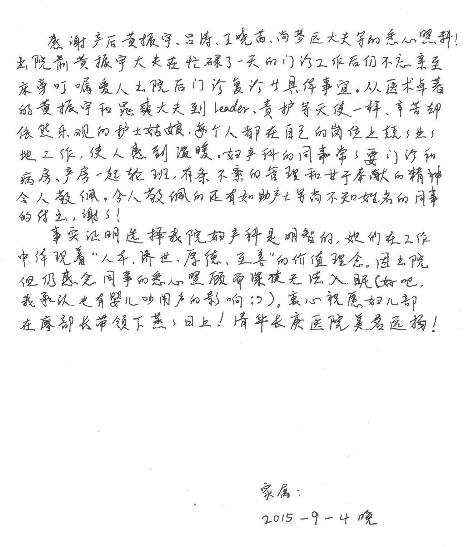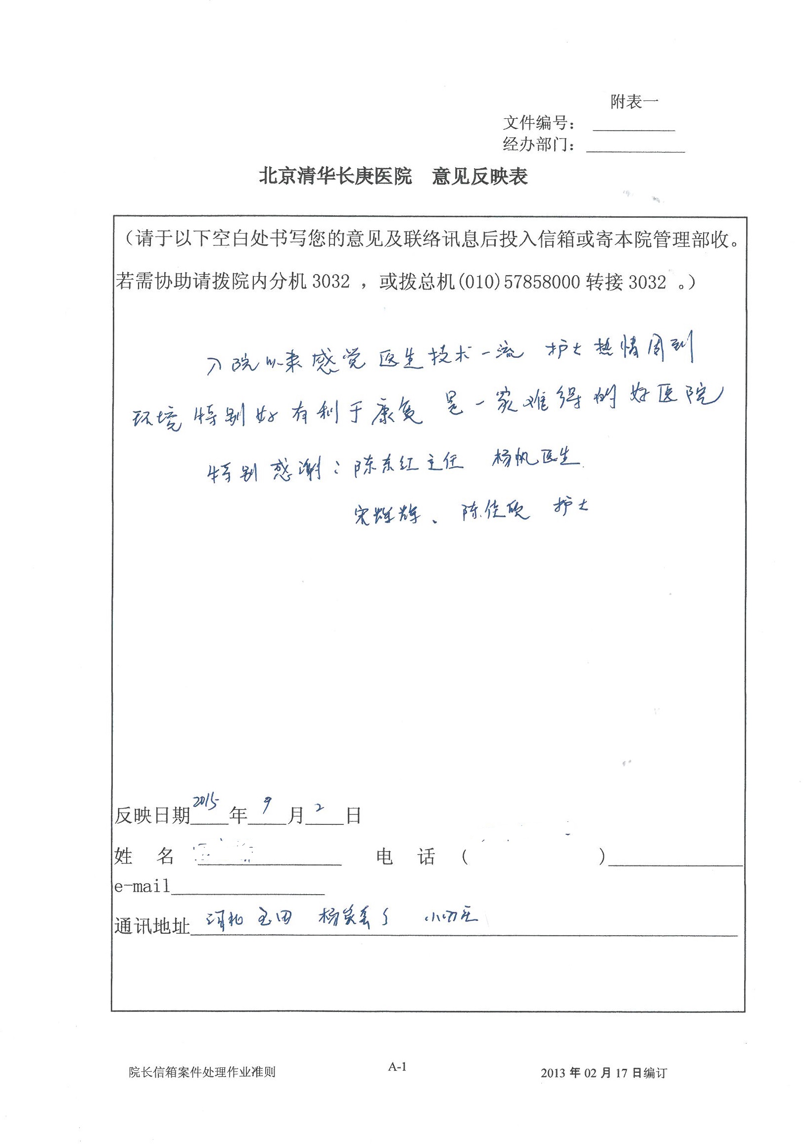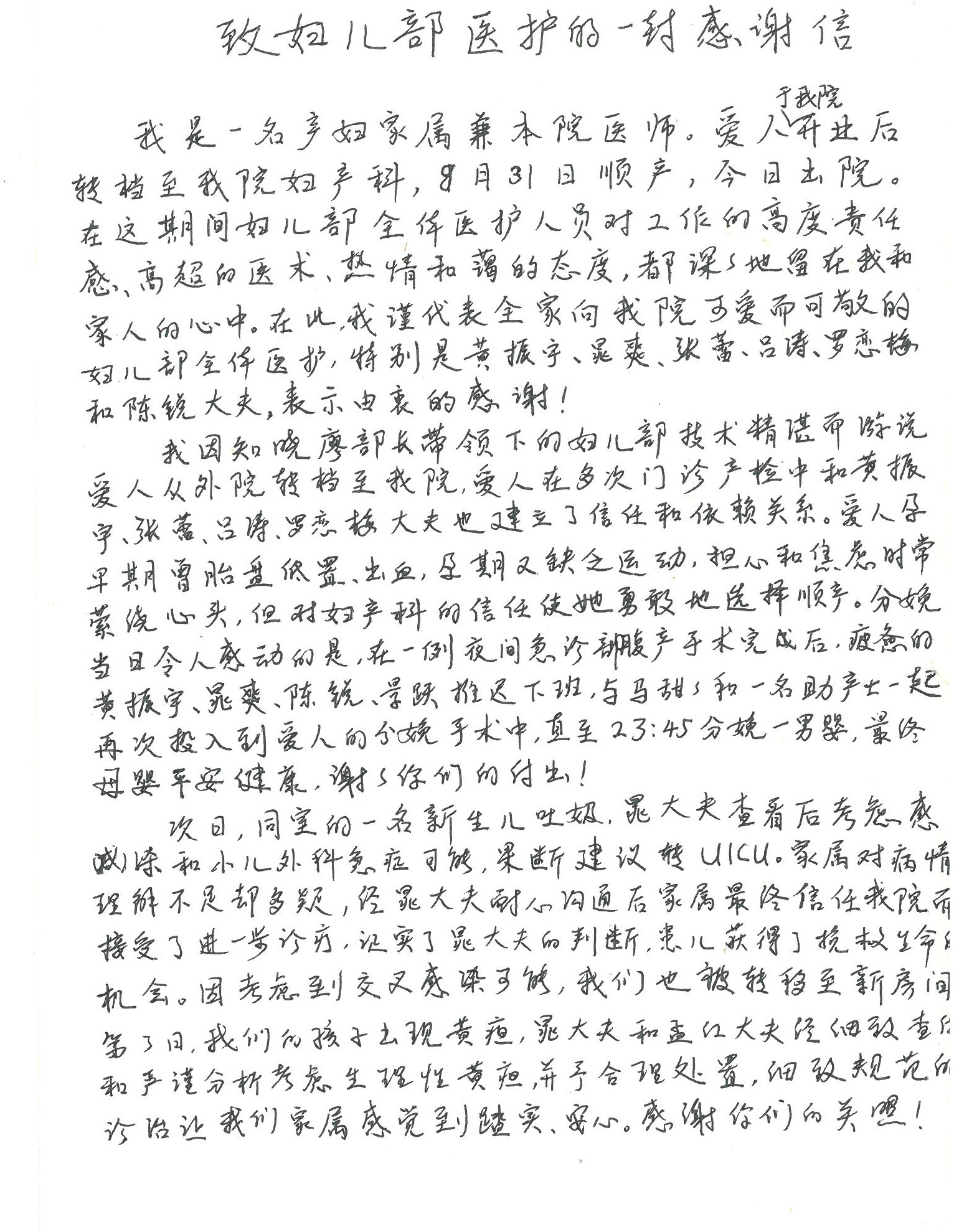 2015年9月,我院共接到患者及家属感谢信20封、锦旗2面,其中妇产科廖秦平主任、黄振宇副主任医师、张蕾副主任医师、吕涛主治医师、罗恋梅主治医师、杨曦主治医师、刘瑛医师、陈锐医师,泌尿外科陈松副主任医师、胡卫国主治医师,胸外科陈东红副主任医师、杨帆主治医师,骨科潘勇卫主任医师、肾脏内科李月红主任、温雯医师,儿科晁爽副主任医师,心脏内科缪国斌副主任医师、张鸥住院医师,康复医学科潘钰主任、萧演清医师、尹航治疗师、李颜杝治疗师,放射科马永强主治医师,医事处陈佳欣,护理部刘虹督导、张传云护士长、刘菲菲、景跃、杨曦、王秋惠、朱洁、宋辉辉、杜双双及7B病房全体护理人员、全体志愿者老师收到具名表扬。特此公告,以资鼓励!