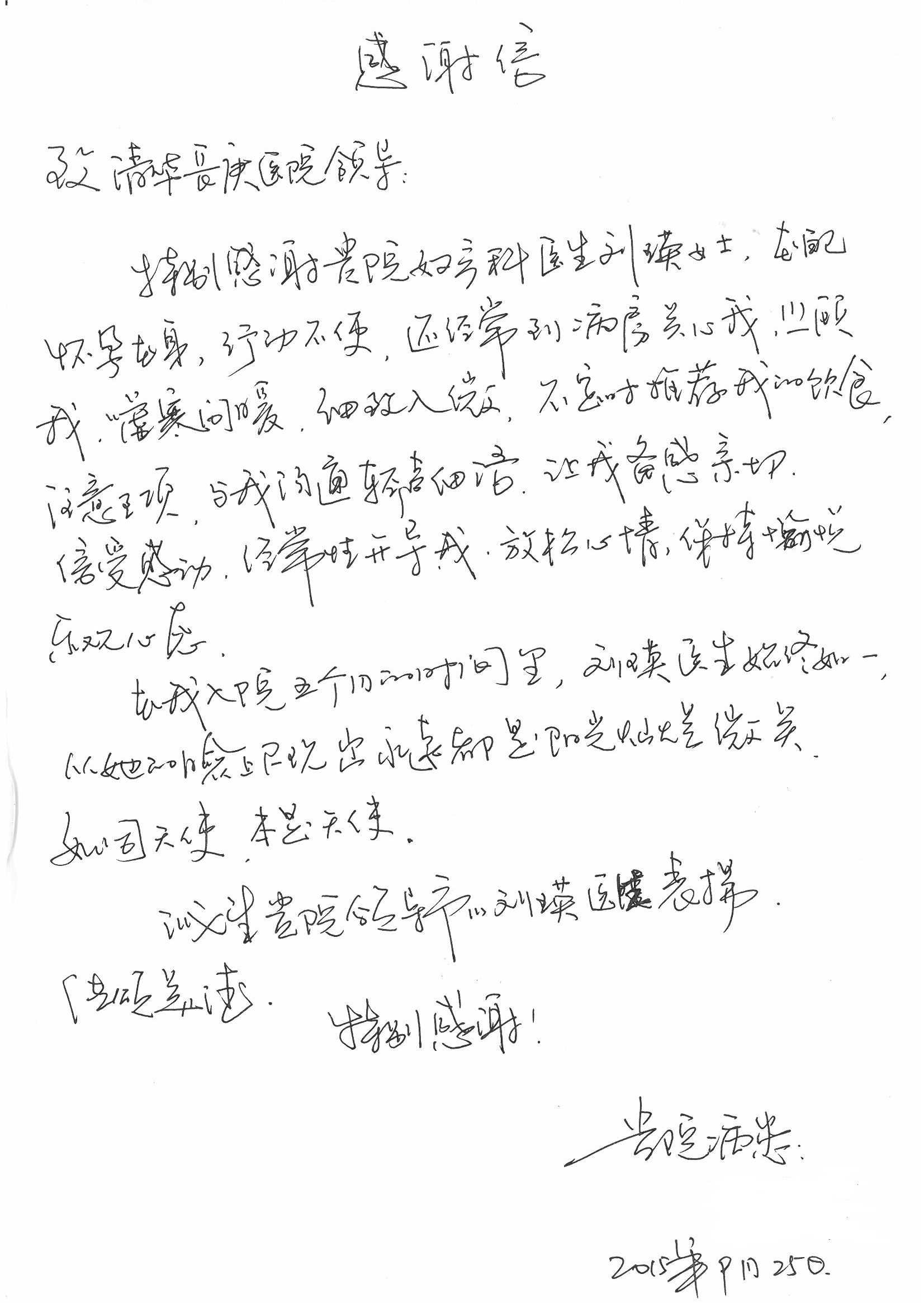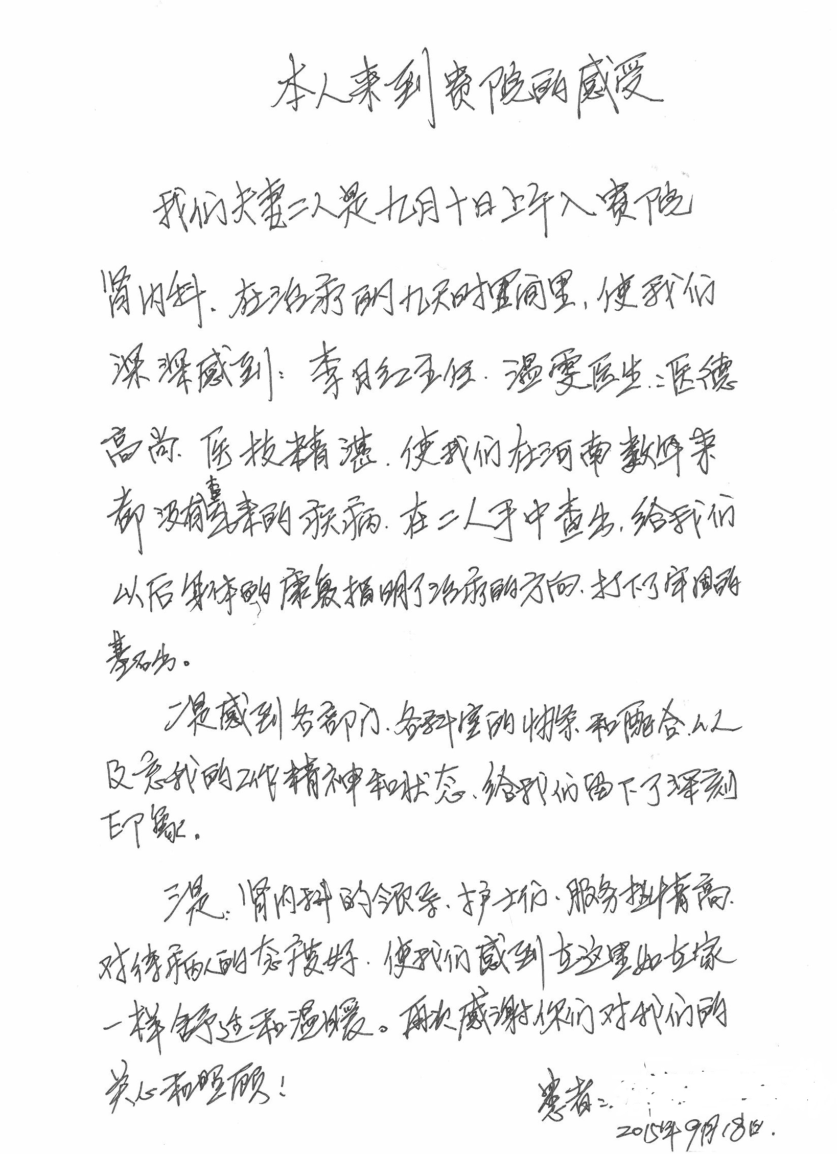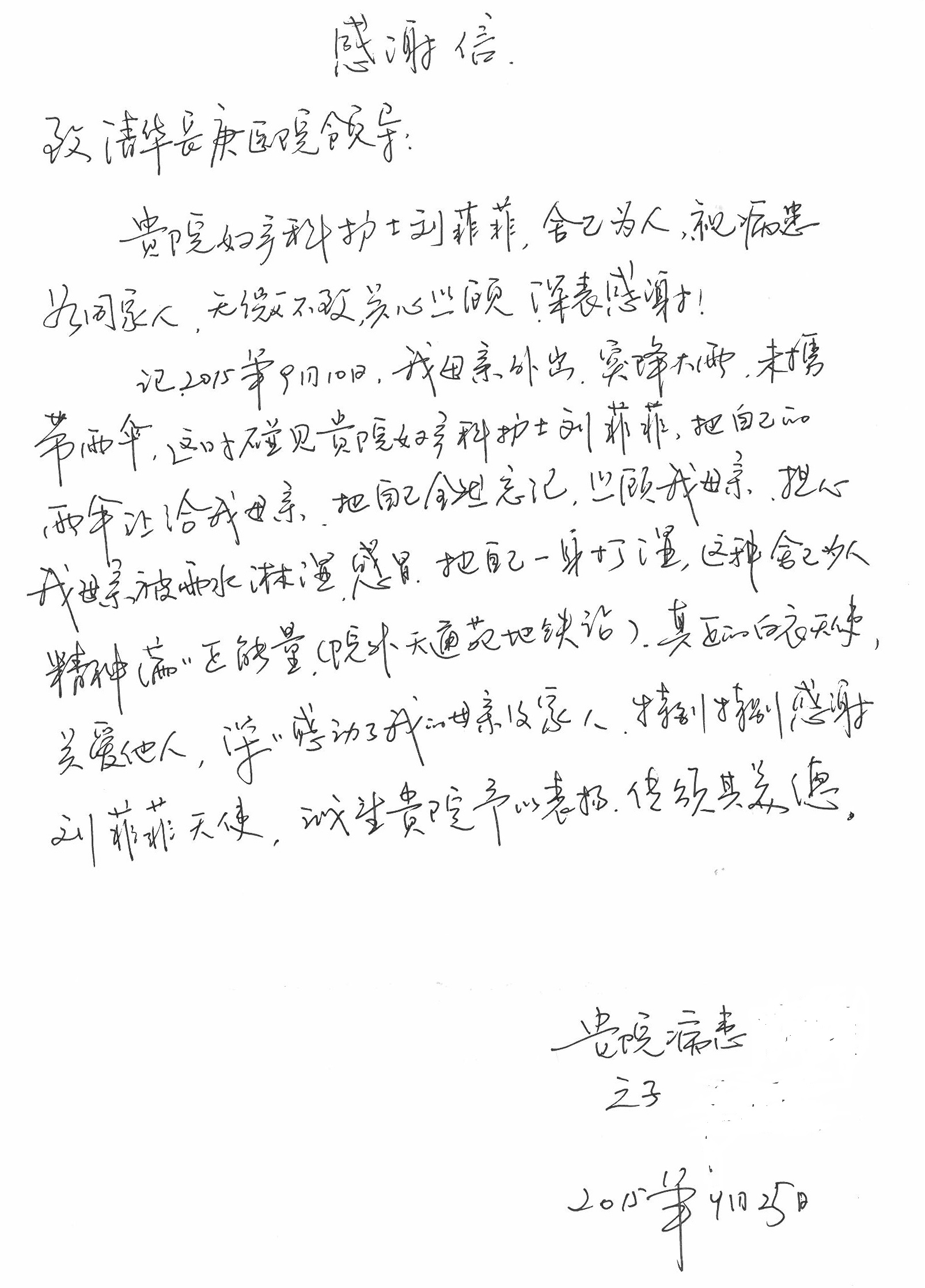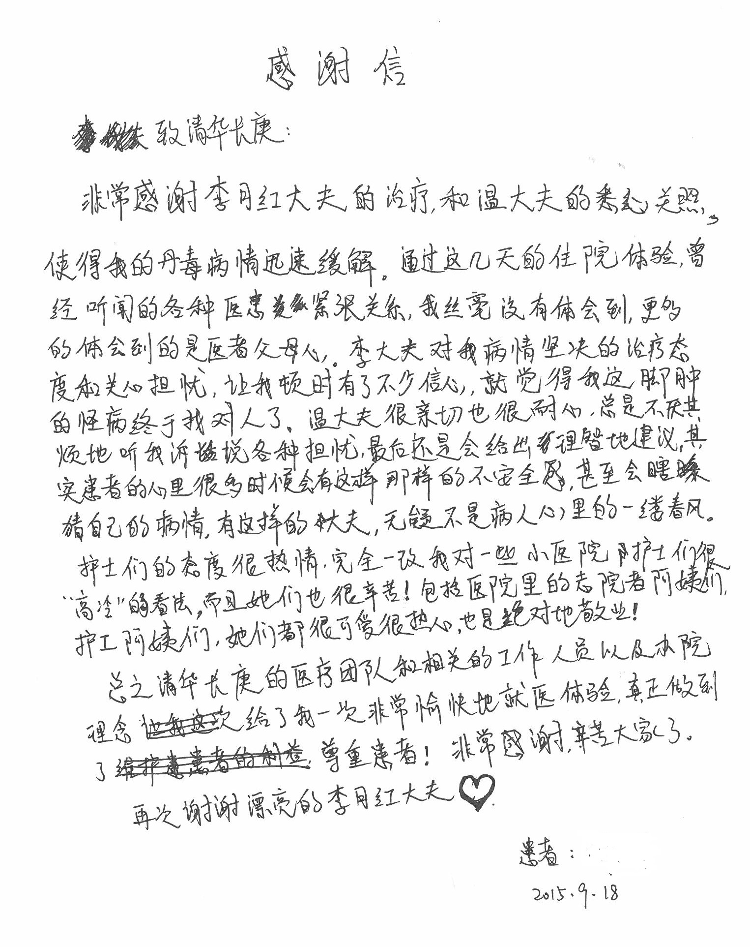 2015年9月,我院共接到患者及家属感谢信20封、锦旗2面,其中妇产科廖秦平主任、黄振宇副主任医师、张蕾副主任医师、吕涛主治医师、罗恋梅主治医师、杨曦主治医师、刘瑛医师、陈锐医师,泌尿外科陈松副主任医师、胡卫国主治医师,胸外科陈东红副主任医师、杨帆主治医师,骨科潘勇卫主任医师、肾脏内科李月红主任、温雯医师,儿科晁爽副主任医师,心脏内科缪国斌副主任医师、张鸥住院医师,康复医学科潘钰主任、萧演清医师、尹航治疗师、李颜杝治疗师,放射科马永强主治医师,医事处陈佳欣,护理部刘虹督导、张传云护士长、刘菲菲、景跃、杨曦、王秋惠、朱洁、宋辉辉、杜双双及7B病房全体护理人员、全体志愿者老师收到具名表扬。特此公告,以资鼓励!