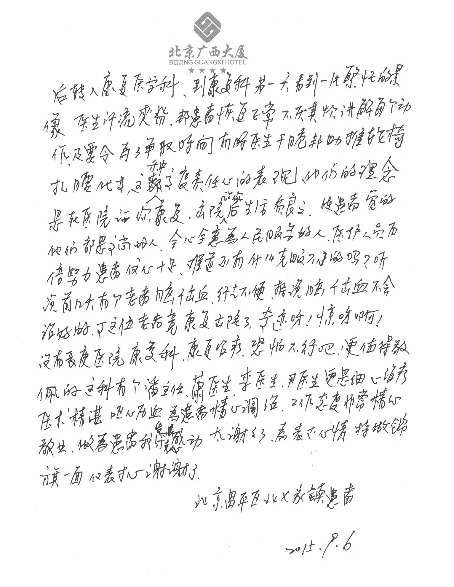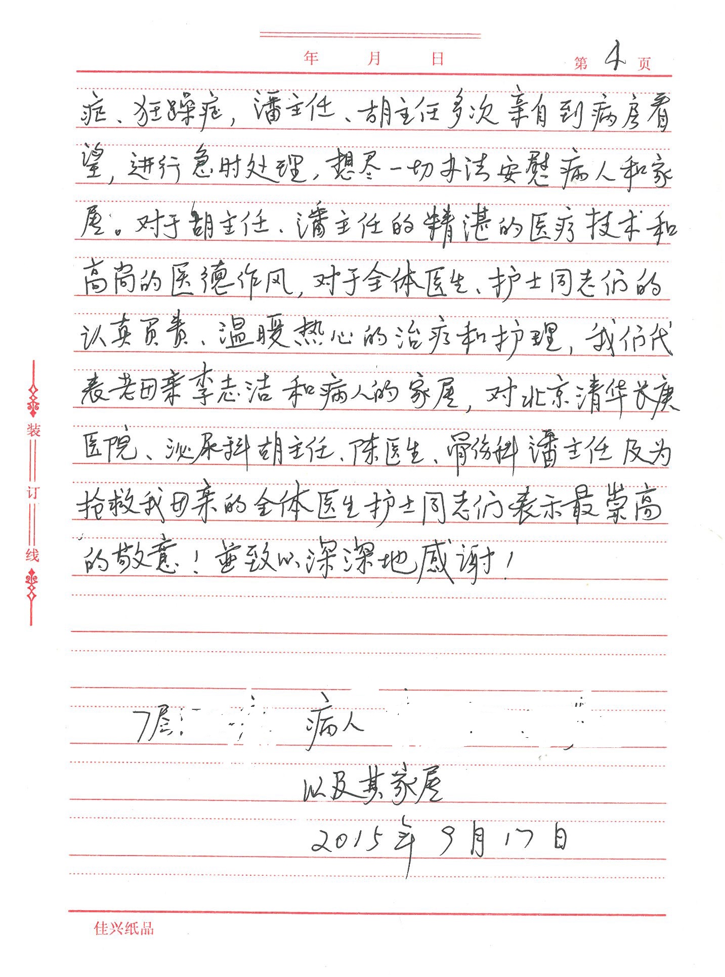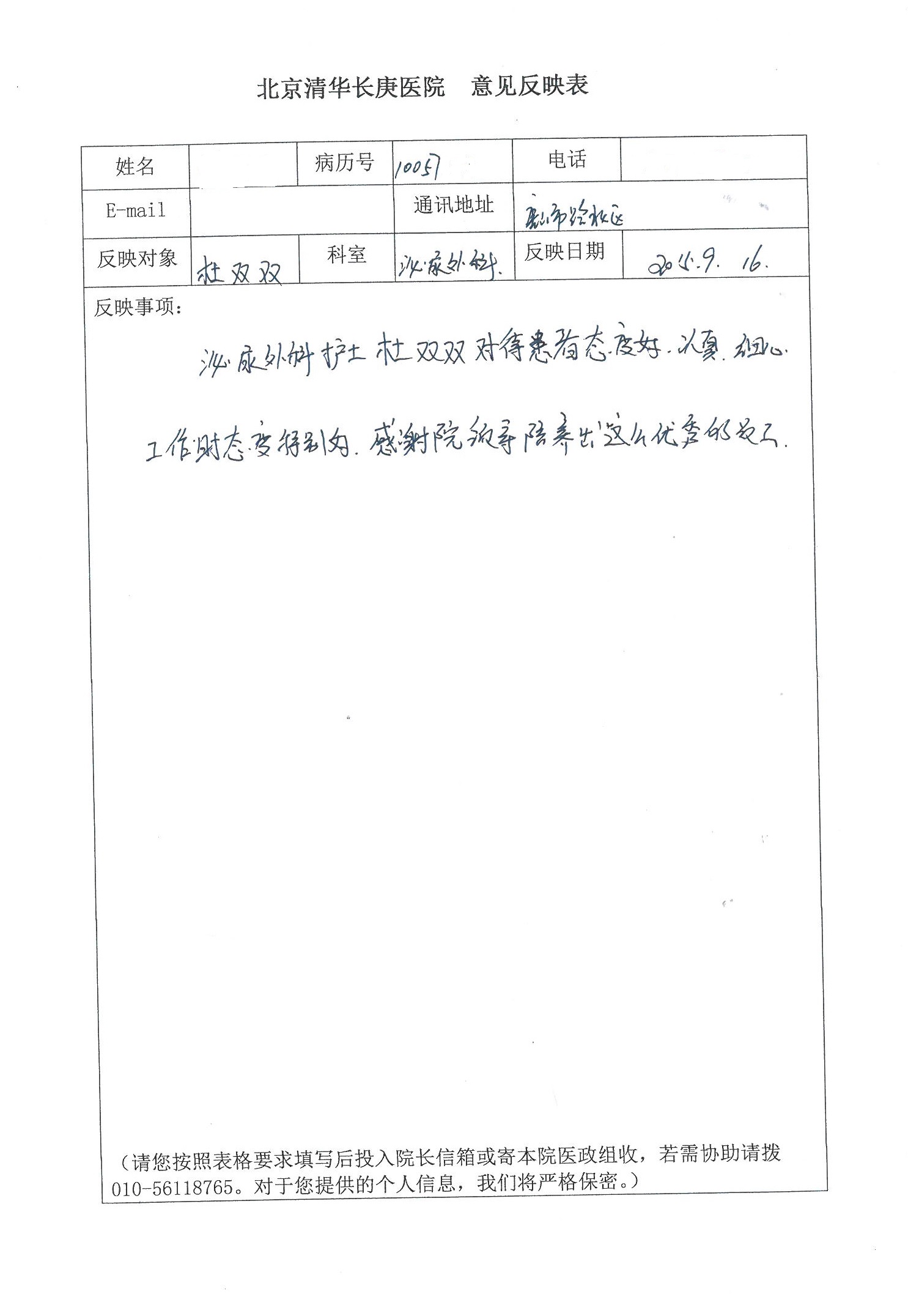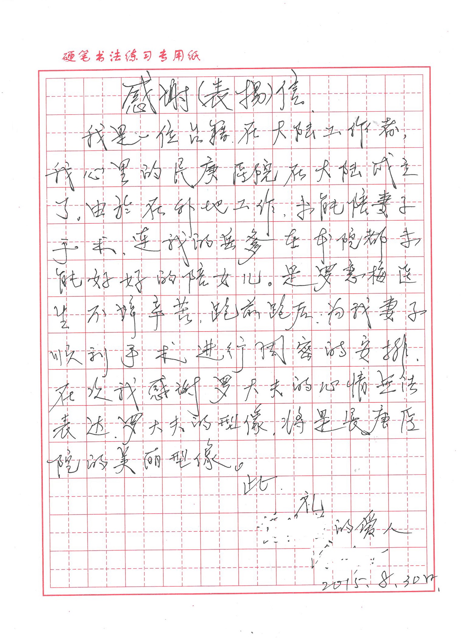2015年9月,我院共接到患者及家属感谢信20封、锦旗2面,其中妇产科廖秦平主任、黄振宇副主任医师、张蕾副主任医师、吕涛主治医师、罗恋梅主治医师、杨曦主治医师、刘瑛医师、陈锐医师,泌尿外科陈松副主任医师、胡卫国主治医师,胸外科陈东红副主任医师、杨帆主治医师,骨科潘勇卫主任医师、肾脏内科李月红主任、温雯医师,儿科晁爽副主任医师,心脏内科缪国斌副主任医师、张鸥住院医师,康复医学科潘钰主任、萧演清医师、尹航治疗师、李颜杝治疗师,放射科马永强主治医师,医事处陈佳欣,护理部刘虹督导、张传云护士长、刘菲菲、景跃、杨曦、王秋惠、朱洁、宋辉辉、杜双双及7B病房全体护理人员、全体志愿者老师收到具名表扬。特此公告,以资鼓励!