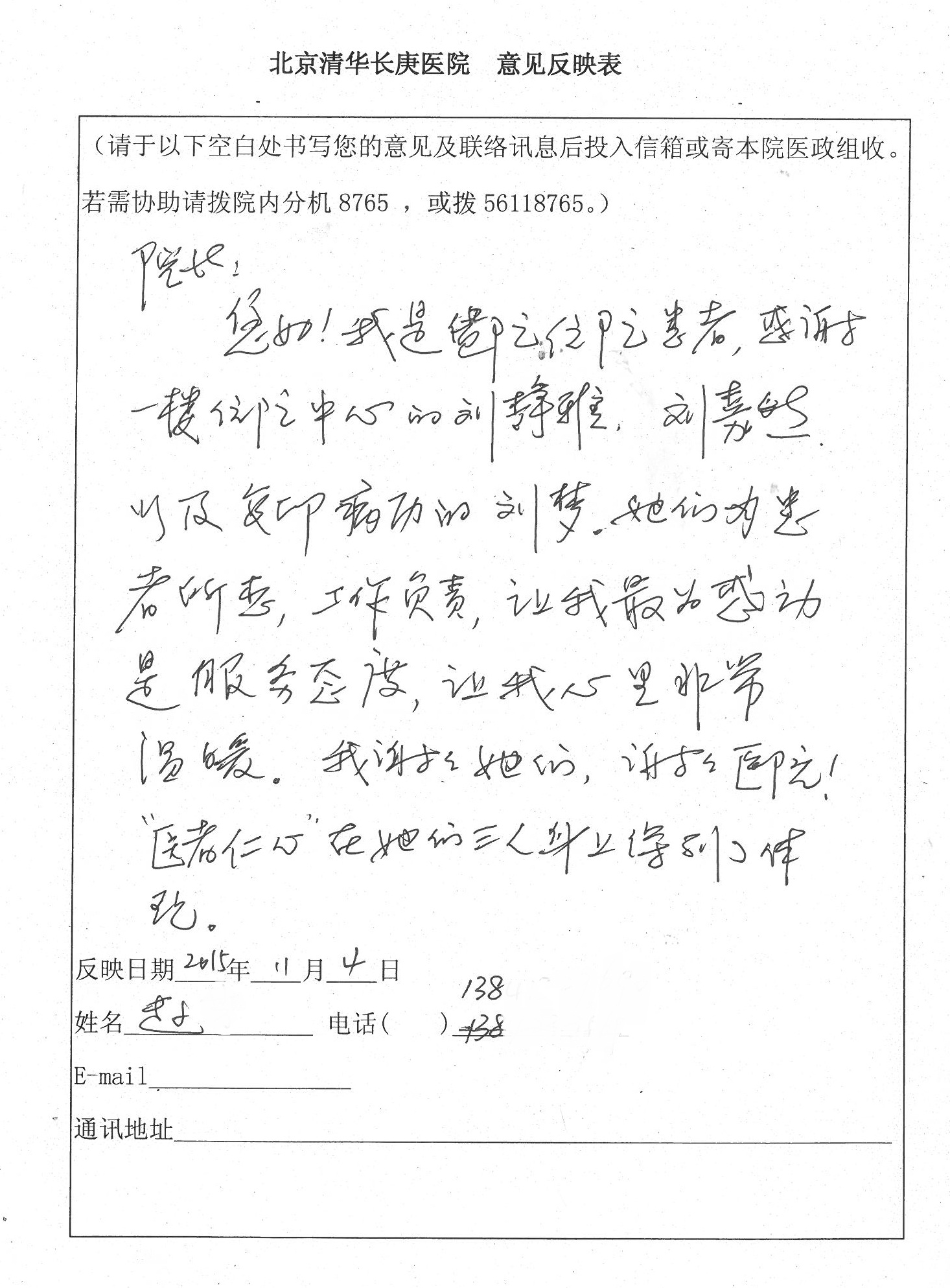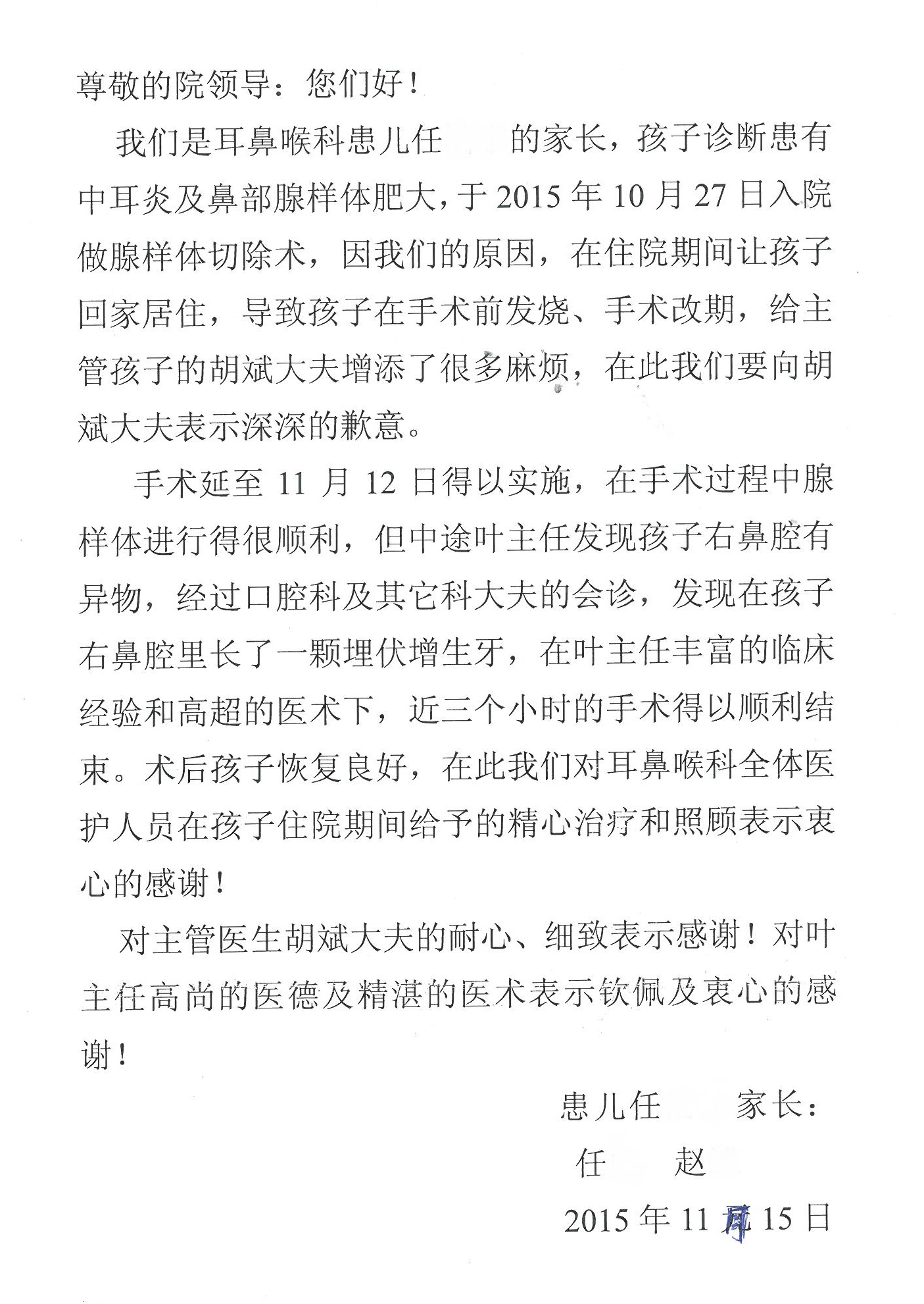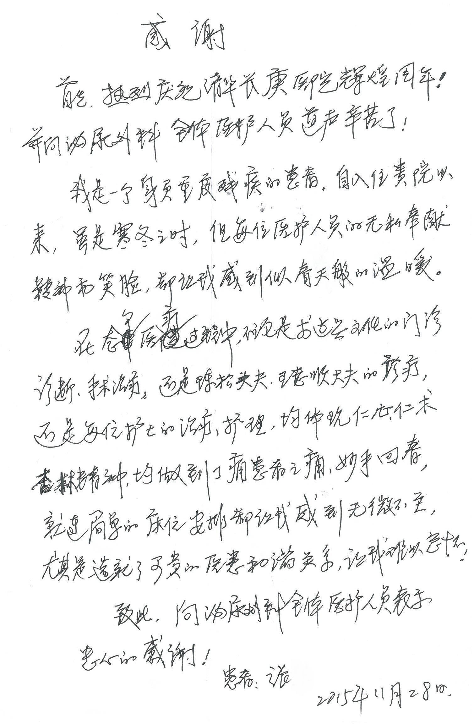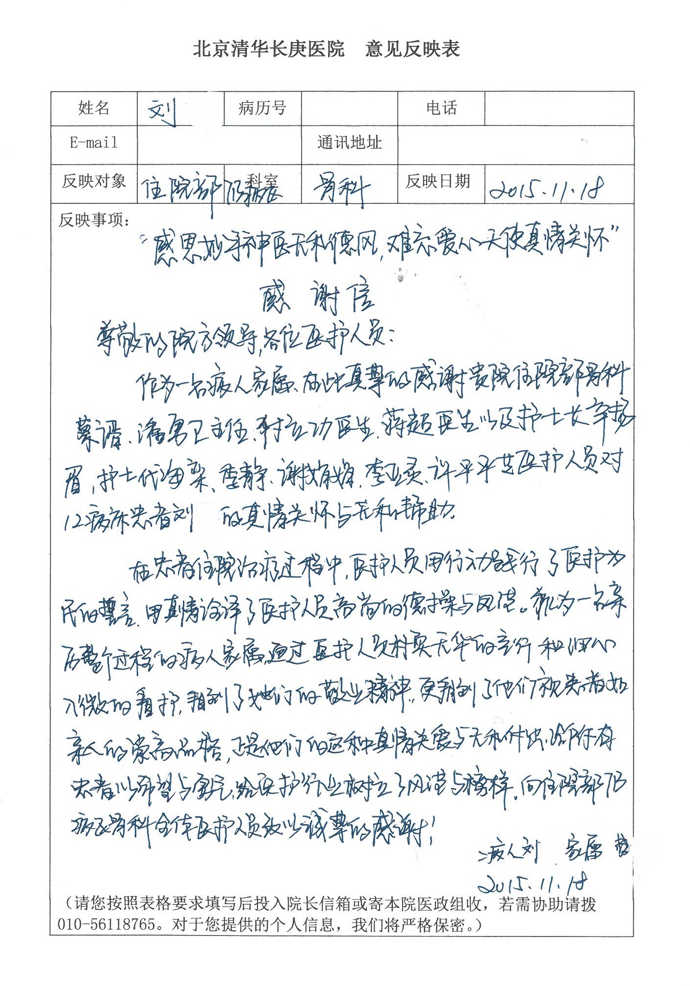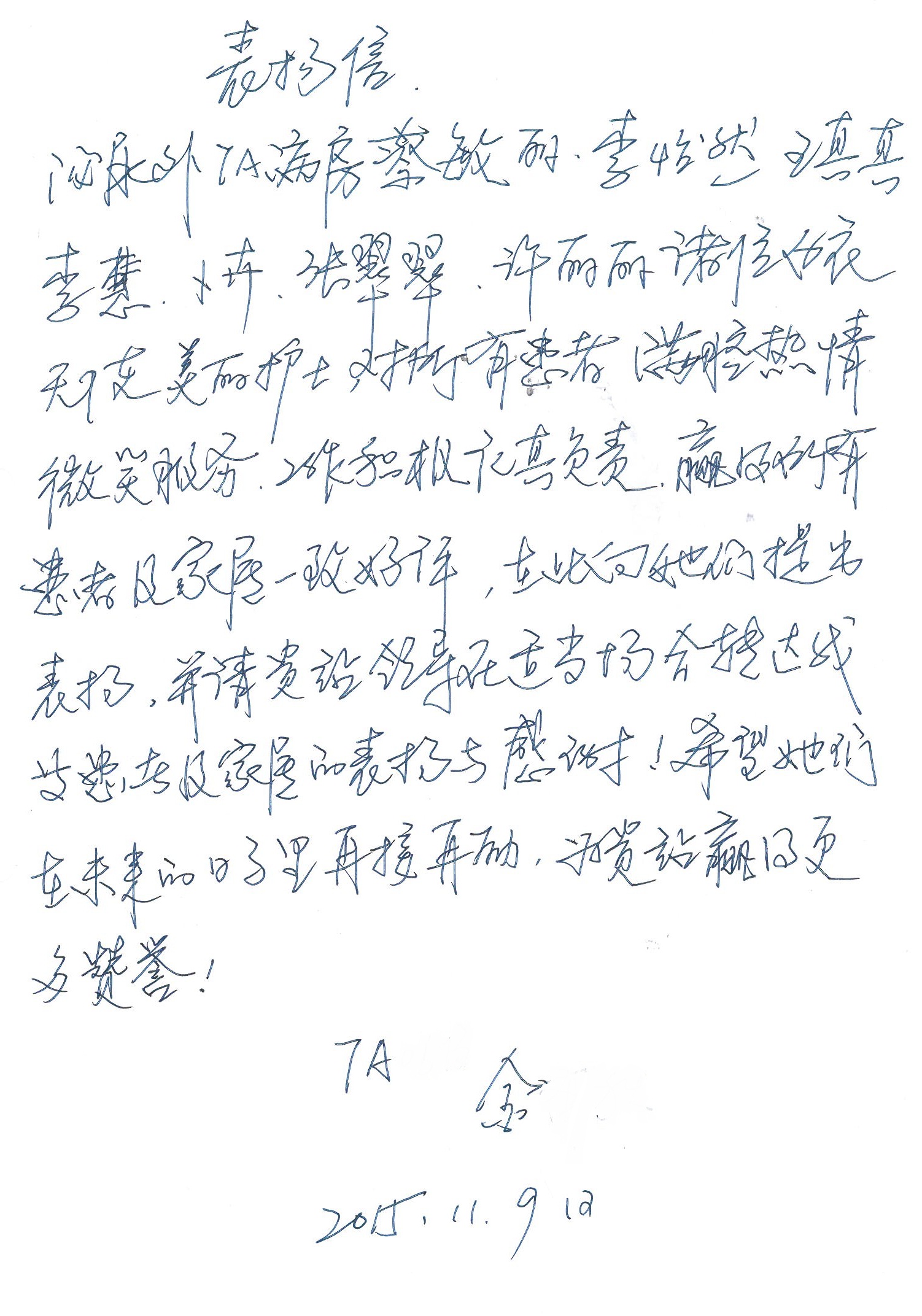 2015年11月,我院共接到患者及家属感谢信32封,其中肝胆胰外科董家鸿院长、曾建平主治医师、于里涵医师,神经外科王劲副院长、王贵怀主任、郭毅副主任医师、苏伟主治医师、杨峰医师,普通外科蔺宏伟副主任医师,骨科潘勇卫主任医师、蔡谞主任医师、陈连旭副主任医师、宋飞主治医师、付立功医师、蒋超医师,胸腔外科陈东红副主任医师、杨帆主治医师,泌尿外科李建兴主任、陈松副主任医师、胡卫国主治医师、王志顺医师,妇产科廖秦平主任、吕涛主治医师、马珂主治医师,耳鼻咽喉头颈外科叶京英主任、胡斌医师,心内科张萍主任、缪国斌副主任医师、佘飞副主任医师、薛亚军主治医师、王昊天医师、孙玉杰医师、张鸥医师,肾内科李月红主任,神经内科冯新红主治医师、李秀丽医师、王也医师,内分泌与代谢科曹沉香主治医师,住院中心刘静雅、刘嘉然、刘梦,社会服务办公室赵晓兰,保洁人员王俊连,护理部王莹、蔡敏丽、李怡然、王真真、李慧、卜卉、张翠翠、许丽丽、张会芳、杨静、荆红英、张春红、谢兰兰、谢娟娟、于小梅、许平平、张慧文、曹奇菲、方玲、李亚灵、辛扬眉、孔君君、王沫竹、代海栾、季静、袁雪丽护理人员及骨科、肝胆胰外科、神经外科、妇产科、耳鼻咽喉头颈外科、血管外科、泌尿外科全体医护人员收到具名表扬。