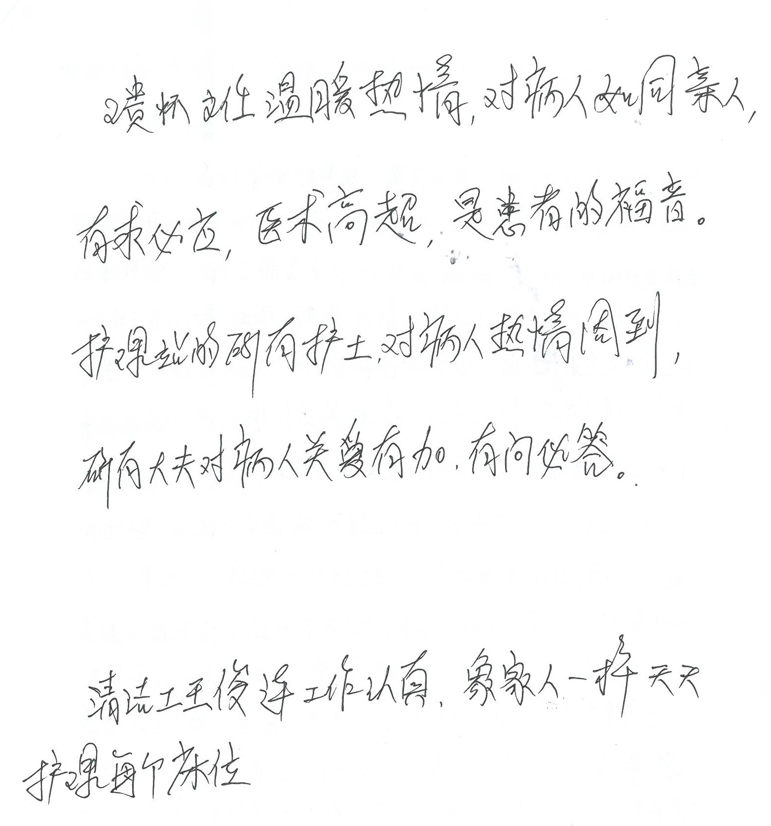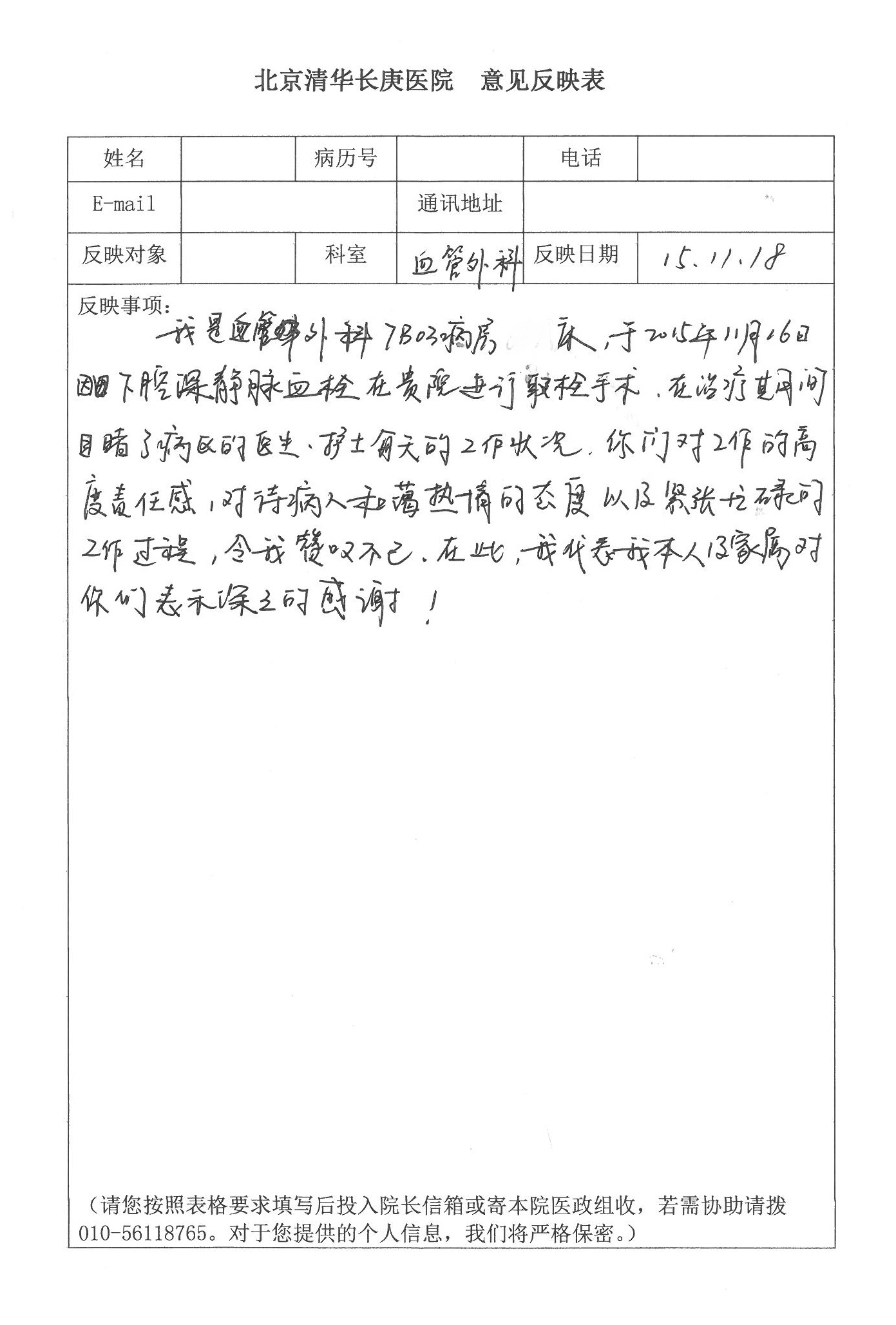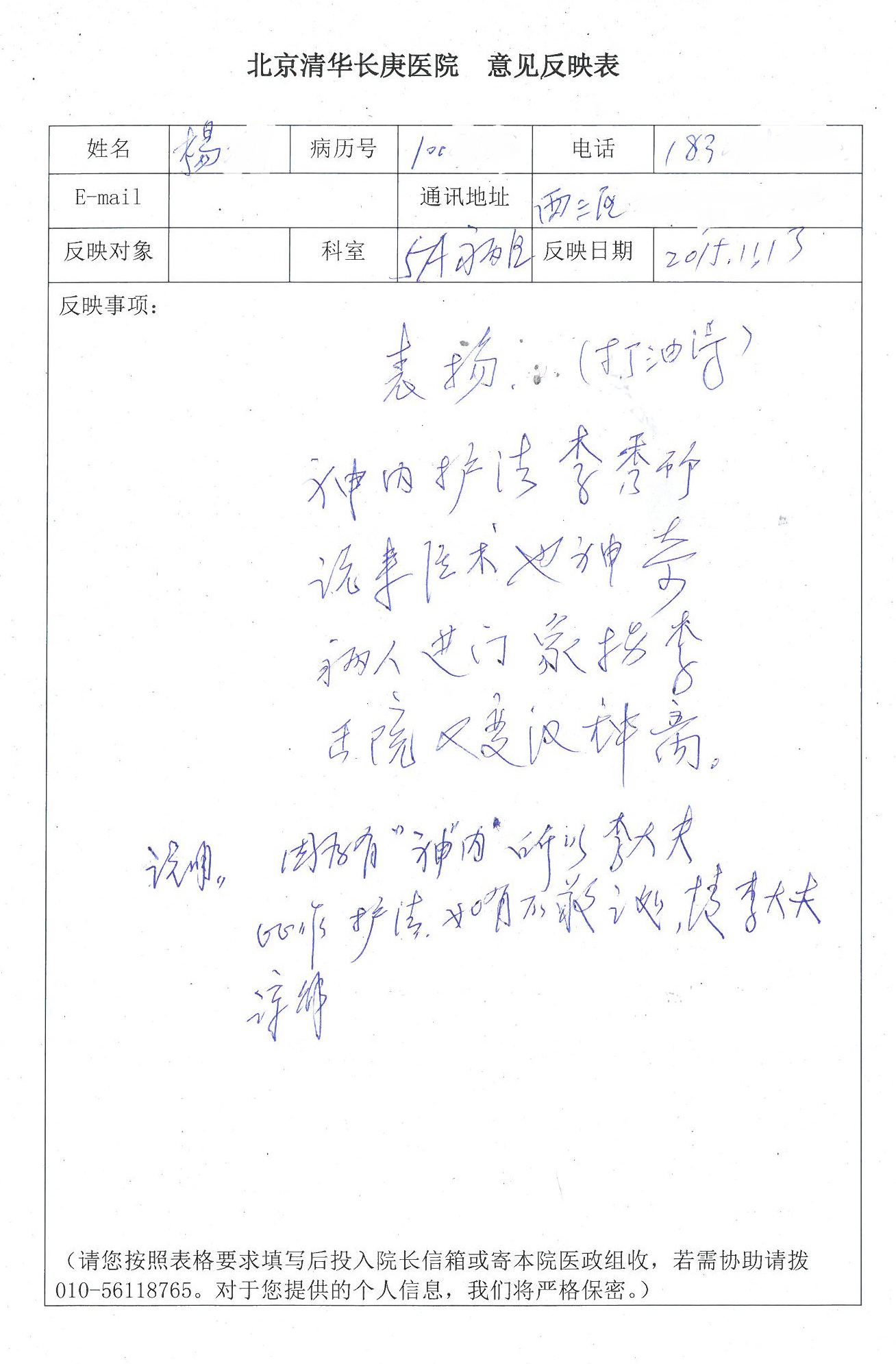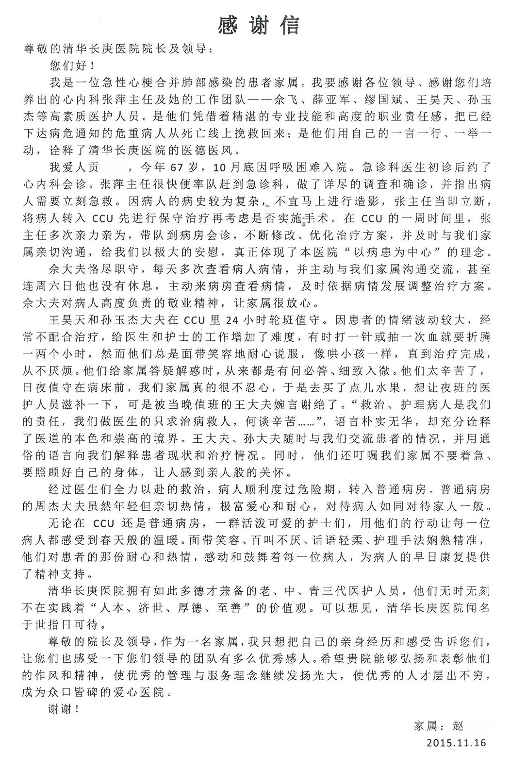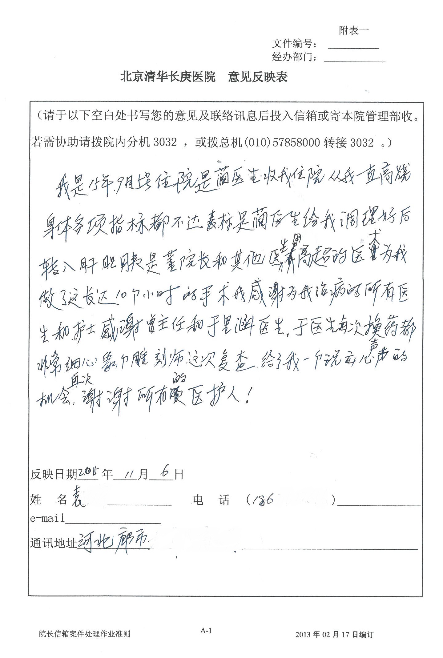 2015年11月,我院共接到患者及家属感谢信32封,其中肝胆胰外科董家鸿院长、曾建平主治医师、于里涵医师,神经外科王劲副院长、王贵怀主任、郭毅副主任医师、苏伟主治医师、杨峰医师,普通外科蔺宏伟副主任医师,骨科潘勇卫主任医师、蔡谞主任医师、陈连旭副主任医师、宋飞主治医师、付立功医师、蒋超医师,胸腔外科陈东红副主任医师、杨帆主治医师,泌尿外科李建兴主任、陈松副主任医师、胡卫国主治医师、王志顺医师,妇产科廖秦平主任、吕涛主治医师、马珂主治医师,耳鼻咽喉头颈外科叶京英主任、胡斌医师,心内科张萍主任、缪国斌副主任医师、佘飞副主任医师、薛亚军主治医师、王昊天医师、孙玉杰医师、张鸥医师,肾内科李月红主任,神经内科冯新红主治医师、李秀丽医师、王也医师,内分泌与代谢科曹沉香主治医师,住院中心刘静雅、刘嘉然、刘梦,社会服务办公室赵晓兰,保洁人员王俊连,护理部王莹、蔡敏丽、李怡然、王真真、李慧、卜卉、张翠翠、许丽丽、张会芳、杨静、荆红英、张春红、谢兰兰、谢娟娟、于小梅、许平平、张慧文、曹奇菲、方玲、李亚灵、辛扬眉、孔君君、王沫竹、代海栾、季静、袁雪丽护理人员及骨科、肝胆胰外科、神经外科、妇产科、耳鼻咽喉头颈外科、血管外科、泌尿外科全体医护人员收到具名表扬。