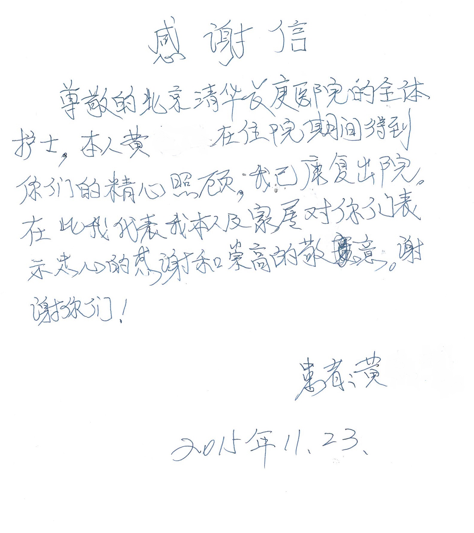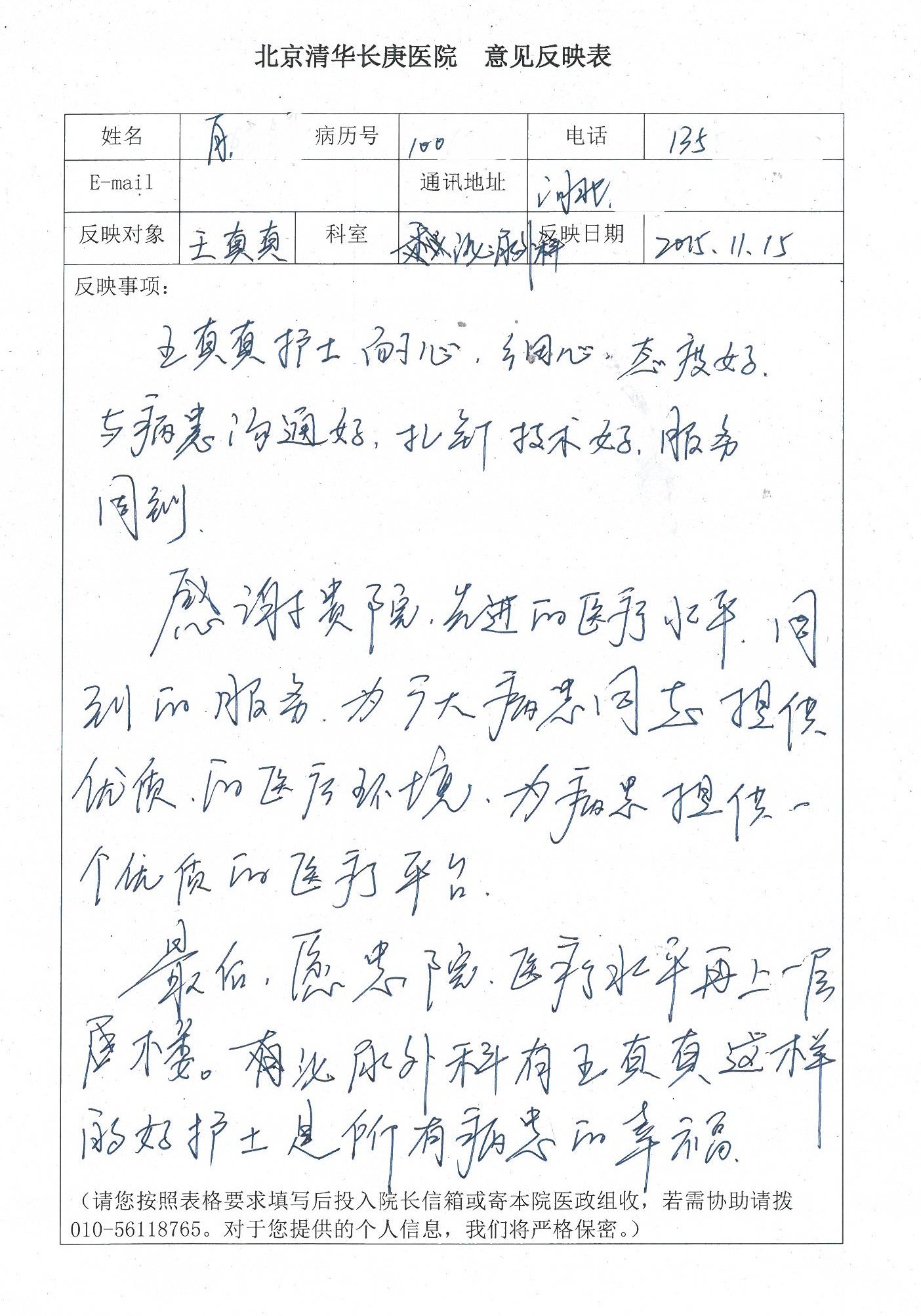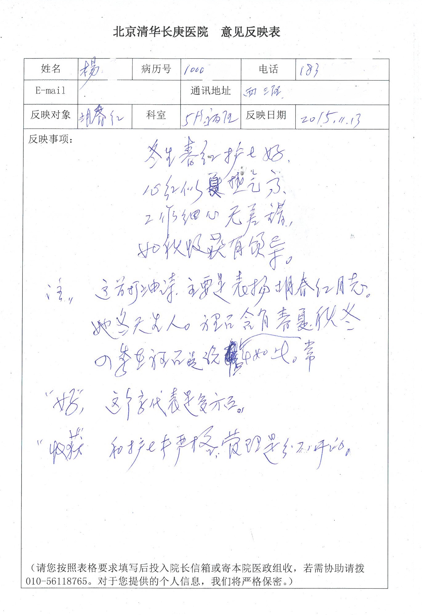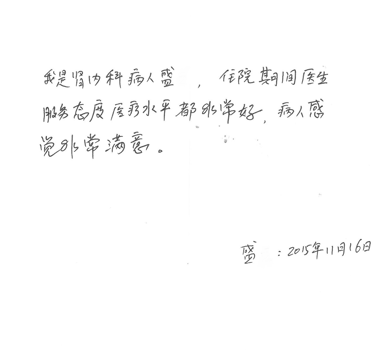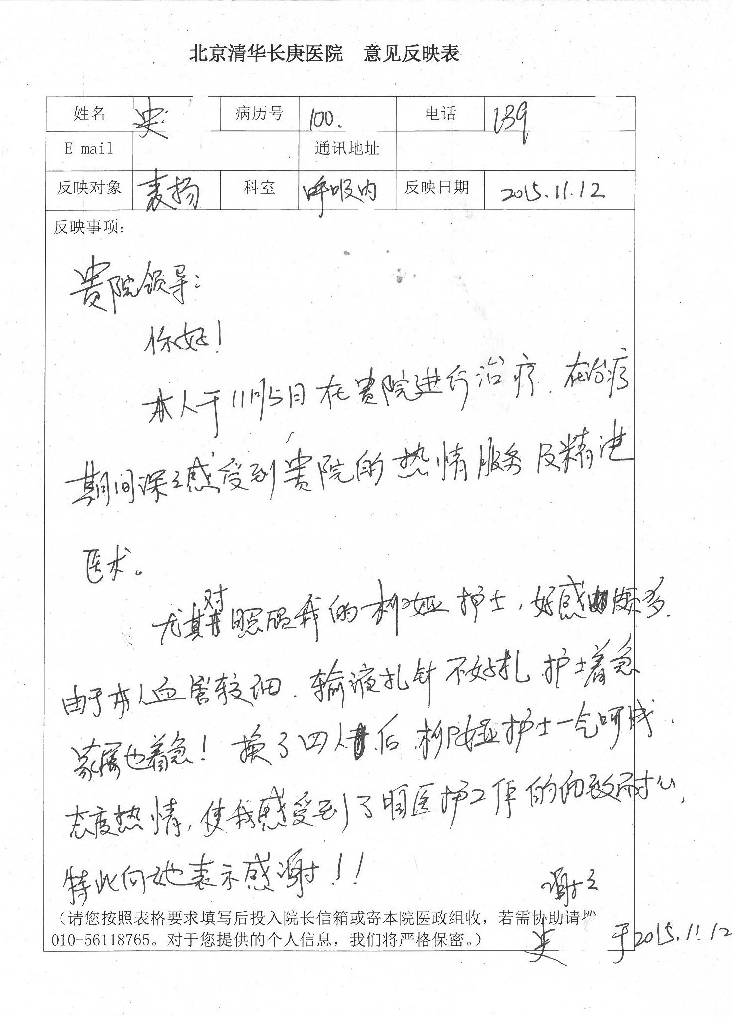 2015年11月,我院共接到患者及家属感谢信32封,其中肝胆胰外科董家鸿院长、曾建平主治医师、于里涵医师,神经外科王劲副院长、王贵怀主任、郭毅副主任医师、苏伟主治医师、杨峰医师,普通外科蔺宏伟副主任医师,骨科潘勇卫主任医师、蔡谞主任医师、陈连旭副主任医师、宋飞主治医师、付立功医师、蒋超医师,胸腔外科陈东红副主任医师、杨帆主治医师,泌尿外科李建兴主任、陈松副主任医师、胡卫国主治医师、王志顺医师,妇产科廖秦平主任、吕涛主治医师、马珂主治医师,耳鼻咽喉头颈外科叶京英主任、胡斌医师,心内科张萍主任、缪国斌副主任医师、佘飞副主任医师、薛亚军主治医师、王昊天医师、孙玉杰医师、张鸥医师,肾内科李月红主任,神经内科冯新红主治医师、李秀丽医师、王也医师,内分泌与代谢科曹沉香主治医师,住院中心刘静雅、刘嘉然、刘梦,社会服务办公室赵晓兰,保洁人员王俊连,护理部王莹、蔡敏丽、李怡然、王真真、李慧、卜卉、张翠翠、许丽丽、张会芳、杨静、荆红英、张春红、谢兰兰、谢娟娟、于小梅、许平平、张慧文、曹奇菲、方玲、李亚灵、辛扬眉、孔君君、王沫竹、代海栾、季静、袁雪丽护理人员及骨科、肝胆胰外科、神经外科、妇产科、耳鼻咽喉头颈外科、血管外科、泌尿外科全体医护人员收到具名表扬。
