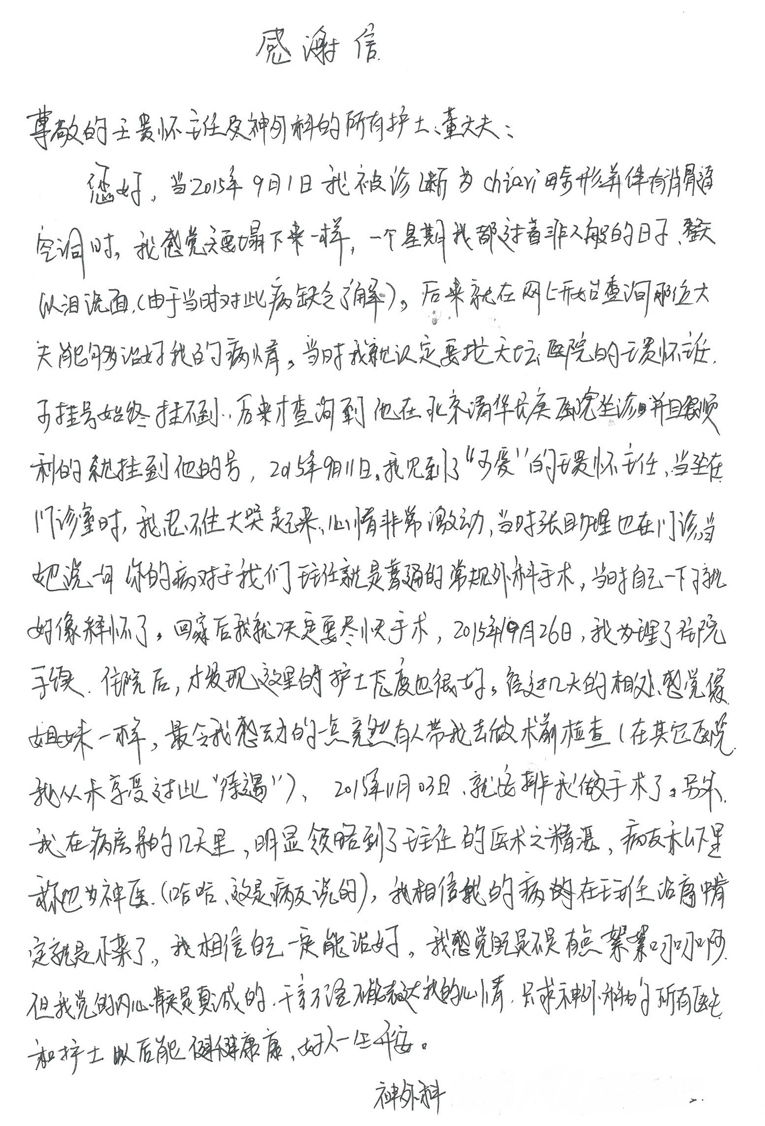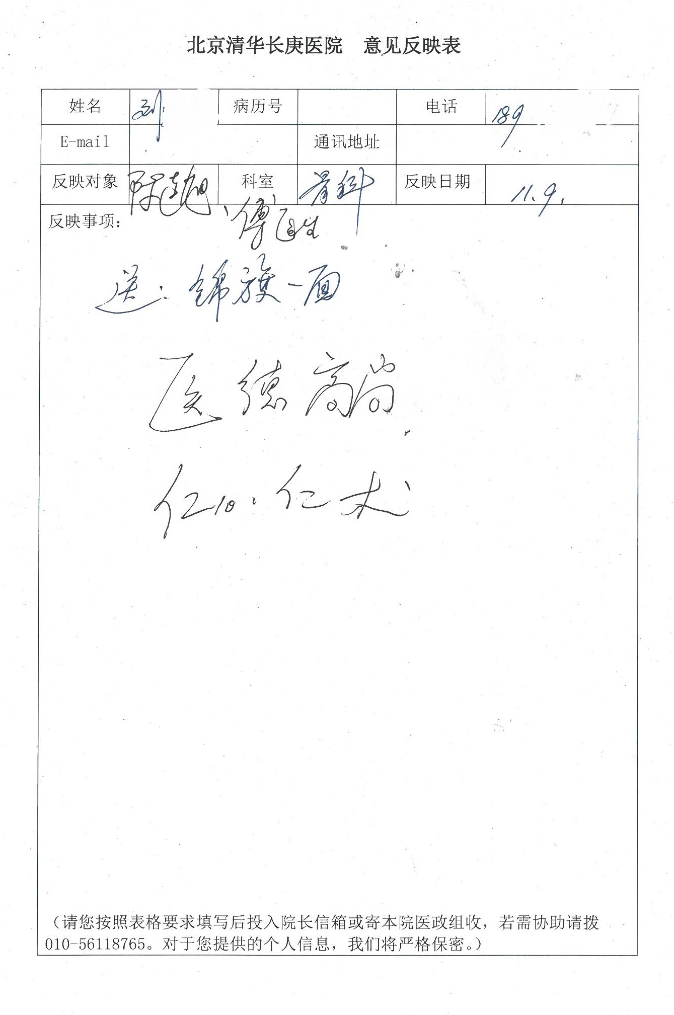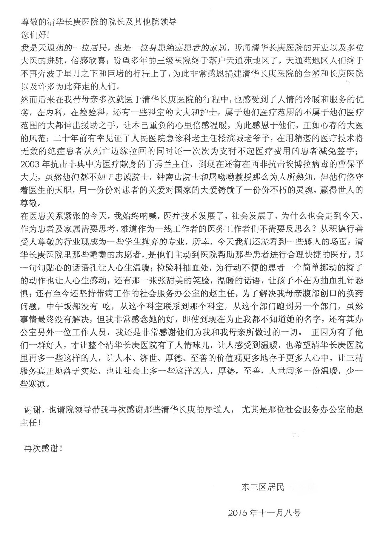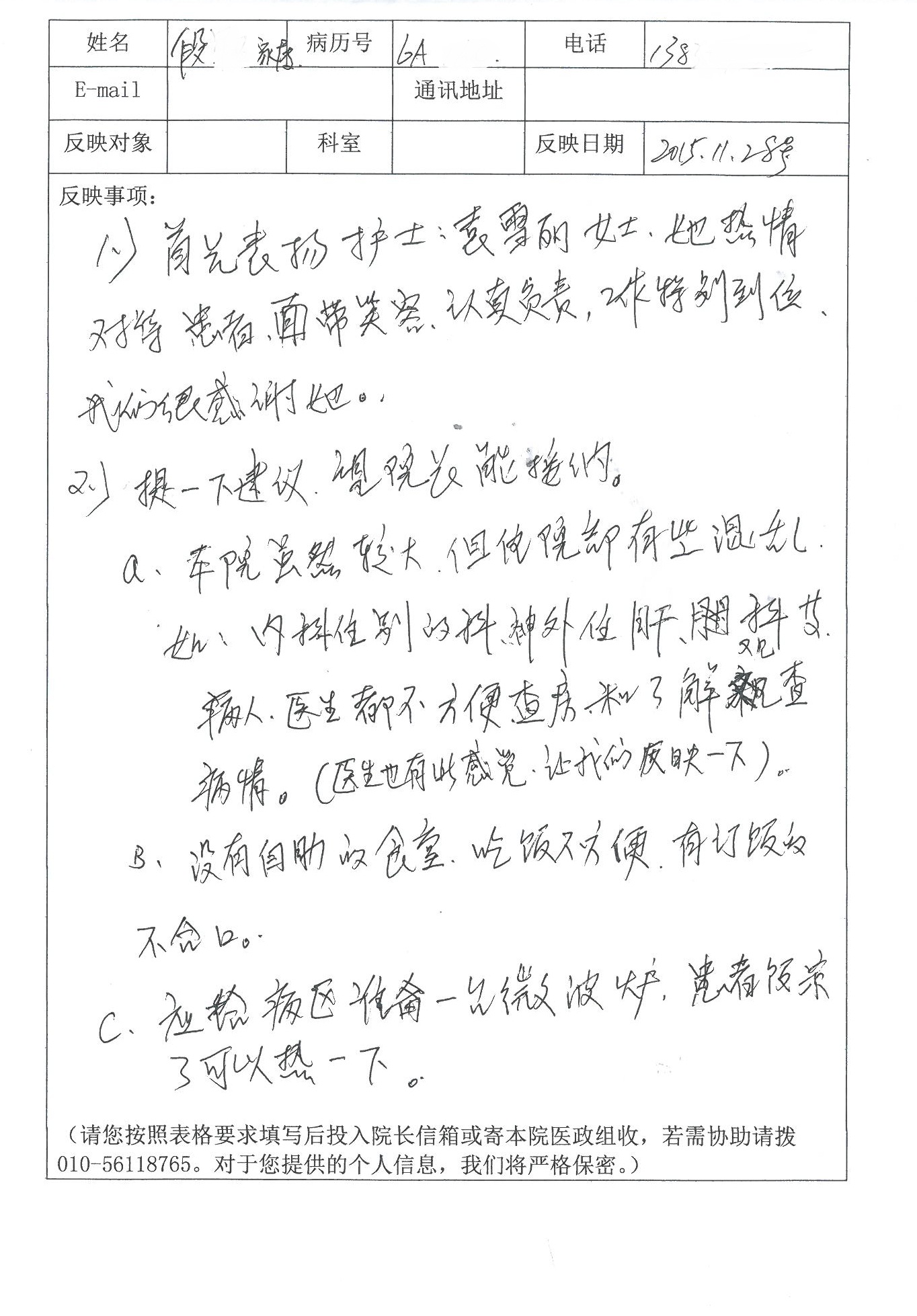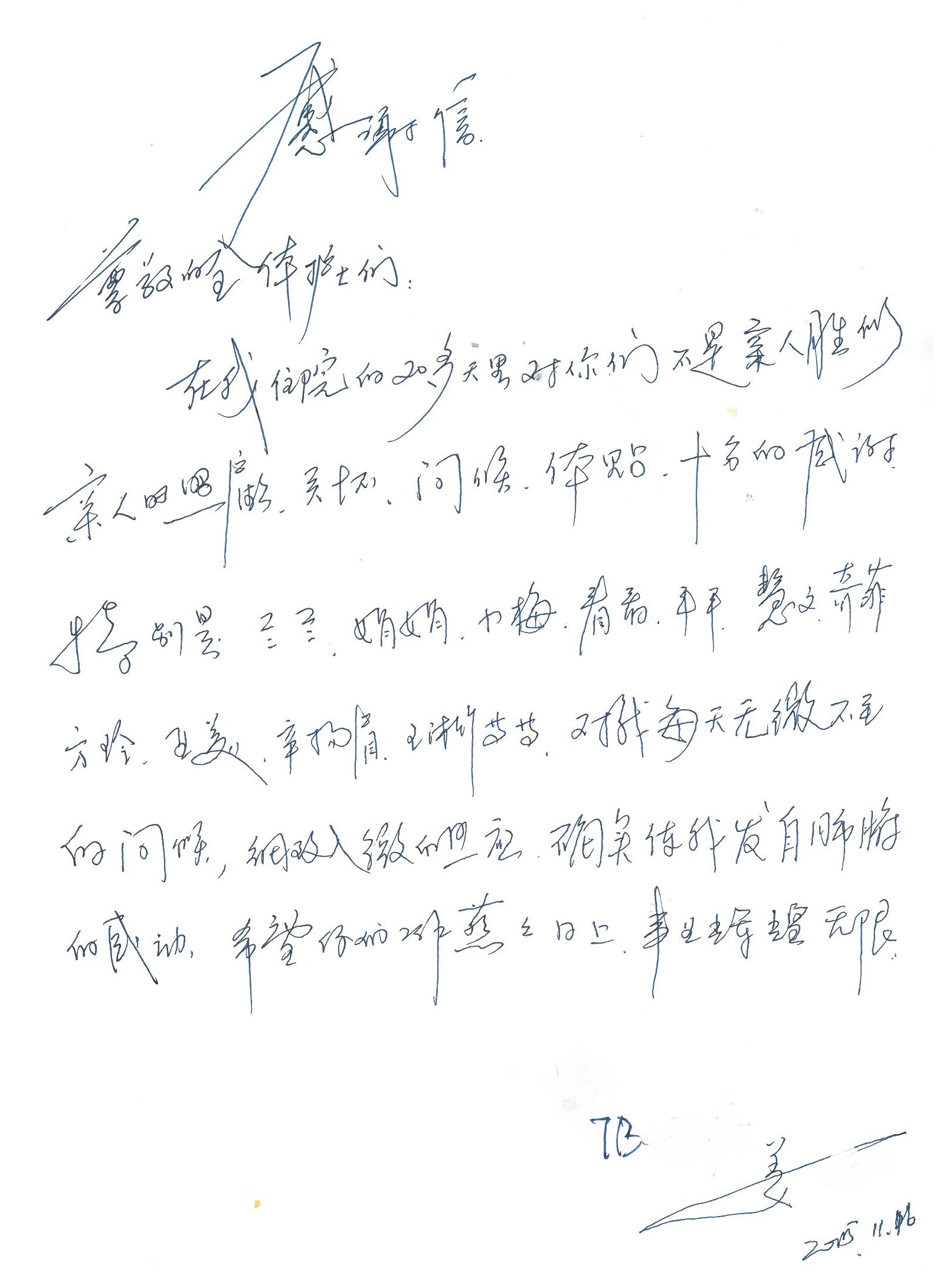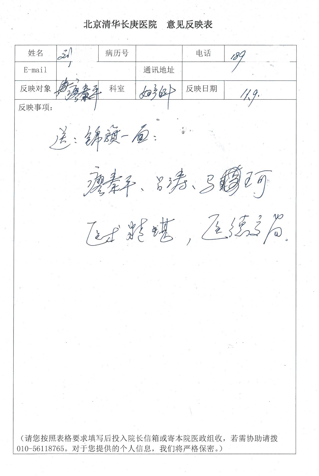 2015年11月,我院共接到患者及家属感谢信32封,其中肝胆胰外科董家鸿院长、曾建平主治医师、于里涵医师,神经外科王劲副院长、王贵怀主任、郭毅副主任医师、苏伟主治医师、杨峰医师,普通外科蔺宏伟副主任医师,骨科潘勇卫主任医师、蔡谞主任医师、陈连旭副主任医师、宋飞主治医师、付立功医师、蒋超医师,胸腔外科陈东红副主任医师、杨帆主治医师,泌尿外科李建兴主任、陈松副主任医师、胡卫国主治医师、王志顺医师,妇产科廖秦平主任、吕涛主治医师、马珂主治医师,耳鼻咽喉头颈外科叶京英主任、胡斌医师,心内科张萍主任、缪国斌副主任医师、佘飞副主任医师、薛亚军主治医师、王昊天医师、孙玉杰医师、张鸥医师,肾内科李月红主任,神经内科冯新红主治医师、李秀丽医师、王也医师,内分泌与代谢科曹沉香主治医师,住院中心刘静雅、刘嘉然、刘梦,社会服务办公室赵晓兰,保洁人员王俊连,护理部王莹、蔡敏丽、李怡然、王真真、李慧、卜卉、张翠翠、许丽丽、张会芳、杨静、荆红英、张春红、谢兰兰、谢娟娟、于小梅、许平平、张慧文、曹奇菲、方玲、李亚灵、辛扬眉、孔君君、王沫竹、代海栾、季静、袁雪丽护理人员及骨科、肝胆胰外科、神经外科、妇产科、耳鼻咽喉头颈外科、血管外科、泌尿外科全体医护人员收到具名表扬。
