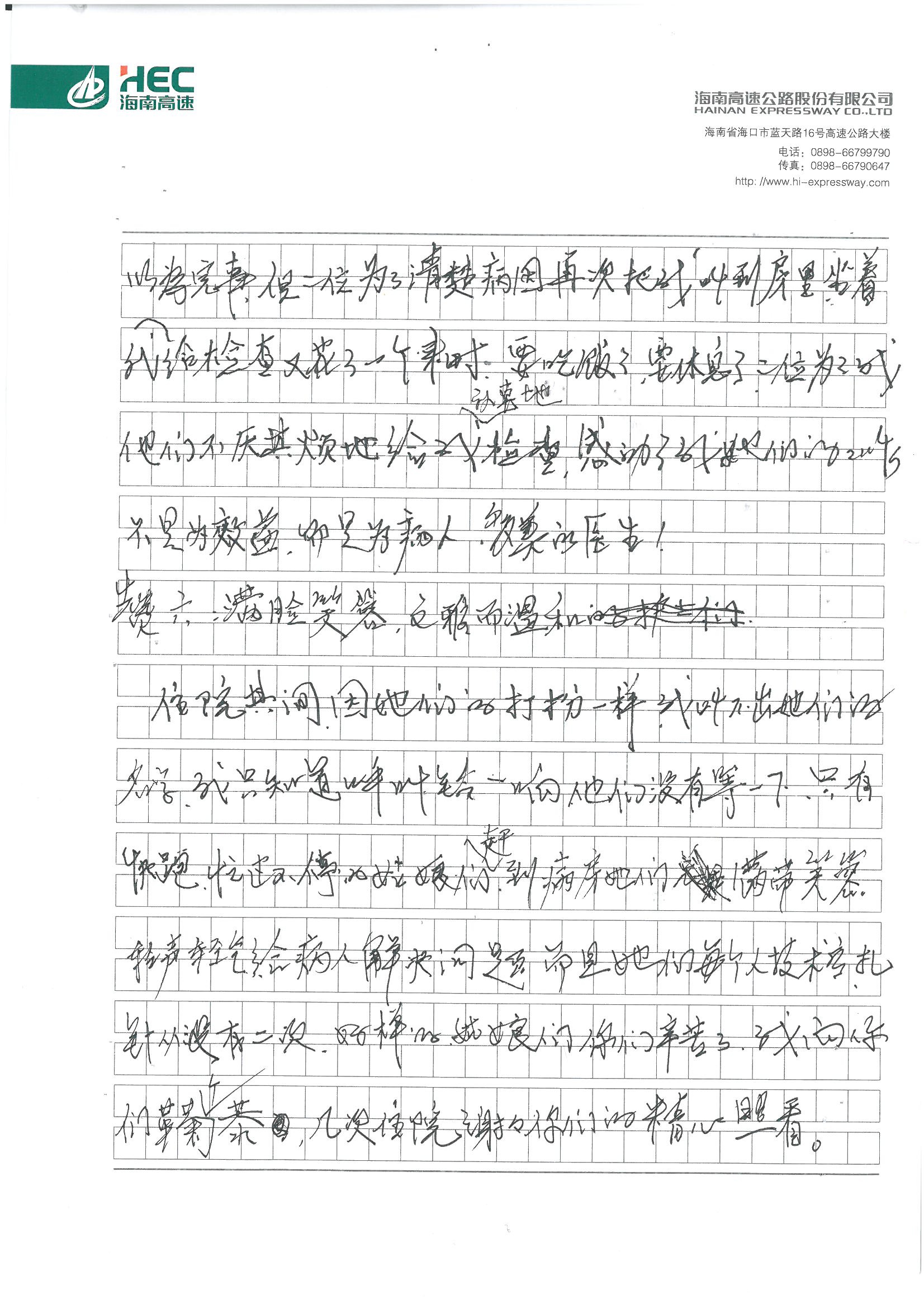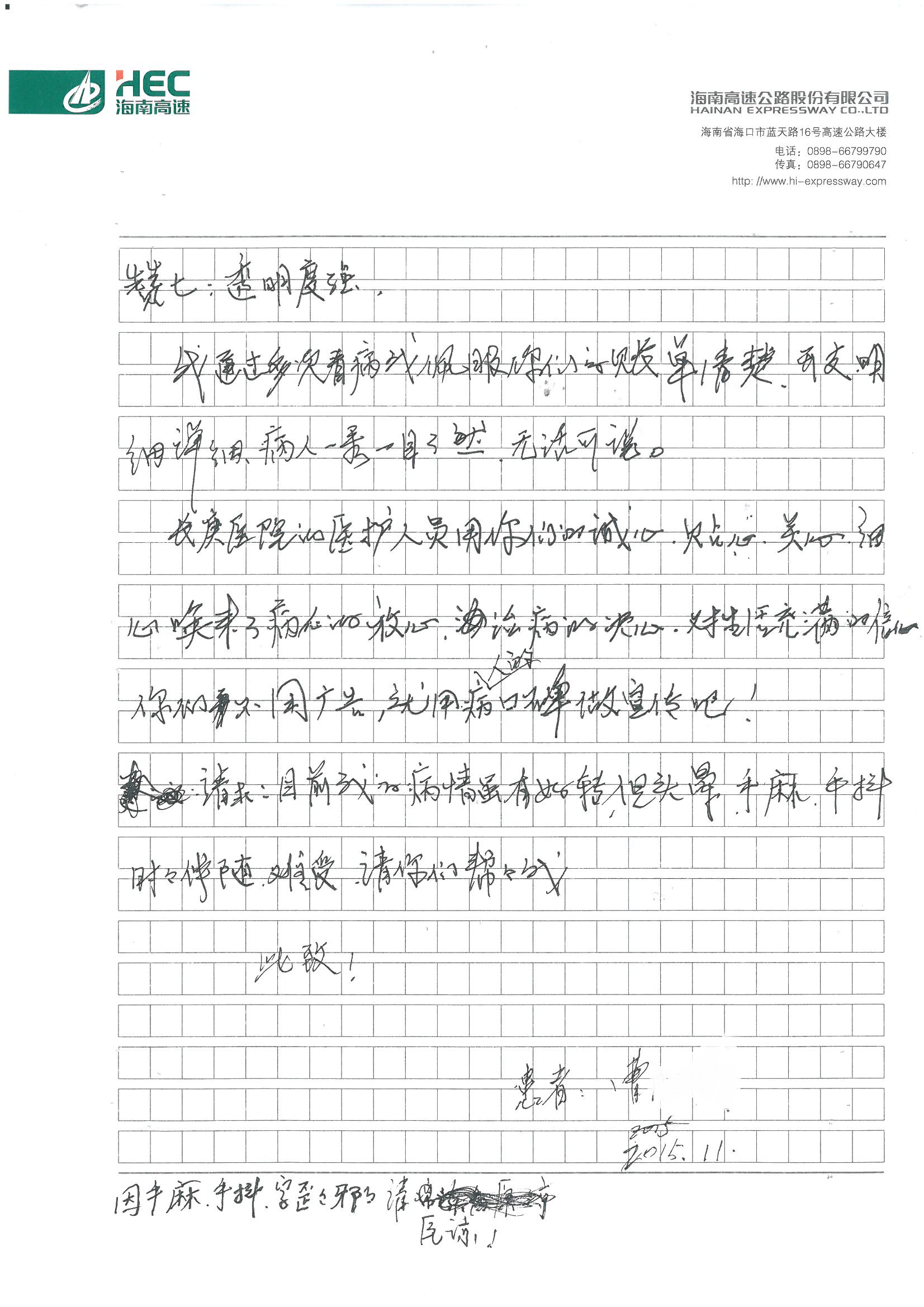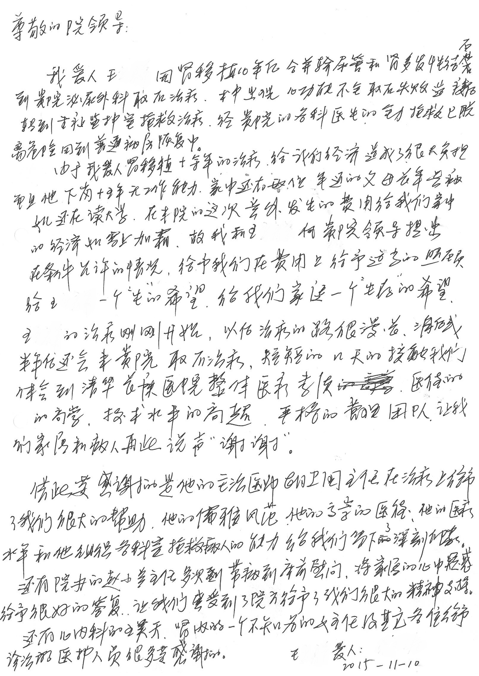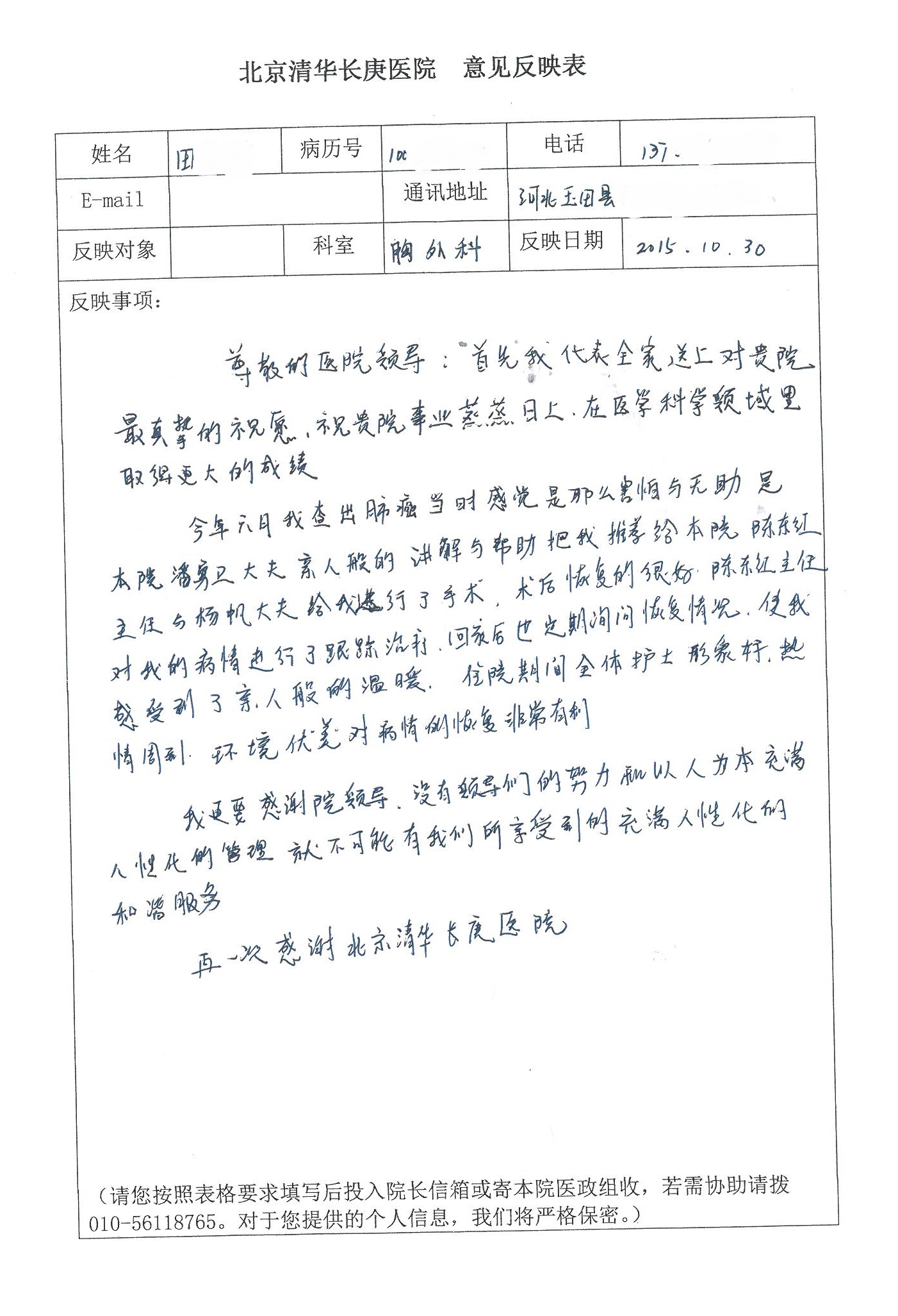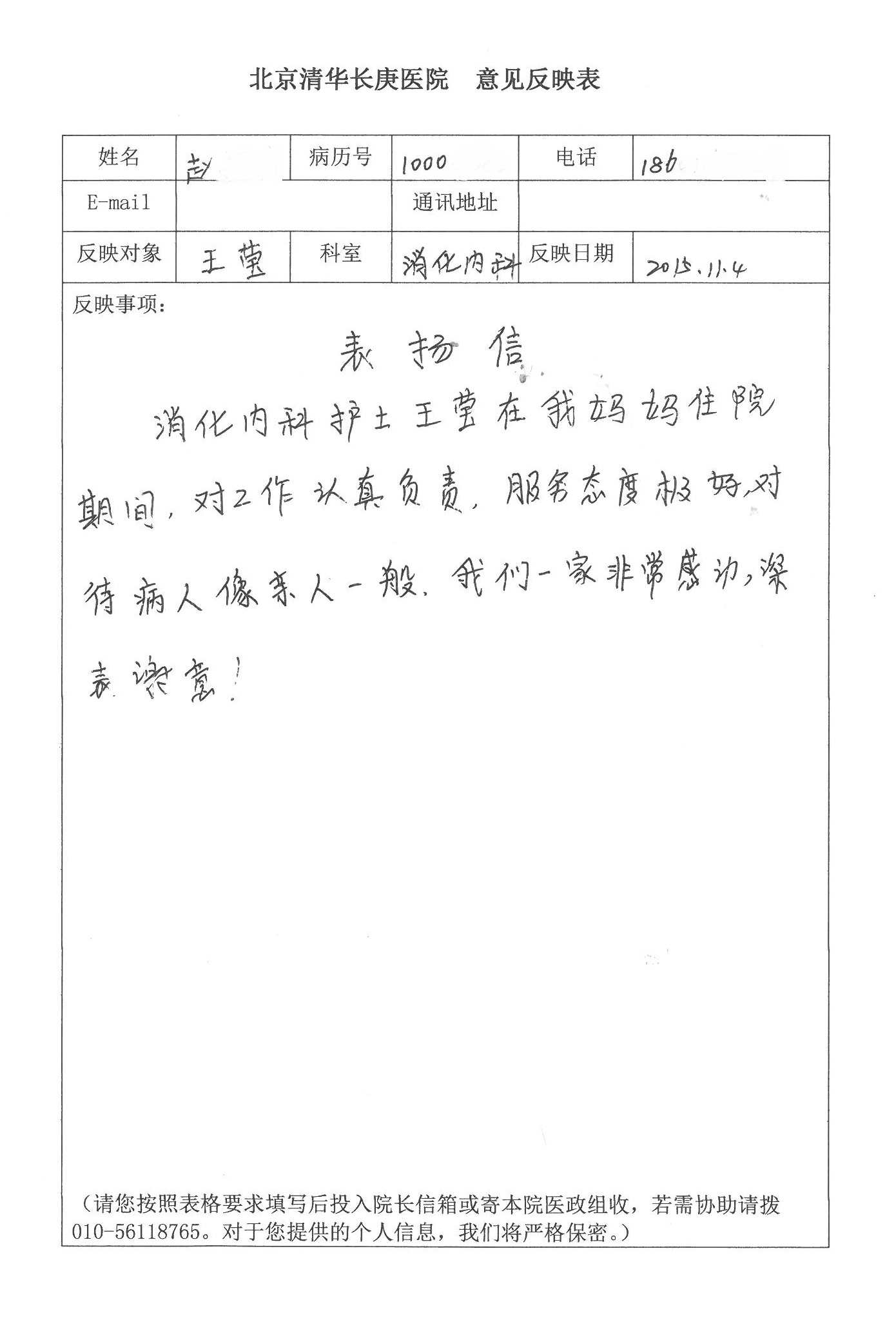 2015年11月,我院共接到患者及家属感谢信32封,其中肝胆胰外科董家鸿院长、曾建平主治医师、于里涵医师,神经外科王劲副院长、王贵怀主任、郭毅副主任医师、苏伟主治医师、杨峰医师,普通外科蔺宏伟副主任医师,骨科潘勇卫主任医师、蔡谞主任医师、陈连旭副主任医师、宋飞主治医师、付立功医师、蒋超医师,胸腔外科陈东红副主任医师、杨帆主治医师,泌尿外科李建兴主任、陈松副主任医师、胡卫国主治医师、王志顺医师,妇产科廖秦平主任、吕涛主治医师、马珂主治医师,耳鼻咽喉头颈外科叶京英主任、胡斌医师,心内科张萍主任、缪国斌副主任医师、佘飞副主任医师、薛亚军主治医师、王昊天医师、孙玉杰医师、张鸥医师,肾内科李月红主任,神经内科冯新红主治医师、李秀丽医师、王也医师,内分泌与代谢科曹沉香主治医师,住院中心刘静雅、刘嘉然、刘梦,社会服务办公室赵晓兰,保洁人员王俊连,护理部王莹、蔡敏丽、李怡然、王真真、李慧、卜卉、张翠翠、许丽丽、张会芳、杨静、荆红英、张春红、谢兰兰、谢娟娟、于小梅、许平平、张慧文、曹奇菲、方玲、李亚灵、辛扬眉、孔君君、王沫竹、代海栾、季静、袁雪丽护理人员及骨科、肝胆胰外科、神经外科、妇产科、耳鼻咽喉头颈外科、血管外科、泌尿外科全体医护人员收到具名表扬。