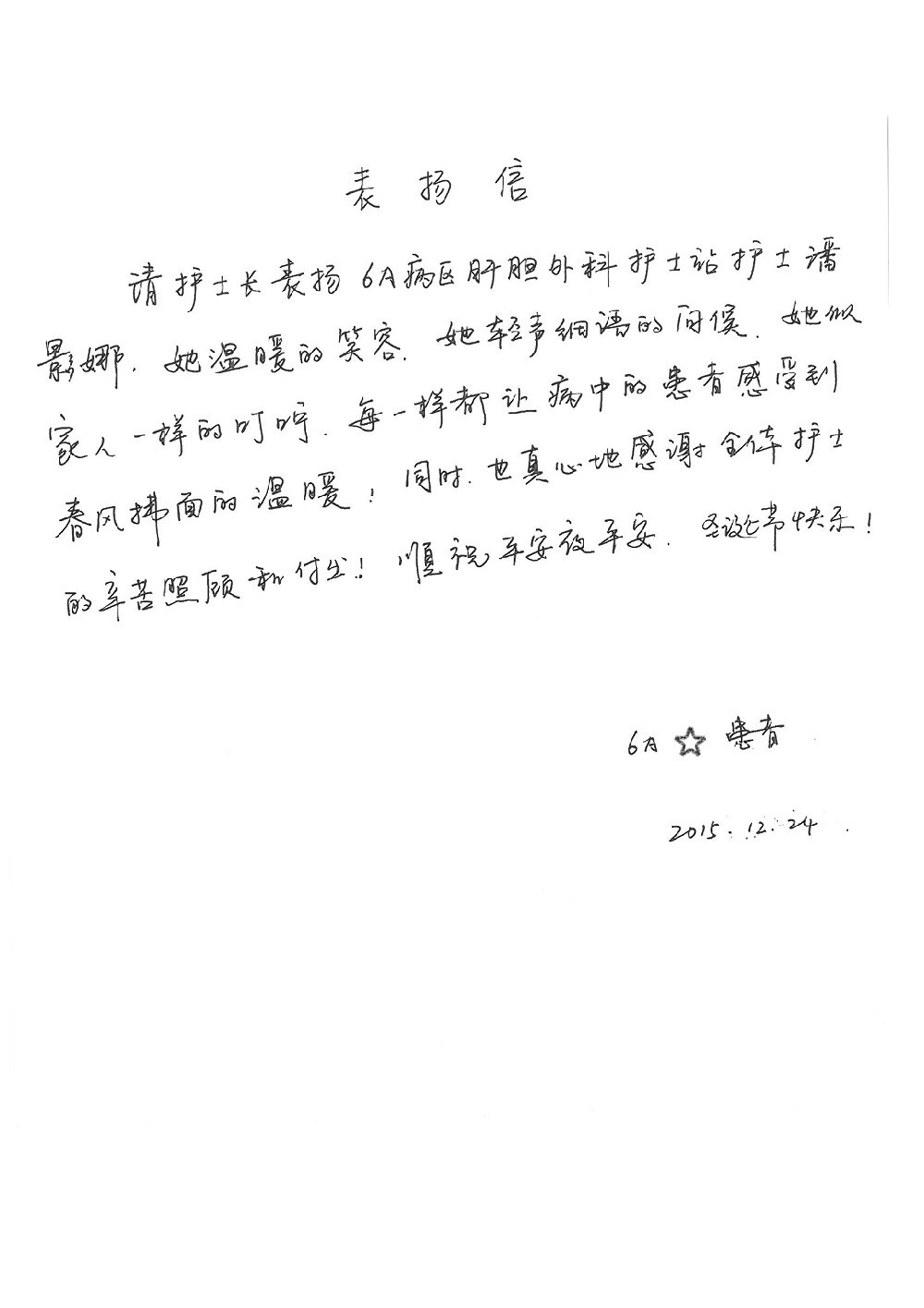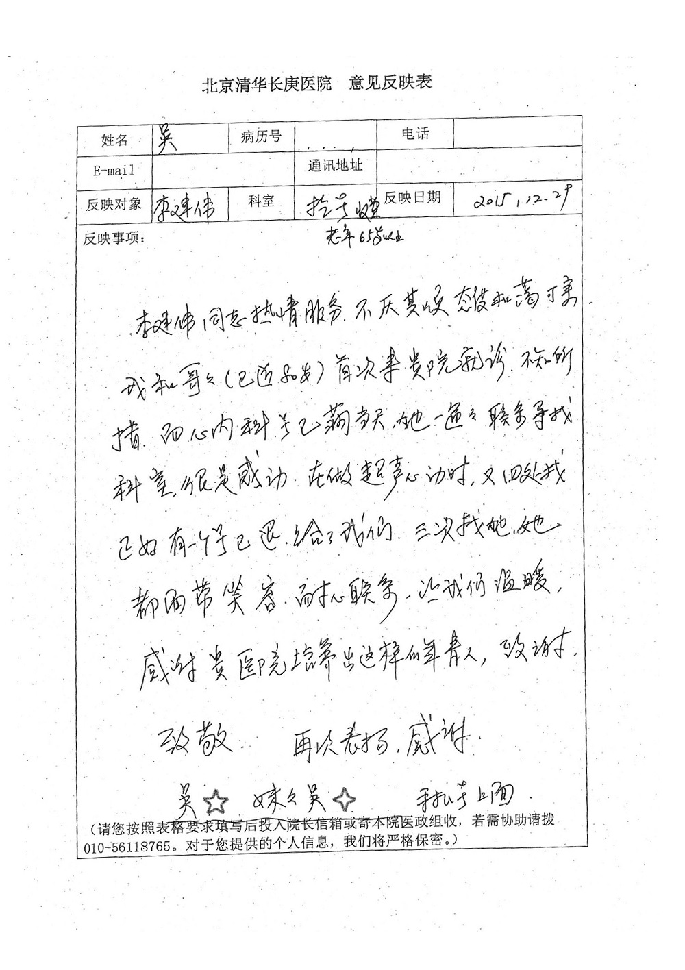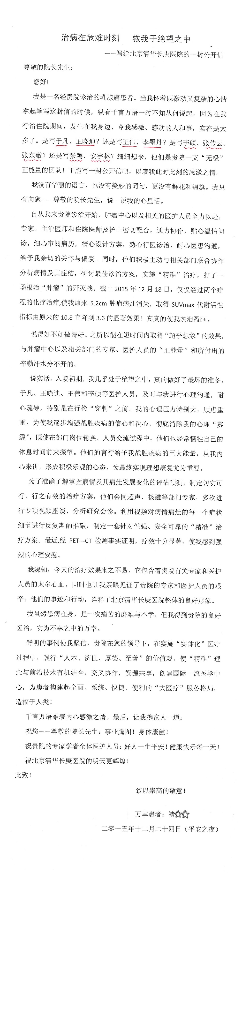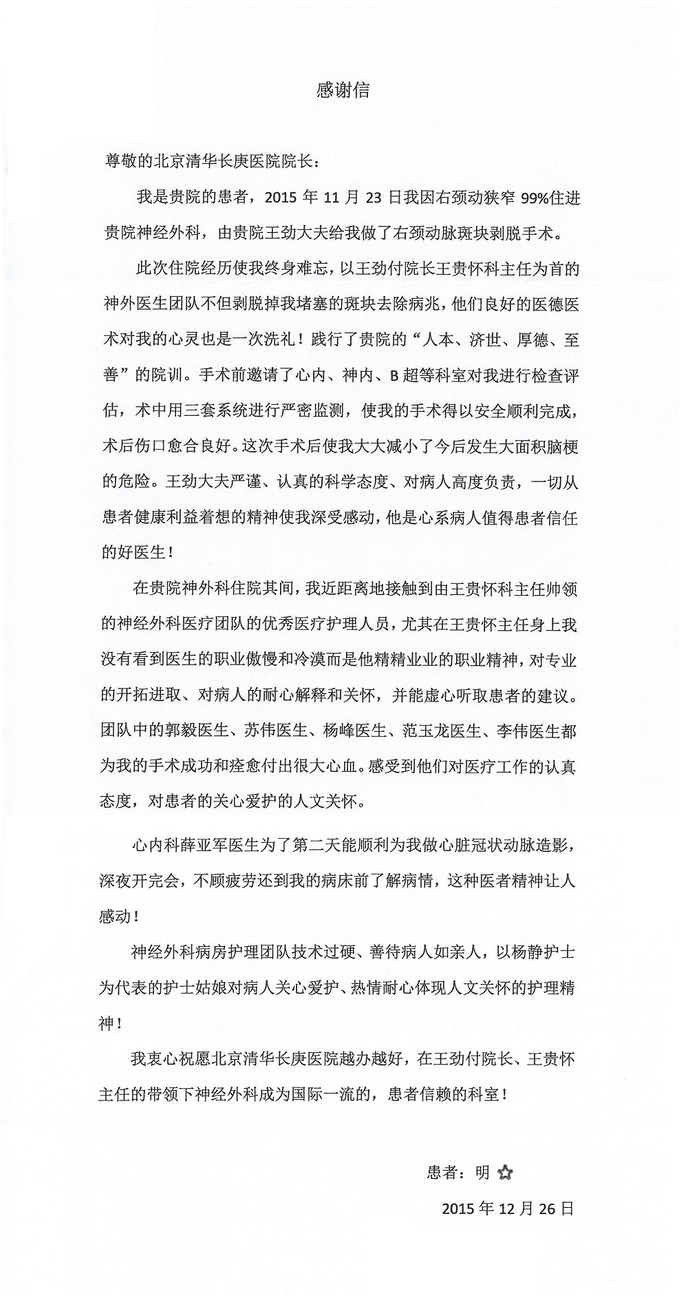 2015年12月,我院共接到患者及家属感谢信28封,其中神经外科王劲副院长、王贵怀主任,血管外科蒋超医师,妇产科廖秦平主任、吕涛主治医师、马珂主治医师、文佳医师,儿科季丽娜副主任医师、孟洪医师,耳鼻咽喉头颈外科李欣副主任医师、伊海金副主任医师、李京京医师,心内科张萍主任、孙玉杰医师、张鸥医师,血液内科于凡主治医师、黄月华医师,肿瘤内科王晓迪医师、李墨丹医师、安宇林医师,消化内科相马宁主任医师,肾内科李月红主任、庄震主治医师,急诊宋琳琳医师、王伟医师、王非医师、王琰医师、王科医师、段瑶医师、张会娟医师,检验科高汇迪,医事处刘静雅、李建伟,护理部宋子强、潘影娜、李硕、张东敬、张传云、王莹、赵雪莲、李建华、苗龙芳、朱洁、井莉媚、魏月秀、周倩倩、宋辉辉、张慧文、李亚灵、方玲、季静、郑微微、杨静护理人员,TC运送人员李玫玫及急诊、5A病区全体医护人员、惠佳丰配送公司收到具名表扬。特此公告,以资鼓励!