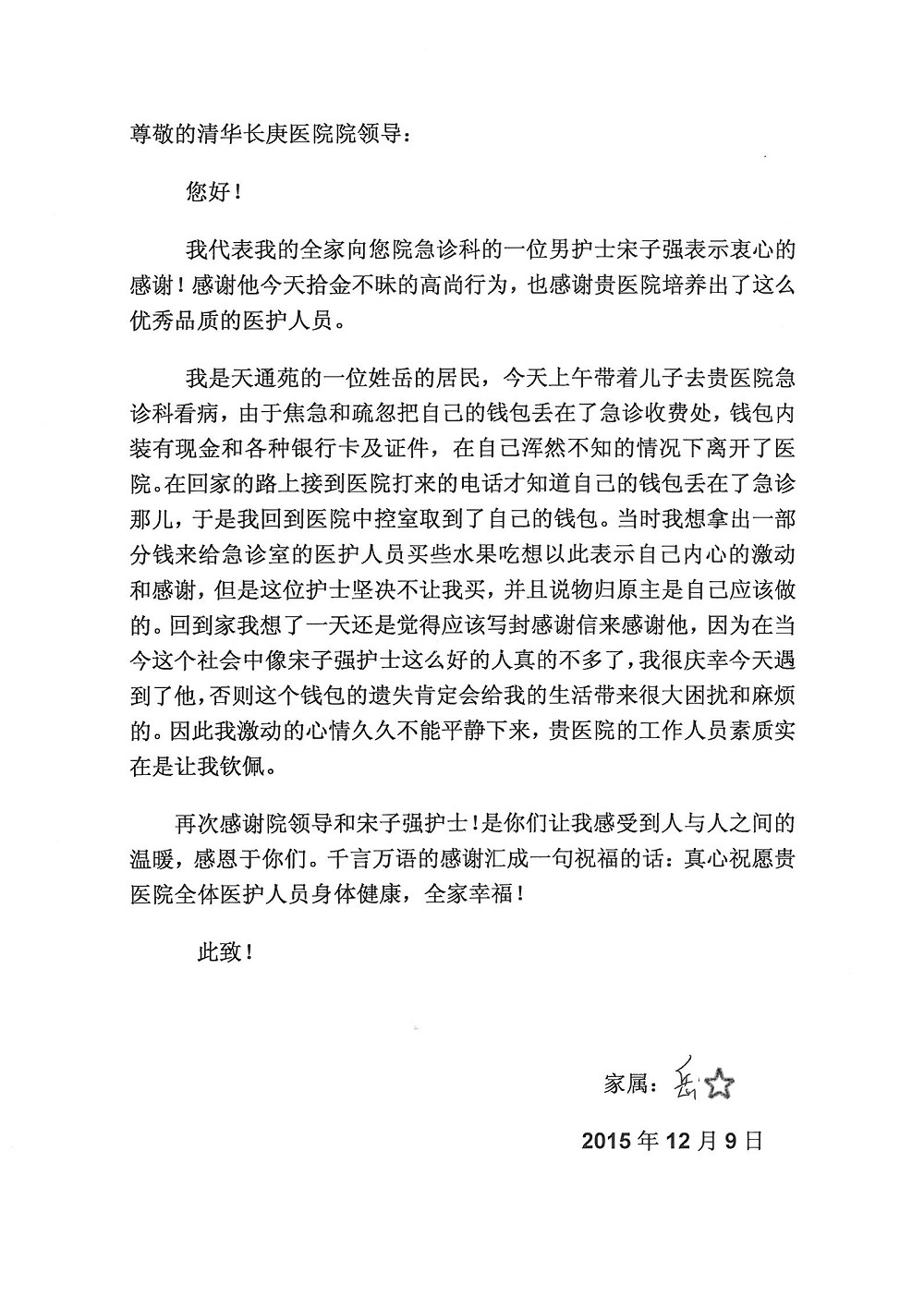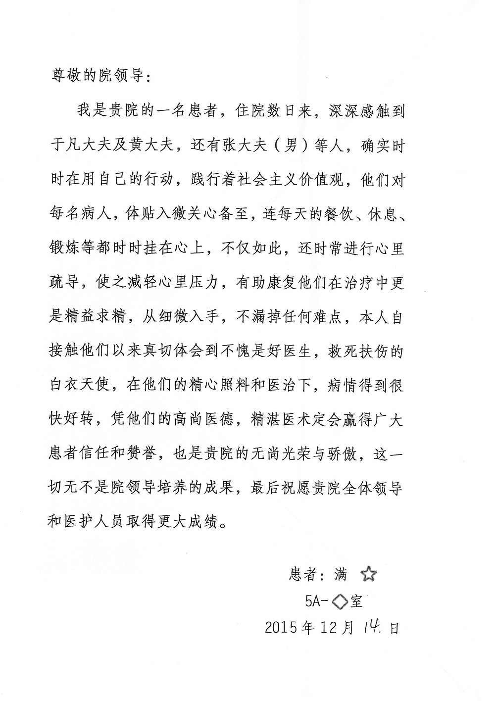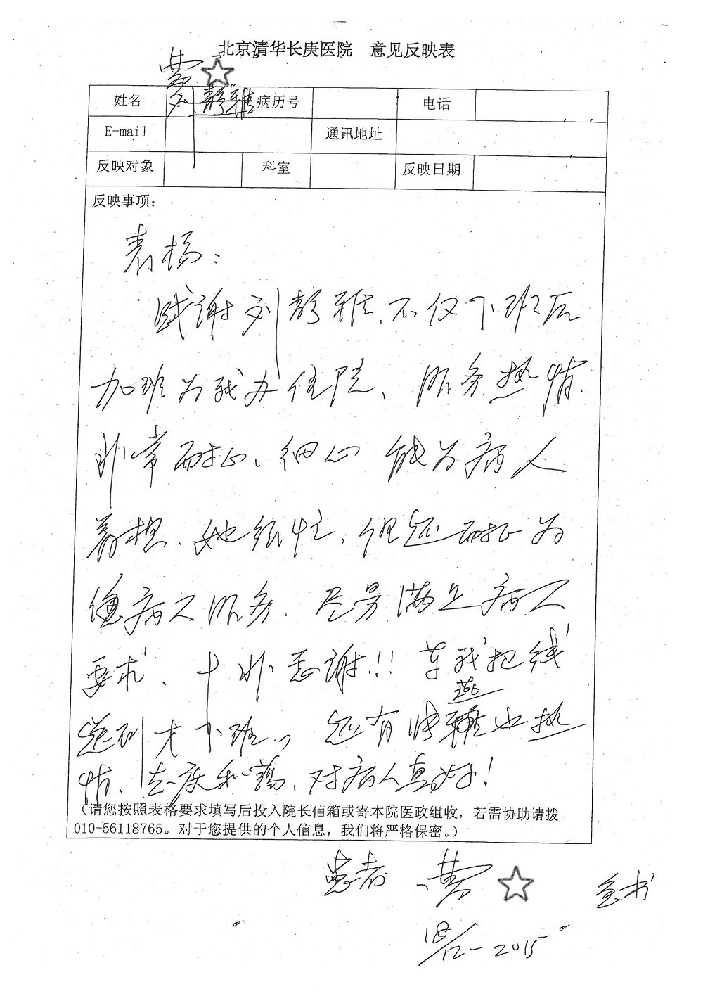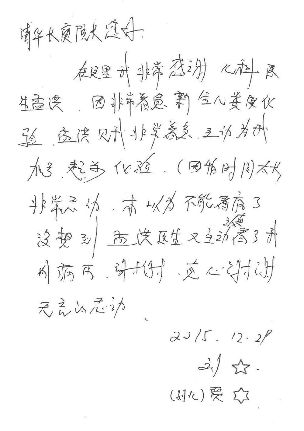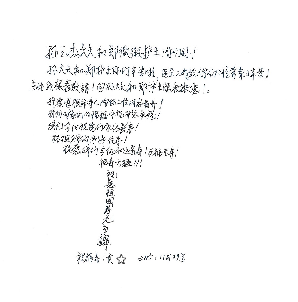 2015年12月,我院共接到患者及家属感谢信28封,其中神经外科王劲副院长、王贵怀主任,血管外科蒋超医师,妇产科廖秦平主任、吕涛主治医师、马珂主治医师、文佳医师,儿科季丽娜副主任医师、孟洪医师,耳鼻咽喉头颈外科李欣副主任医师、伊海金副主任医师、李京京医师,心内科张萍主任、孙玉杰医师、张鸥医师,血液内科于凡主治医师、黄月华医师,肿瘤内科王晓迪医师、李墨丹医师、安宇林医师,消化内科相马宁主任医师,肾内科李月红主任、庄震主治医师,急诊宋琳琳医师、王伟医师、王非医师、王琰医师、王科医师、段瑶医师、张会娟医师,检验科高汇迪,医事处刘静雅、李建伟,护理部宋子强、潘影娜、李硕、张东敬、张传云、王莹、赵雪莲、李建华、苗龙芳、朱洁、井莉媚、魏月秀、周倩倩、宋辉辉、张慧文、李亚灵、方玲、季静、郑微微、杨静护理人员,TC运送人员李玫玫及急诊、5A病区全体医护人员、惠佳丰配送公司收到具名表扬。特此公告,以资鼓励!