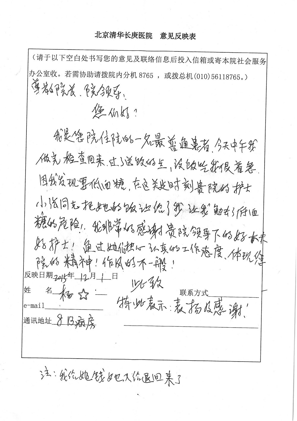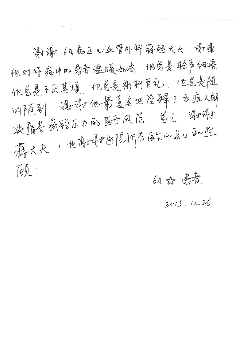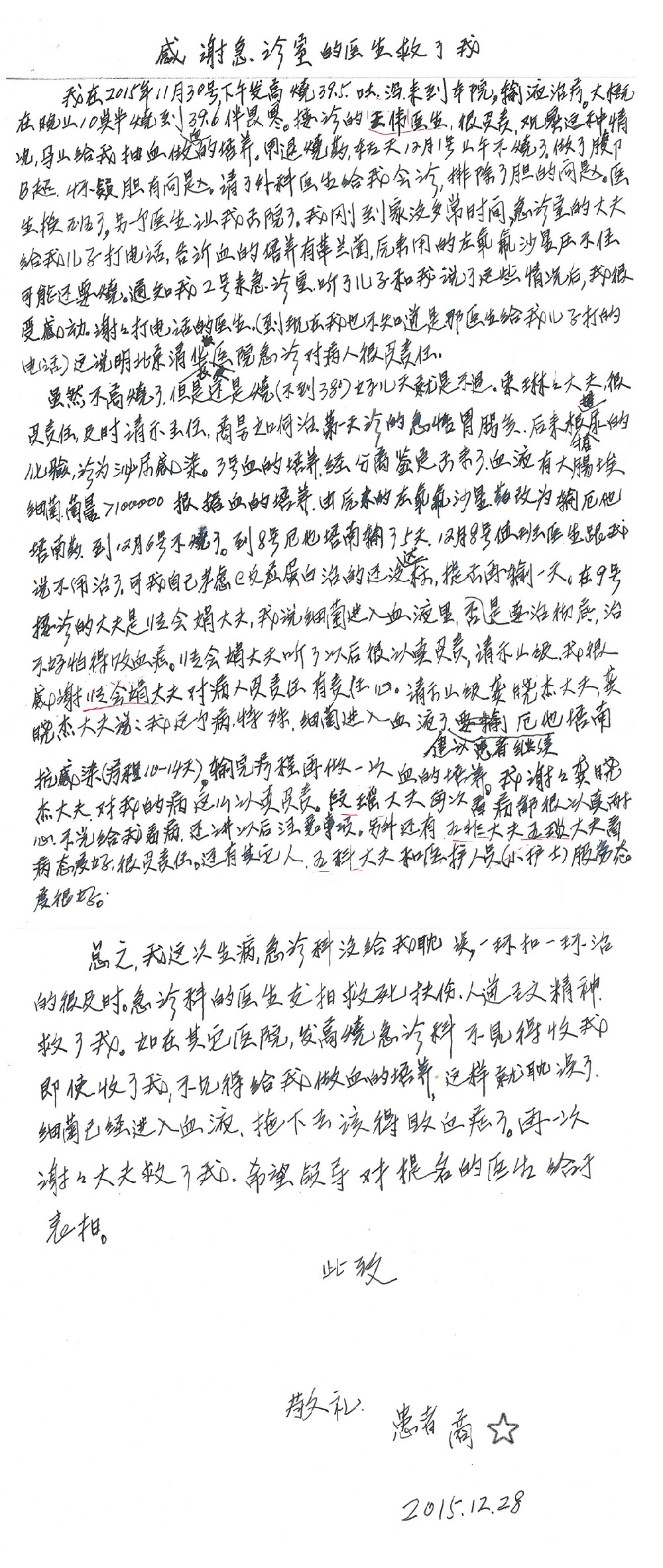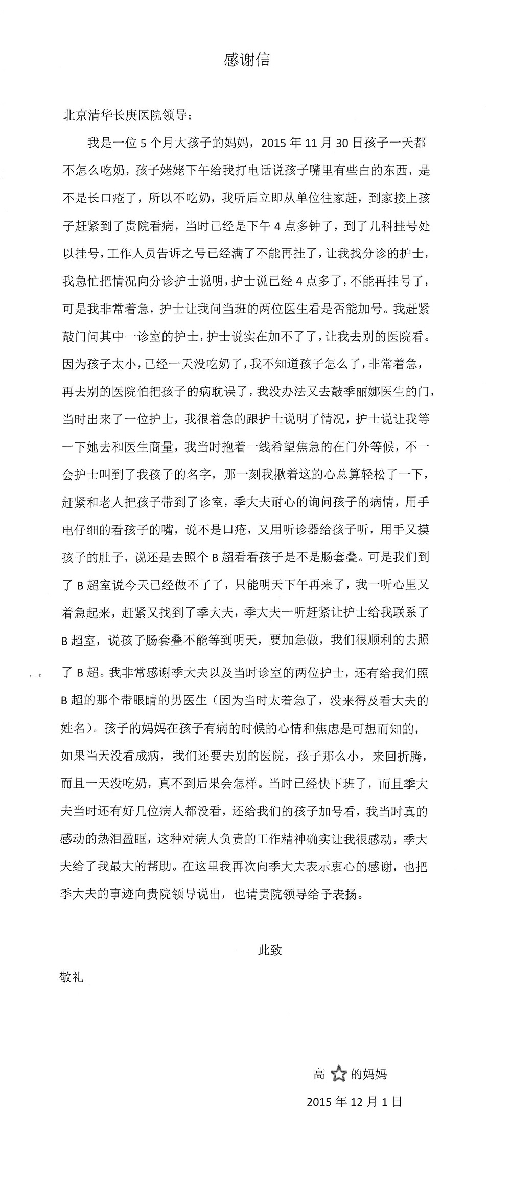 2015年12月,我院共接到患者及家属感谢信28封,其中神经外科王劲副院长、王贵怀主任,血管外科蒋超医师,妇产科廖秦平主任、吕涛主治医师、马珂主治医师、文佳医师,儿科季丽娜副主任医师、孟洪医师,耳鼻咽喉头颈外科李欣副主任医师、伊海金副主任医师、李京京医师,心内科张萍主任、孙玉杰医师、张鸥医师,血液内科于凡主治医师、黄月华医师,肿瘤内科王晓迪医师、李墨丹医师、安宇林医师,消化内科相马宁主任医师,肾内科李月红主任、庄震主治医师,急诊宋琳琳医师、王伟医师、王非医师、王琰医师、王科医师、段瑶医师、张会娟医师,检验科高汇迪,医事处刘静雅、李建伟,护理部宋子强、潘影娜、李硕、张东敬、张传云、王莹、赵雪莲、李建华、苗龙芳、朱洁、井莉媚、魏月秀、周倩倩、宋辉辉、张慧文、李亚灵、方玲、季静、郑微微、杨静护理人员,TC运送人员李玫玫及急诊、5A病区全体医护人员、惠佳丰配送公司收到具名表扬。特此公告,以资鼓励!