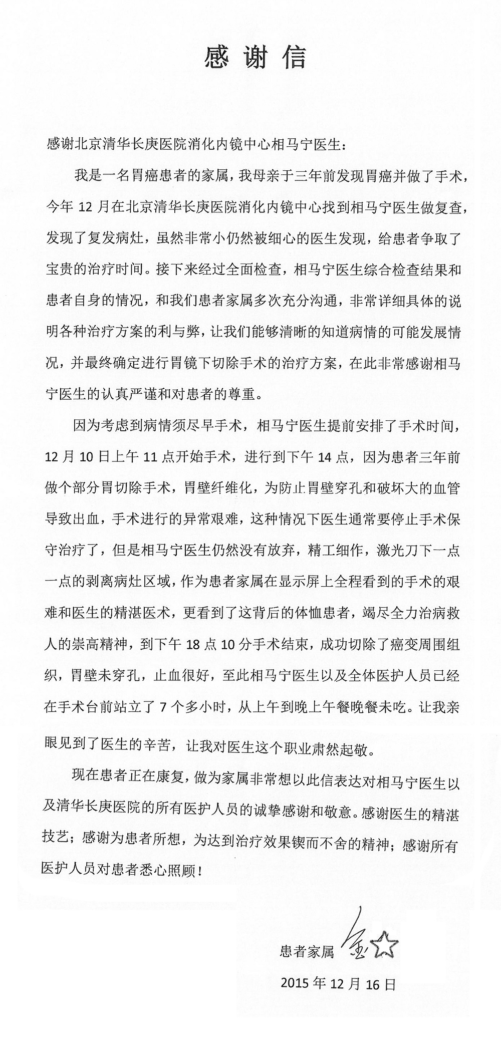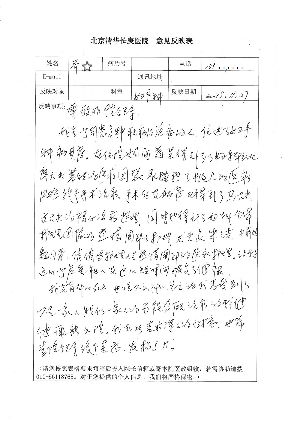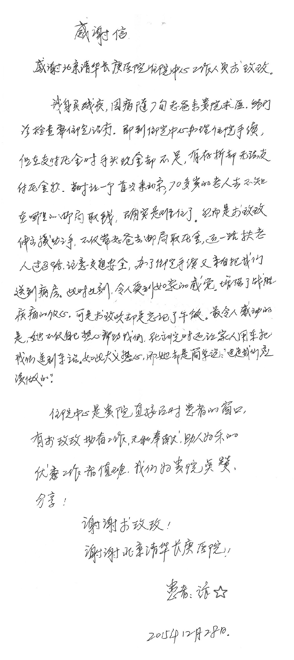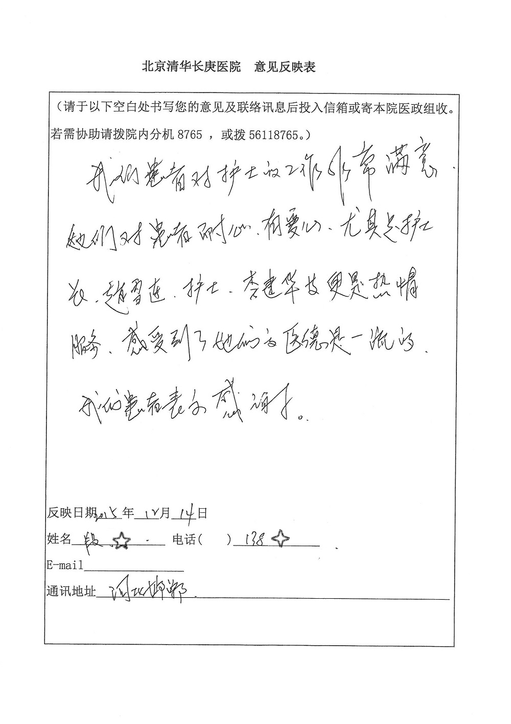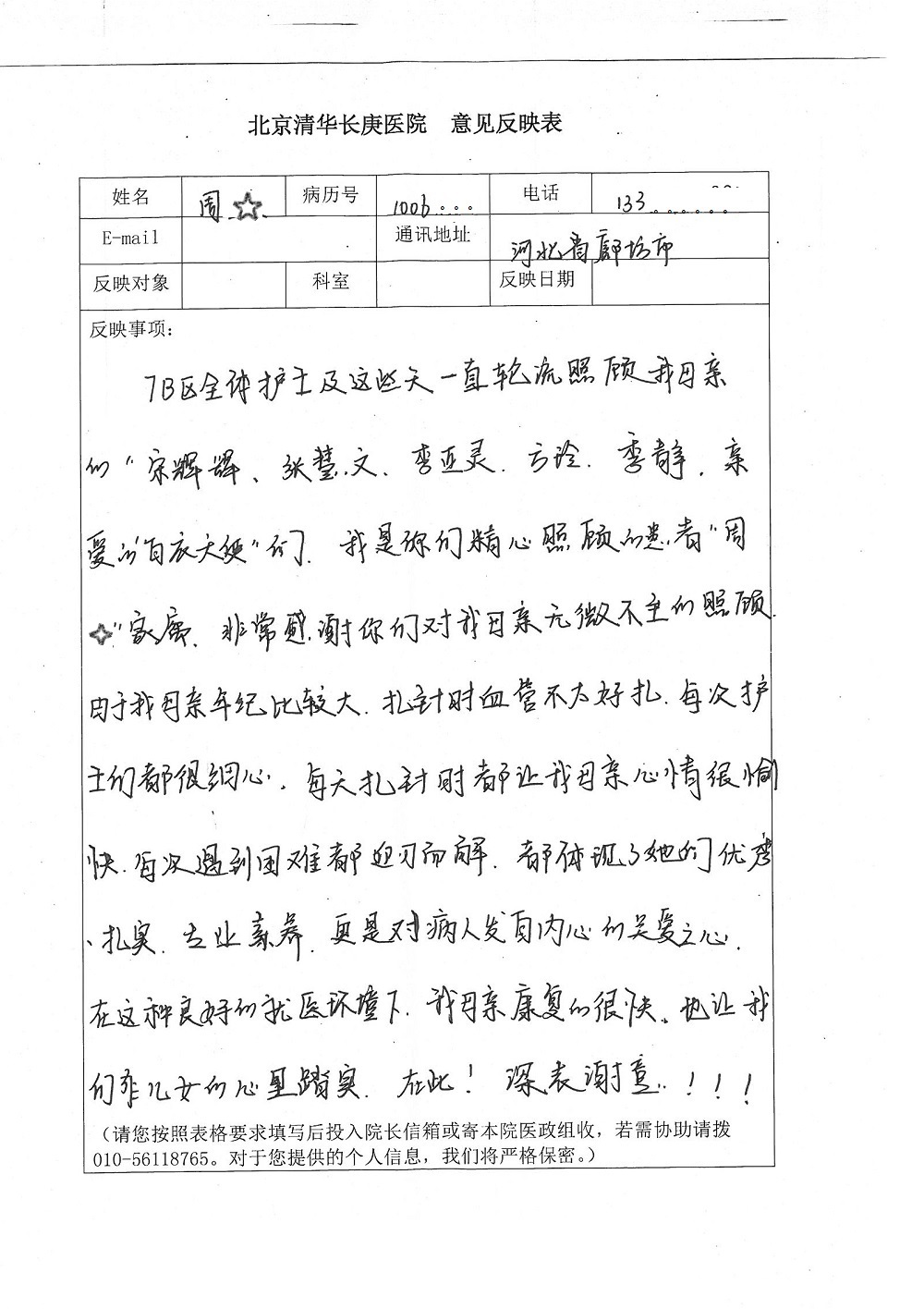 2015年12月,我院共接到患者及家属感谢信28封,其中神经外科王劲副院长、王贵怀主任,血管外科蒋超医师,妇产科廖秦平主任、吕涛主治医师、马珂主治医师、文佳医师,儿科季丽娜副主任医师、孟洪医师,耳鼻咽喉头颈外科李欣副主任医师、伊海金副主任医师、李京京医师,心内科张萍主任、孙玉杰医师、张鸥医师,血液内科于凡主治医师、黄月华医师,肿瘤内科王晓迪医师、李墨丹医师、安宇林医师,消化内科相马宁主任医师,肾内科李月红主任、庄震主治医师,急诊宋琳琳医师、王伟医师、王非医师、王琰医师、王科医师、段瑶医师、张会娟医师,检验科高汇迪,医事处刘静雅、李建伟,护理部宋子强、潘影娜、李硕、张东敬、张传云、王莹、赵雪莲、李建华、苗龙芳、朱洁、井莉媚、魏月秀、周倩倩、宋辉辉、张慧文、李亚灵、方玲、季静、郑微微、杨静护理人员,TC运送人员李玫玫及急诊、5A病区全体医护人员、惠佳丰配送公司收到具名表扬。特此公告,以资鼓励!