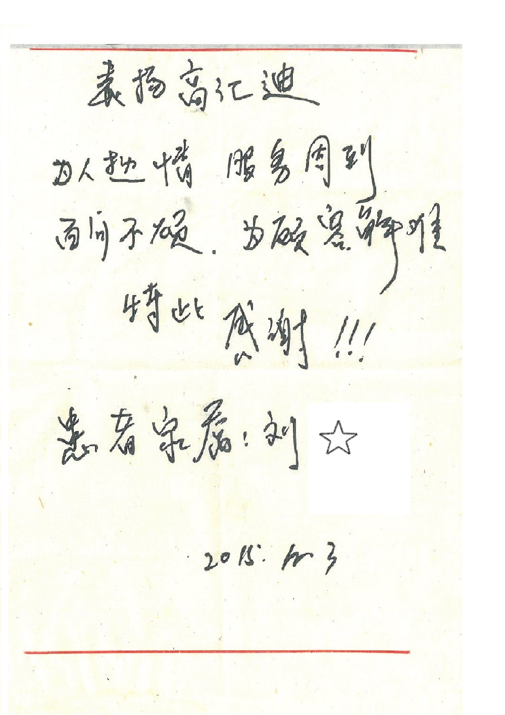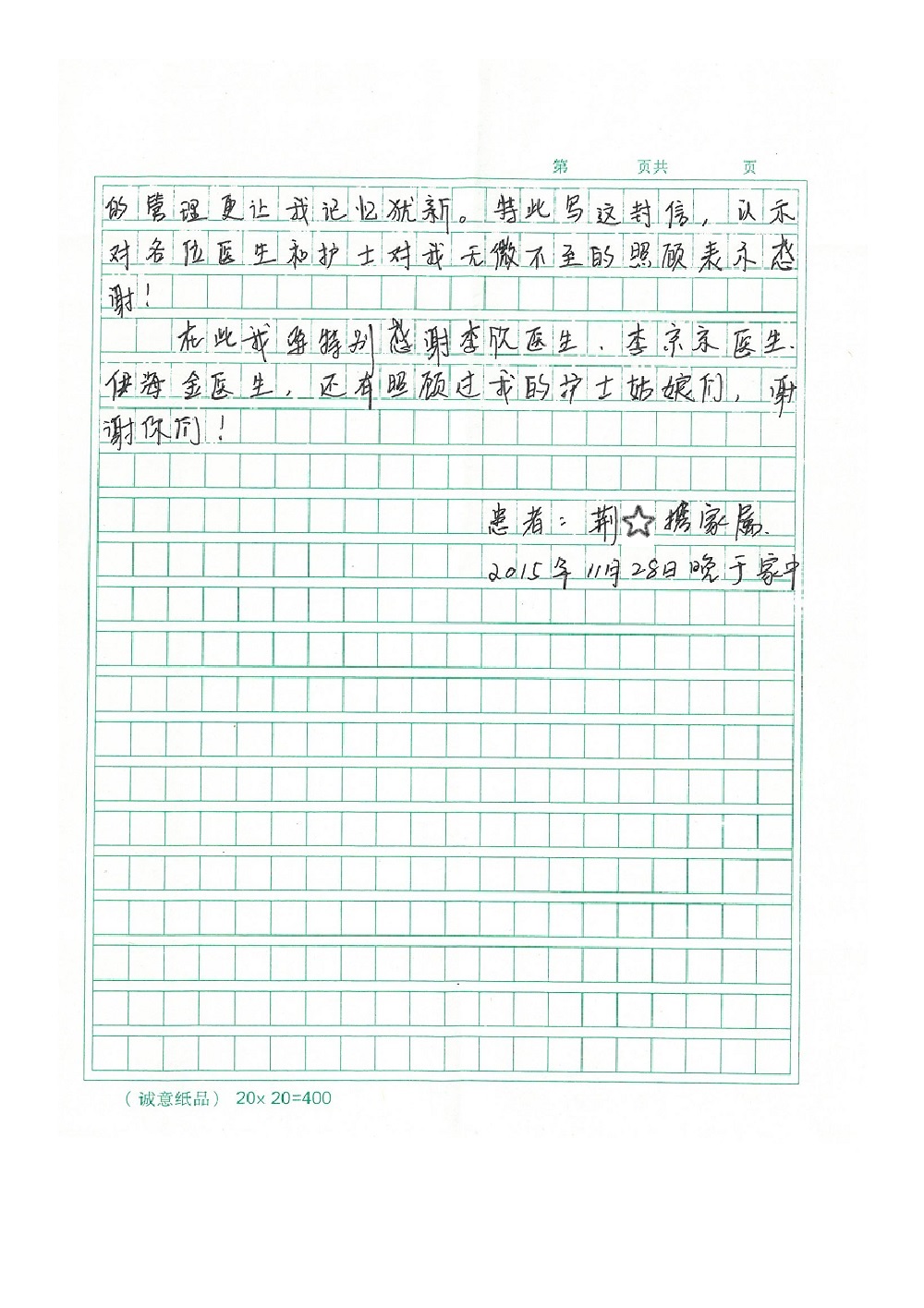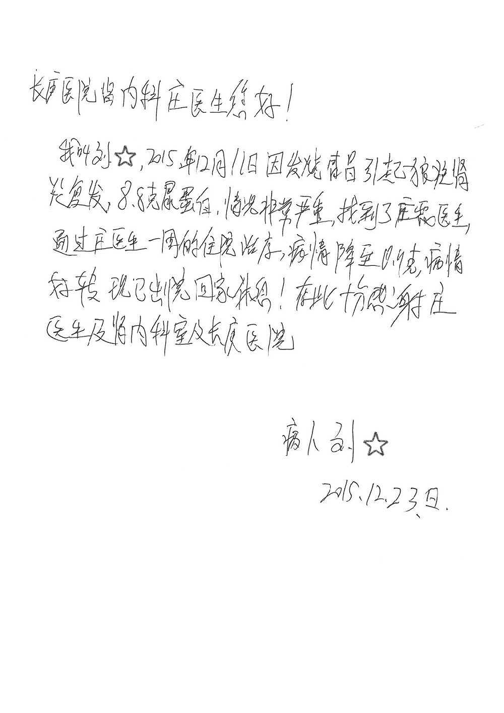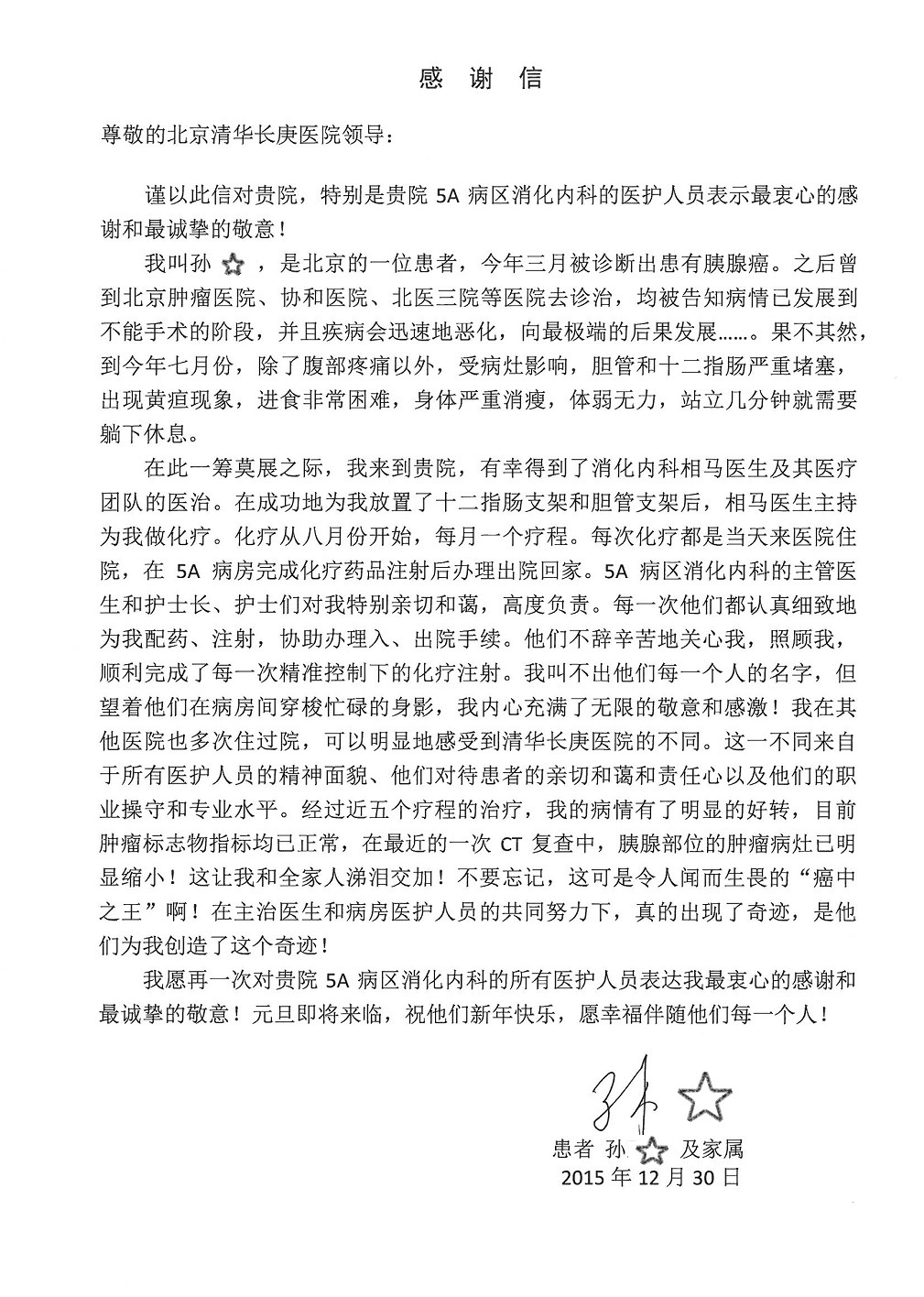 2015年12月,我院共接到患者及家属感谢信28封,其中神经外科王劲副院长、王贵怀主任,血管外科蒋超医师,妇产科廖秦平主任、吕涛主治医师、马珂主治医师、文佳医师,儿科季丽娜副主任医师、孟洪医师,耳鼻咽喉头颈外科李欣副主任医师、伊海金副主任医师、李京京医师,心内科张萍主任、孙玉杰医师、张鸥医师,血液内科于凡主治医师、黄月华医师,肿瘤内科王晓迪医师、李墨丹医师、安宇林医师,消化内科相马宁主任医师,肾内科李月红主任、庄震主治医师,急诊宋琳琳医师、王伟医师、王非医师、王琰医师、王科医师、段瑶医师、张会娟医师,检验科高汇迪,医事处刘静雅、李建伟,护理部宋子强、潘影娜、李硕、张东敬、张传云、王莹、赵雪莲、李建华、苗龙芳、朱洁、井莉媚、魏月秀、周倩倩、宋辉辉、张慧文、李亚灵、方玲、季静、郑微微、杨静护理人员,TC运送人员李玫玫及急诊、5A病区全体医护人员、惠佳丰配送公司收到具名表扬。特此公告,以资鼓励!