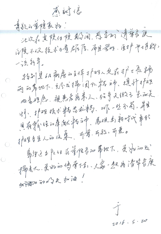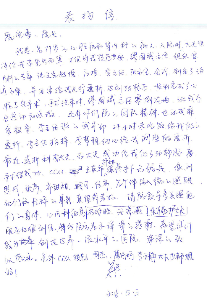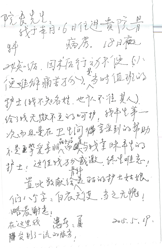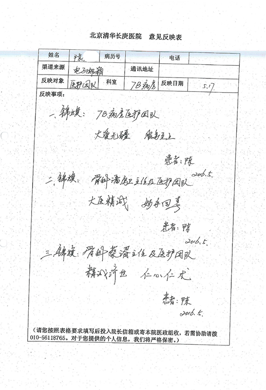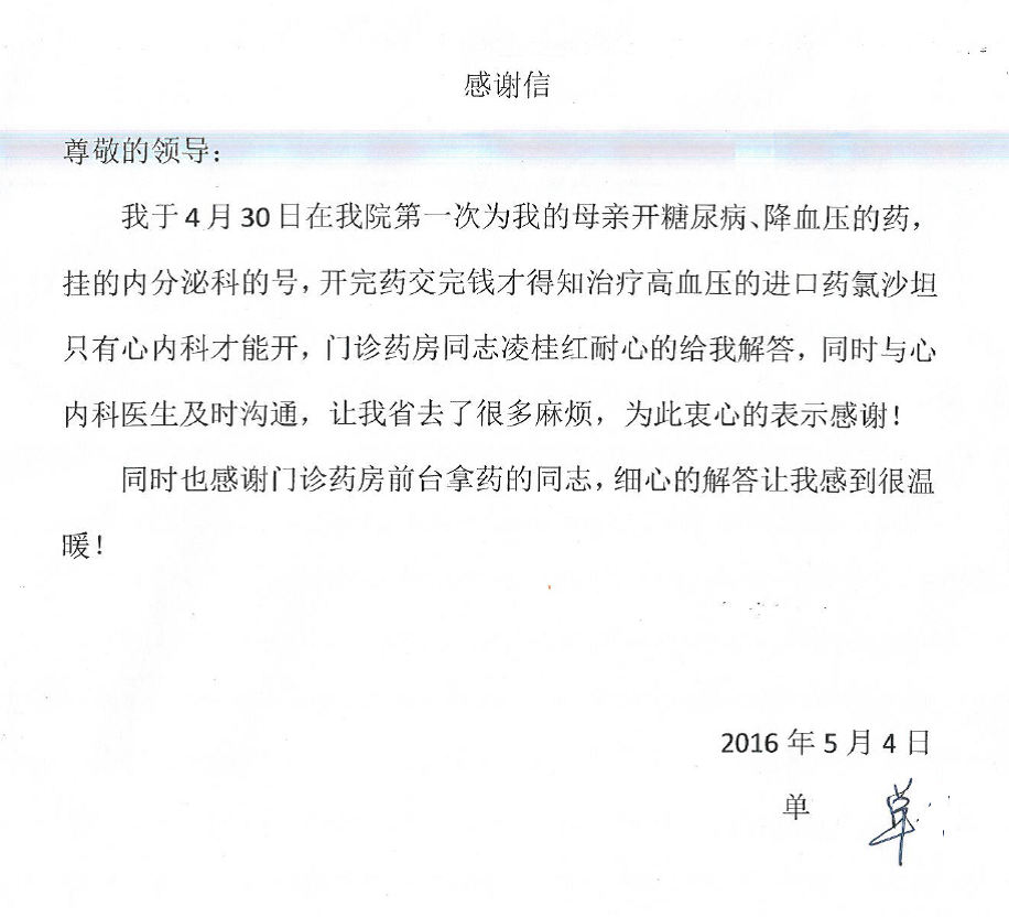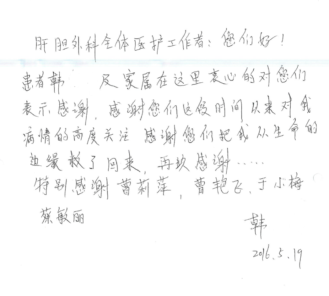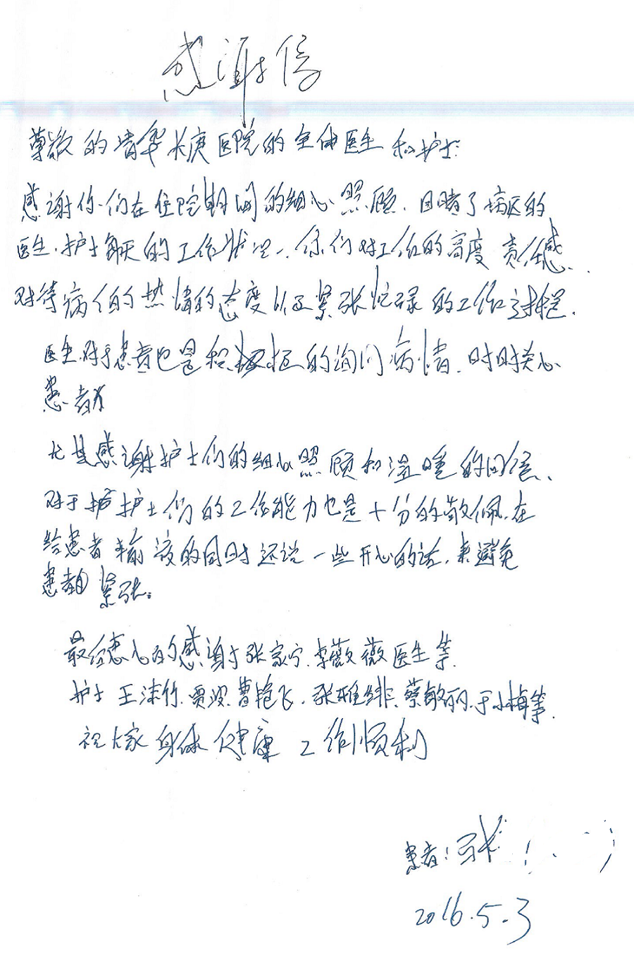 2016年5月,我院共接到患者及家属感谢信51封,其中肝胆胰外科董家鸿主任医师、石军副主任医师、王良医师、杨世伟医师,神经外科苏伟主治医师,普通外科罗斌主任医师、刘伯涛主治医师、刘安阳医师,整形外科张家宁主任医师、李薇薇副主任医师,骨科肖嵩华主任医师、潘勇卫主任医师、蔡谞主任医师、宋飞主治医师、何大炜医师、蒋超医师,泌尿外科李建兴主任医师、陈松副主任医师、张鑫副主任医师、胡卫国副主任医师、肖博主治医师、苏贵锋医师,麻醉科张欢主任医师,心脏内科张萍主任医师、缪国斌副主任医师、佘飞副主任医师、葛堪忆主任医师、何榕副主任医师、薛亚军主治医师、王昊天医师、杨靖医师、段敏医师、周杰医师、郭晓娟医师、郭文佳医师、陈瑞医师、葛婷婷医师,呼吸内科王立万副主任医师、郭军主治医师、张会娟医师、陈瑞医师,神经内科武剑主任医师,肾脏内科李月红主任医师、沈文光主任医师、庄震主治医师、李敏侠主治医师、吕佳璇医师,普通内科丁磊副主任医师,消化内科王佳主治医师,儿科李然主治医师、尹小梅主治医师,康复医学科潘钰主任医师、徐泉医师、孙小花、马春岳、李颜杝、尹航、朱殊丽、杨晓辉、马丽娜、付莉莉,内分泌科肖建中主任医师,眼科胡运韬主任医师、司山成医师、张茵茜医师,耳鼻咽喉-头颈外科李欣副主任医师,急诊科王也医师、李秀丽医师,ICU谢志毅副主任医师,超声科谢霞医师,药剂科凌桂红,医事处王莉,医政组赵晓兰,护理部史文丽、赵雪莲、黄帅、杨静、王珍、樊景春、张学爽、杨丽、王沫竹、林景熠、郑楠、刘晶钰、张保乾、李晶晶、寇静宜、张雅绯、于小梅、辛扬眉、吴琼、季静、代海栾、杨旭来、范桂芳、李亚灵、张慧文、郑爽、刘宇琛、曹奇菲、谢娟娟、谢兰兰、宋辉辉、郭莹莹、于洋洋、李伟伟、张亚菲、王莹、曹莉萍、曹艳飞、于小梅、蔡敏丽、贾波、吴雪洁、李梦雅、武军印、王英华、刘思彤、张莎、齐甜甜、钱月、位莎、张东敬、汪海燕、拓盼盼、刘翚、赵焕、张立玲、郭绥绥、陈红婷、白俊、李硕、张文文、杨新苗、何晓亮、巩丽阳、刘洋、李文静、杨晓辉以及普通外科、耳鼻喉科全体医护人员、8A病房全体医护人员、7B病房全体医护人员、6A病房全体护理人员收到具名表扬。特此公告,以资鼓励!