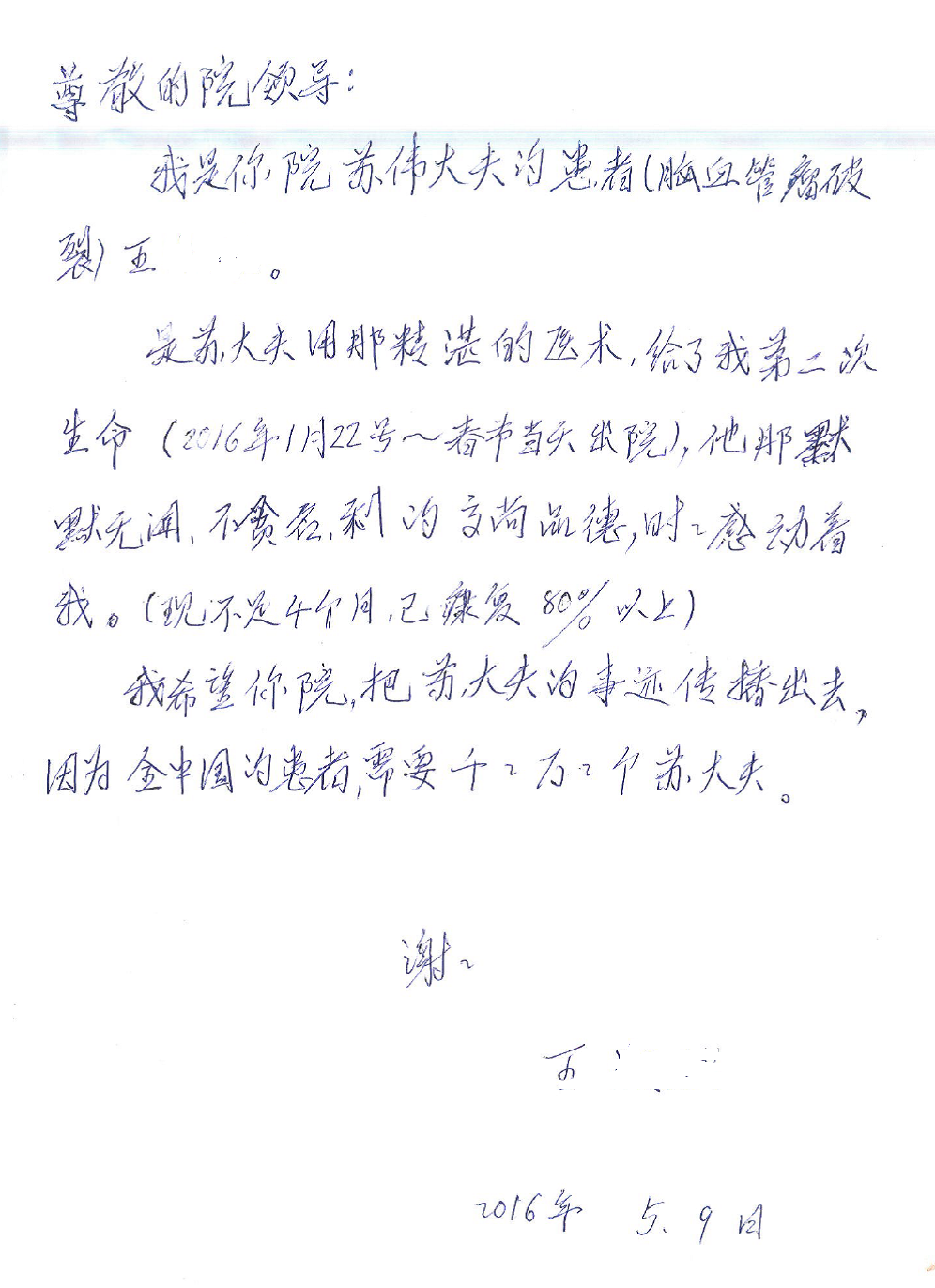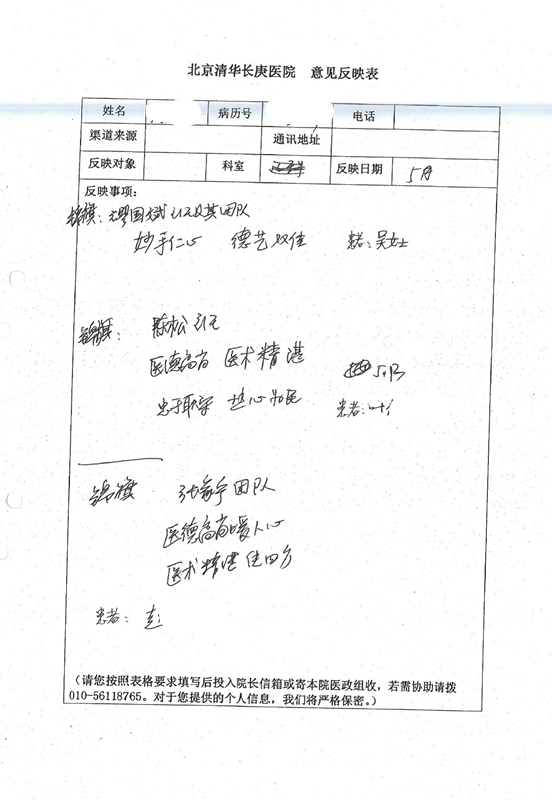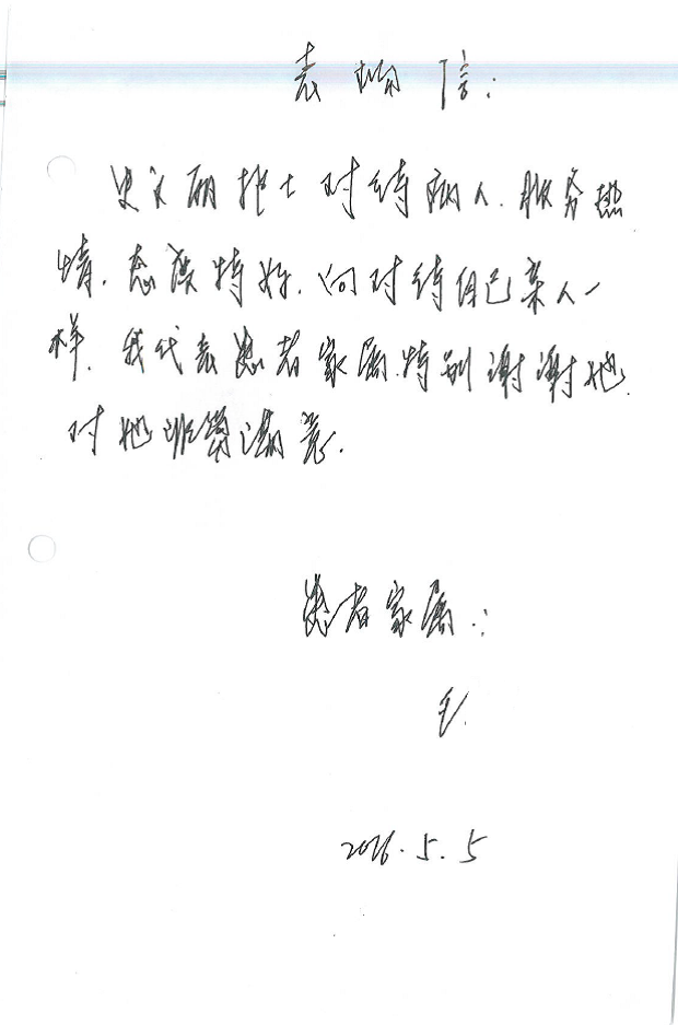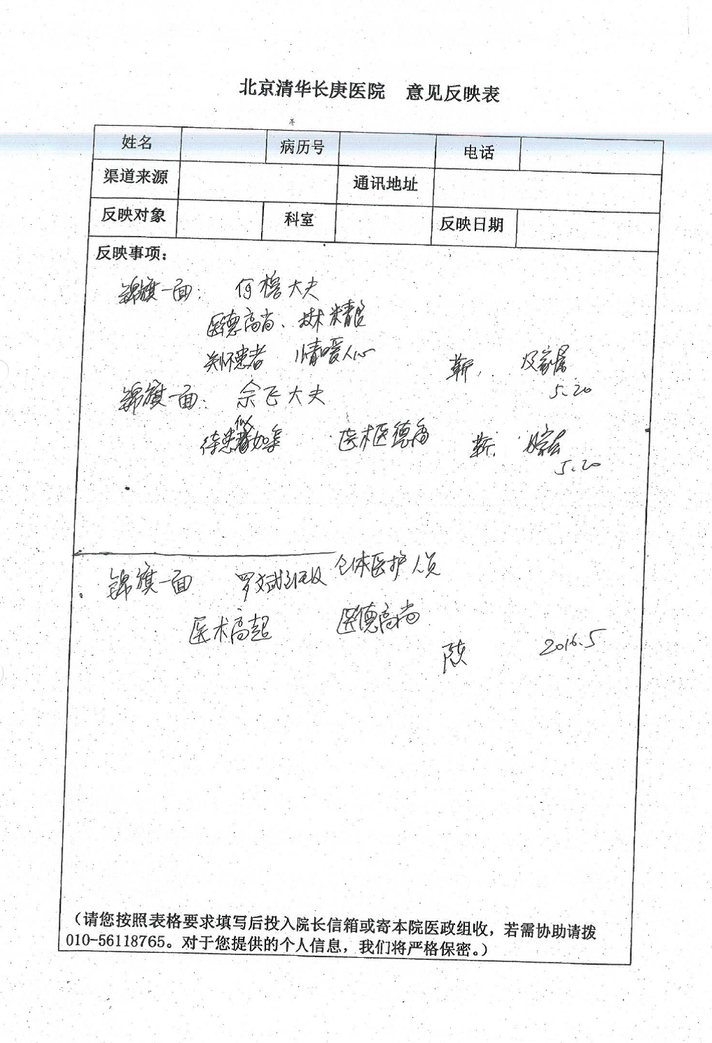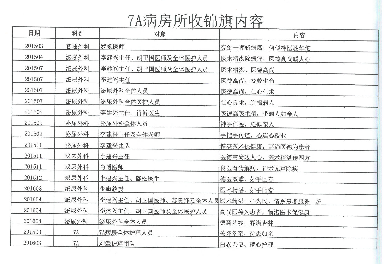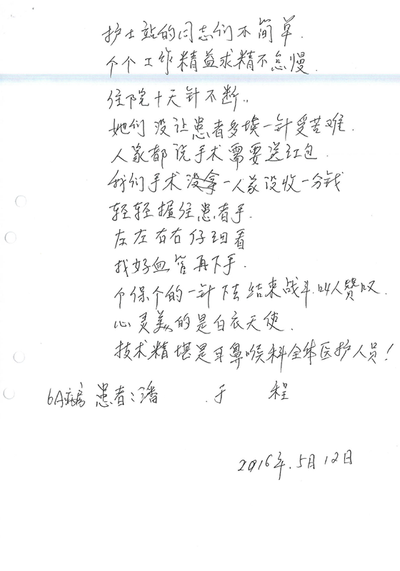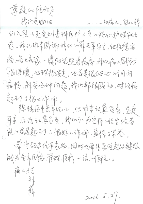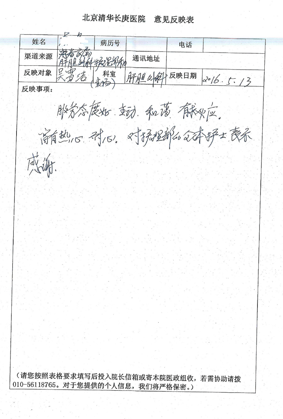 2016年5月,我院共接到患者及家属感谢信51封,其中肝胆胰外科董家鸿主任医师、石军副主任医师、王良医师、杨世伟医师,神经外科苏伟主治医师,普通外科罗斌主任医师、刘伯涛主治医师、刘安阳医师,整形外科张家宁主任医师、李薇薇副主任医师,骨科肖嵩华主任医师、潘勇卫主任医师、蔡谞主任医师、宋飞主治医师、何大炜医师、蒋超医师,泌尿外科李建兴主任医师、陈松副主任医师、张鑫副主任医师、胡卫国副主任医师、肖博主治医师、苏贵锋医师,麻醉科张欢主任医师,心脏内科张萍主任医师、缪国斌副主任医师、佘飞副主任医师、葛堪忆主任医师、何榕副主任医师、薛亚军主治医师、王昊天医师、杨靖医师、段敏医师、周杰医师、郭晓娟医师、郭文佳医师、陈瑞医师、葛婷婷医师,呼吸内科王立万副主任医师、郭军主治医师、张会娟医师、陈瑞医师,神经内科武剑主任医师,肾脏内科李月红主任医师、沈文光主任医师、庄震主治医师、李敏侠主治医师、吕佳璇医师,普通内科丁磊副主任医师,消化内科王佳主治医师,儿科李然主治医师、尹小梅主治医师,康复医学科潘钰主任医师、徐泉医师、孙小花、马春岳、李颜杝、尹航、朱殊丽、杨晓辉、马丽娜、付莉莉,内分泌科肖建中主任医师,眼科胡运韬主任医师、司山成医师、张茵茜医师,耳鼻咽喉-头颈外科李欣副主任医师,急诊科王也医师、李秀丽医师,ICU谢志毅副主任医师,超声科谢霞医师,药剂科凌桂红,医事处王莉,医政组赵晓兰,护理部史文丽、赵雪莲、黄帅、杨静、王珍、樊景春、张学爽、杨丽、王沫竹、林景熠、郑楠、刘晶钰、张保乾、李晶晶、寇静宜、张雅绯、于小梅、辛扬眉、吴琼、季静、代海栾、杨旭来、范桂芳、李亚灵、张慧文、郑爽、刘宇琛、曹奇菲、谢娟娟、谢兰兰、宋辉辉、郭莹莹、于洋洋、李伟伟、张亚菲、王莹、曹莉萍、曹艳飞、于小梅、蔡敏丽、贾波、吴雪洁、李梦雅、武军印、王英华、刘思彤、张莎、齐甜甜、钱月、位莎、张东敬、汪海燕、拓盼盼、刘翚、赵焕、张立玲、郭绥绥、陈红婷、白俊、李硕、张文文、杨新苗、何晓亮、巩丽阳、刘洋、李文静、杨晓辉以及普通外科、耳鼻喉科全体医护人员、8A病房全体医护人员、7B病房全体医护人员、6A病房全体护理人员收到具名表扬。特此公告,以资鼓励!
