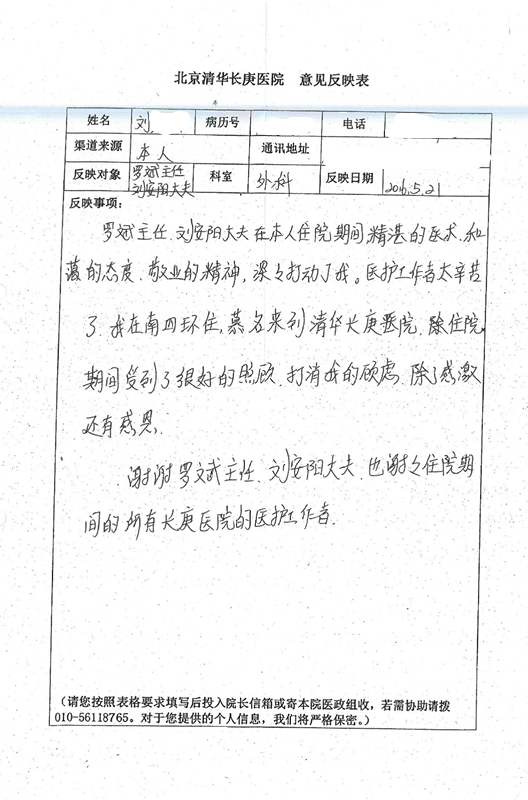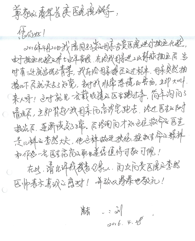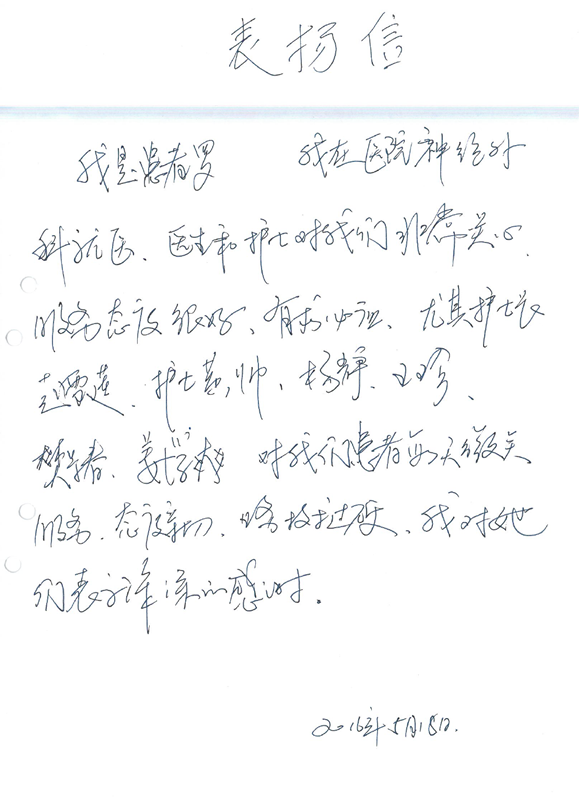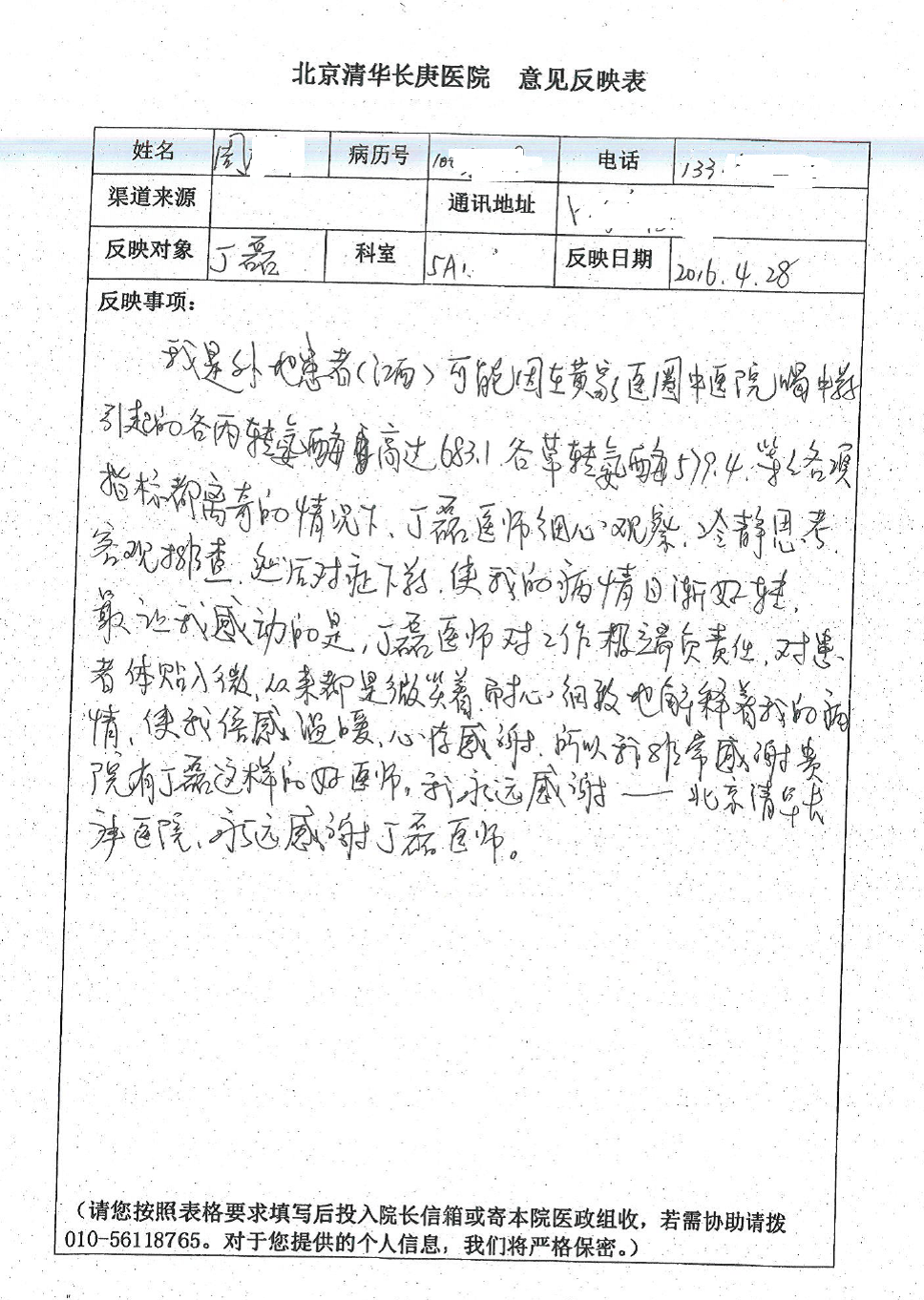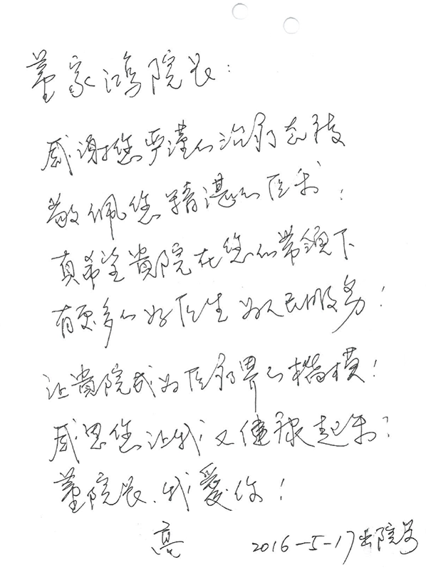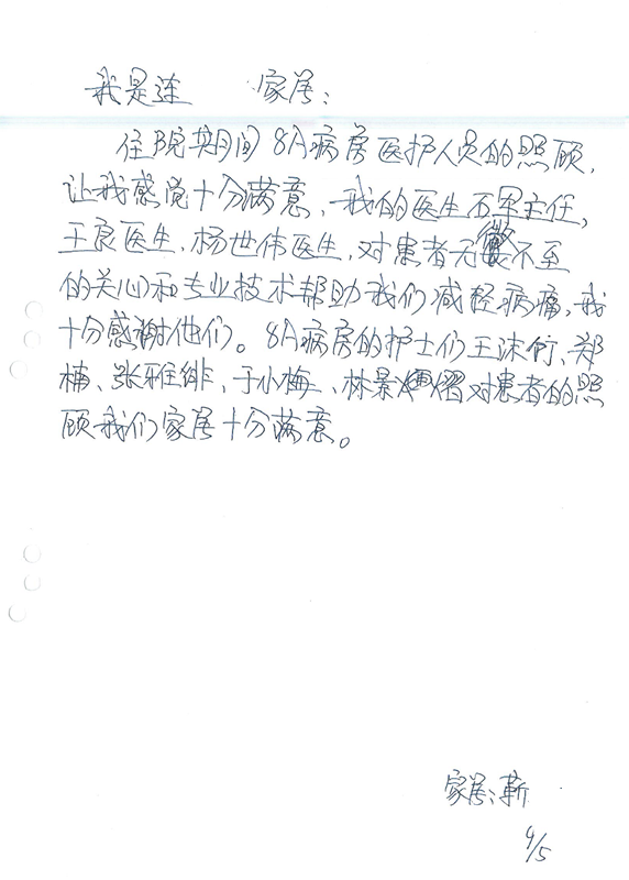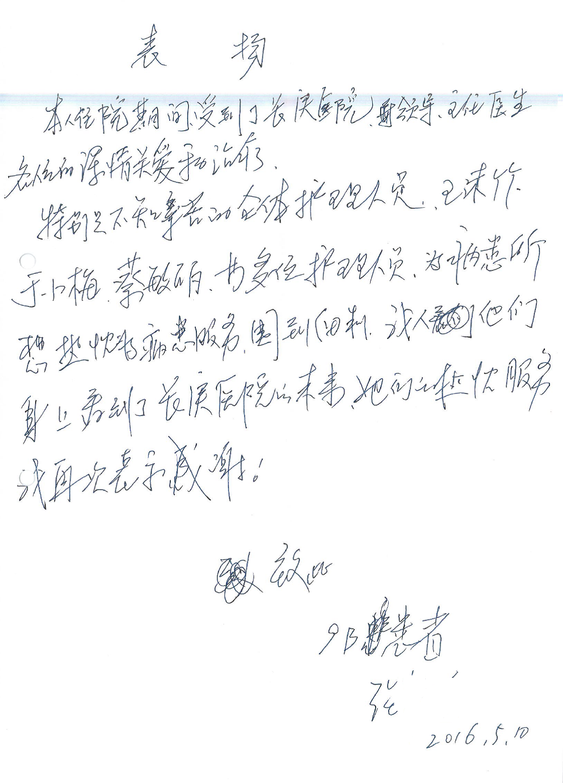 2016年5月,我院共接到患者及家属感谢信51封,其中肝胆胰外科董家鸿主任医师、石军副主任医师、王良医师、杨世伟医师,神经外科苏伟主治医师,普通外科罗斌主任医师、刘伯涛主治医师、刘安阳医师,整形外科张家宁主任医师、李薇薇副主任医师,骨科肖嵩华主任医师、潘勇卫主任医师、蔡谞主任医师、宋飞主治医师、何大炜医师、蒋超医师,泌尿外科李建兴主任医师、陈松副主任医师、张鑫副主任医师、胡卫国副主任医师、肖博主治医师、苏贵锋医师,麻醉科张欢主任医师,心脏内科张萍主任医师、缪国斌副主任医师、佘飞副主任医师、葛堪忆主任医师、何榕副主任医师、薛亚军主治医师、王昊天医师、杨靖医师、段敏医师、周杰医师、郭晓娟医师、郭文佳医师、陈瑞医师、葛婷婷医师,呼吸内科王立万副主任医师、郭军主治医师、张会娟医师、陈瑞医师,神经内科武剑主任医师,肾脏内科李月红主任医师、沈文光主任医师、庄震主治医师、李敏侠主治医师、吕佳璇医师,普通内科丁磊副主任医师,消化内科王佳主治医师,儿科李然主治医师、尹小梅主治医师,康复医学科潘钰主任医师、徐泉医师、孙小花、马春岳、李颜杝、尹航、朱殊丽、杨晓辉、马丽娜、付莉莉,内分泌科肖建中主任医师,眼科胡运韬主任医师、司山成医师、张茵茜医师,耳鼻咽喉-头颈外科李欣副主任医师,急诊科王也医师、李秀丽医师,ICU谢志毅副主任医师,超声科谢霞医师,药剂科凌桂红,医事处王莉,医政组赵晓兰,护理部史文丽、赵雪莲、黄帅、杨静、王珍、樊景春、张学爽、杨丽、王沫竹、林景熠、郑楠、刘晶钰、张保乾、李晶晶、寇静宜、张雅绯、于小梅、辛扬眉、吴琼、季静、代海栾、杨旭来、范桂芳、李亚灵、张慧文、郑爽、刘宇琛、曹奇菲、谢娟娟、谢兰兰、宋辉辉、郭莹莹、于洋洋、李伟伟、张亚菲、王莹、曹莉萍、曹艳飞、于小梅、蔡敏丽、贾波、吴雪洁、李梦雅、武军印、王英华、刘思彤、张莎、齐甜甜、钱月、位莎、张东敬、汪海燕、拓盼盼、刘翚、赵焕、张立玲、郭绥绥、陈红婷、白俊、李硕、张文文、杨新苗、何晓亮、巩丽阳、刘洋、李文静、杨晓辉以及普通外科、耳鼻喉科全体医护人员、8A病房全体医护人员、7B病房全体医护人员、6A病房全体护理人员收到具名表扬。特此公告,以资鼓励!