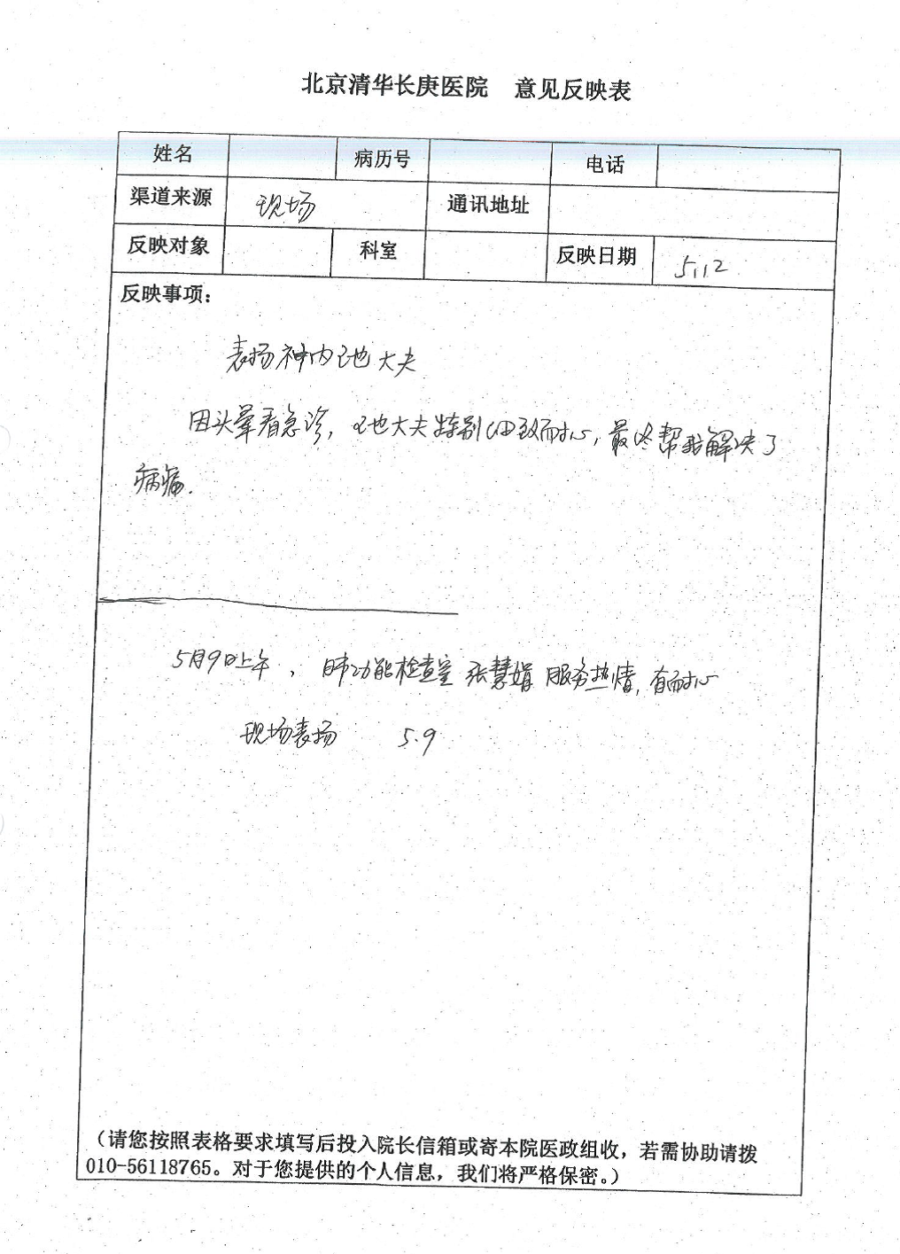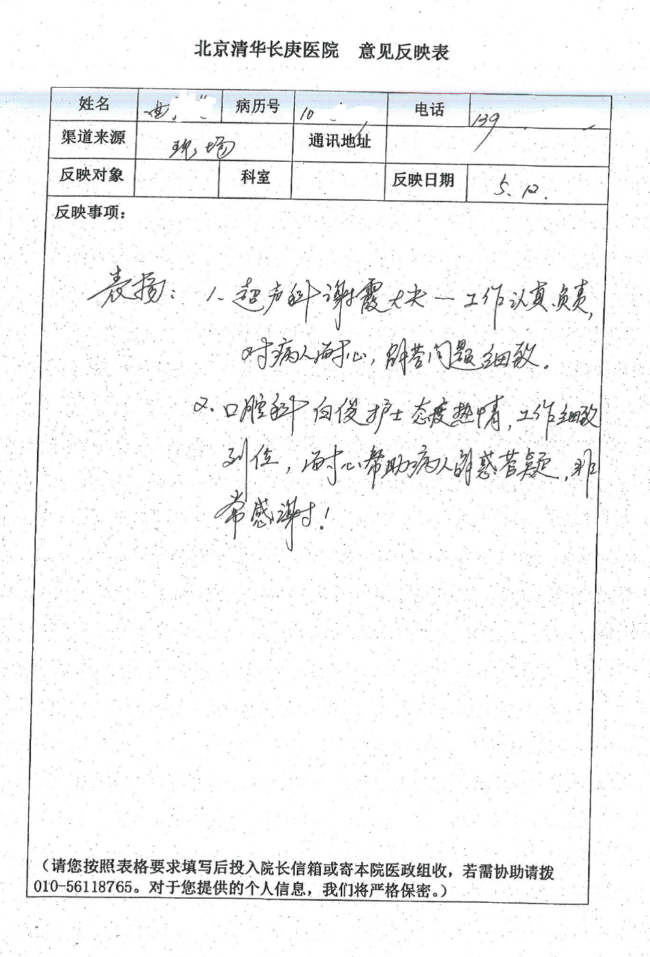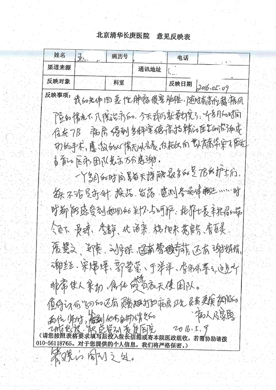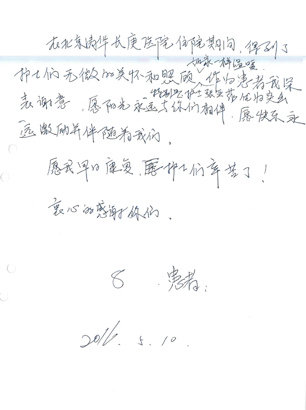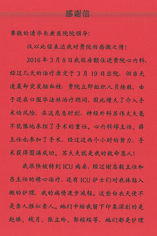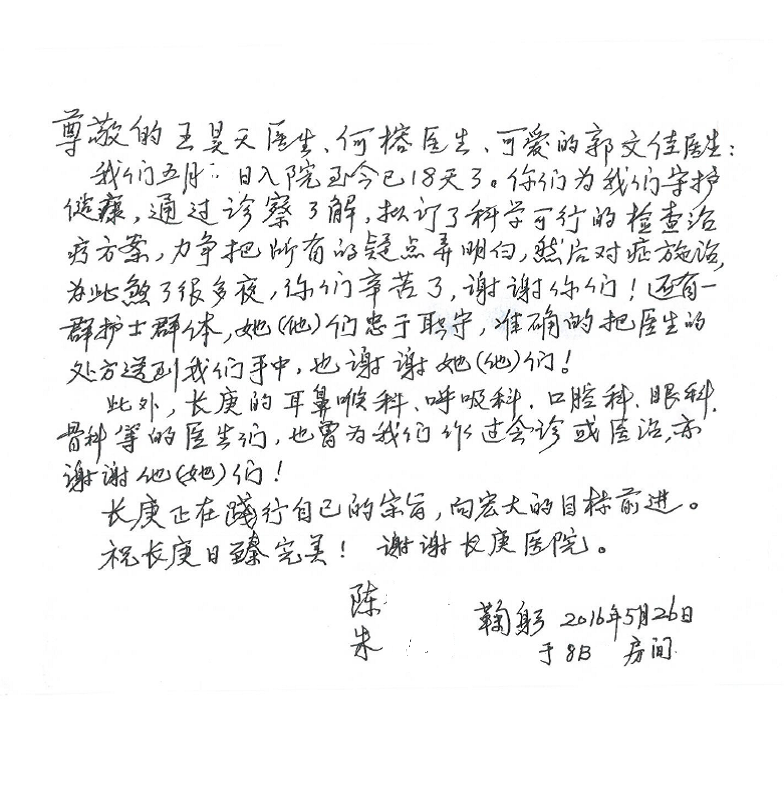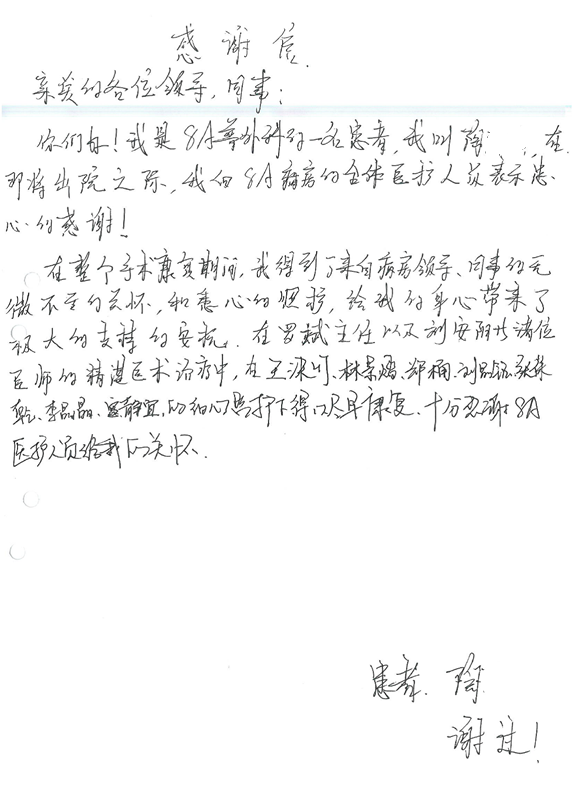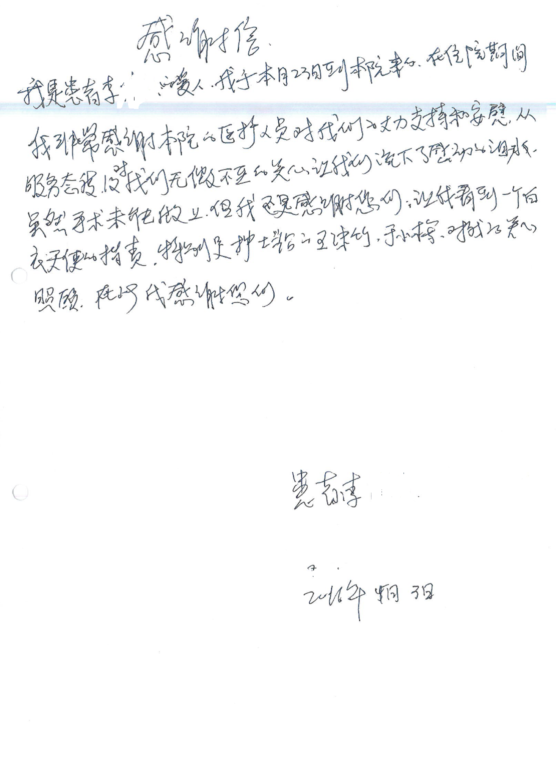 2016年5月,我院共接到患者及家属感谢信51封,其中肝胆胰外科董家鸿主任医师、石军副主任医师、王良医师、杨世伟医师,神经外科苏伟主治医师,普通外科罗斌主任医师、刘伯涛主治医师、刘安阳医师,整形外科张家宁主任医师、李薇薇副主任医师,骨科肖嵩华主任医师、潘勇卫主任医师、蔡谞主任医师、宋飞主治医师、何大炜医师、蒋超医师,泌尿外科李建兴主任医师、陈松副主任医师、张鑫副主任医师、胡卫国副主任医师、肖博主治医师、苏贵锋医师,麻醉科张欢主任医师,心脏内科张萍主任医师、缪国斌副主任医师、佘飞副主任医师、葛堪忆主任医师、何榕副主任医师、薛亚军主治医师、王昊天医师、杨靖医师、段敏医师、周杰医师、郭晓娟医师、郭文佳医师、陈瑞医师、葛婷婷医师,呼吸内科王立万副主任医师、郭军主治医师、张会娟医师、陈瑞医师,神经内科武剑主任医师,肾脏内科李月红主任医师、沈文光主任医师、庄震主治医师、李敏侠主治医师、吕佳璇医师,普通内科丁磊副主任医师,消化内科王佳主治医师,儿科李然主治医师、尹小梅主治医师,康复医学科潘钰主任医师、徐泉医师、孙小花、马春岳、李颜杝、尹航、朱殊丽、杨晓辉、马丽娜、付莉莉,内分泌科肖建中主任医师,眼科胡运韬主任医师、司山成医师、张茵茜医师,耳鼻咽喉-头颈外科李欣副主任医师,急诊科王也医师、李秀丽医师,ICU谢志毅副主任医师,超声科谢霞医师,药剂科凌桂红,医事处王莉,医政组赵晓兰,护理部史文丽、赵雪莲、黄帅、杨静、王珍、樊景春、张学爽、杨丽、王沫竹、林景熠、郑楠、刘晶钰、张保乾、李晶晶、寇静宜、张雅绯、于小梅、辛扬眉、吴琼、季静、代海栾、杨旭来、范桂芳、李亚灵、张慧文、郑爽、刘宇琛、曹奇菲、谢娟娟、谢兰兰、宋辉辉、郭莹莹、于洋洋、李伟伟、张亚菲、王莹、曹莉萍、曹艳飞、于小梅、蔡敏丽、贾波、吴雪洁、李梦雅、武军印、王英华、刘思彤、张莎、齐甜甜、钱月、位莎、张东敬、汪海燕、拓盼盼、刘翚、赵焕、张立玲、郭绥绥、陈红婷、白俊、李硕、张文文、杨新苗、何晓亮、巩丽阳、刘洋、李文静、杨晓辉以及普通外科、耳鼻喉科全体医护人员、8A病房全体医护人员、7B病房全体医护人员、6A病房全体护理人员收到具名表扬。特此公告,以资鼓励!
