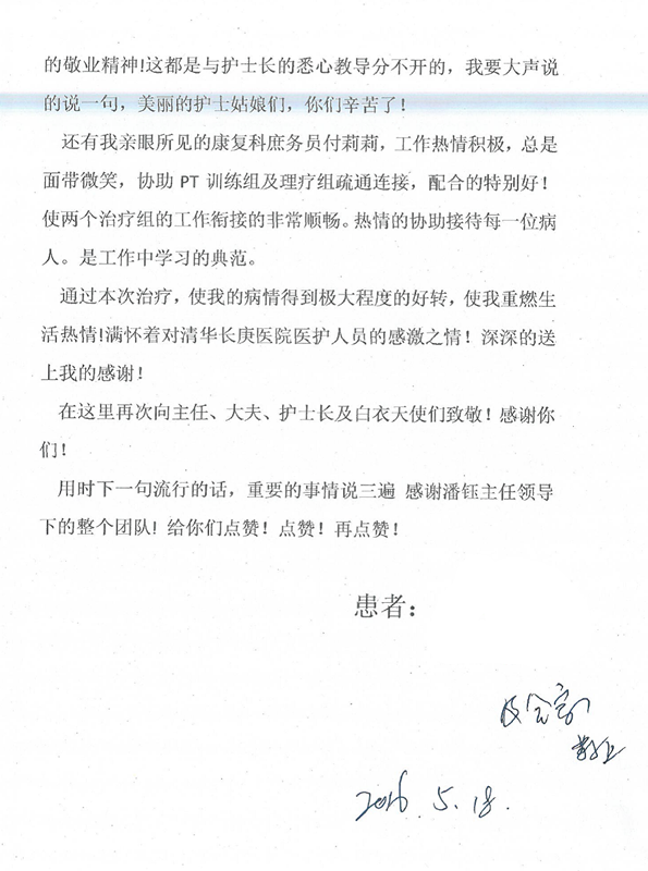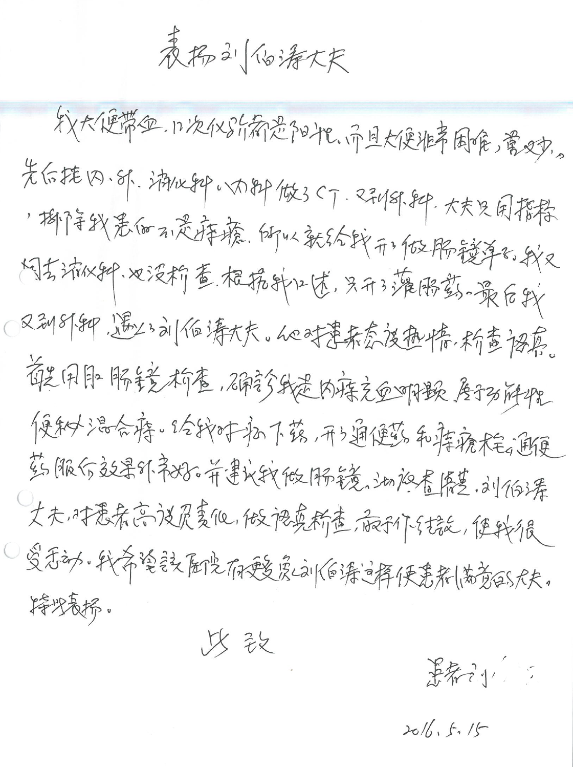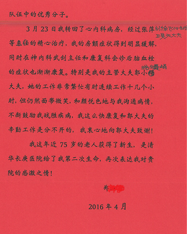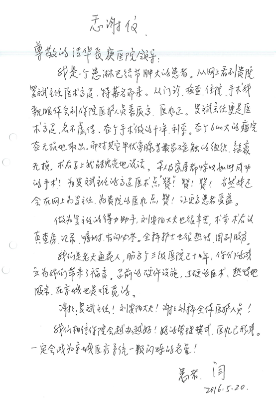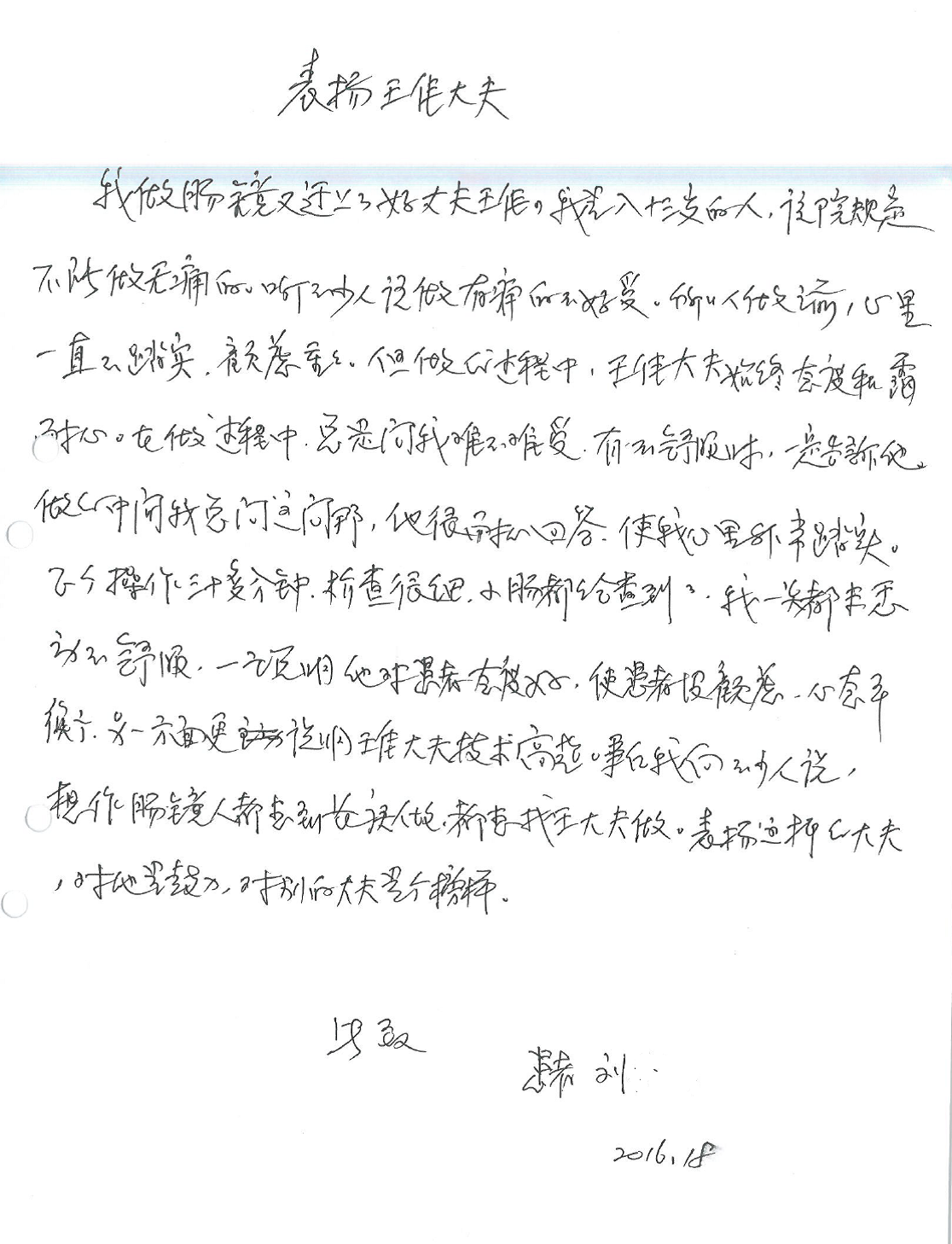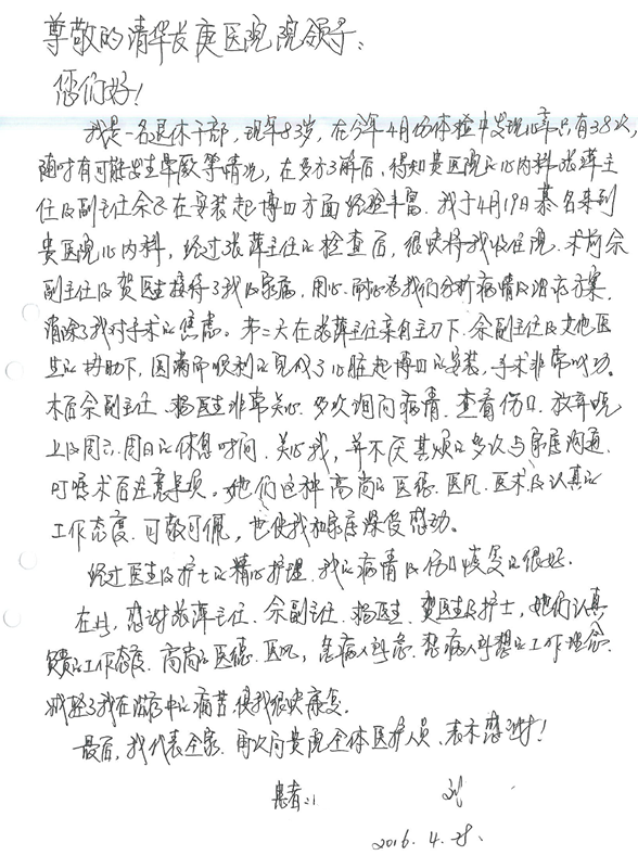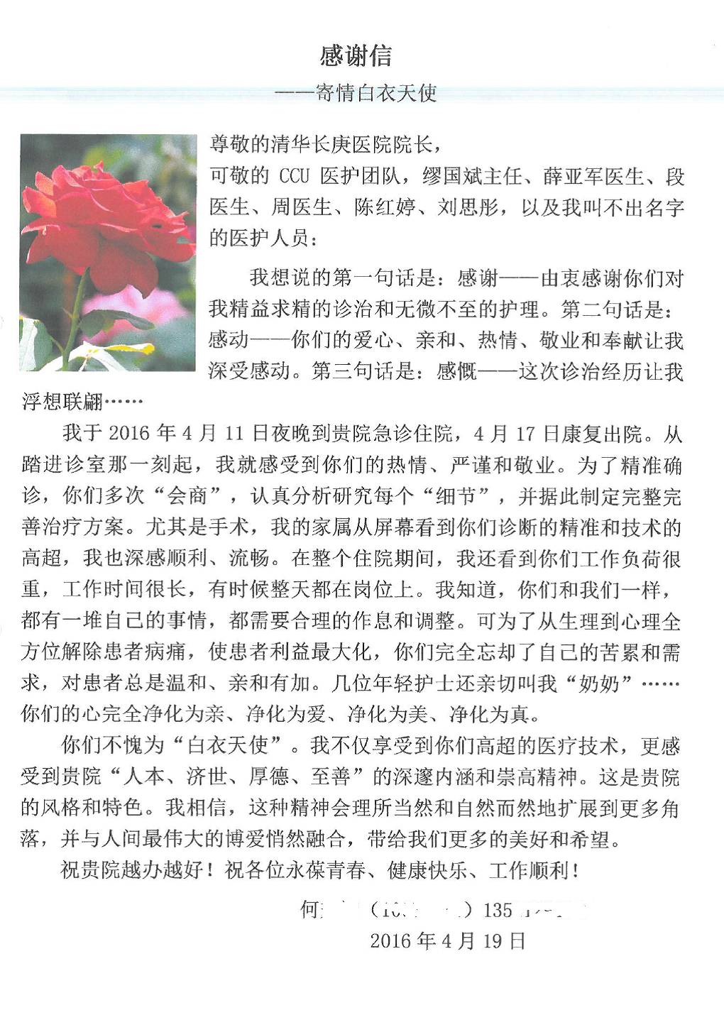 2016年5月,我院共接到患者及家属感谢信51封,其中肝胆胰外科董家鸿主任医师、石军副主任医师、王良医师、杨世伟医师,神经外科苏伟主治医师,普通外科罗斌主任医师、刘伯涛主治医师、刘安阳医师,整形外科张家宁主任医师、李薇薇副主任医师,骨科肖嵩华主任医师、潘勇卫主任医师、蔡谞主任医师、宋飞主治医师、何大炜医师、蒋超医师,泌尿外科李建兴主任医师、陈松副主任医师、张鑫副主任医师、胡卫国副主任医师、肖博主治医师、苏贵锋医师,麻醉科张欢主任医师,心脏内科张萍主任医师、缪国斌副主任医师、佘飞副主任医师、葛堪忆主任医师、何榕副主任医师、薛亚军主治医师、王昊天医师、杨靖医师、段敏医师、周杰医师、郭晓娟医师、郭文佳医师、陈瑞医师、葛婷婷医师,呼吸内科王立万副主任医师、郭军主治医师、张会娟医师、陈瑞医师,神经内科武剑主任医师,肾脏内科李月红主任医师、沈文光主任医师、庄震主治医师、李敏侠主治医师、吕佳璇医师,普通内科丁磊副主任医师,消化内科王佳主治医师,儿科李然主治医师、尹小梅主治医师,康复医学科潘钰主任医师、徐泉医师、孙小花、马春岳、李颜杝、尹航、朱殊丽、杨晓辉、马丽娜、付莉莉,内分泌科肖建中主任医师,眼科胡运韬主任医师、司山成医师、张茵茜医师,耳鼻咽喉-头颈外科李欣副主任医师,急诊科王也医师、李秀丽医师,ICU谢志毅副主任医师,超声科谢霞医师,药剂科凌桂红,医事处王莉,医政组赵晓兰,护理部史文丽、赵雪莲、黄帅、杨静、王珍、樊景春、张学爽、杨丽、王沫竹、林景熠、郑楠、刘晶钰、张保乾、李晶晶、寇静宜、张雅绯、于小梅、辛扬眉、吴琼、季静、代海栾、杨旭来、范桂芳、李亚灵、张慧文、郑爽、刘宇琛、曹奇菲、谢娟娟、谢兰兰、宋辉辉、郭莹莹、于洋洋、李伟伟、张亚菲、王莹、曹莉萍、曹艳飞、于小梅、蔡敏丽、贾波、吴雪洁、李梦雅、武军印、王英华、刘思彤、张莎、齐甜甜、钱月、位莎、张东敬、汪海燕、拓盼盼、刘翚、赵焕、张立玲、郭绥绥、陈红婷、白俊、李硕、张文文、杨新苗、何晓亮、巩丽阳、刘洋、李文静、杨晓辉以及普通外科、耳鼻喉科全体医护人员、8A病房全体医护人员、7B病房全体医护人员、6A病房全体护理人员收到具名表扬。特此公告,以资鼓励!