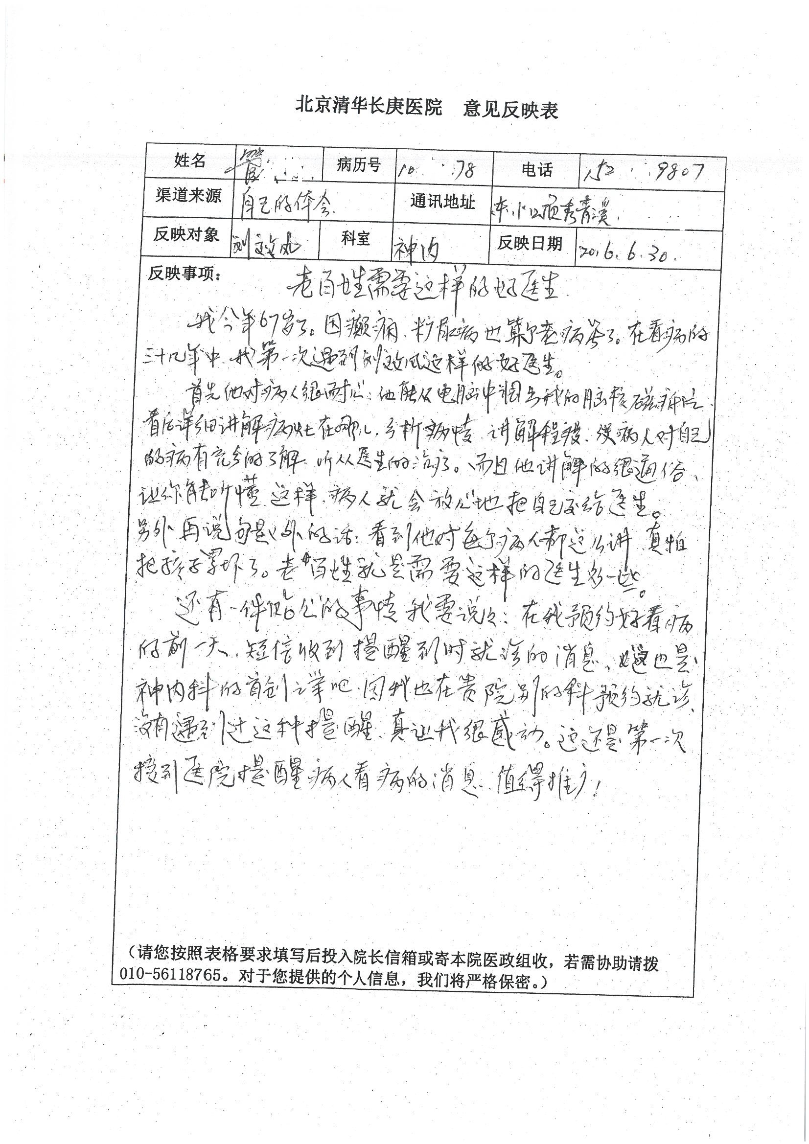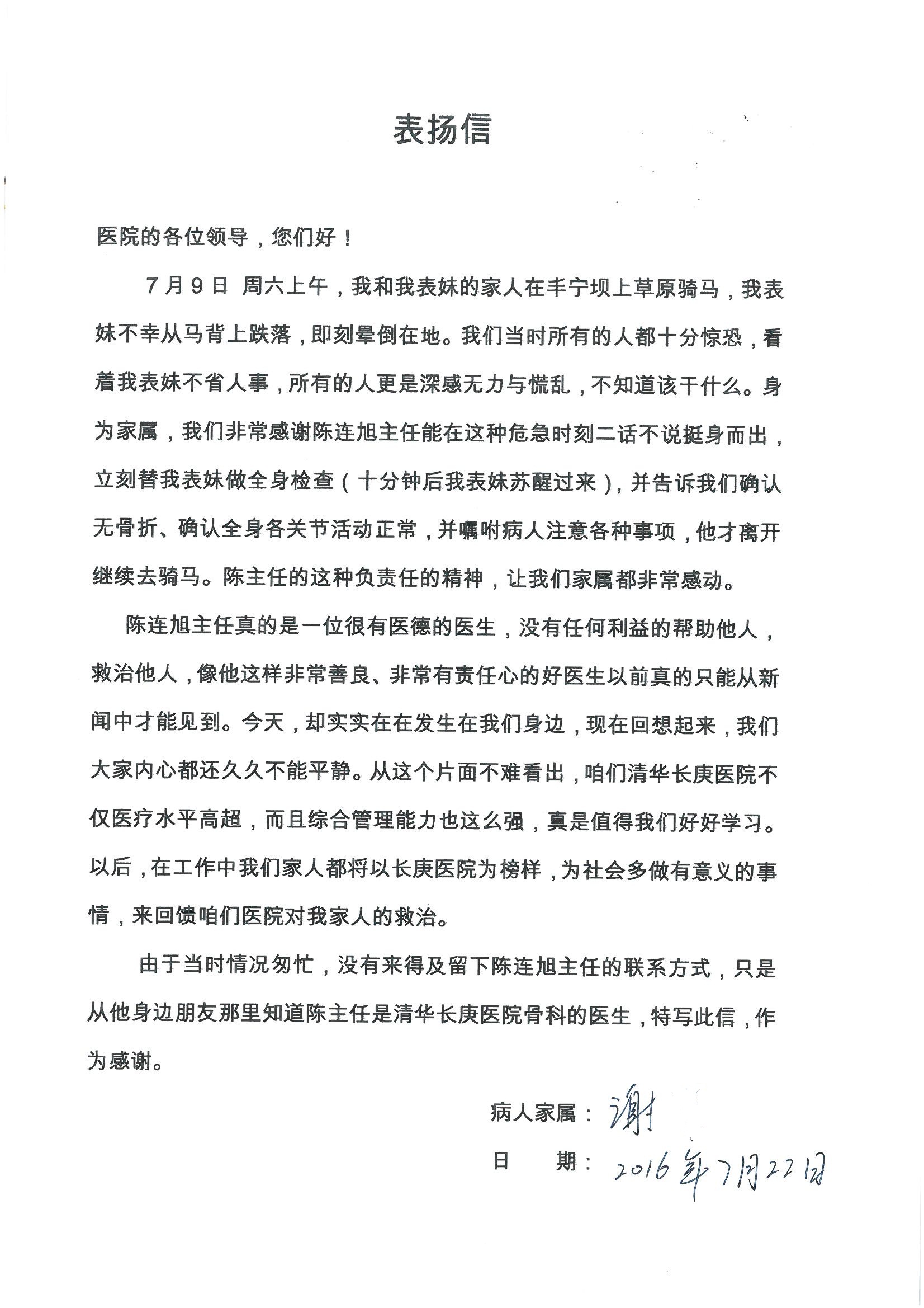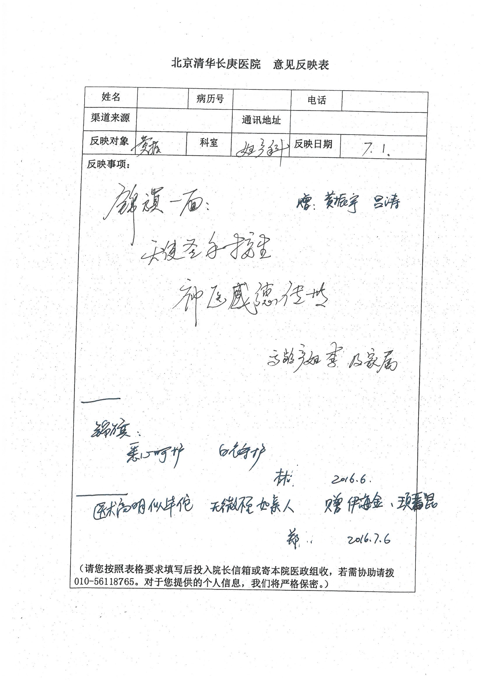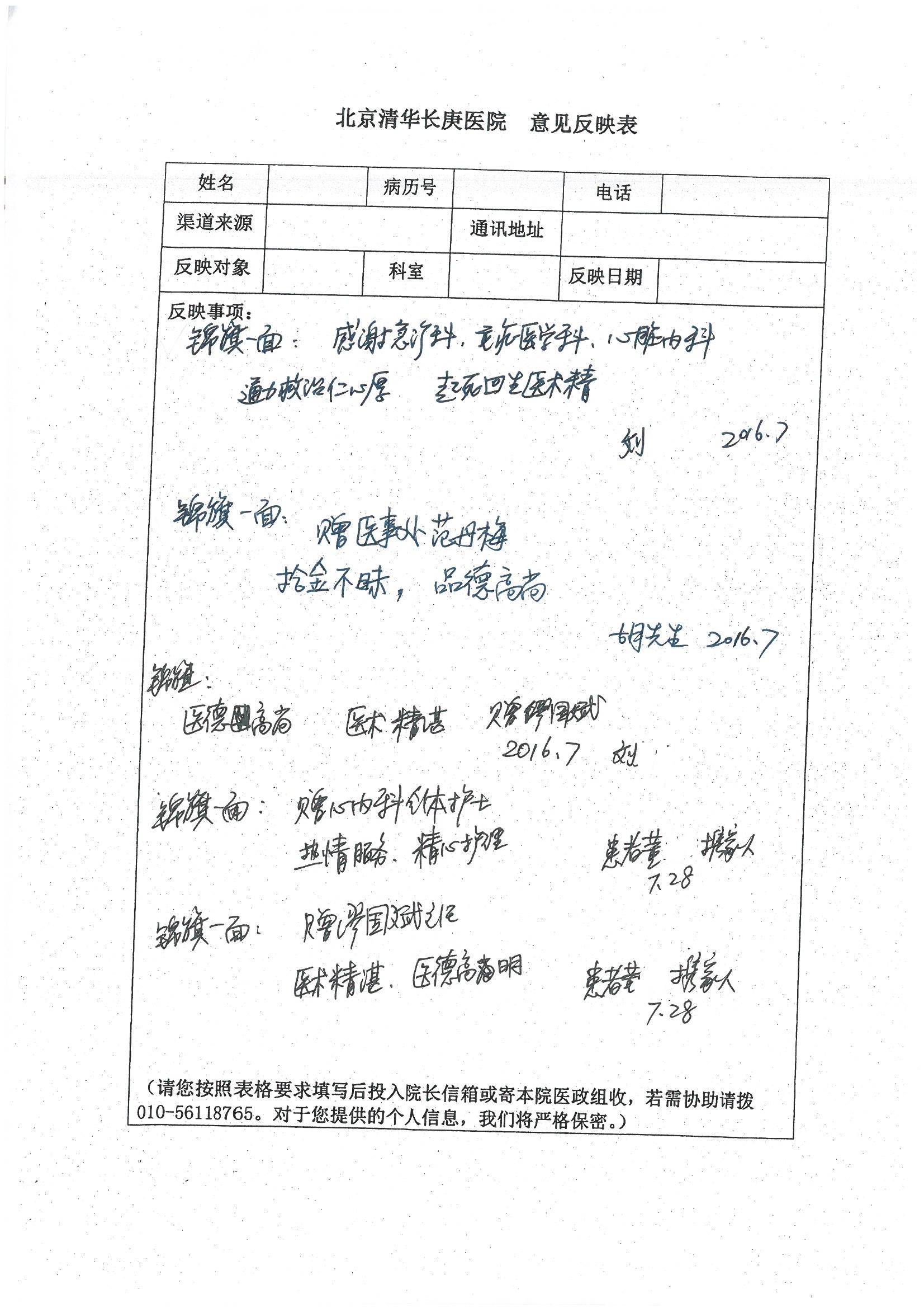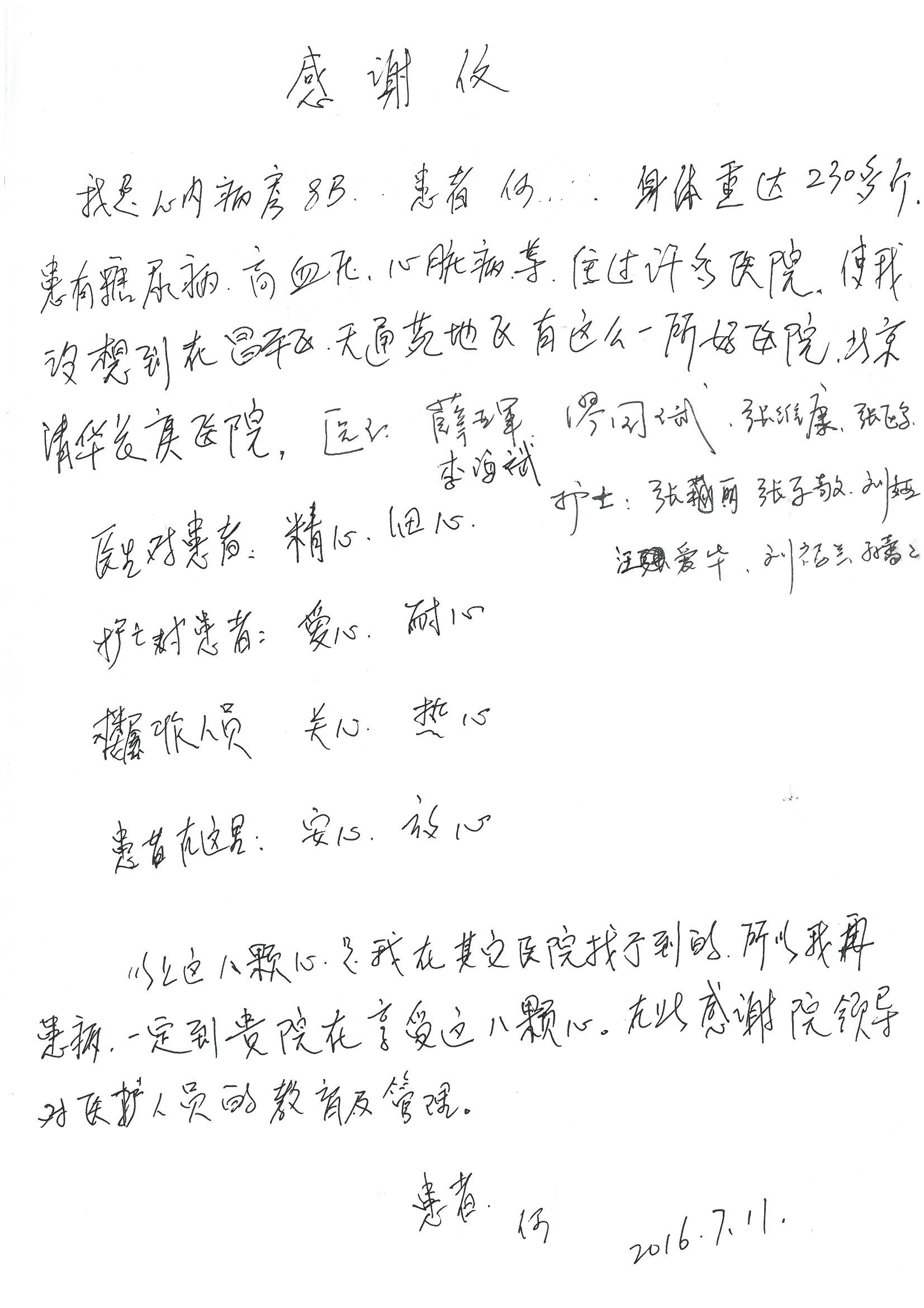 2016年7月,我院共接到患者及家属感谢信44封,其中神经外科王贵怀主任医师,普通外科刘伯涛主治医师,骨科肖嵩华主任医师、陈连旭副主任医师、宋飞主治医师、何大炜医师,血管外科吴巍巍副主任医师、赵克强主治医师、曹战江医师、赵俊来医师,泌尿外科李建兴主任医师、陈松副主任医师、胡卫国副主任医师、刘宇保医师,胸腔外科陈东红副主任医师、杨帆主治医师、朱伟鹏医师,麻醉科张欢主任医师、刘芳主治医师,心脏内科张萍主任医师、缪国斌副主任医师、薛亚军主治医师、张金萍主治医师、李海斌主治医师、张鸥医师、王科医师、张维康医师,呼吸内科王立万副主任医师、蔡存良主治医师、郭军主治医师、安宇林医师,神经内科刘效风医师,普通内科陈旭岩主任医师、冯莉莉主治医师、李妮医师,消化内科姜泊主任医师、相马宁主任医师、王佳主治医师、刘佳文主治医师、丁杰医师,妇产科张蕾副主任医师、黄振宇副主任医师、吕涛主治医师、杨曦主治医师,眼科胡运韬主任医师、刘瑄副主任医师、司山成医师,耳鼻喉科伊海金副主任医师、顼晋昆主治医师、许嘉医师,急诊科谢医生,放射科高雅旭,医事处张蕊、范丹梅,保卫处潘荣欢、许广辉、姚旭,护理部吴爽、武洪玥、王秋惠、张传云、朱浩、陈艳平、孟婷、魏月秀、周倩倩、尹雪、刘晶钰、许平平、杨旭东、叶露、张丽、张东敬、刘娅、汪爱华、刘福兰、孙蕾蕾、刘洋、吴婧倩、谢兰兰、谢娟娟、郑爽、邓聪、刘帅、侯多朵、胡春红以及心脏内科、急诊科、重症医学科全体医护人员,消化内科、7B病房、5A病房全体护理人员收到具名表扬。特此公告,以资鼓励!