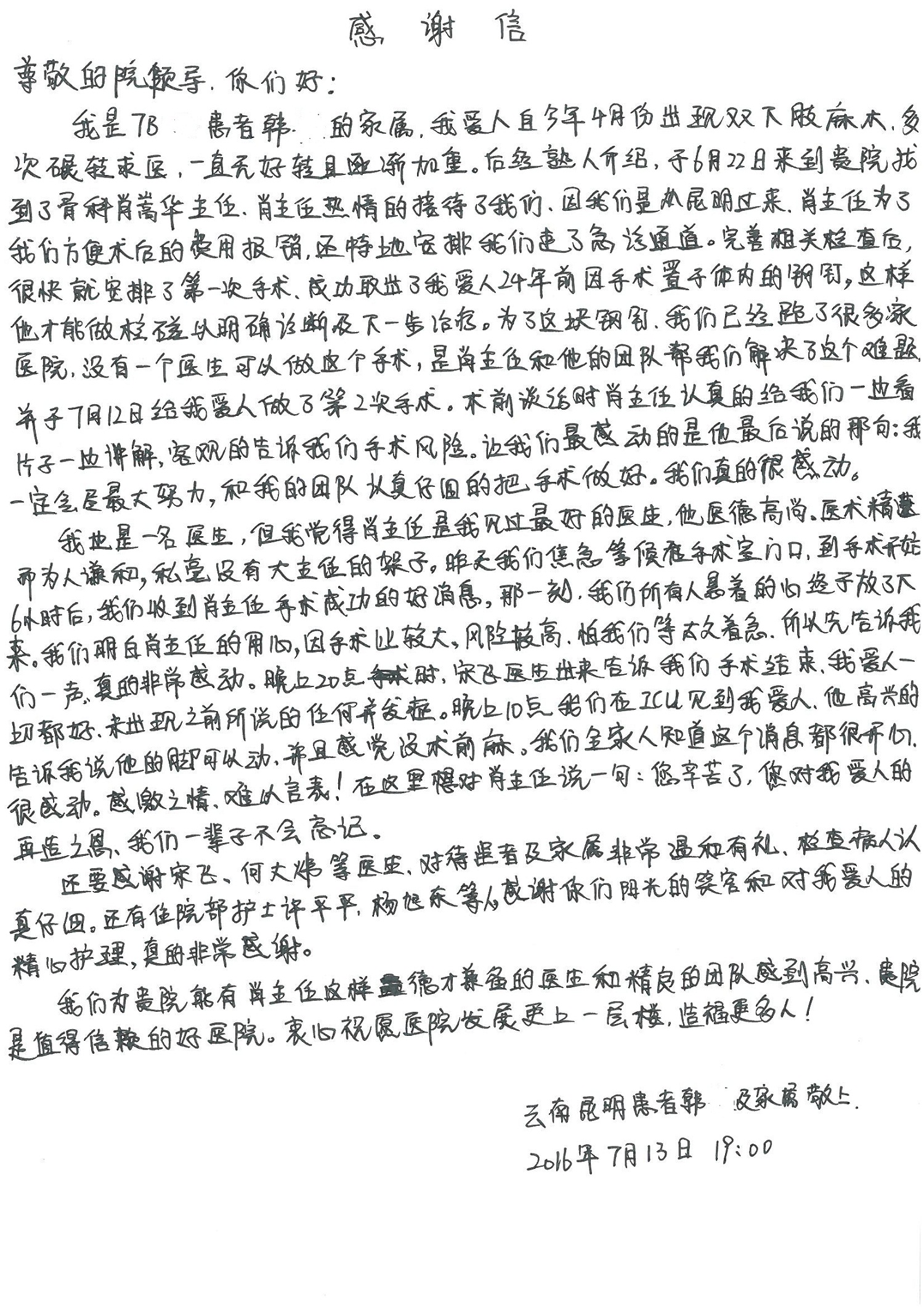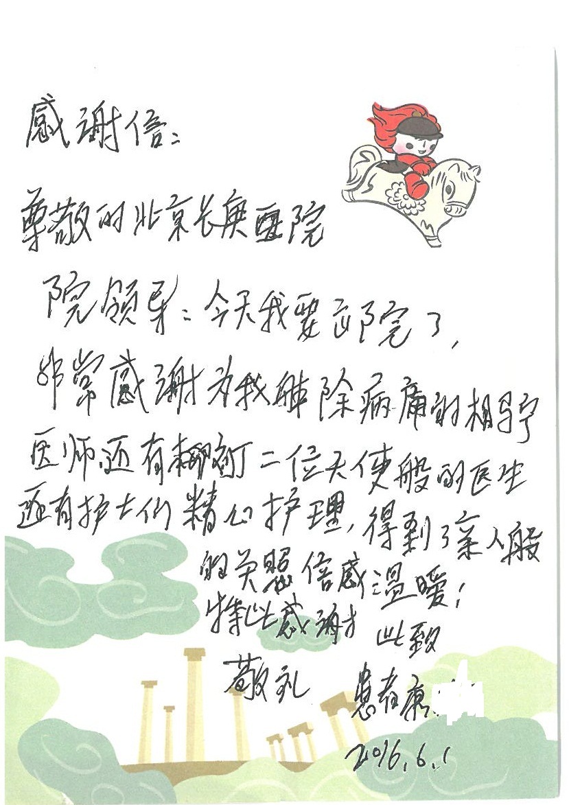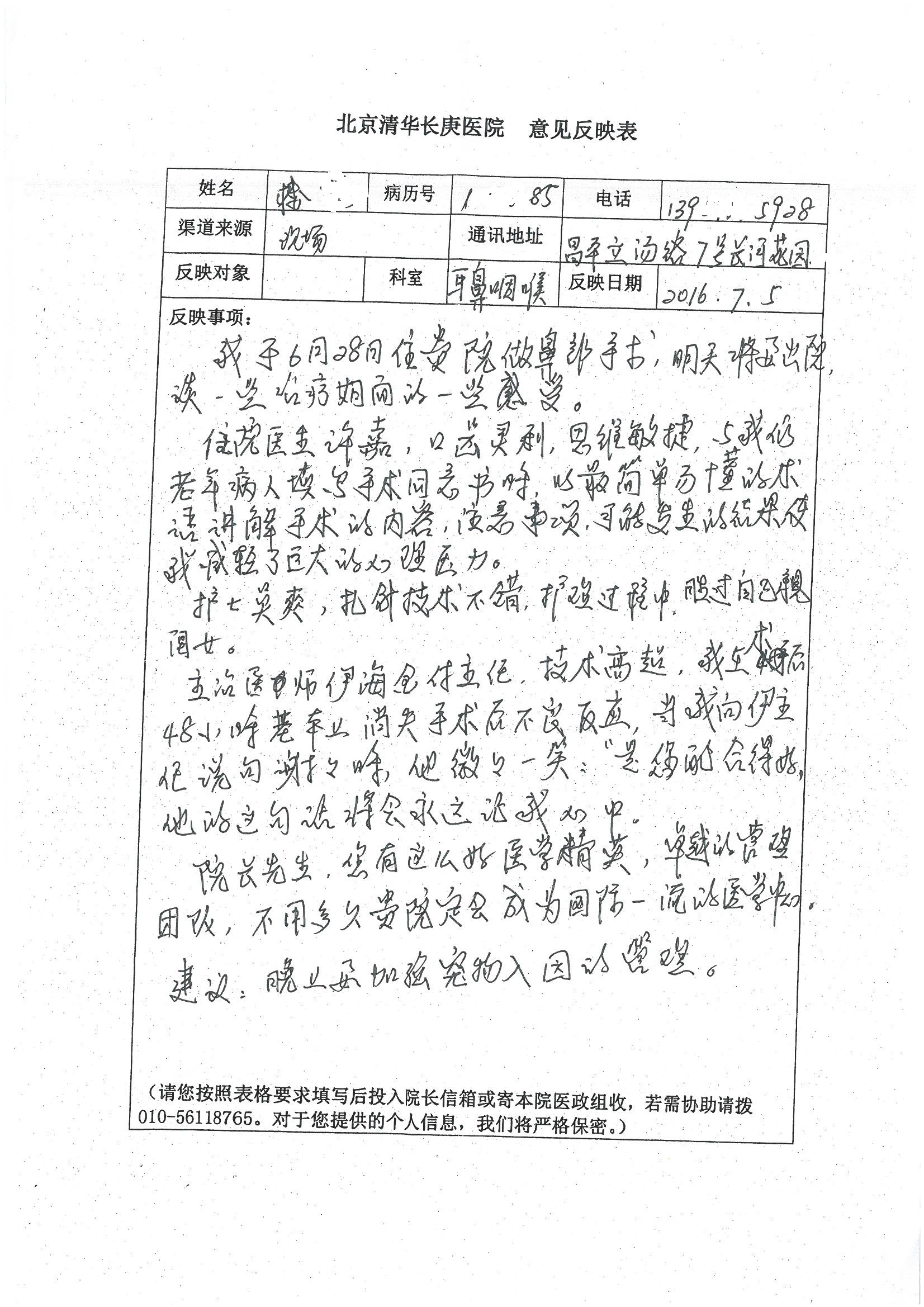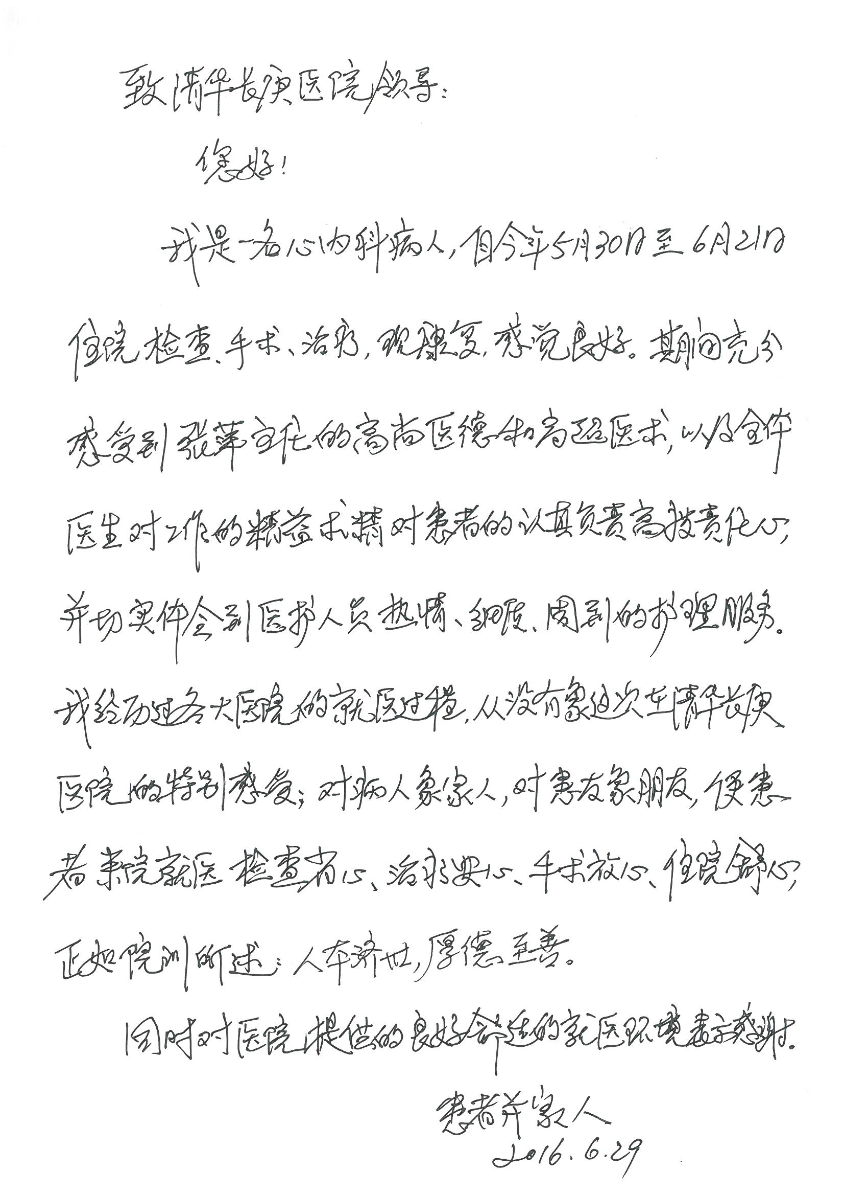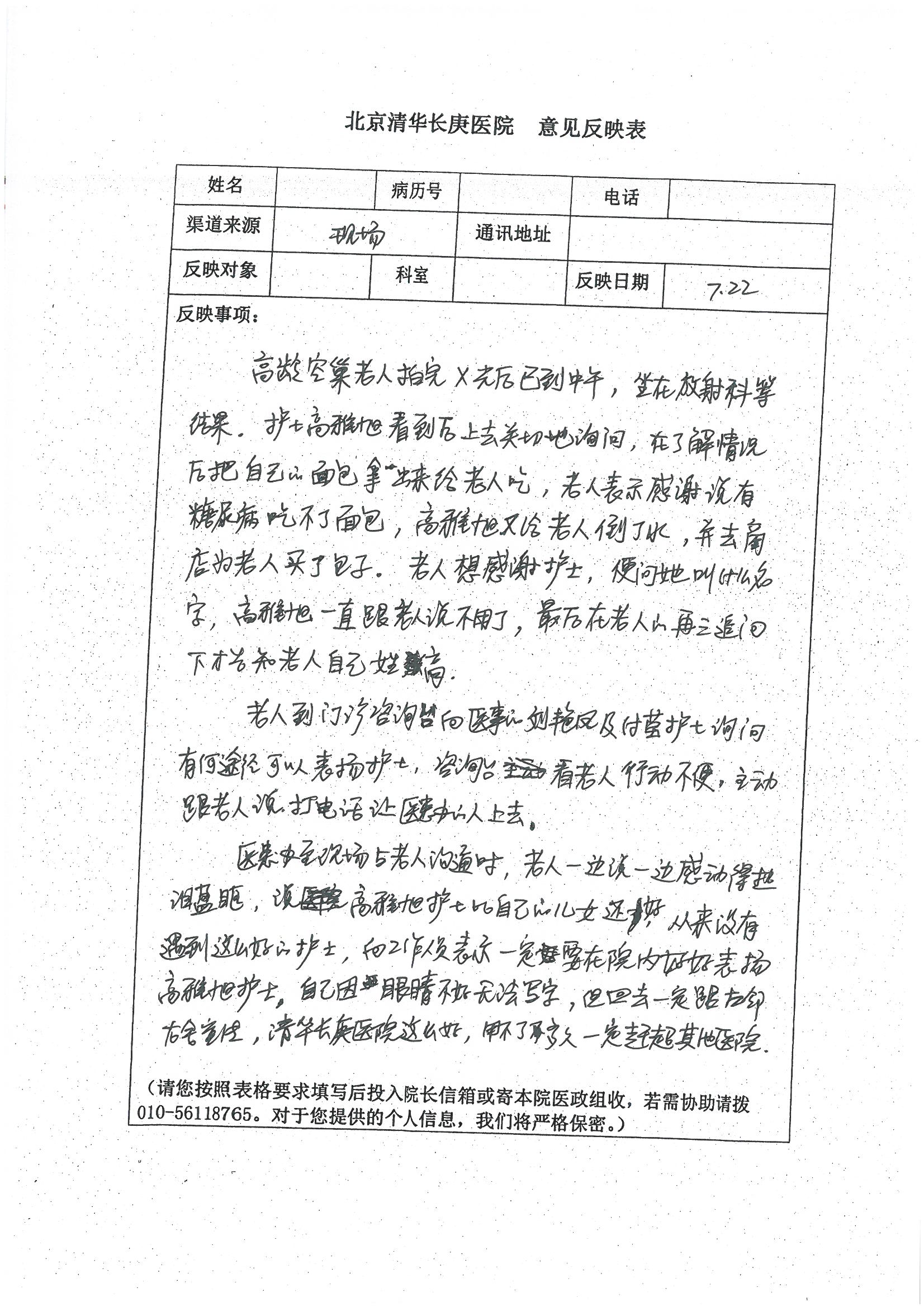 2016年7月,我院共接到患者及家属感谢信44封,其中神经外科王贵怀主任医师,普通外科刘伯涛主治医师,骨科肖嵩华主任医师、陈连旭副主任医师、宋飞主治医师、何大炜医师,血管外科吴巍巍副主任医师、赵克强主治医师、曹战江医师、赵俊来医师,泌尿外科李建兴主任医师、陈松副主任医师、胡卫国副主任医师、刘宇保医师,胸腔外科陈东红副主任医师、杨帆主治医师、朱伟鹏医师,麻醉科张欢主任医师、刘芳主治医师,心脏内科张萍主任医师、缪国斌副主任医师、薛亚军主治医师、张金萍主治医师、李海斌主治医师、张鸥医师、王科医师、张维康医师,呼吸内科王立万副主任医师、蔡存良主治医师、郭军主治医师、安宇林医师,神经内科刘效风医师,普通内科陈旭岩主任医师、冯莉莉主治医师、李妮医师,消化内科姜泊主任医师、相马宁主任医师、王佳主治医师、刘佳文主治医师、丁杰医师,妇产科张蕾副主任医师、黄振宇副主任医师、吕涛主治医师、杨曦主治医师,眼科胡运韬主任医师、刘瑄副主任医师、司山成医师,耳鼻喉科伊海金副主任医师、顼晋昆主治医师、许嘉医师,急诊科谢医生,放射科高雅旭,医事处张蕊、范丹梅,保卫处潘荣欢、许广辉、姚旭,护理部吴爽、武洪玥、王秋惠、张传云、朱浩、陈艳平、孟婷、魏月秀、周倩倩、尹雪、刘晶钰、许平平、杨旭东、叶露、张丽、张东敬、刘娅、汪爱华、刘福兰、孙蕾蕾、刘洋、吴婧倩、谢兰兰、谢娟娟、郑爽、邓聪、刘帅、侯多朵、胡春红以及心脏内科、急诊科、重症医学科全体医护人员,消化内科、7B病房、5A病房全体护理人员收到具名表扬。特此公告,以资鼓励!