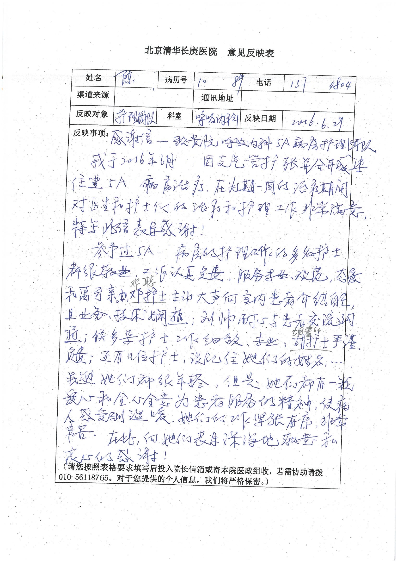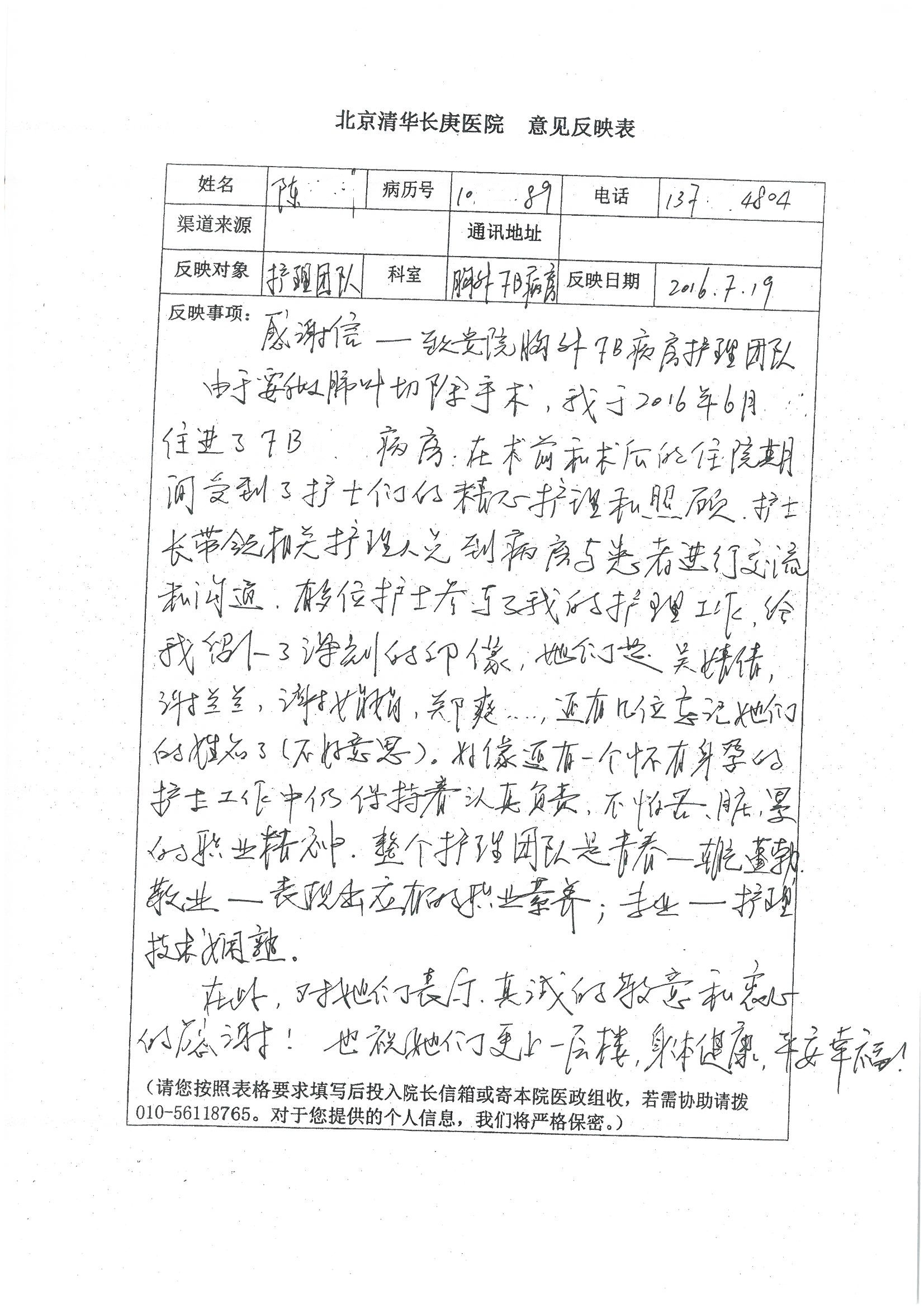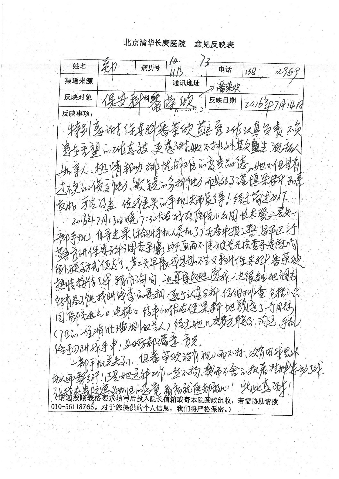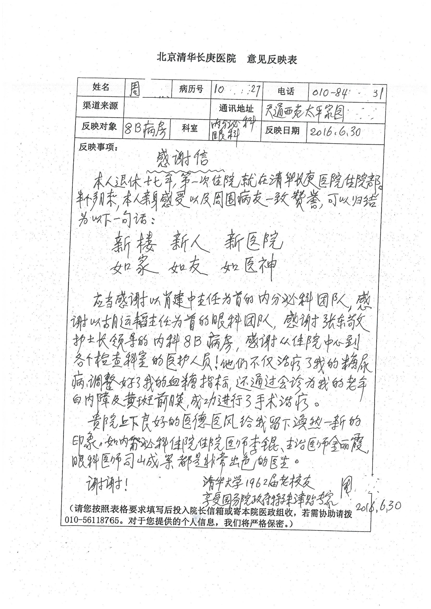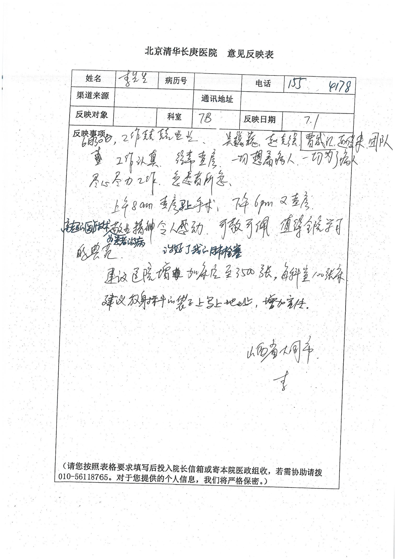 2016年7月,我院共接到患者及家属感谢信44封,其中神经外科王贵怀主任医师,普通外科刘伯涛主治医师,骨科肖嵩华主任医师、陈连旭副主任医师、宋飞主治医师、何大炜医师,血管外科吴巍巍副主任医师、赵克强主治医师、曹战江医师、赵俊来医师,泌尿外科李建兴主任医师、陈松副主任医师、胡卫国副主任医师、刘宇保医师,胸腔外科陈东红副主任医师、杨帆主治医师、朱伟鹏医师,麻醉科张欢主任医师、刘芳主治医师,心脏内科张萍主任医师、缪国斌副主任医师、薛亚军主治医师、张金萍主治医师、李海斌主治医师、张鸥医师、王科医师、张维康医师,呼吸内科王立万副主任医师、蔡存良主治医师、郭军主治医师、安宇林医师,神经内科刘效风医师,普通内科陈旭岩主任医师、冯莉莉主治医师、李妮医师,消化内科姜泊主任医师、相马宁主任医师、王佳主治医师、刘佳文主治医师、丁杰医师,妇产科张蕾副主任医师、黄振宇副主任医师、吕涛主治医师、杨曦主治医师,眼科胡运韬主任医师、刘瑄副主任医师、司山成医师,耳鼻喉科伊海金副主任医师、顼晋昆主治医师、许嘉医师,急诊科谢医生,放射科高雅旭,医事处张蕊、范丹梅,保卫处潘荣欢、许广辉、姚旭,护理部吴爽、武洪玥、王秋惠、张传云、朱浩、陈艳平、孟婷、魏月秀、周倩倩、尹雪、刘晶钰、许平平、杨旭东、叶露、张丽、张东敬、刘娅、汪爱华、刘福兰、孙蕾蕾、刘洋、吴婧倩、谢兰兰、谢娟娟、郑爽、邓聪、刘帅、侯多朵、胡春红以及心脏内科、急诊科、重症医学科全体医护人员,消化内科、7B病房、5A病房全体护理人员收到具名表扬。特此公告,以资鼓励!