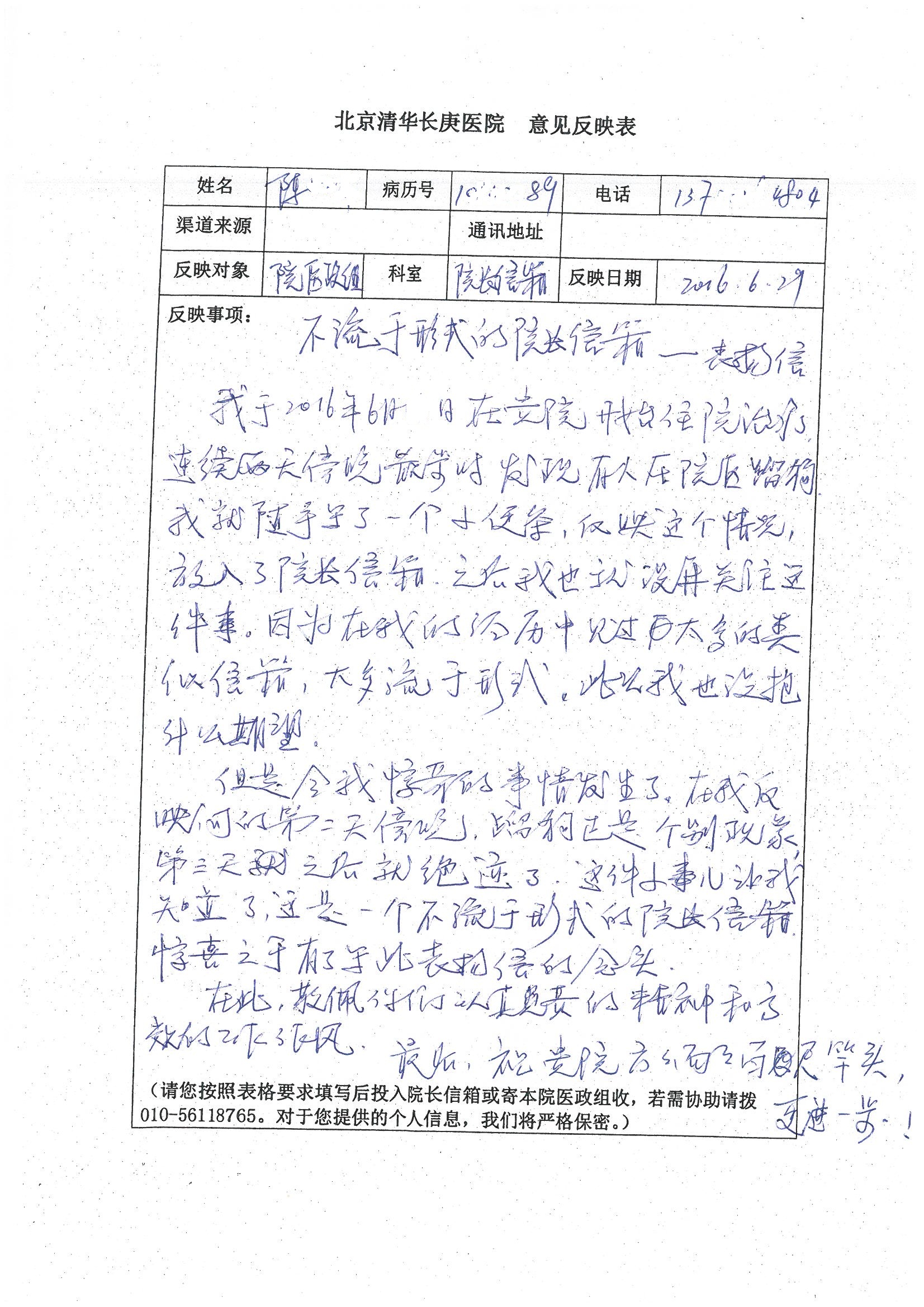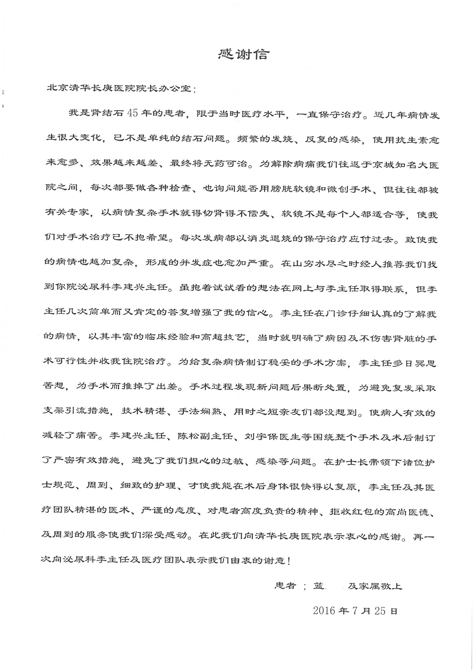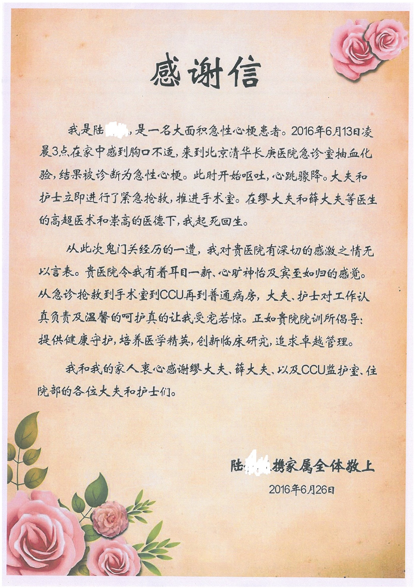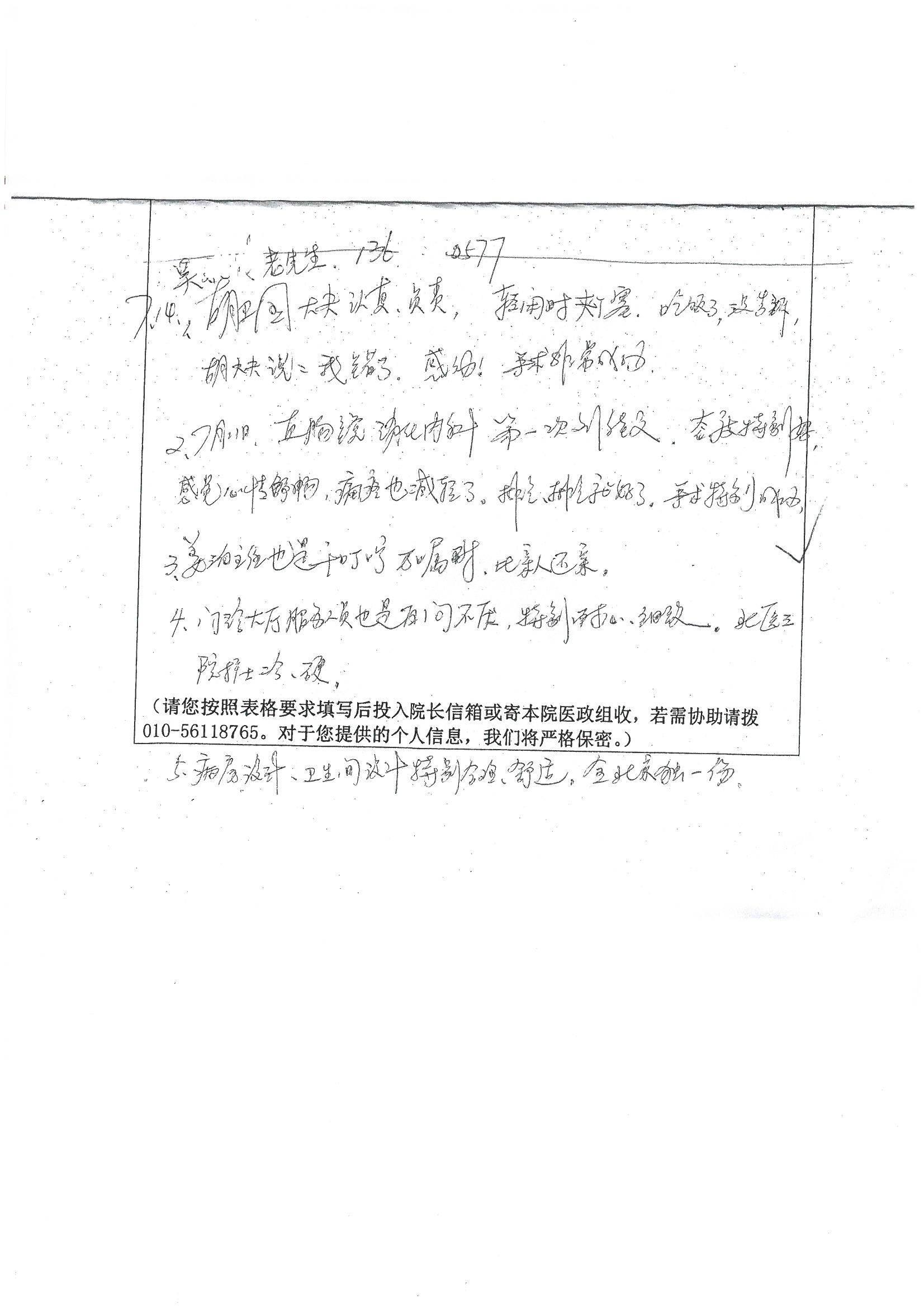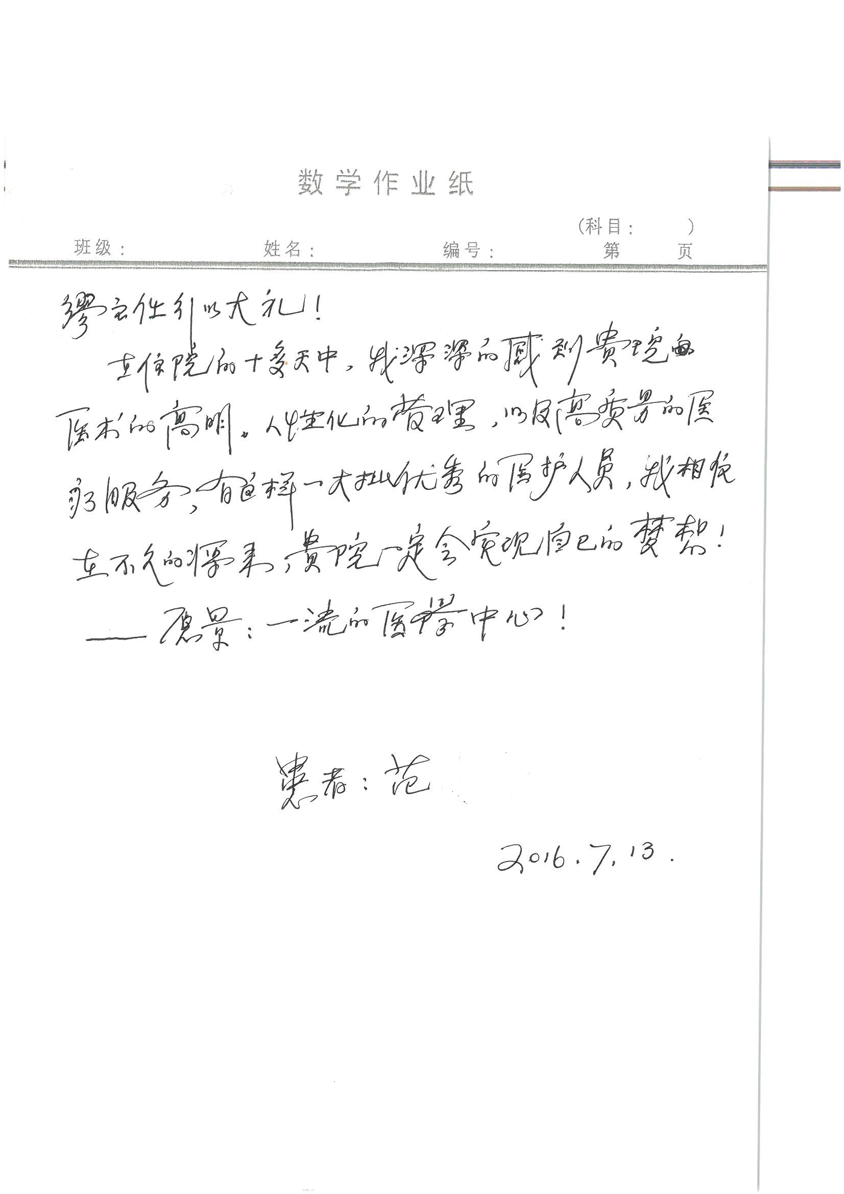 2016年7月,我院共接到患者及家属感谢信44封,其中神经外科王贵怀主任医师,普通外科刘伯涛主治医师,骨科肖嵩华主任医师、陈连旭副主任医师、宋飞主治医师、何大炜医师,血管外科吴巍巍副主任医师、赵克强主治医师、曹战江医师、赵俊来医师,泌尿外科李建兴主任医师、陈松副主任医师、胡卫国副主任医师、刘宇保医师,胸腔外科陈东红副主任医师、杨帆主治医师、朱伟鹏医师,麻醉科张欢主任医师、刘芳主治医师,心脏内科张萍主任医师、缪国斌副主任医师、薛亚军主治医师、张金萍主治医师、李海斌主治医师、张鸥医师、王科医师、张维康医师,呼吸内科王立万副主任医师、蔡存良主治医师、郭军主治医师、安宇林医师,神经内科刘效风医师,普通内科陈旭岩主任医师、冯莉莉主治医师、李妮医师,消化内科姜泊主任医师、相马宁主任医师、王佳主治医师、刘佳文主治医师、丁杰医师,妇产科张蕾副主任医师、黄振宇副主任医师、吕涛主治医师、杨曦主治医师,眼科胡运韬主任医师、刘瑄副主任医师、司山成医师,耳鼻喉科伊海金副主任医师、顼晋昆主治医师、许嘉医师,急诊科谢医生,放射科高雅旭,医事处张蕊、范丹梅,保卫处潘荣欢、许广辉、姚旭,护理部吴爽、武洪玥、王秋惠、张传云、朱浩、陈艳平、孟婷、魏月秀、周倩倩、尹雪、刘晶钰、许平平、杨旭东、叶露、张丽、张东敬、刘娅、汪爱华、刘福兰、孙蕾蕾、刘洋、吴婧倩、谢兰兰、谢娟娟、郑爽、邓聪、刘帅、侯多朵、胡春红以及心脏内科、急诊科、重症医学科全体医护人员,消化内科、7B病房、5A病房全体护理人员收到具名表扬。特此公告,以资鼓励!