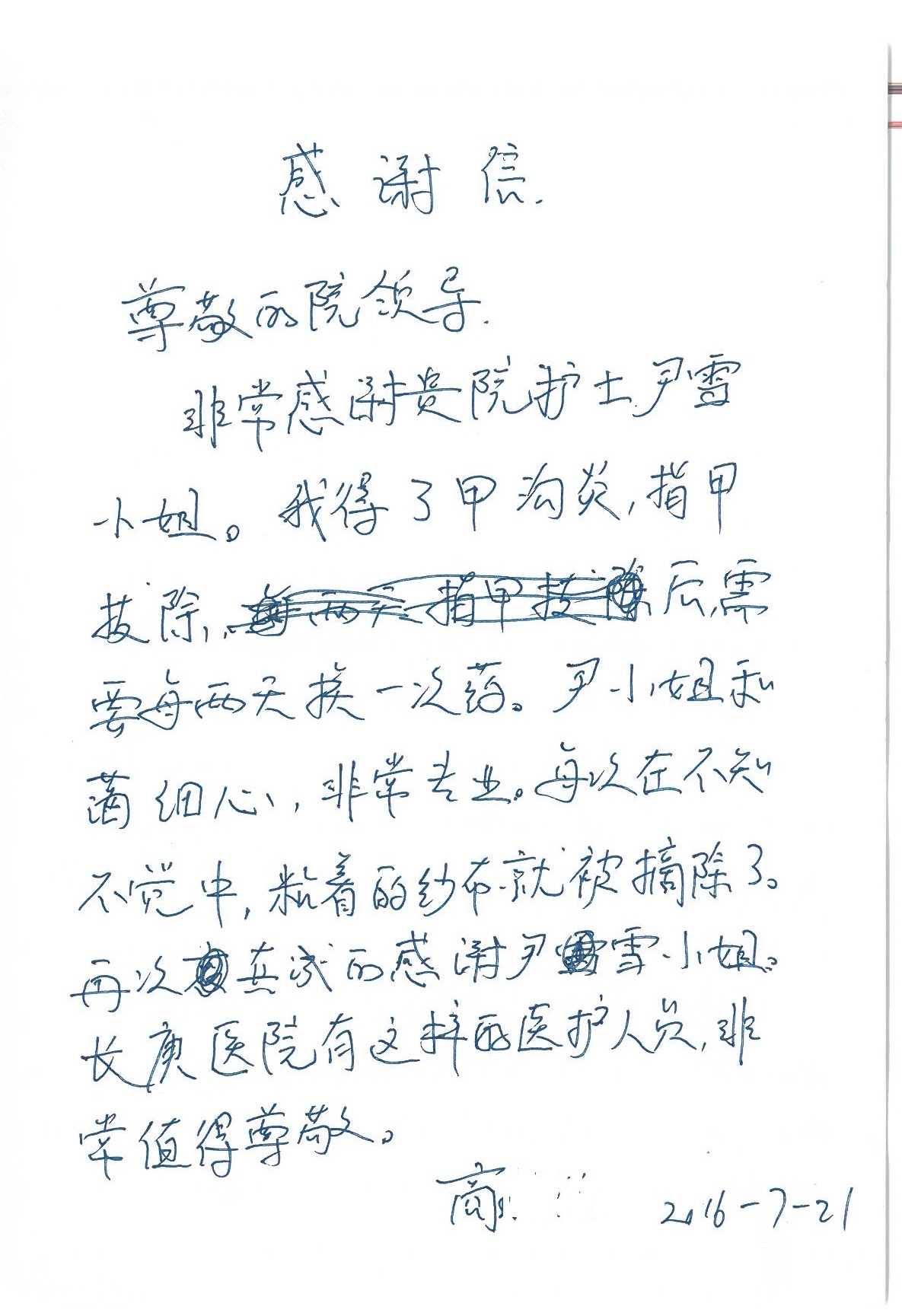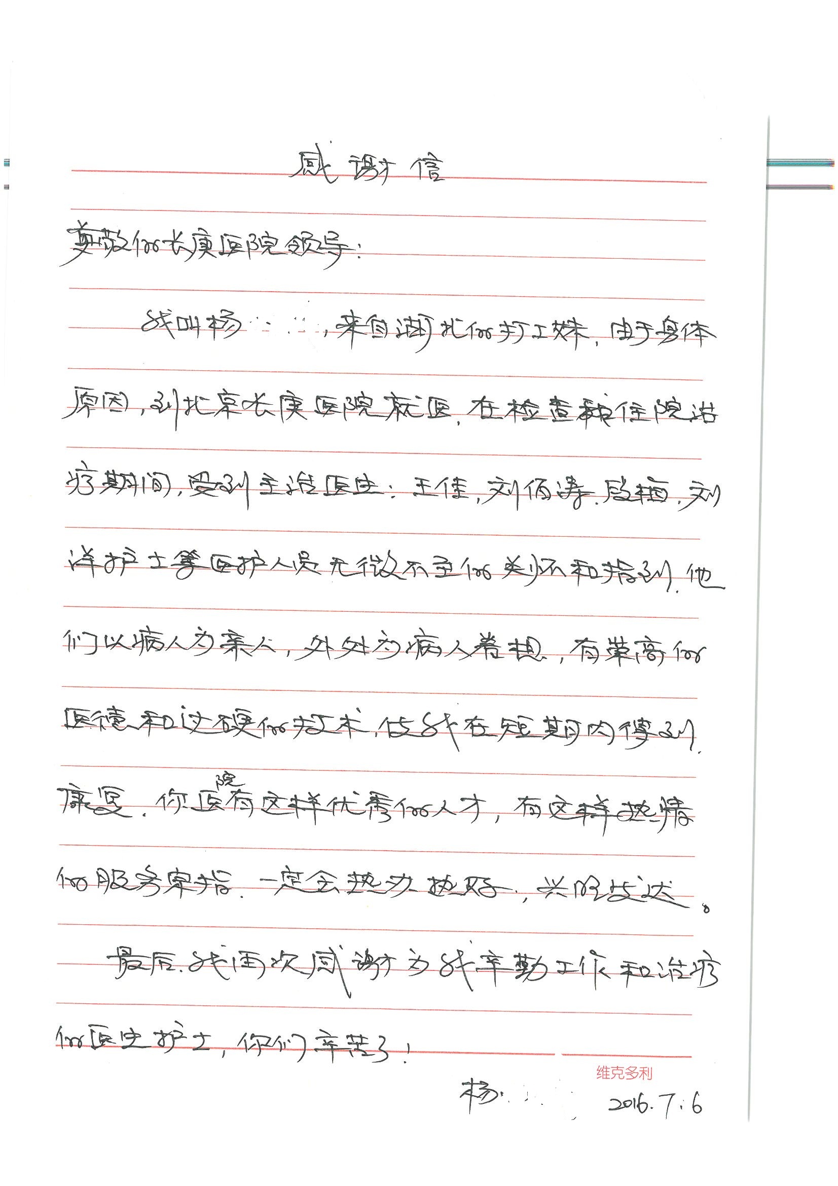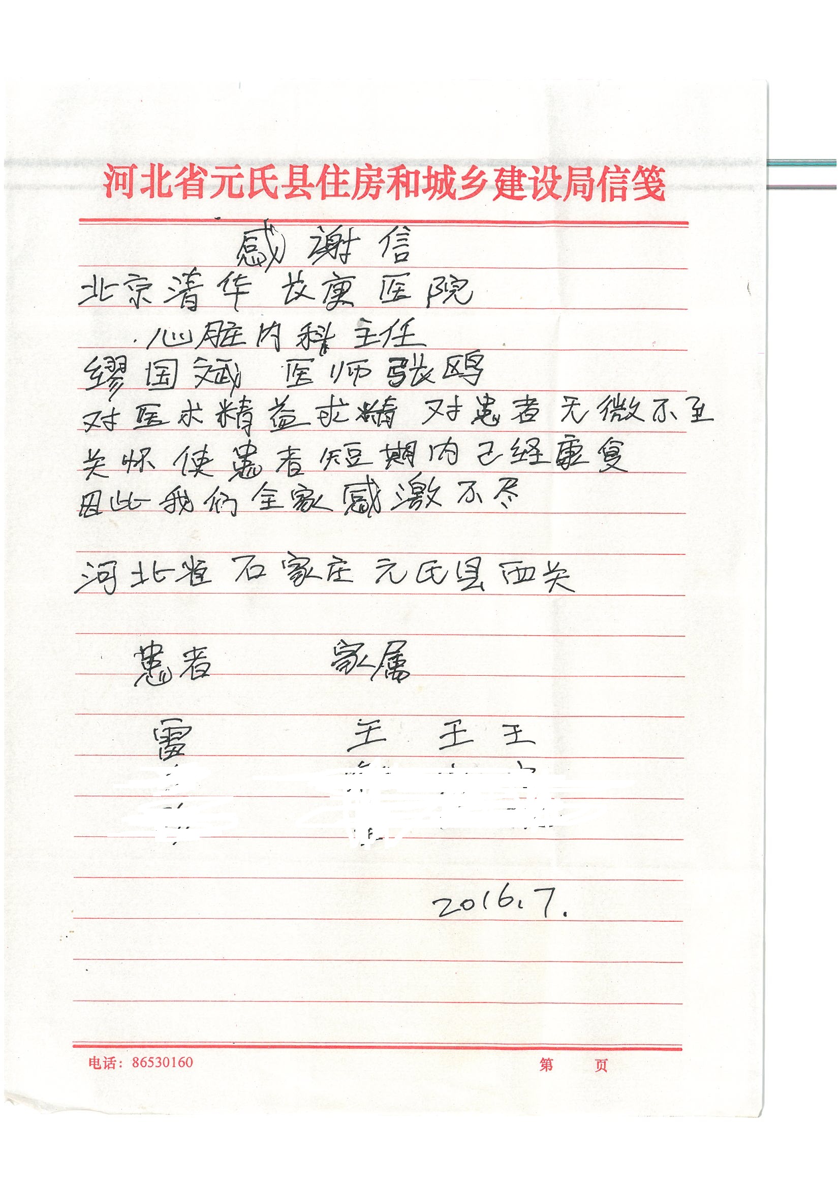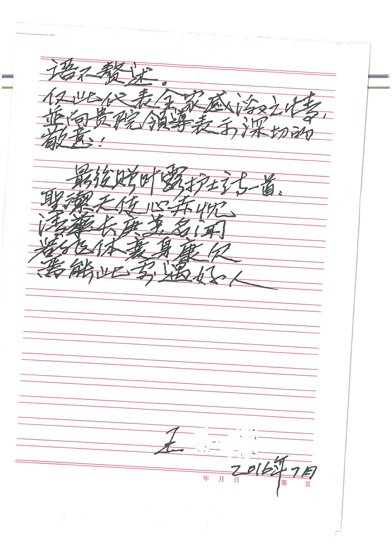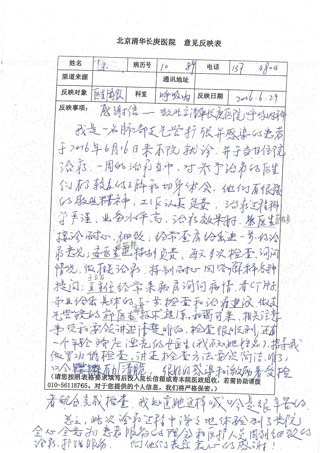 2016年7月,我院共接到患者及家属感谢信44封,其中神经外科王贵怀主任医师,普通外科刘伯涛主治医师,骨科肖嵩华主任医师、陈连旭副主任医师、宋飞主治医师、何大炜医师,血管外科吴巍巍副主任医师、赵克强主治医师、曹战江医师、赵俊来医师,泌尿外科李建兴主任医师、陈松副主任医师、胡卫国副主任医师、刘宇保医师,胸腔外科陈东红副主任医师、杨帆主治医师、朱伟鹏医师,麻醉科张欢主任医师、刘芳主治医师,心脏内科张萍主任医师、缪国斌副主任医师、薛亚军主治医师、张金萍主治医师、李海斌主治医师、张鸥医师、王科医师、张维康医师,呼吸内科王立万副主任医师、蔡存良主治医师、郭军主治医师、安宇林医师,神经内科刘效风医师,普通内科陈旭岩主任医师、冯莉莉主治医师、李妮医师,消化内科姜泊主任医师、相马宁主任医师、王佳主治医师、刘佳文主治医师、丁杰医师,妇产科张蕾副主任医师、黄振宇副主任医师、吕涛主治医师、杨曦主治医师,眼科胡运韬主任医师、刘瑄副主任医师、司山成医师,耳鼻喉科伊海金副主任医师、顼晋昆主治医师、许嘉医师,急诊科谢医生,放射科高雅旭,医事处张蕊、范丹梅,保卫处潘荣欢、许广辉、姚旭,护理部吴爽、武洪玥、王秋惠、张传云、朱浩、陈艳平、孟婷、魏月秀、周倩倩、尹雪、刘晶钰、许平平、杨旭东、叶露、张丽、张东敬、刘娅、汪爱华、刘福兰、孙蕾蕾、刘洋、吴婧倩、谢兰兰、谢娟娟、郑爽、邓聪、刘帅、侯多朵、胡春红以及心脏内科、急诊科、重症医学科全体医护人员,消化内科、7B病房、5A病房全体护理人员收到具名表扬。特此公告,以资鼓励!