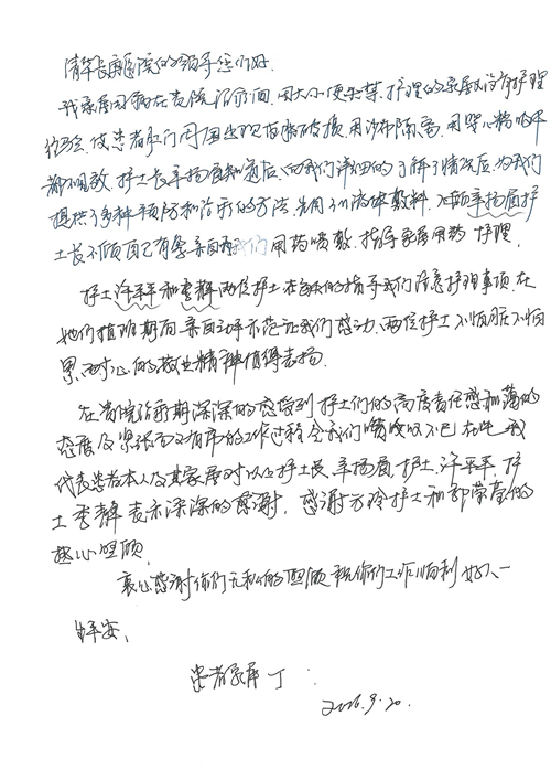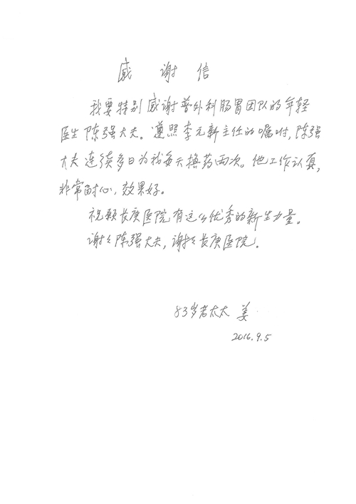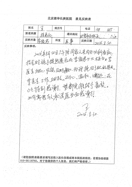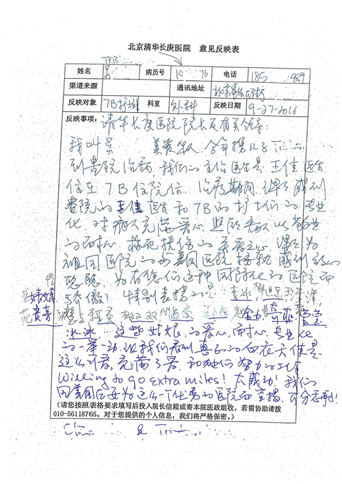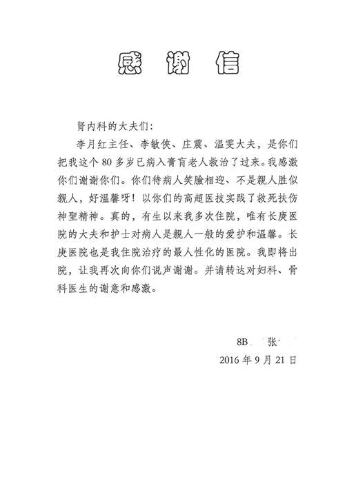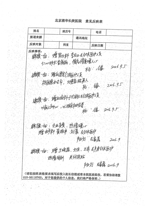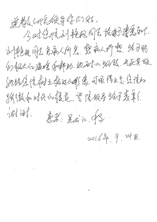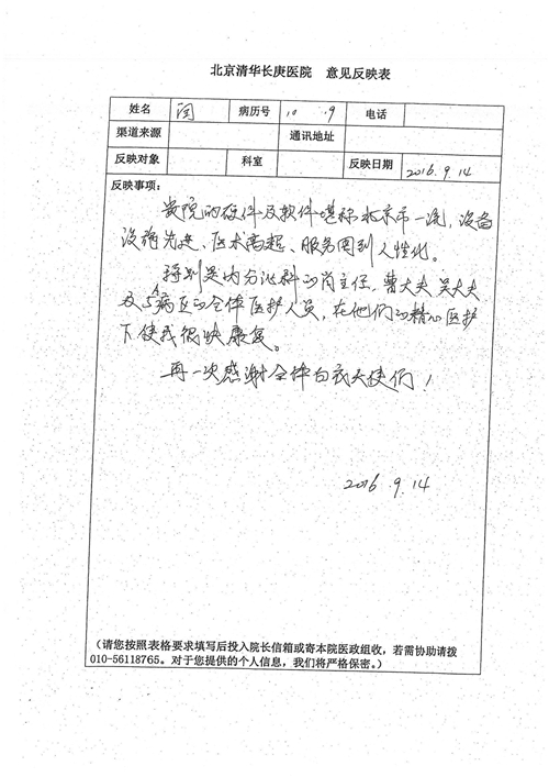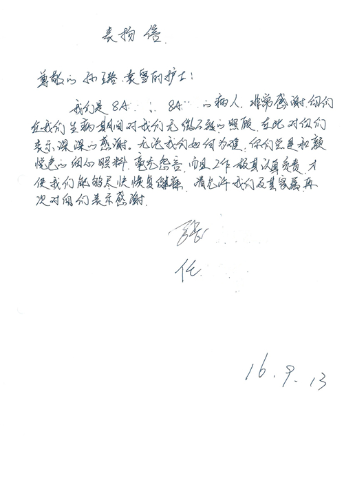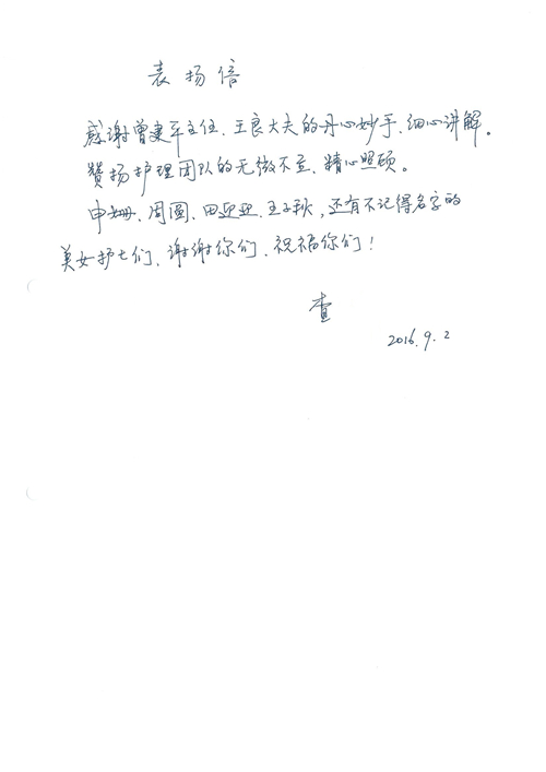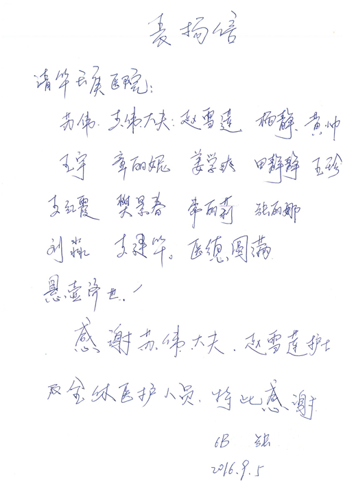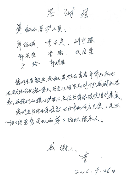 2016年9月,我院共接到患者及家属感谢信61封,其中肝胆外科董家鸿主任医师、项灿宏副主任医师、曾建平主治医师、公磊医师、王良医师,神经外科王贵怀主任医师、苏伟主治医师、李伟医师、杨世伟医师,普通外科罗斌主任医师、李元新主任医师、张鹏主治医师、陈强医师,骨科肖嵩华主任医师、何大炜医师,血管外科吴巍巍副主任医师、朱融融医师,泌尿外科胡卫国副主任医师,麻醉科赵艳军主治医师,心脏内科张萍主任医师、缪国斌主任医师、刘芳副主任医师、何榕副主任医师、张金萍医师、王昊天医师,神经内科冯新红主治医师、杨亭亭医师、王也医师,肾脏内科李月红主任医师、王炜主治医师、庄震主治医师、李敏侠主治医师、吕佳璇医师、温雯医师,消化内科相马宁主任医师、刘佳文主治医师、王佳主治医师,血液内科于凡主治医师,妇产科廖秦平主任医师、黄振宇副主任医师、赵秀莲副主任医师、刘晨副主任医师、吕涛主治医师、罗恋梅主治医师、马珂主治医师、陈瑞医师、王晓茜医师、文佳医师、王奔医师,康复科吴琼医师、陈固稳,内分泌科肖建中主任医师、曹沉香主治医师、吴琛医师,中医科刘承主治医师,ICU谢志毅副主任医师,医事处陈秀杰、沈晓梅、刘艳凤、李俊男,医政组张立东、赵晓兰,护理部赵萌、赵雪莲、杨静、黄帅、王宇、张丽妮、姜学爽、田静静、李红霞、樊景春、常里里、张丽娜、刘淼、李建华、李亚灵、方玲、张慧文、谢兰兰、许平平、曹奇菲、杜双双、袁雪丽、孙璐、申姗、周圆、田迎迎、王子秋、王英华、曾朋、刘帅、何亚惠、张庆庆、宋辉辉、袁雪、潘晓婷、史玉静、尹雪、曲姗姗、王颖莹、杨旭东、张慧、张坤、刘宇琛、辛扬眉、季静、郭莹莹、李冰、代海栾、郭婧倩、于洋洋、黄婧倩、苑贵芳、郑爽、赵金力以及肝胆外科、ICU、急诊科、心脏内科、妇产科、骨科、血液内科、肾脏内科、血透室、儿科、5A全体医护人员,呼吸内科、门诊治疗室、8A全体护理人员收到具名表扬。特此公告,以资鼓励!