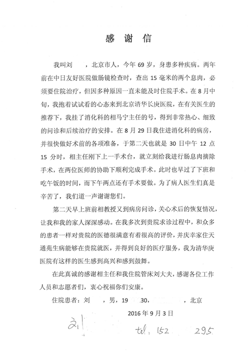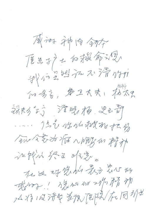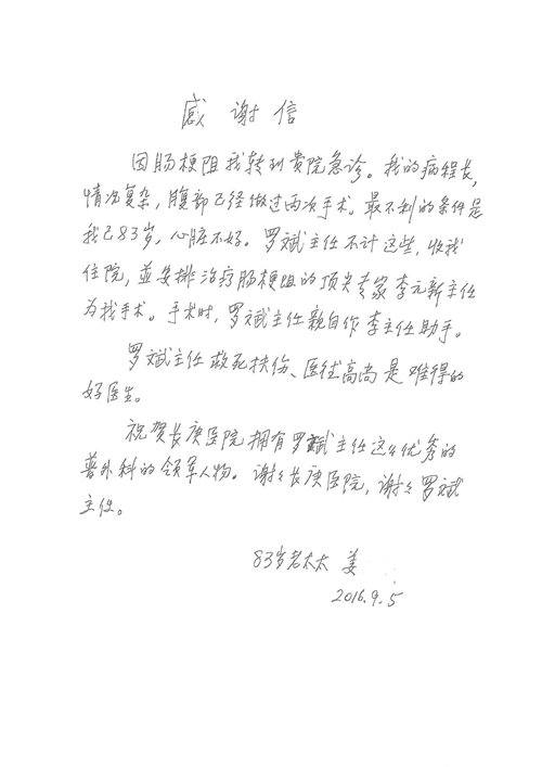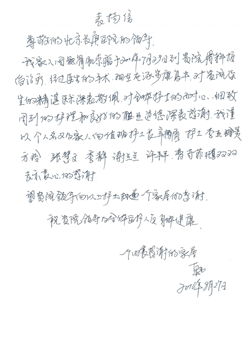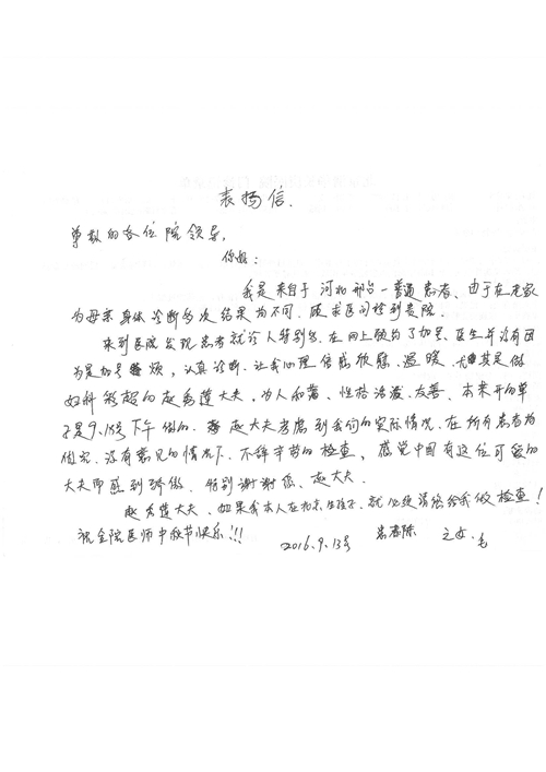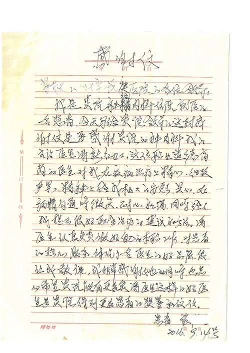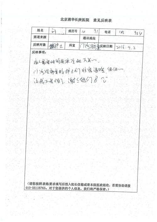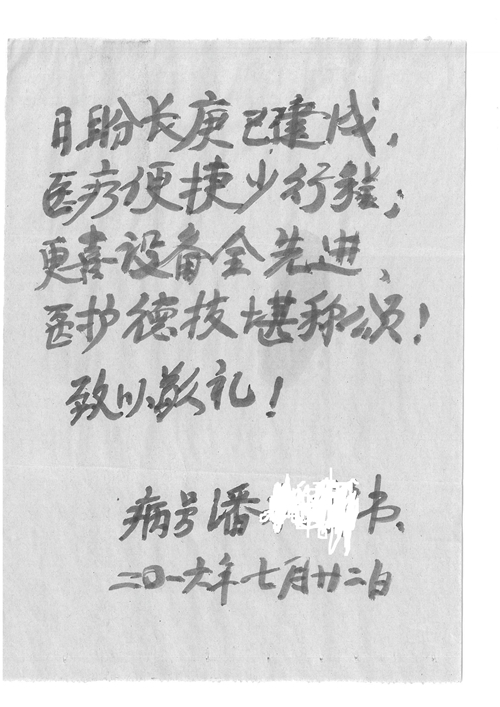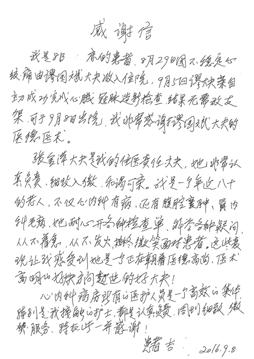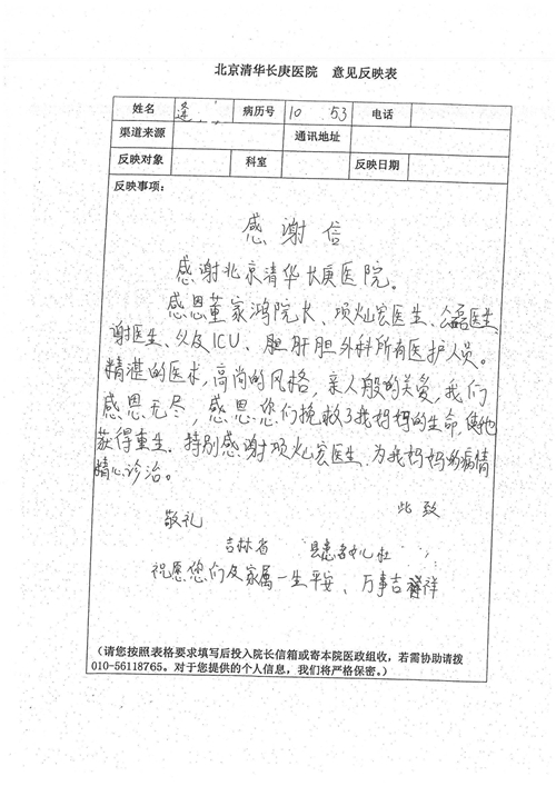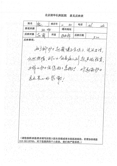 2016年9月,我院共接到患者及家属感谢信61封,其中肝胆外科董家鸿主任医师、项灿宏副主任医师、曾建平主治医师、公磊医师、王良医师,神经外科王贵怀主任医师、苏伟主治医师、李伟医师、杨世伟医师,普通外科罗斌主任医师、李元新主任医师、张鹏主治医师、陈强医师,骨科肖嵩华主任医师、何大炜医师,血管外科吴巍巍副主任医师、朱融融医师,泌尿外科胡卫国副主任医师,麻醉科赵艳军主治医师,心脏内科张萍主任医师、缪国斌主任医师、刘芳副主任医师、何榕副主任医师、张金萍医师、王昊天医师,神经内科冯新红主治医师、杨亭亭医师、王也医师,肾脏内科李月红主任医师、王炜主治医师、庄震主治医师、李敏侠主治医师、吕佳璇医师、温雯医师,消化内科相马宁主任医师、刘佳文主治医师、王佳主治医师,血液内科于凡主治医师,妇产科廖秦平主任医师、黄振宇副主任医师、赵秀莲副主任医师、刘晨副主任医师、吕涛主治医师、罗恋梅主治医师、马珂主治医师、陈瑞医师、王晓茜医师、文佳医师、王奔医师,康复科吴琼医师、陈固稳,内分泌科肖建中主任医师、曹沉香主治医师、吴琛医师,中医科刘承主治医师,ICU谢志毅副主任医师,医事处陈秀杰、沈晓梅、刘艳凤、李俊男,医政组张立东、赵晓兰,护理部赵萌、赵雪莲、杨静、黄帅、王宇、张丽妮、姜学爽、田静静、李红霞、樊景春、常里里、张丽娜、刘淼、李建华、李亚灵、方玲、张慧文、谢兰兰、许平平、曹奇菲、杜双双、袁雪丽、孙璐、申姗、周圆、田迎迎、王子秋、王英华、曾朋、刘帅、何亚惠、张庆庆、宋辉辉、袁雪、潘晓婷、史玉静、尹雪、曲姗姗、王颖莹、杨旭东、张慧、张坤、刘宇琛、辛扬眉、季静、郭莹莹、李冰、代海栾、郭婧倩、于洋洋、黄婧倩、苑贵芳、郑爽、赵金力以及肝胆外科、ICU、急诊科、心脏内科、妇产科、骨科、血液内科、肾脏内科、血透室、儿科、5A全体医护人员,呼吸内科、门诊治疗室、8A全体护理人员收到具名表扬。特此公告,以资鼓励!