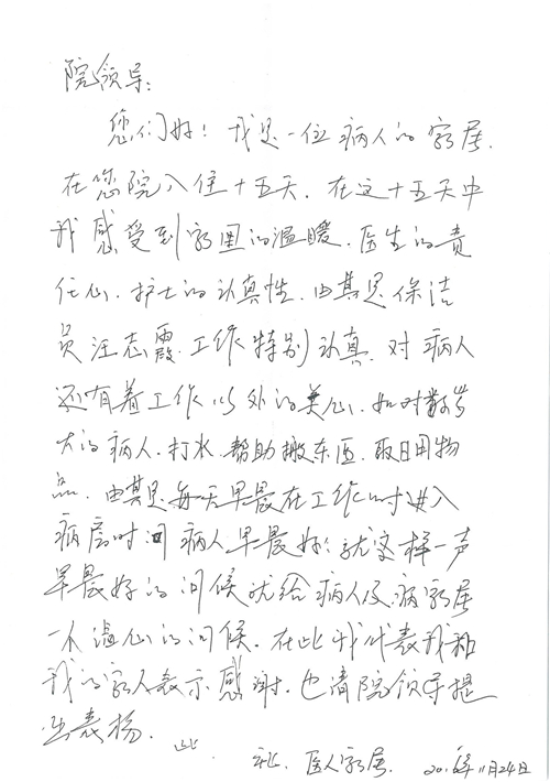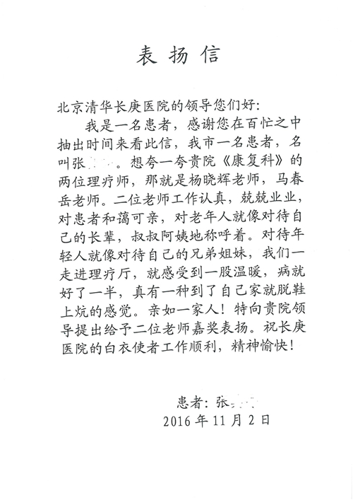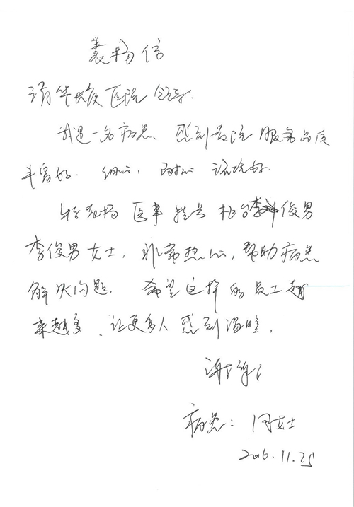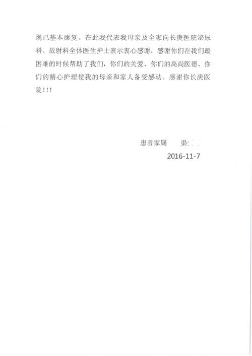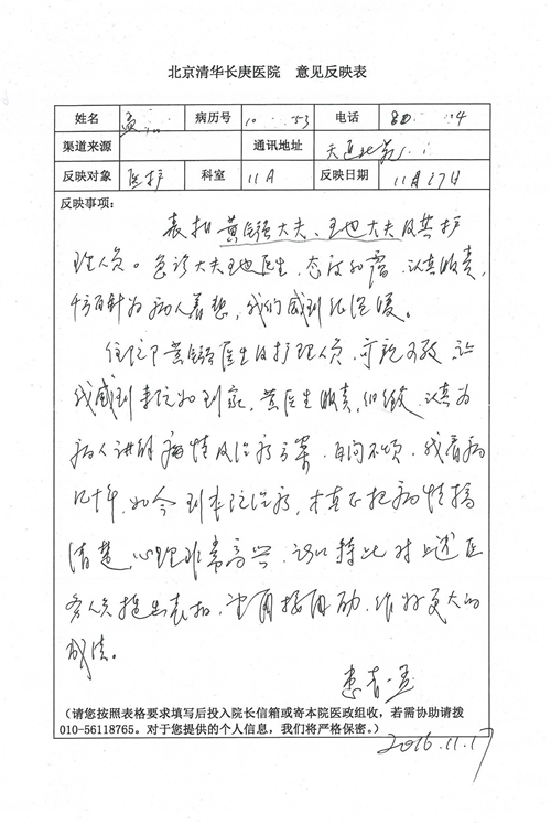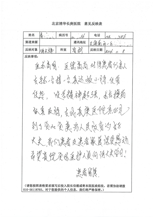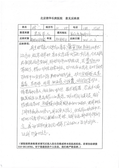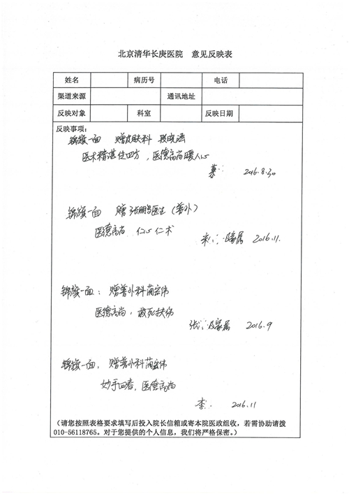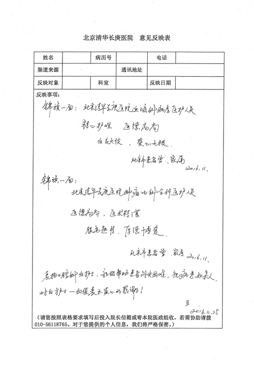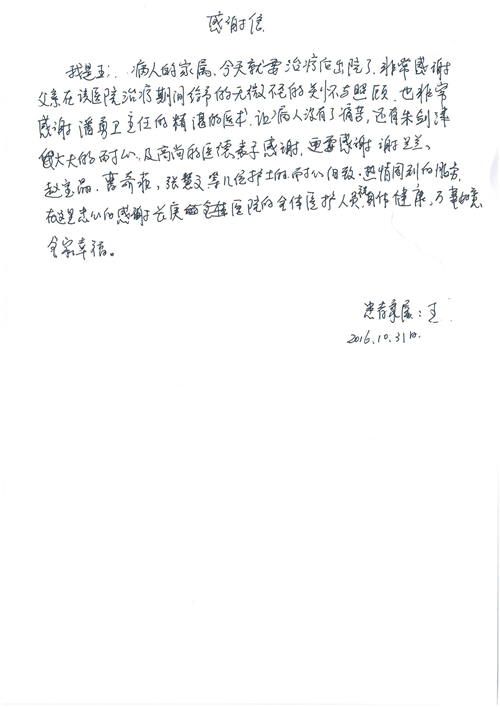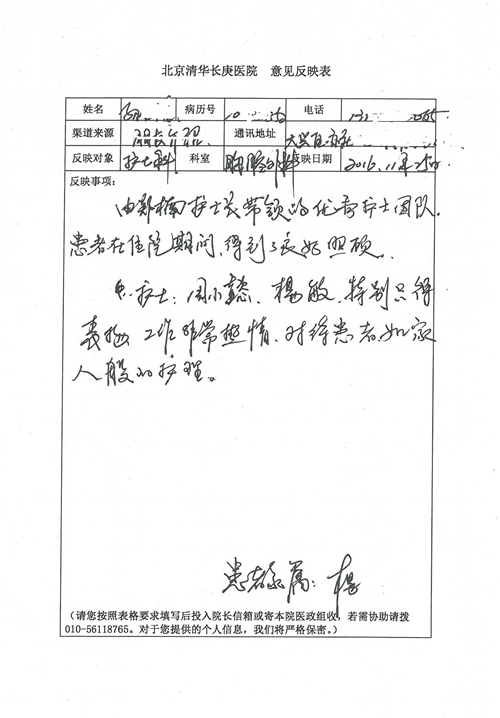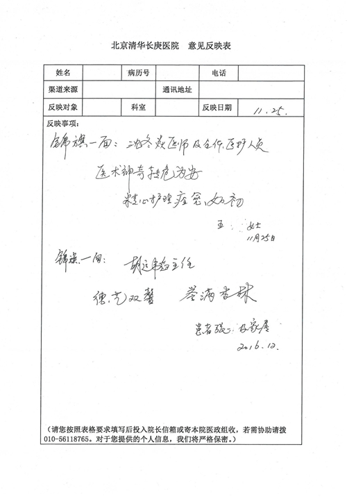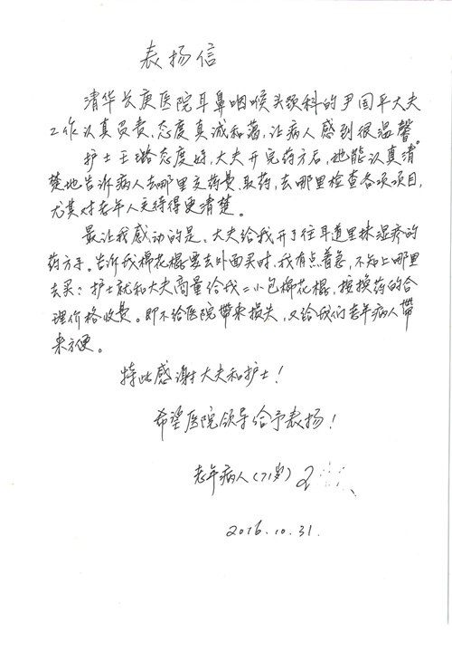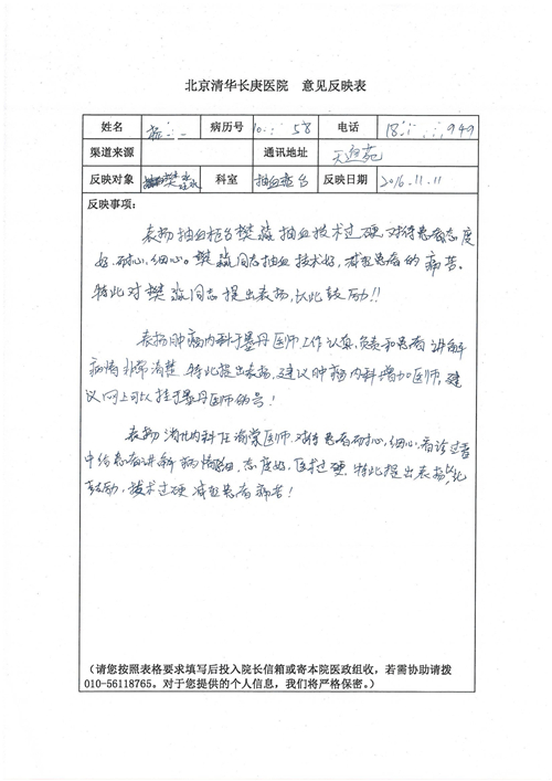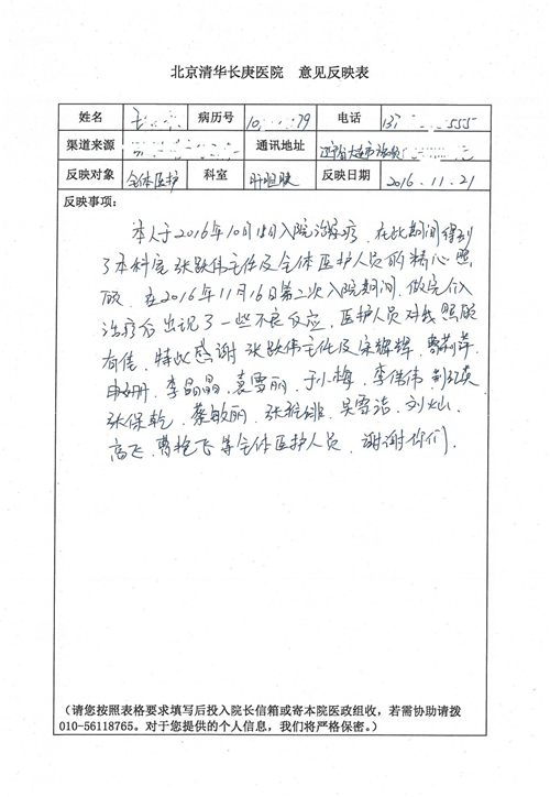 2016年11月,我院共接到患者及家属感谢信64封,其中肝胆外科董家鸿主任医师、张洪义主任医师、张跃伟主任医师、韩东冬副主任医师、曾建平主治医师、王良主治医师、庄卓男医师、朱融融医师,神经外科王贵怀主任医师、郭毅副主任医师、师炜医师,普通外科李元新主任医师、蔺宏伟副主任医师、刘伯涛主治医师、张鹏主治医师,骨科潘勇卫主任医师、蔡谞主任医师、赵喆主治医师、何大炜医师、朱剑津医师,泌尿外科陈松副主任医师,心脏外科沈冬焱副主任医师,麻醉科张欢主任医师、高元朝主治医师,心脏内科缪国斌主任医师、佘飞副主任医师、刘芳副主任医师、薛亚军主治医师、丁洁医师、葛婷婷进修生,神经内科王也医师、黄镪进修生,肾脏内科王炜主治医师,消化内科姜泊主任医师、任渝棠主治医师、王佳主治医师、李思源进修生,血液及肿瘤内科于凡主治医师、李墨丹医师,妇产科黄振宇副主任医师、马珂主治医师、杨曦主治医师、王奔医师、刘瑛医师、陈华云医师、王晓茜医师,儿科季丽娜副主任医师、尹小梅主治医师、李然主治医师,康复科潘钰主任医师、徐泉主治医师、孙小花、杨晓辉、马春岳,皮肤科赵邑副主任医师、段晓涵主治医师,眼科胡运韬主任医师、郭立斌副主任医师,耳鼻咽喉头颈外科叶京英主任医师、李欣副主任医师、尹国平主治医师、曲玥医师、许嘉医师,ICU孙雪医师,放射科马永强主治医师,放疗科蒋静主治医师,检验科樊淼,临床药学科席庆、张微微,医事科李俊男、张勇涛,警卫科姚旭,保洁员汪志霞、王志梅,护理部白俊、王璐、王梦瑶、宋辉辉、蔡敏丽、高飞、刘紫霞、王紫秋、贾晨、刘灿、孙璐、刘璐、于晓梅、曹莉萍、周小懿、杨敏、申姗、李晶晶、李伟伟、荆红英、张保乾、张雅绯、吴雪洁、曹艳飞、刘岩、胡荫、杨莉、刘宇宝、黄映琼、周倩倩、朱杰、崔润喆、韩建新、梁淑一、魏月秀、李伟伟、周圆、刘金霞、田迎迎、李亚灵、谢兰兰、赵宝晶、曹奇菲、张慧文、王许佳以及廖秦平医护团队、蔡谞医护团队、张传云护士团队、郑楠护士团队,血液及肿瘤内科、心脏外科、消化内科、普通外科、神经外科、泌尿外科、放射科全体医护人员收到具名表扬。特此公告,以资鼓励!