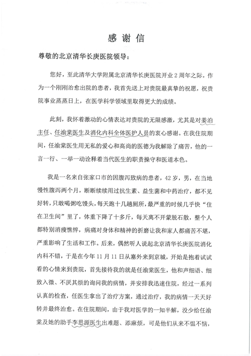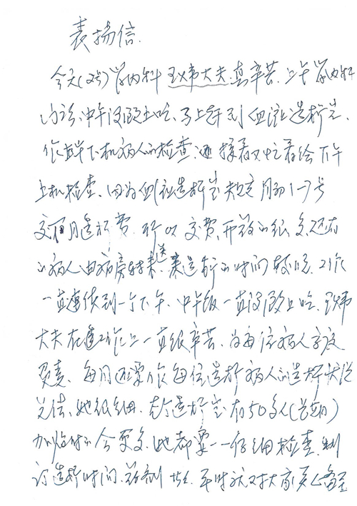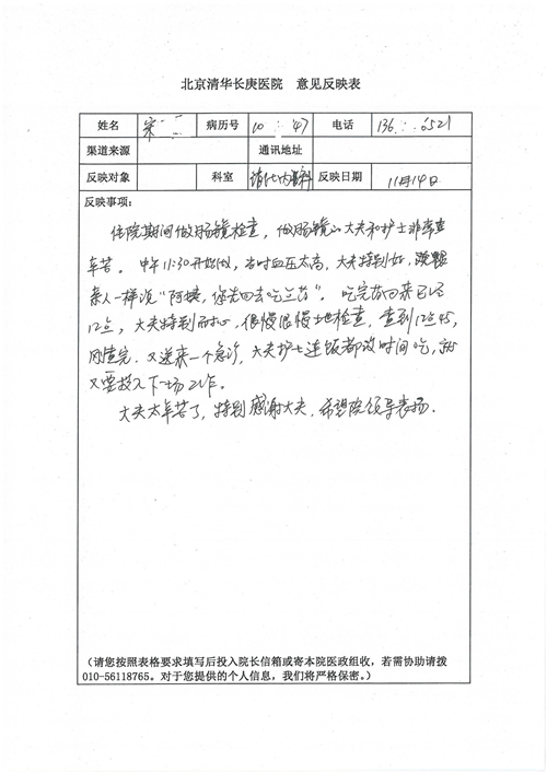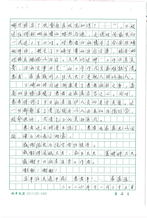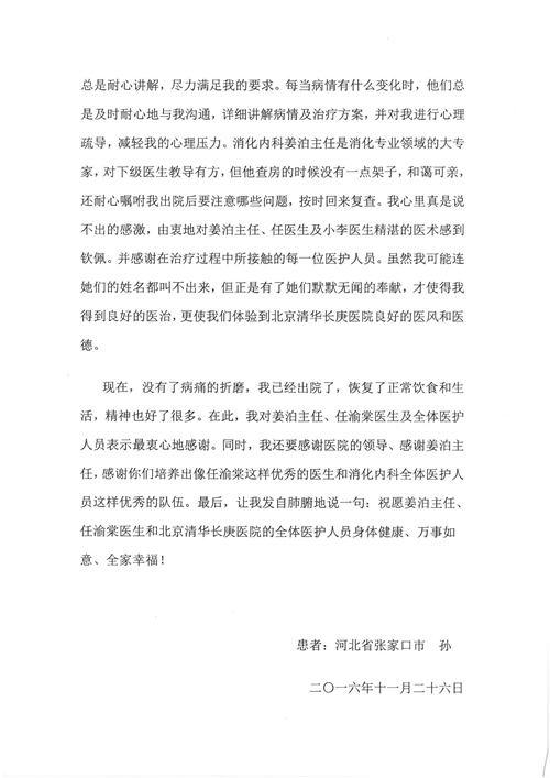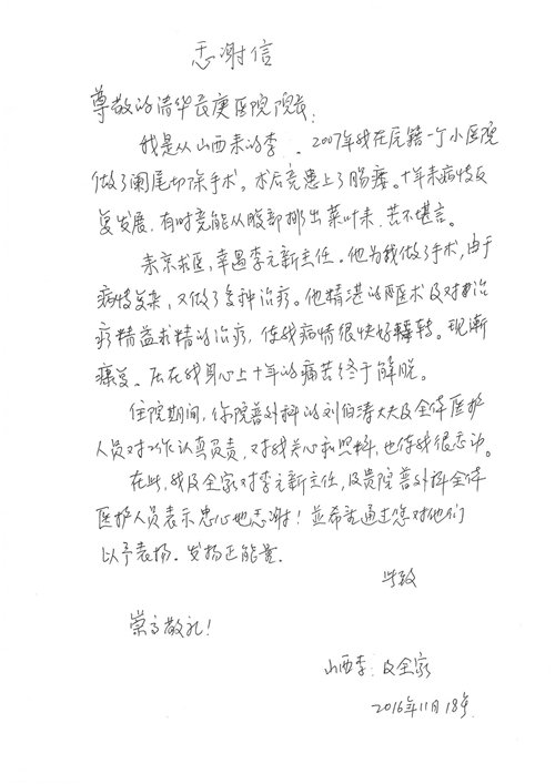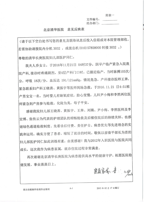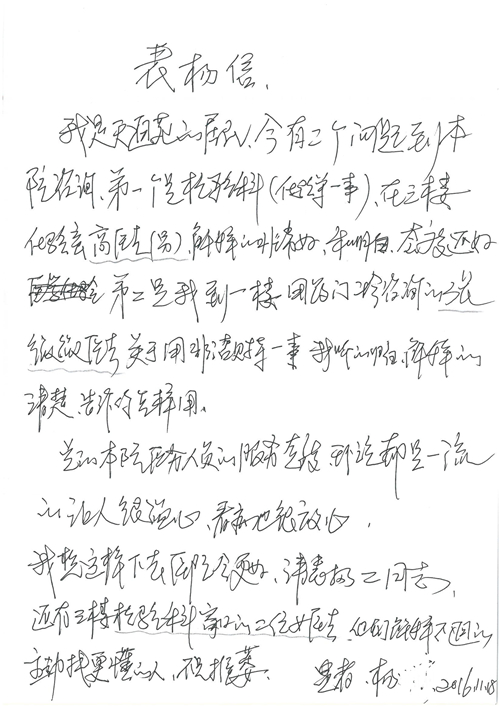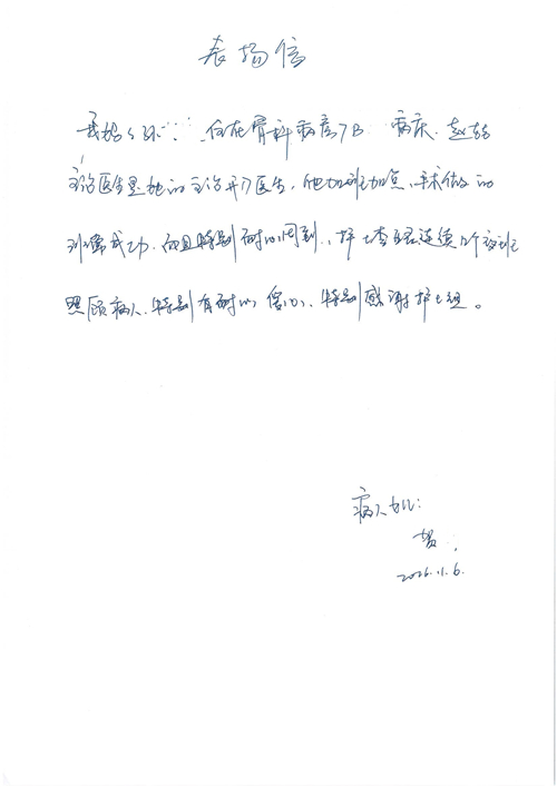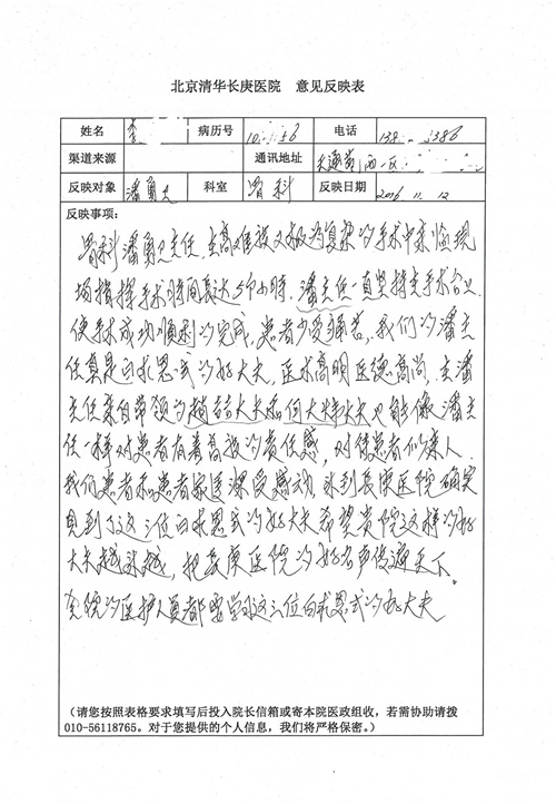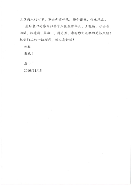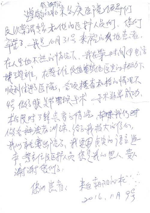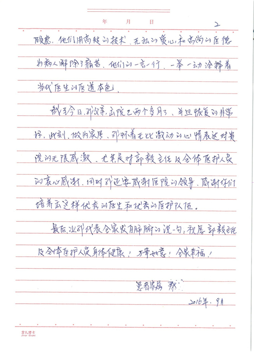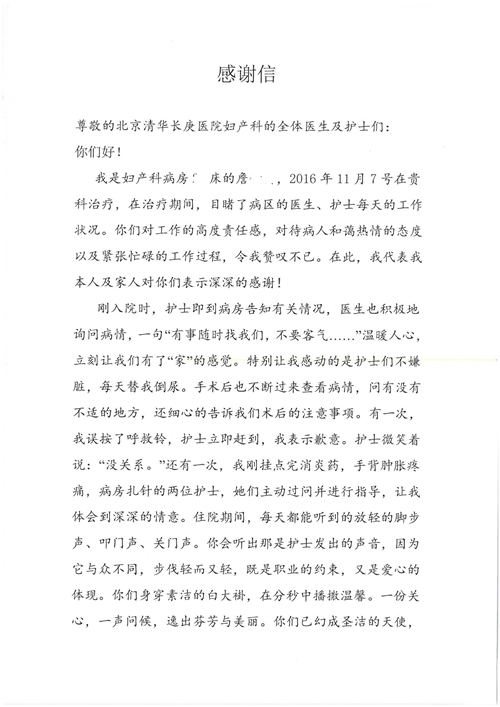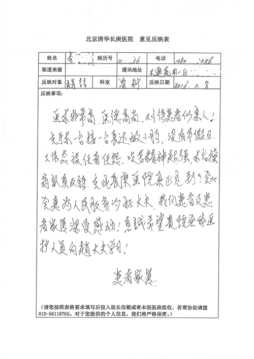 2016年11月,我院共接到患者及家属感谢信64封,其中肝胆外科董家鸿主任医师、张洪义主任医师、张跃伟主任医师、韩东冬副主任医师、曾建平主治医师、王良主治医师、庄卓男医师、朱融融医师,神经外科王贵怀主任医师、郭毅副主任医师、师炜医师,普通外科李元新主任医师、蔺宏伟副主任医师、刘伯涛主治医师、张鹏主治医师,骨科潘勇卫主任医师、蔡谞主任医师、赵喆主治医师、何大炜医师、朱剑津医师,泌尿外科陈松副主任医师,心脏外科沈冬焱副主任医师,麻醉科张欢主任医师、高元朝主治医师,心脏内科缪国斌主任医师、佘飞副主任医师、刘芳副主任医师、薛亚军主治医师、丁洁医师、葛婷婷进修生,神经内科王也医师、黄镪进修生,肾脏内科王炜主治医师,消化内科姜泊主任医师、任渝棠主治医师、王佳主治医师、李思源进修生,血液及肿瘤内科于凡主治医师、李墨丹医师,妇产科黄振宇副主任医师、马珂主治医师、杨曦主治医师、王奔医师、刘瑛医师、陈华云医师、王晓茜医师,儿科季丽娜副主任医师、尹小梅主治医师、李然主治医师,康复科潘钰主任医师、徐泉主治医师、孙小花、杨晓辉、马春岳,皮肤科赵邑副主任医师、段晓涵主治医师,眼科胡运韬主任医师、郭立斌副主任医师,耳鼻咽喉头颈外科叶京英主任医师、李欣副主任医师、尹国平主治医师、曲玥医师、许嘉医师,ICU孙雪医师,放射科马永强主治医师,放疗科蒋静主治医师,检验科樊淼,临床药学科席庆、张微微,医事科李俊男、张勇涛,警卫科姚旭,保洁员汪志霞、王志梅,护理部白俊、王璐、王梦瑶、宋辉辉、蔡敏丽、高飞、刘紫霞、王紫秋、贾晨、刘灿、孙璐、刘璐、于晓梅、曹莉萍、周小懿、杨敏、申姗、李晶晶、李伟伟、荆红英、张保乾、张雅绯、吴雪洁、曹艳飞、刘岩、胡荫、杨莉、刘宇宝、黄映琼、周倩倩、朱杰、崔润喆、韩建新、梁淑一、魏月秀、李伟伟、周圆、刘金霞、田迎迎、李亚灵、谢兰兰、赵宝晶、曹奇菲、张慧文、王许佳以及廖秦平医护团队、蔡谞医护团队、张传云护士团队、郑楠护士团队,血液及肿瘤内科、心脏外科、消化内科、普通外科、神经外科、泌尿外科、放射科全体医护人员收到具名表扬。特此公告,以资鼓励!
