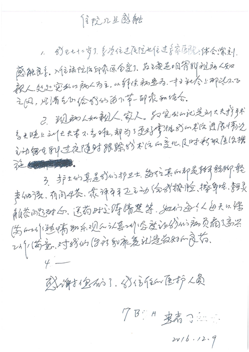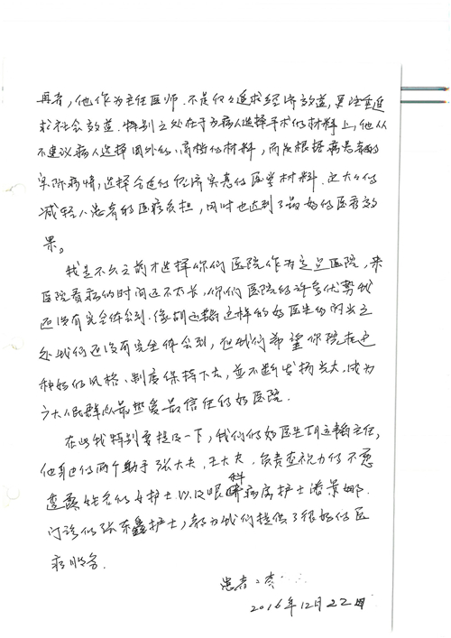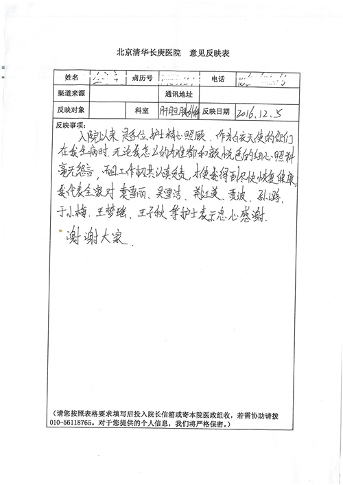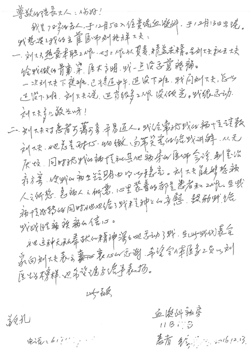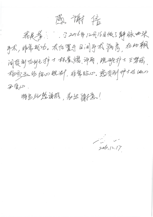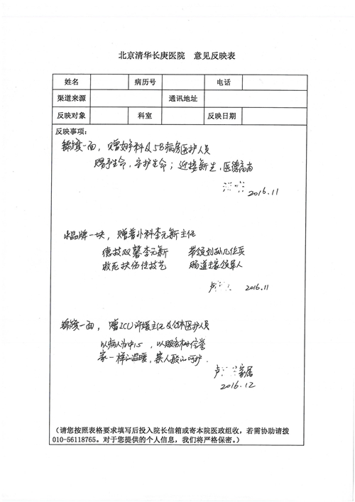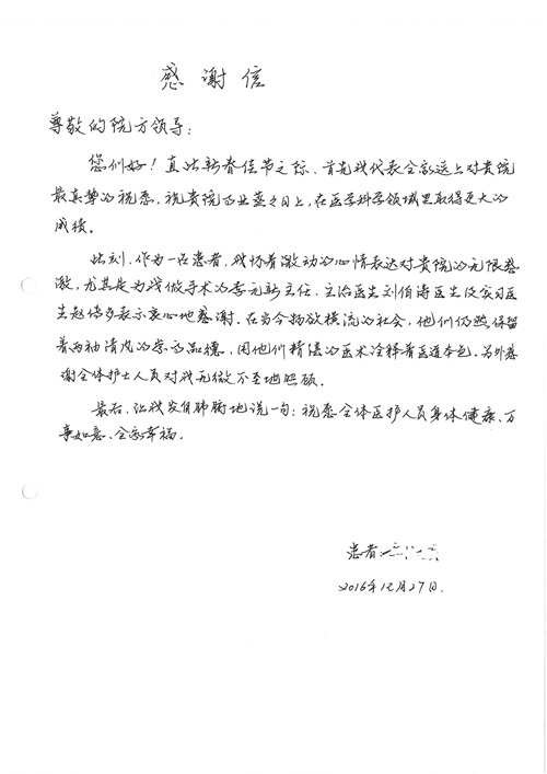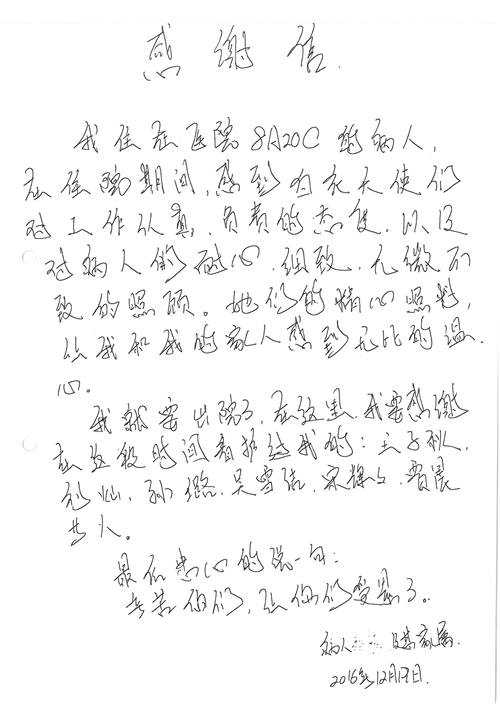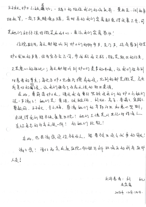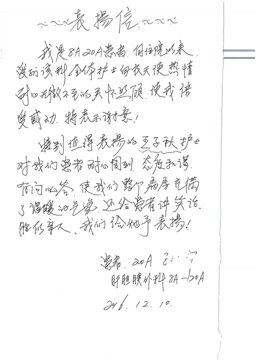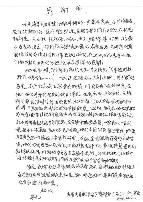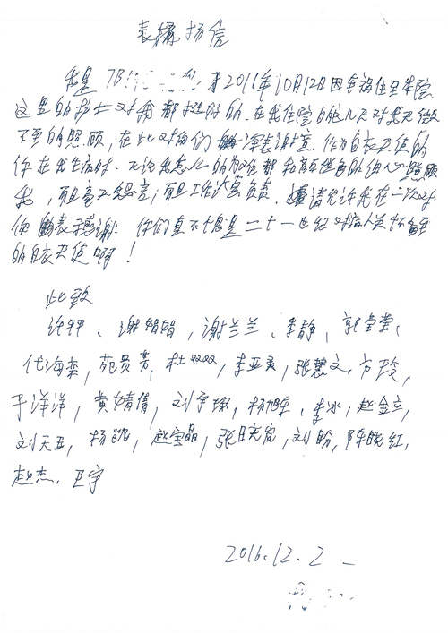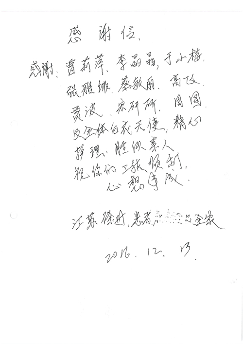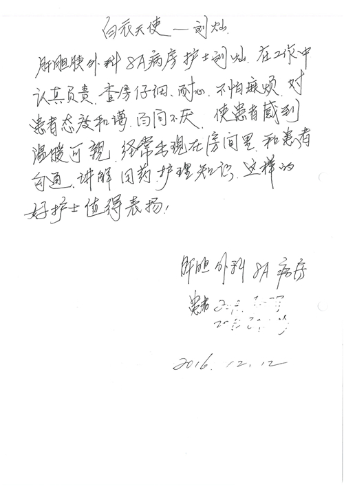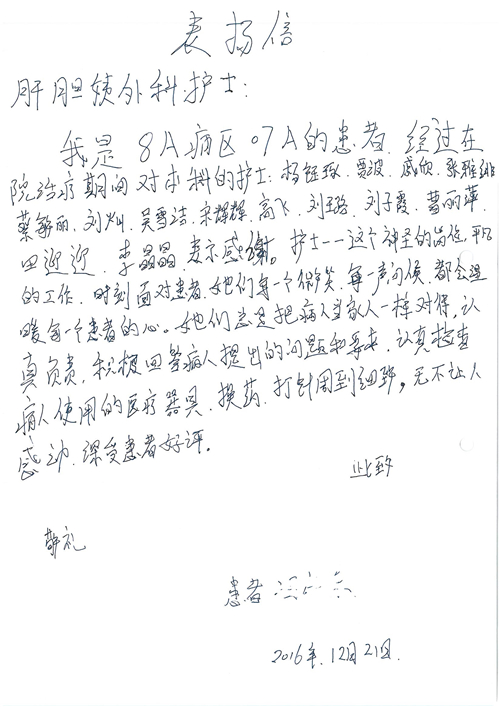 2016年12月,我院共接到患者及家属感谢信81封,其中肝胆外科董家鸿主任医师、张洪义主任医师、张跃伟主任医师、石军副主任医师、韩东冬副主任医师、项灿宏副主任医师、公磊医师、杨世伟医师、汤睿医师、李昂医师、袁玉斌医师,普通外科罗斌主任医师、李元新主任医师、刘伯涛主治医师、白熠州主治医师、汤洁莹医师、赵传多医师、朱融融医师,骨科肖嵩华主任医师、宋飞主治医师、杨华东主治医师、顾苏熙主治医师,泌尿外科张鑫副主任医师、王澍医师,心脏内科张萍主任医师、缪国斌主任医师、薛亚军主治医师,肾脏内科李月红主任医师、庄震主治医师,消化内科相马宁主任医师、刘佳文主治医师,血液及肿瘤内科刘兆祥住院医师,妇产科黄振宇副主任医师、张蕾副主任医师、马珂副主任医师、刘晨副主任医师、刘瑛医师、王奔医师、王晓茜医师,儿科季丽娜副主任医师,内分泌科蓸沉香主治医师,眼科胡胡运韬主任医师、郭立斌副主任医师、司山成医师,耳鼻咽喉头颈外科叶京英主任医师、伊海金副主任医师、尹国平主治医师,急诊科周杰医师,ICU许媛主任医师,医事处李俊男,保卫处马班长,保洁员刘玉芳,护理部袁雪丽、吴雪洁、李伟伟、孙璐、蔡敏丽、李晶晶、秦蒙蒙、于小梅、张雅绯、周圆、王子秋、刘子霞、贾波、高飞、曹艳飞、田迎迎、甄娇、王嘉琦、申姗、李晶晶、宋辉辉、荆红英、张保乾、刘灿、杨钰琢、贾晨、高雅、曹莉萍、戚欣、刘金霞、曹明霞、杨旭东、叶露、李文静、李慧、林景熠、王梦瑶、许丽、杨秀玉、徐洋洋、许平平、谢娟娟、谢兰兰、季静、郭莹莹、代海栾、苑贵芳、杜双双、李亚灵、张慧文、方玲、于洋洋、黄婧倩、刘宇琛、李冰、赵金立、刘天玉、杨凯、赵宝晶、张晓岚、刘盼、陈晓红、赵杰、王宇、赵金立、郑楠、刘晶钰、姚惠云、许乐、周小懿、郑爽、李杰、李双双、姜欣悦、潘景娜、张东鑫、李梦莹、宋研研、范李璐以及缪国斌医护团队,心脏内科、骨科、血管外科、肝胆外科、妇产科、ICU、肾脏内科全体医护人员,6B、9A、普通外科全体护士收到具名表扬。特此公告,以资鼓励!